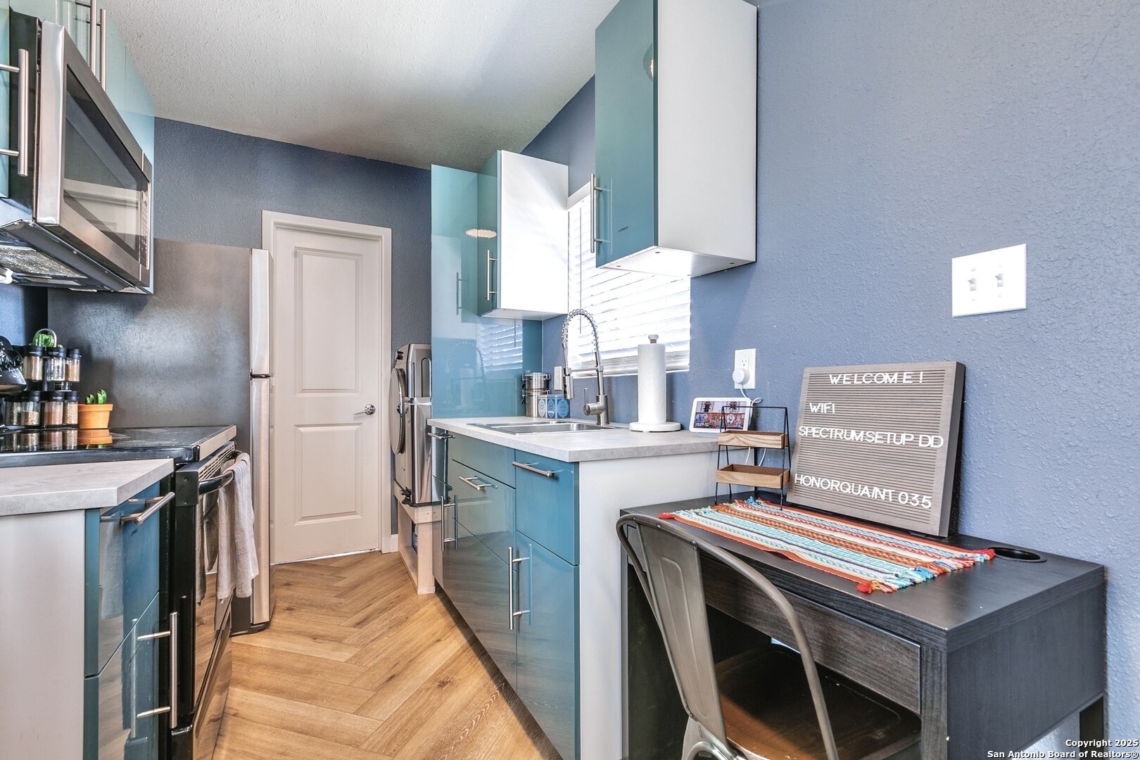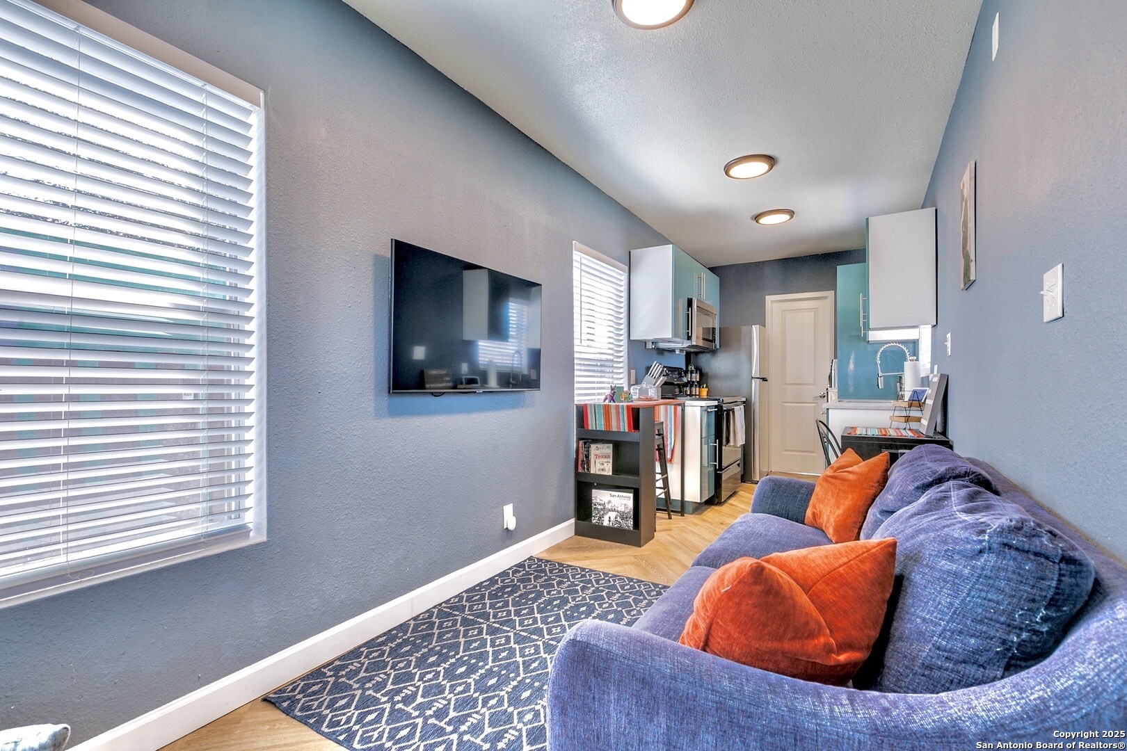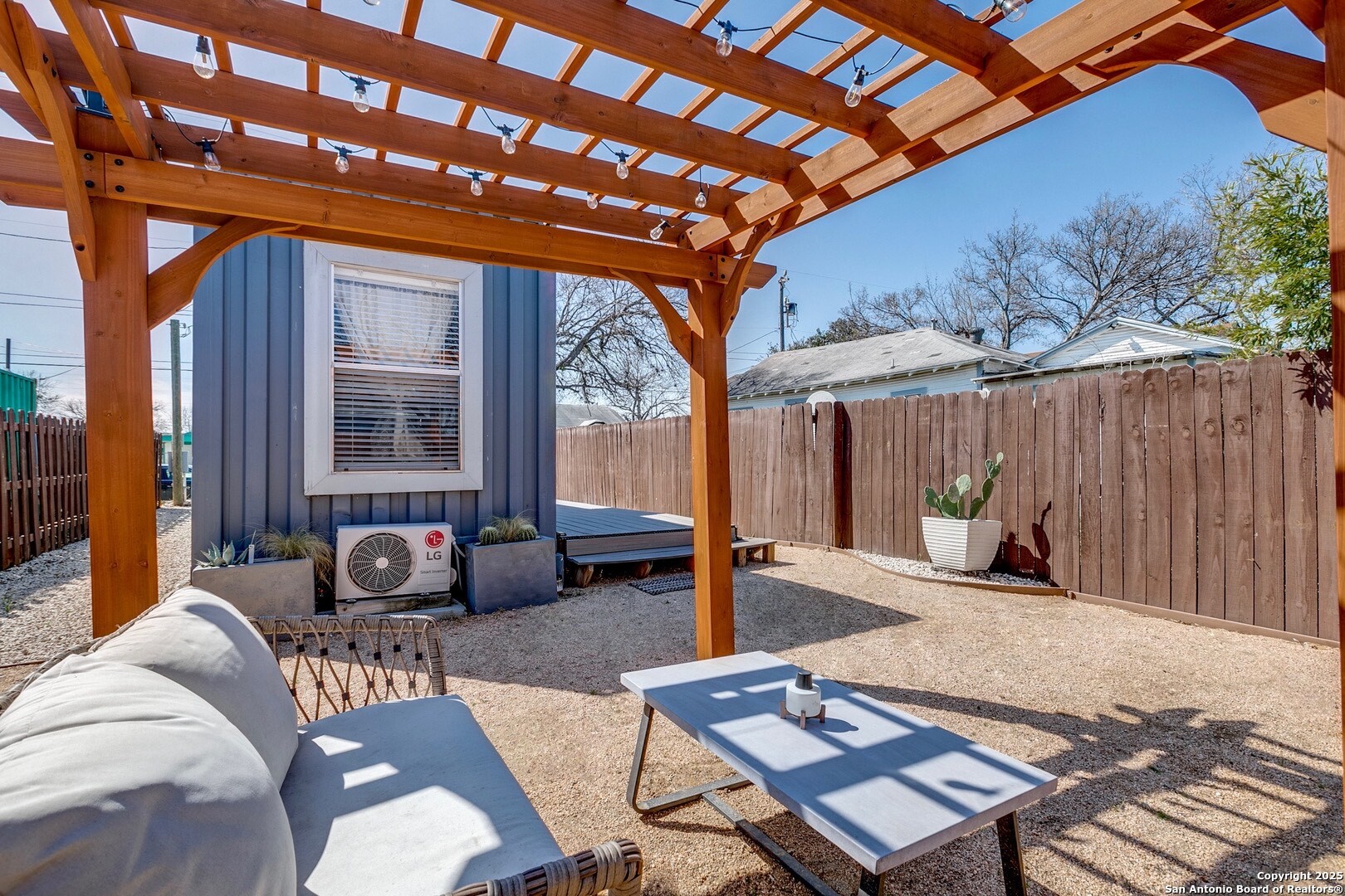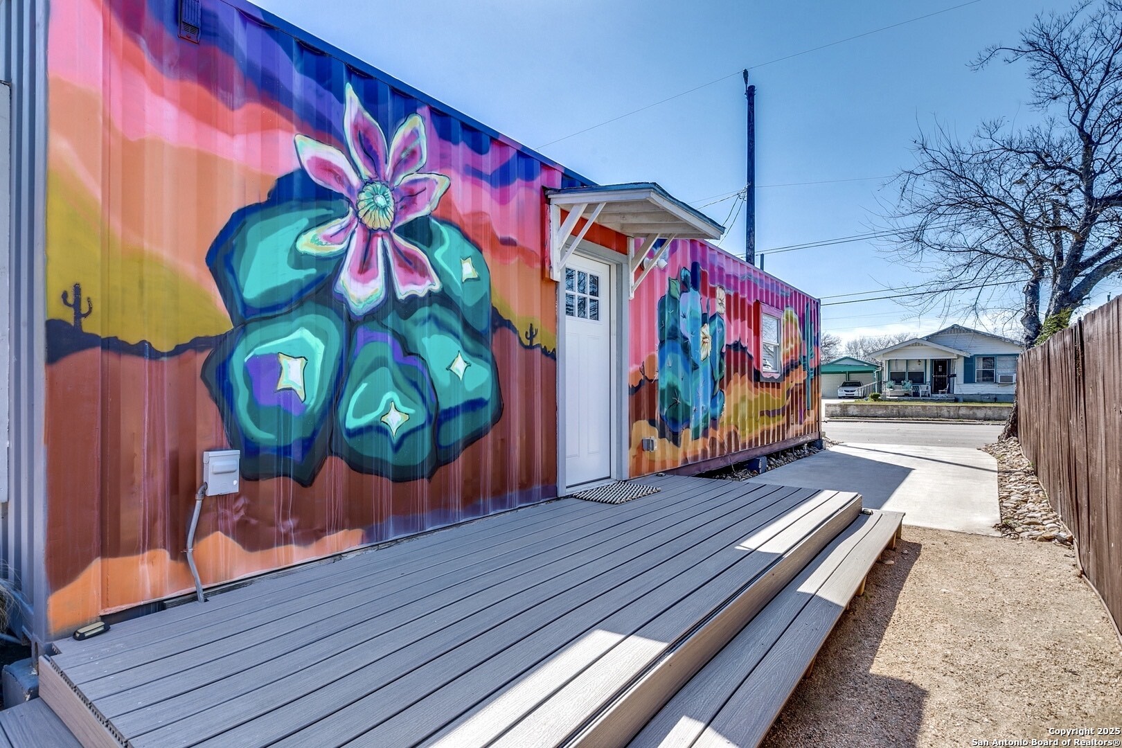 This truly unique container home stands out with its chic modern finishes inside, while the custom-painted exterior mural by local artist gives it a an edgy urban vibe. The thoughtfully designed layout maximizes every inch of space, creating a smooth flow between the living area, kitchen, and bathroom. Tons of windows flood the home with natural light, showcasing the elegant herringbone-style flooring and the contemporary kitchen, which boasts glossy cabinetry with updated hardware, a stainless steel sink with a gooseneck faucet, and stainless steel appliances, including the refrigerator, plus a matching stackable washer and dryer are also included for added convenience. The walk-in shower has been upgraded with beautiful new tile and sleek black fixtures. Step outside to a private backyard featuring a patio, pergola, and low-maintenance professional xeriscaping in both the front and rear yards-perfect for relaxing and entertaining. This home is an exceptional option for both homeowners and investors alike.