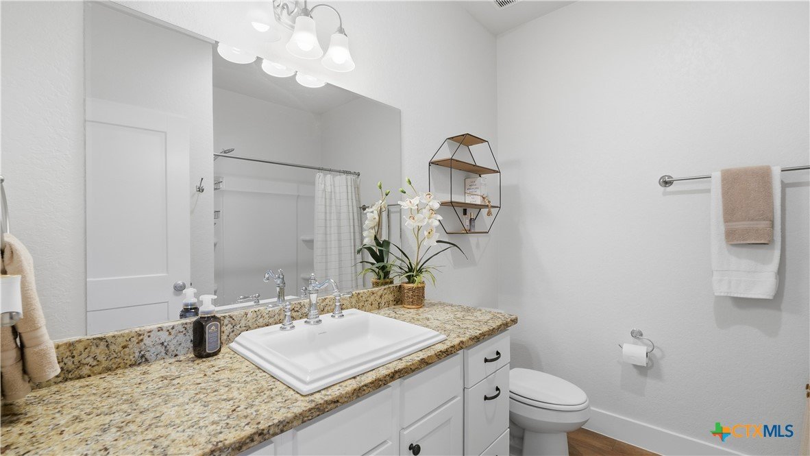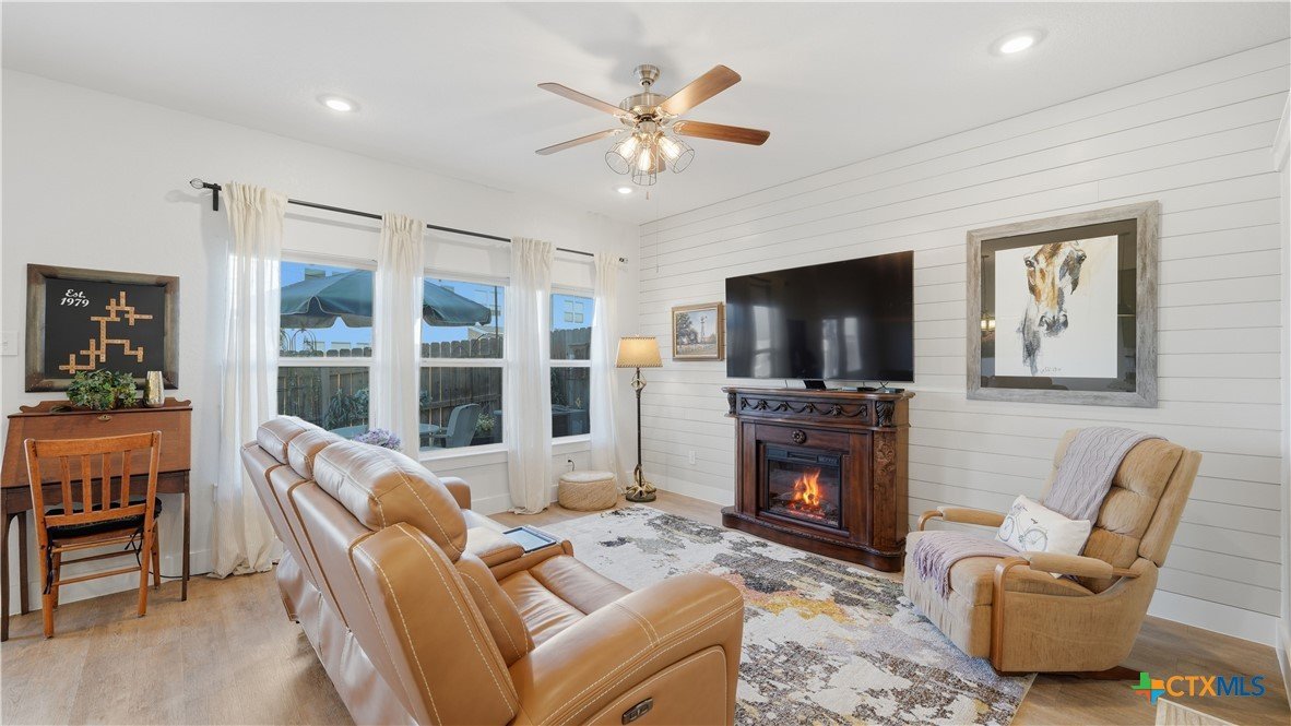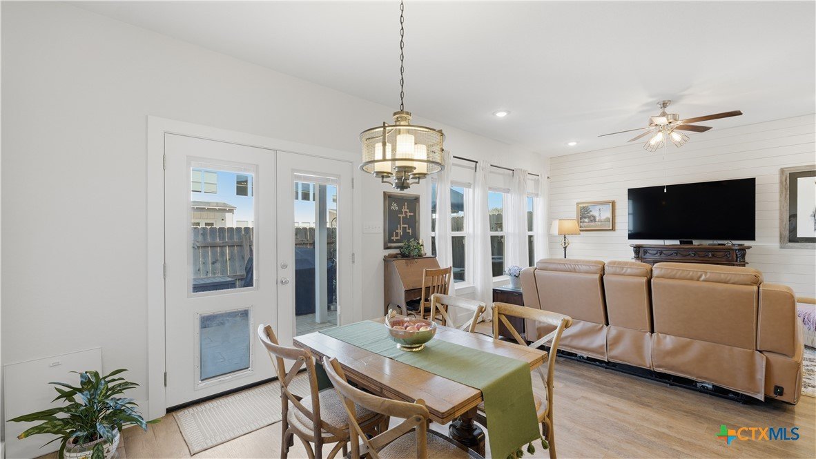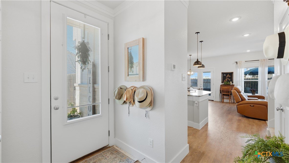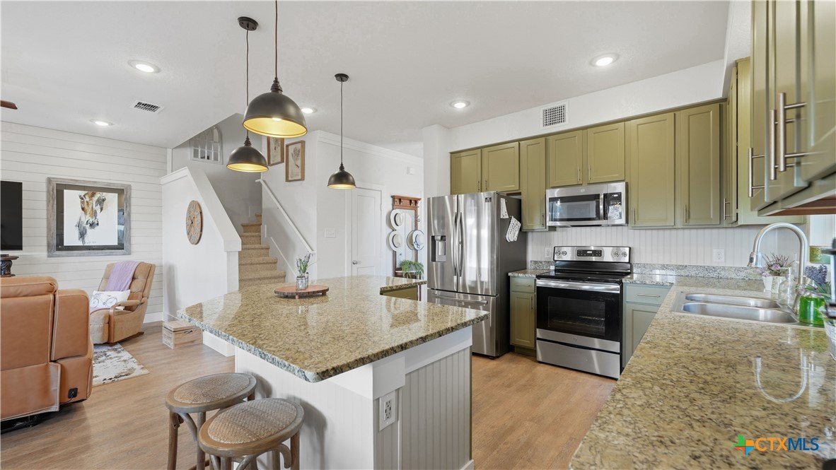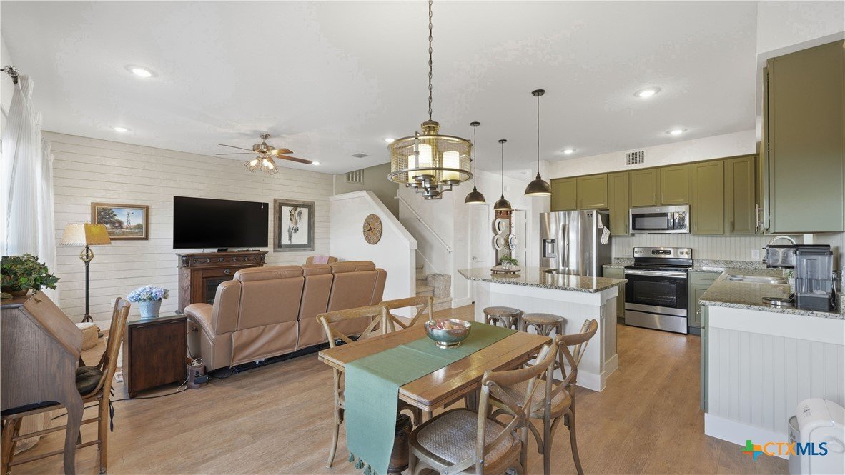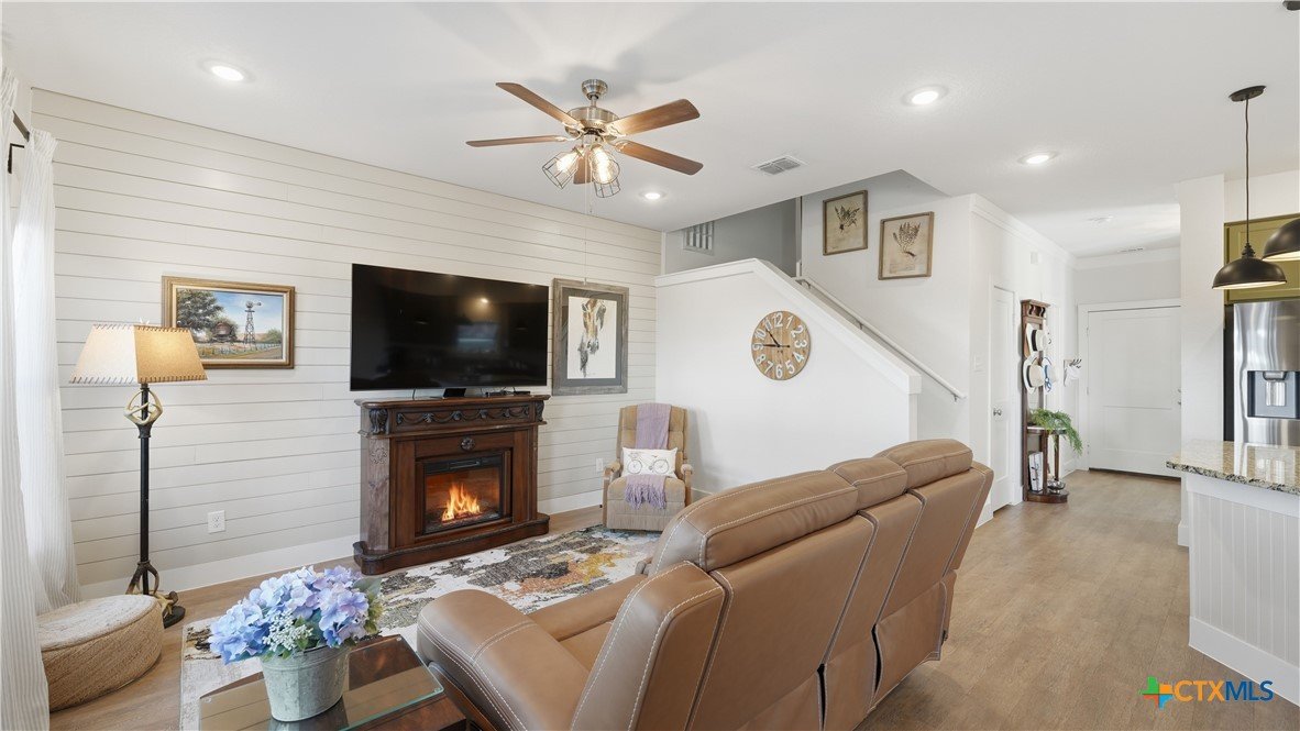 Welcome to Sapphire Place, where thoughtful upgrades, low-maintenance convenience, and the vibrant New Braunfels lifestyle come together in one beautifully maintained corner townhome. Perfectly positioned for an easy, lock-and-leave lifestyle, this home offers spacious open-concept living designed for both everyday comfort and relaxed entertaining. Nine-foot ceilings and abundant natural light enhance the airy feel of the main living areas, complemented by updated finishes, custom design touches, and seamless flow between the kitchen, dining, and living spaces. The kitchen serves as the heart of the home, featuring granite countertops, 42-inch cabinetry, a walk-in pantry, updated beadboard detailing at the island and backsplash, upgraded lighting enhances both style and functionality. A custom shiplap living room accent wall adds warmth and character, creating an inviting space to unwind. This home features luxury vinyl plank flooring, designer interior paint throughout, custom French door access, and upgraded cabinet hardware, creating a fresh, move-in-ready feel while enhancing both functionality and natural light. Additional improvements including a water softener, floored attic space for added storage, and HVAC ultraviolet air purification enhance comfort and efficiency. Step outside to a private backyard retreat designed for enjoyment without the maintenance. The extended stamped concrete patio, artificial turf lawn, wrapped porch posts, black metal fencing, and installed sprinkler and drip irrigation system create a functional and inviting outdoor space ideal for relaxing evenings or hosting friends. Custom exterior steps located just beyond the back patio leading to the gate provide direct access to additional guest parking, making entertaining easy and convenient. Located in the heart of New Braunfels, residents enjoy quick access to shopping, dining, the historic Gruene District, and commuter routes to San Antonio or Austin are all just minutes away.