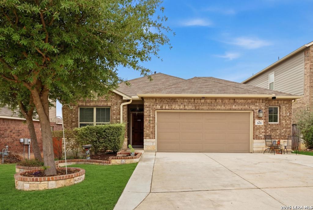 Beautiful rock and brick M/I one-story home, offering thoughtful upgrades and move-in ready! The landscaped yard features brick-edged flower beds and an expanded driveway leading to an oversized garage with epoxy flooring and built-in shelving. Inside, ceramic wood-look tile floors run throughout the main living areas, complemented by faux 2-inch blinds, recessed lighting, and added shelving in the laundry and hall closets. The spacious family room flows seamlessly into the island kitchen, which features bar seating, pendant lighting, stainless steel appliances, gas cooking, new cabinet hardware, a walk-in pantry, and stainless refrigerator. The split primary suite offers a double vanity, garden tub, and separate walk-in shower. Outdoor living includes a covered patio with sunshade and extended stained deck, plus a fenced dog run and two storage sheds. Additional features include a sprinkler system, full gutters, tankless water heater, water softener (installed in 2025), Ring doorbell and cameras, app-enabled front door lock, concrete walkway to the backyard, and newer garage opener with an exterior keypad (2025). Not to be missed!