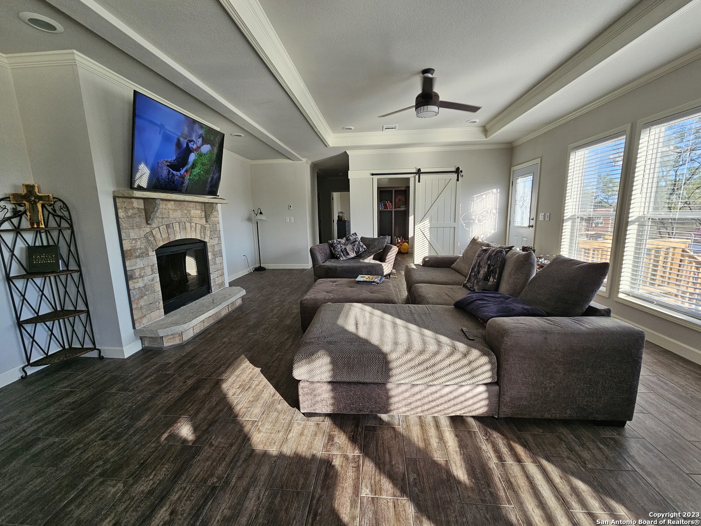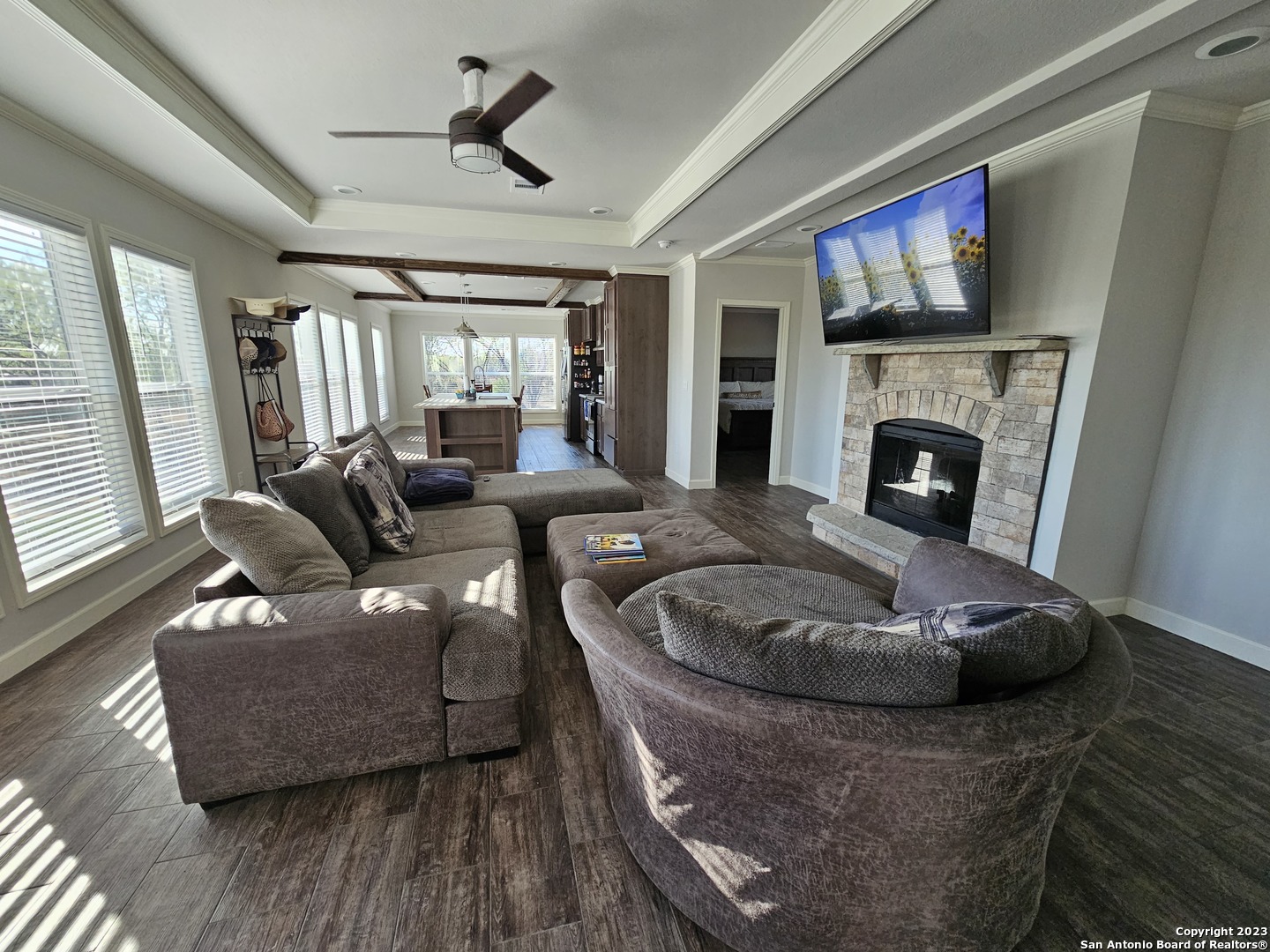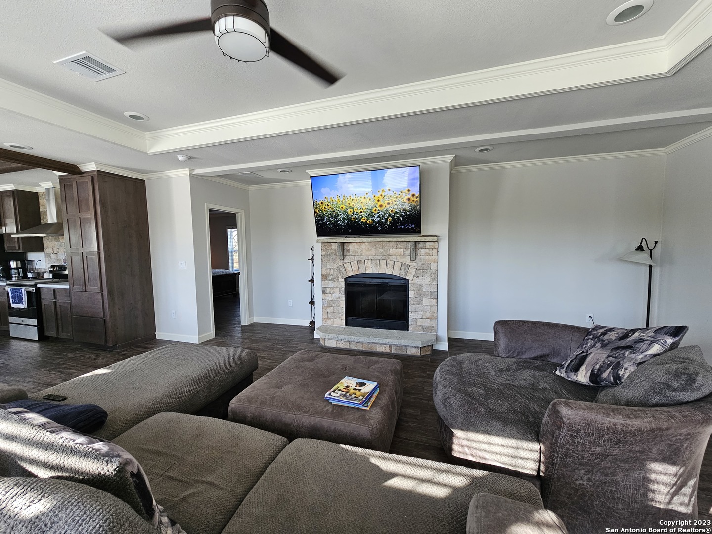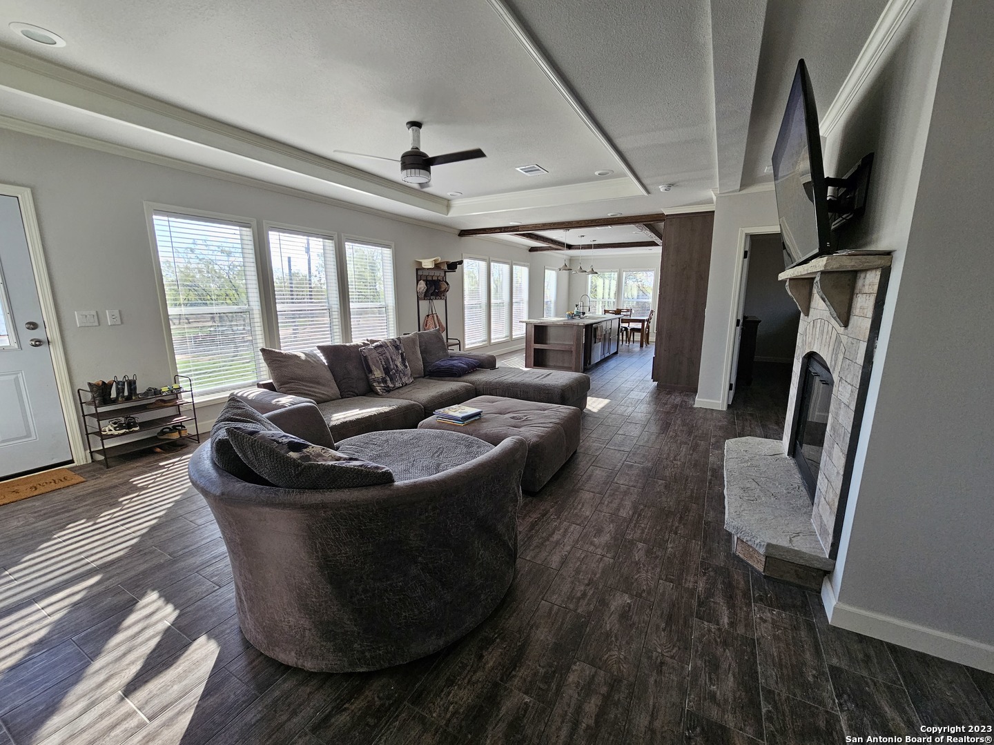 Welcome to The Haven, a beautifully crafted modular ranch home by Oak Creek Homes, nestled on 15 private, unrestricted acres of pure Texas tranquility. Located between Pleasanton and Floresville; this spacious, thoughtfully designed 3-bedroom, 2-bath home offers the best of both worlds- peaceful country living with easy access to everyday conveniences. Step inside to an open-concept layout featuring a large kitchen island, a custom brick backsplash, and electric fireplace that adds warmth and character to the living space. Cathedral ceilings in the living room and primary suite create an airy, expansive feel. Home includes a multi-purpose flex room and a generously sized utility room with abundant storage. Every detail of The Haven has been designed for convenience, style, and peaceful country living. Just steps away, you'll find an incredible 600 sq ft rustic man-cave. Perfect for entertaining or enjoying laid-back weekends with family. Comes fully equipped with a three-compartment sink, a mini-split system to handle Texas weather, and ample outlets throughout. Property offers added versatility with two fully equipped portable buildings! One is as a 300 sq ft functional storage space complete with washer and dryer connections, and its own dedicated water heater. The second is a well-insulated 240sq ft unit, sink connections included, formerly used for meat processing. A rare find with flexible utility and built-in infrastructure!" The property is fully fenced, Ag Exempt, and thoughtfully divided into two pastures. Outdoor enthusiasts will love the on-site hunting and recreation opportunities-right at home. Enjoy dove hunting from your front yard, explore the back acreage prepped for deer season, and take advantage of year-round hog hunting. A seasonal creek runs through the property. Create your own private pond oasis. Whether you're looking for a homestead, hunting, or simply soaking up the quiet, The Haven offers a lifestyle that's hard to beat.