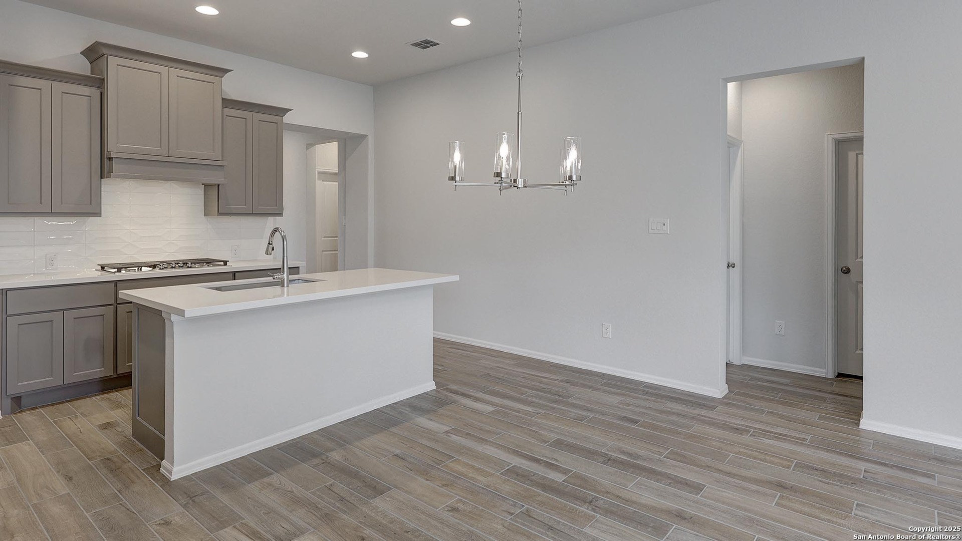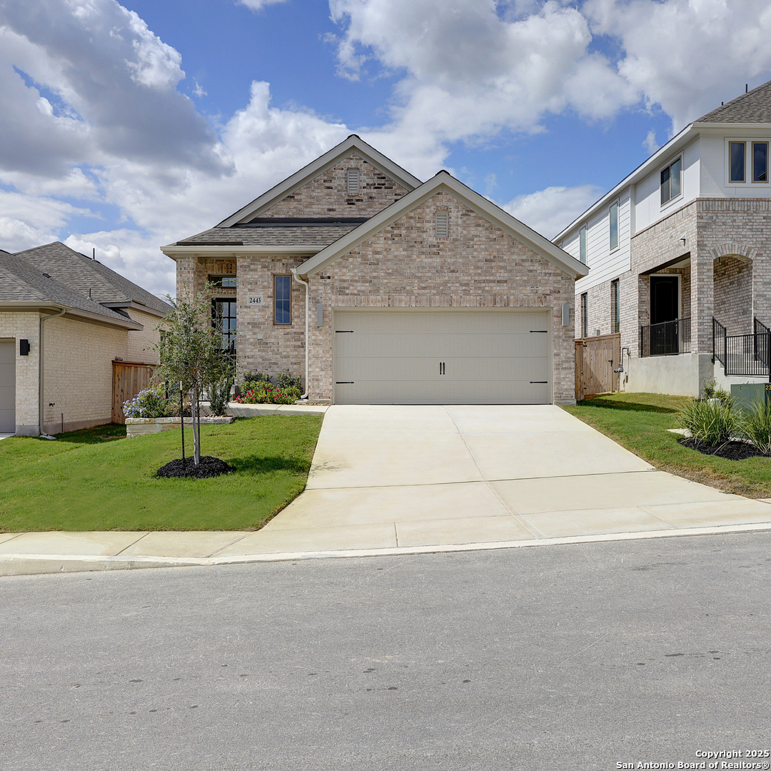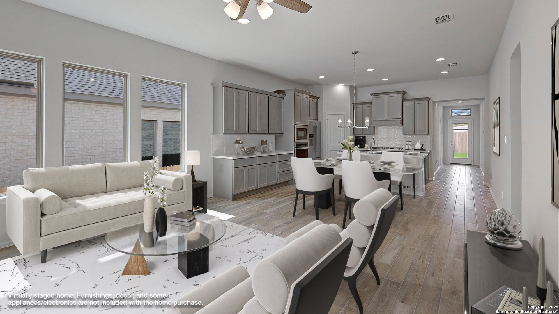 Entry leads to open family room, dining area and kitchen. Large windows and 10-foot ceilings throughout. Kitchen features generous counter space, 5-burner gas cooktop, corner walk-in pantry and large island with built-in seating space. Primary suite includes bedroom with 10-foot ceiling. Double doors lead to primary bath with dual vanities, garden tub, glass-enclosed shower and walk-in closet. Covered backyard patio and multi-zone sprinkler system. Mud room with adjoining closet is just off two-car garage.