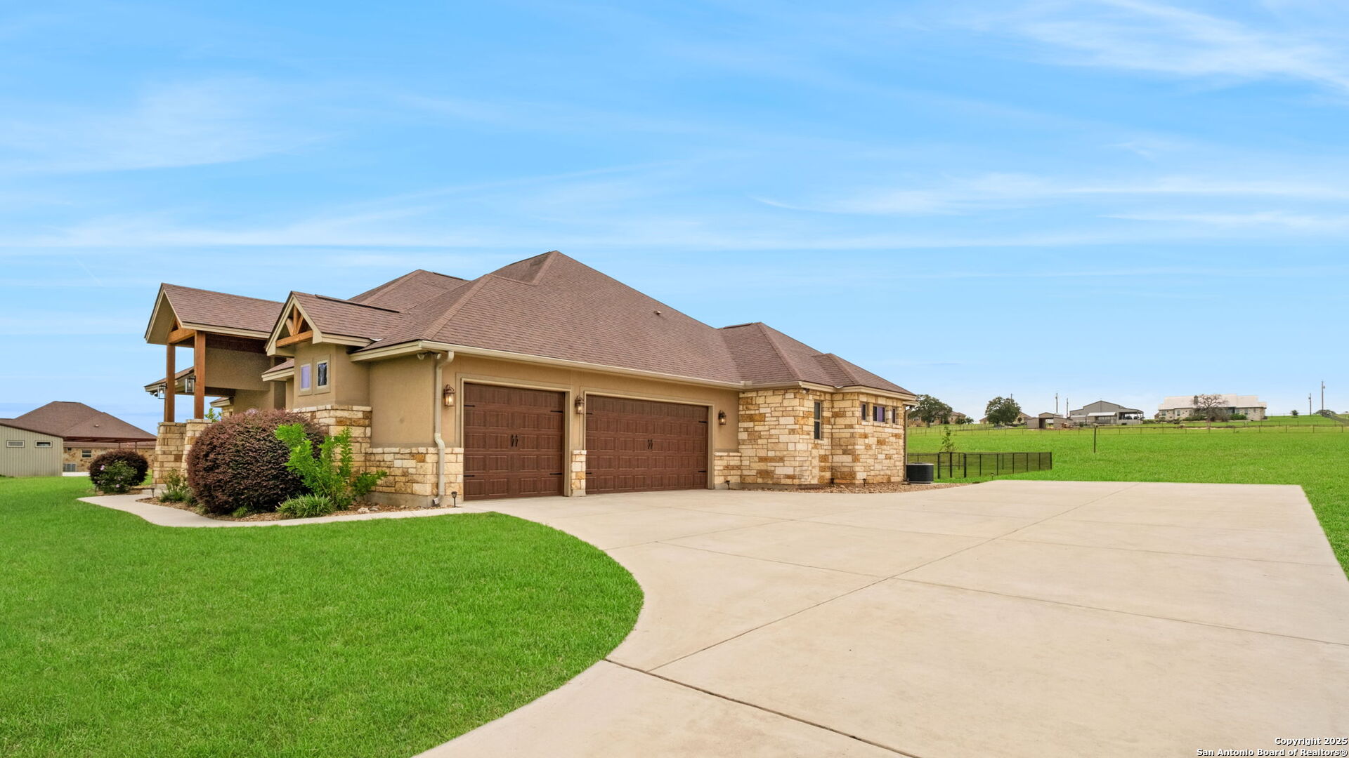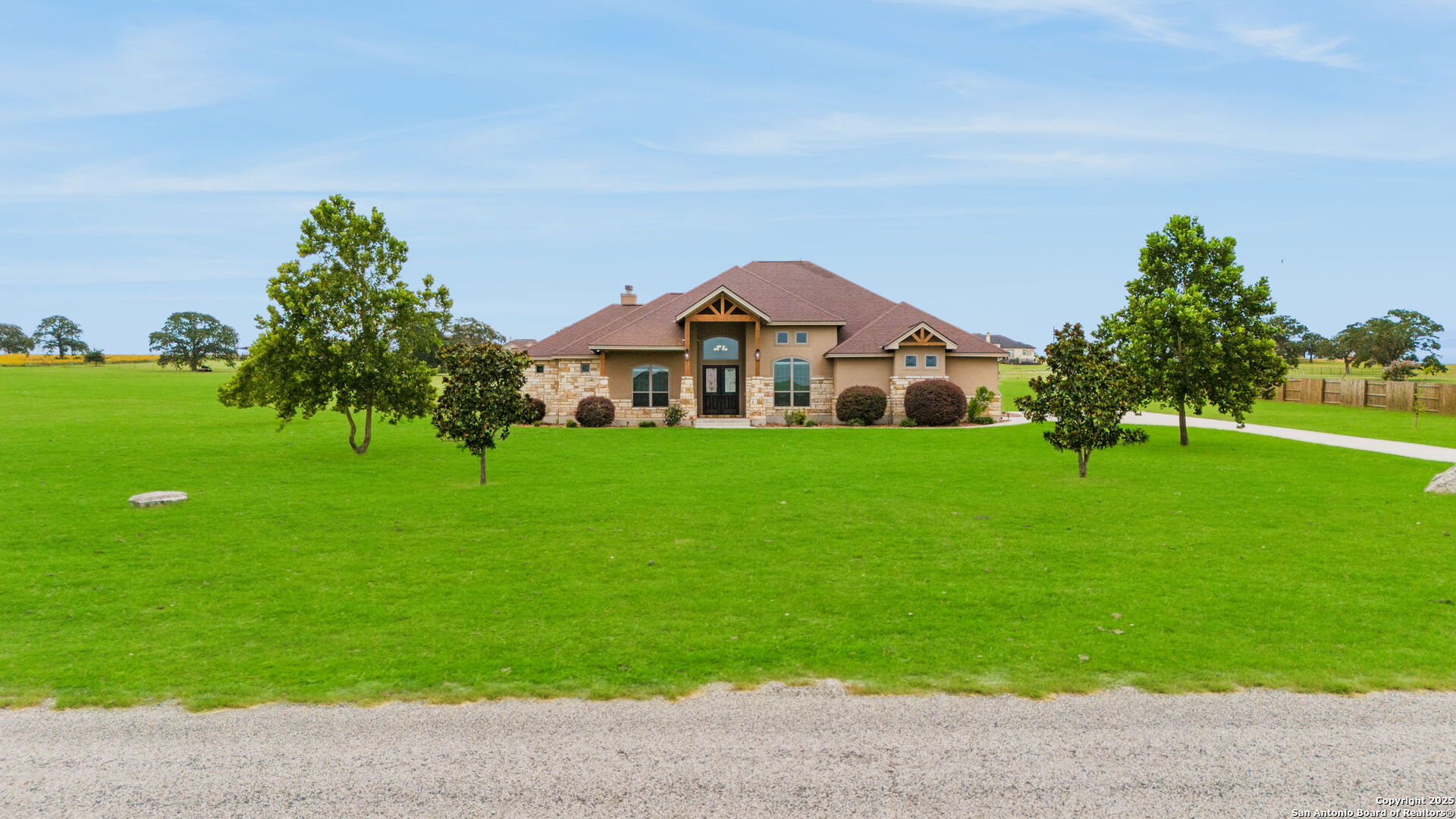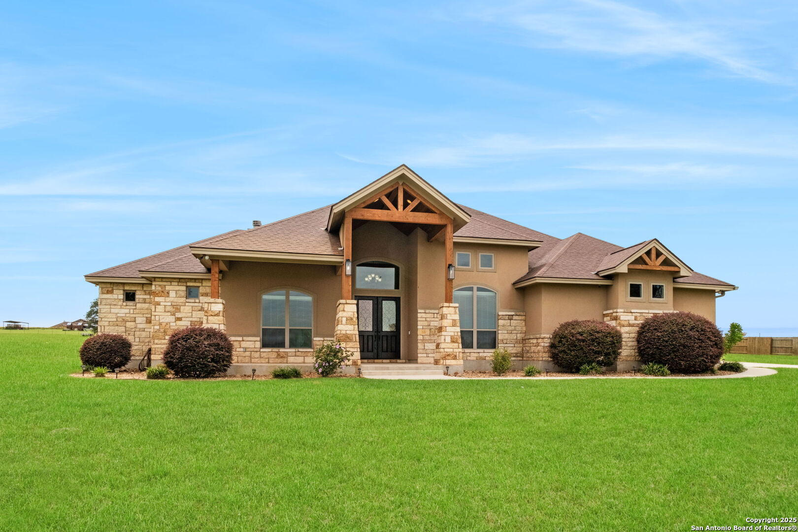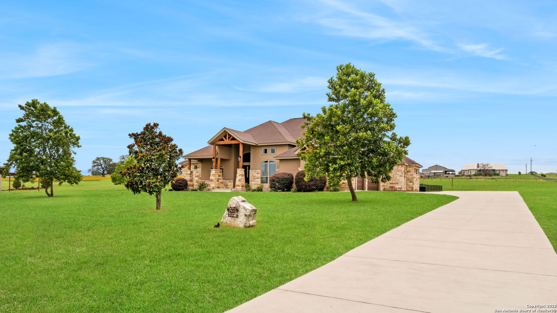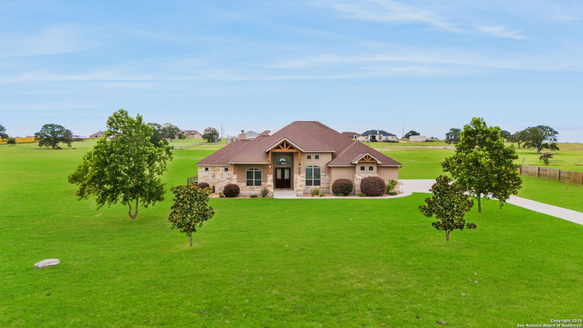 ONE-OF-A-KIND CUSTOM HOME WITH UP TO $80K IN UPGRADES & FEATURES NOW OFFERED AT $640K!! Discover your dream home on over three acres of elevated property offering breathtaking views in a neighborhood where spacious lots ensure ultimate privacy. This gorgeous custom stone and stucco residence showcases meticulous craftsmanship throughout its thoughtfully designed 2,794 square feet. The split floor plan maximizes natural light through oversized windows and dramatic clerestory features, creating an airy atmosphere enhanced by decorative high ceilings, elegant crown molding, and graceful arched doorways. The heart of the home features a striking floor-to-ceiling stone fireplace, while the gourmet kitchen impresses with its stone arch details, granite countertops, stainless steel appliances, and wraparound bar perfect for entertaining. Three well-appointed bedrooms include a luxurious primary suite with private patio access and barn door entry to a spa-like bathroom featuring a custom stone tiled walk-through shower and oversized soaking tub. A dedicated office provides the perfect work-from-home retreat, positioned away from bedrooms for optimal privacy. Step outside to your personal oasis featuring an oversized covered patio complete with outdoor kitchen and wood-burning fireplace - perfect for entertaining under the Texas sky. Premium features include a three-car side-entry garage with smart technology integration, central vacuum system, outdoor weather monitoring, security camera coverage around perimeter of home and meticulous attention to detail throughout. Every detail reflects the owner's dedication to quality, from custom stonework to immaculate maintenance standards. This rare opportunity combines luxury living with rural tranquility and every detail make this property a standout choice for the Buyer seeking something truly special.