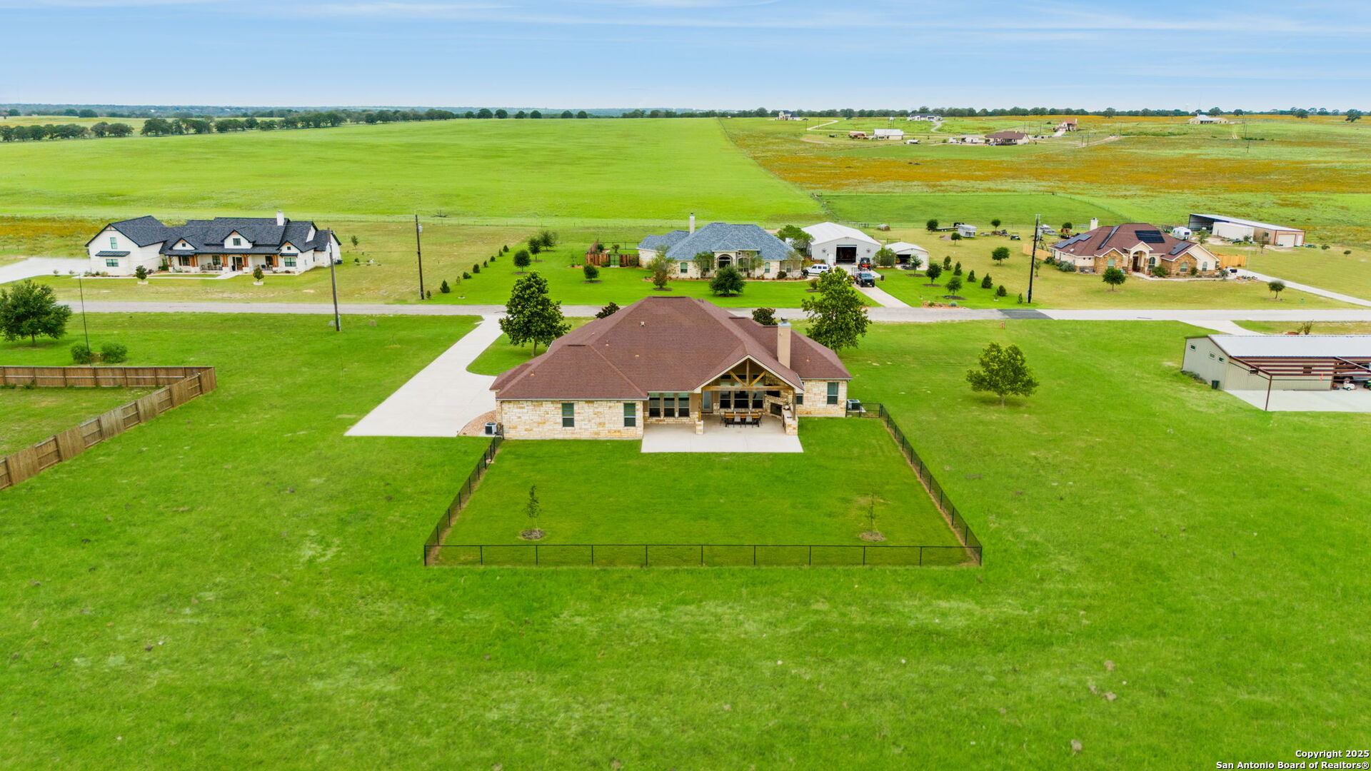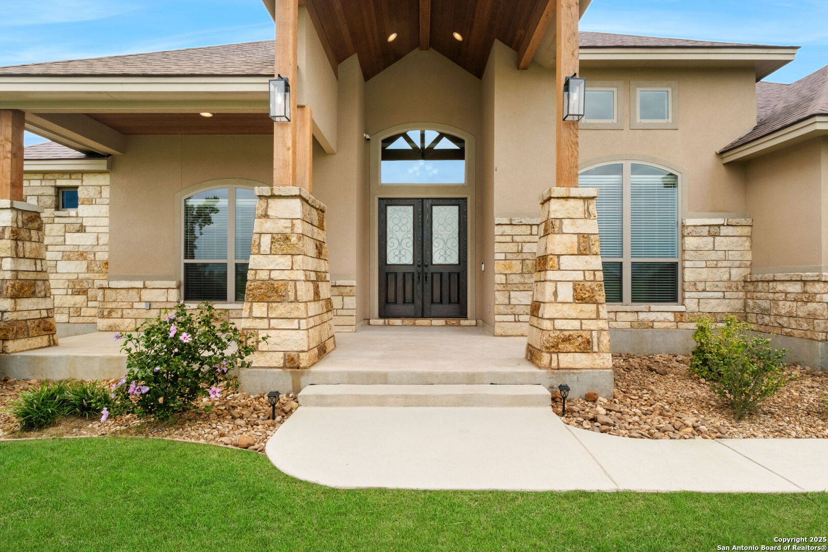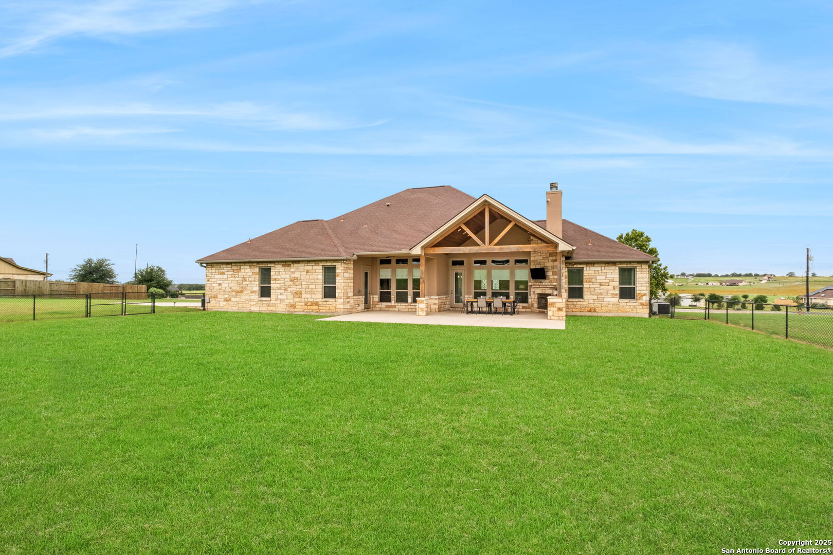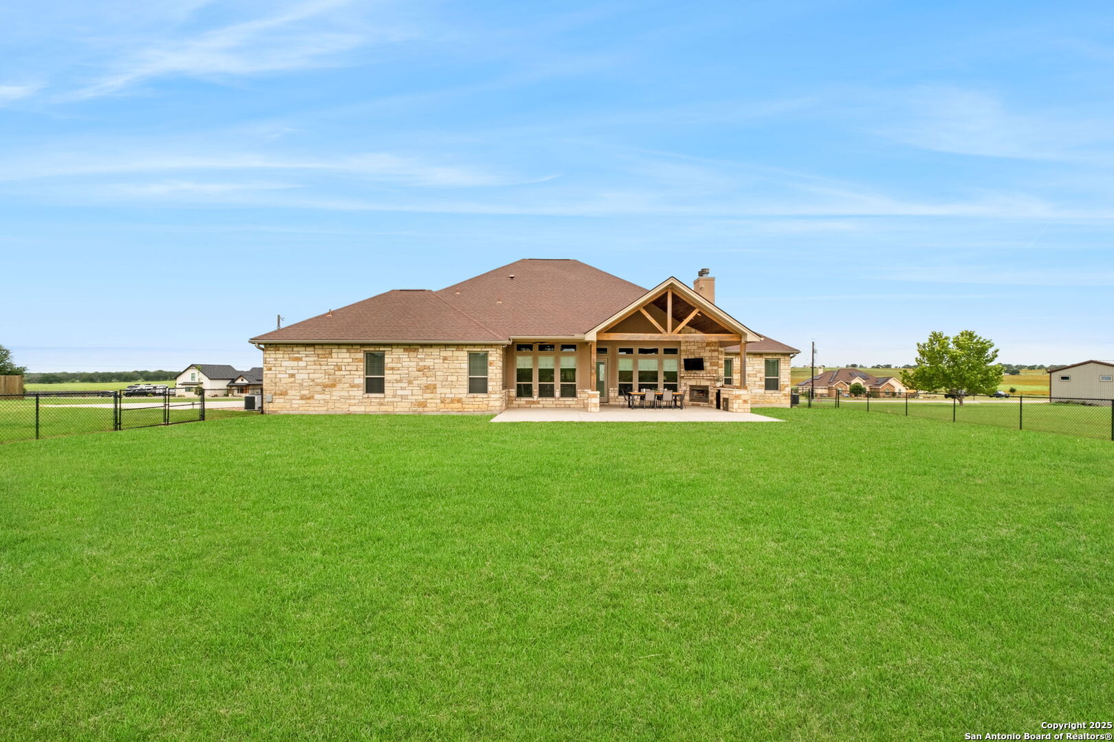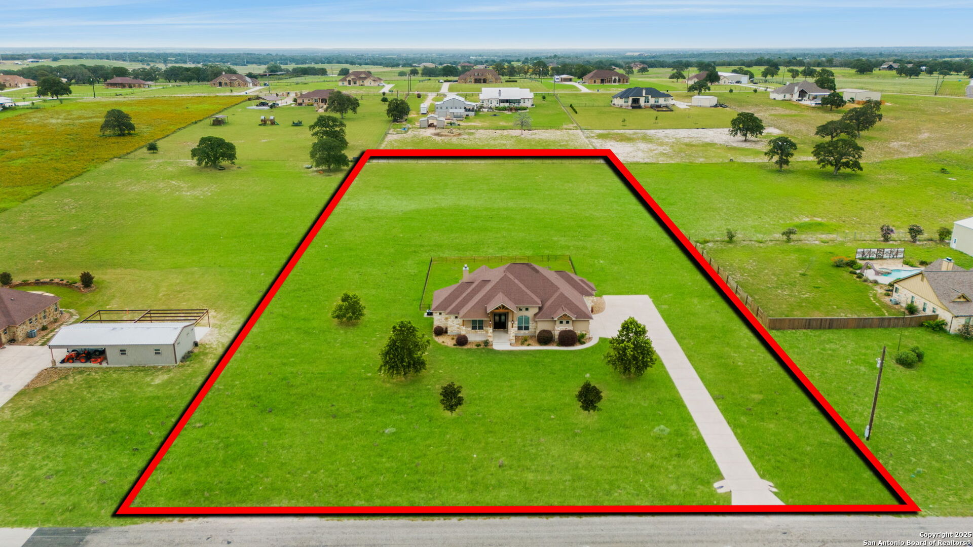 ONE-OF-A-KIND CUSTOM HOME WITH UP TO $80K IN UPGRADES & FEATURES NOW OFFERED AT $640K!! Discover your dream home on over three acres of elevated property offering breathtaking views in a neighborhood where spacious lots ensure ultimate privacy. This gorgeous custom stone and stucco residence showcases meticulous craftsmanship throughout its thoughtfully designed 2,794 square feet. The split floor plan maximizes natural light through oversized windows and dramatic clerestory features, creating an airy atmosphere enhanced by decorative high ceilings, elegant crown molding, and graceful arched doorways. The heart of the home features a striking floor-to-ceiling stone fireplace, while the gourmet kitchen impresses with its stone arch details, granite countertops, stainless steel appliances, and wraparound bar perfect for entertaining. Three well-appointed bedrooms include a luxurious primary suite with private patio access and barn door entry to a spa-like bathroom featuring a custom stone tiled walk-through shower and oversized soaking tub. A dedicated office provides the perfect work-from-home retreat, positioned away from bedrooms for optimal privacy. Step outside to your personal oasis featuring an oversized covered patio complete with outdoor kitchen and wood-burning fireplace - perfect for entertaining under the Texas sky. Premium features include a three-car side-entry garage with smart technology integration, central vacuum system, outdoor weather monitoring, security camera coverage around perimeter of home and meticulous attention to detail throughout. Every detail reflects the owner's dedication to quality, from custom stonework to immaculate maintenance standards. This rare opportunity combines luxury living with rural tranquility and every detail make this property a standout choice for the Buyer seeking something truly special.