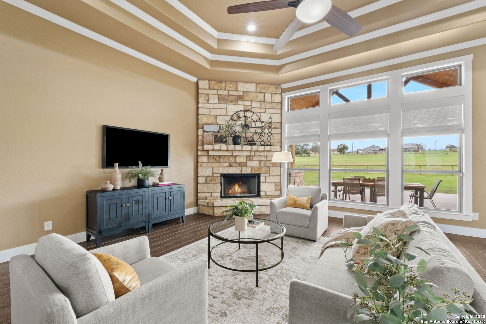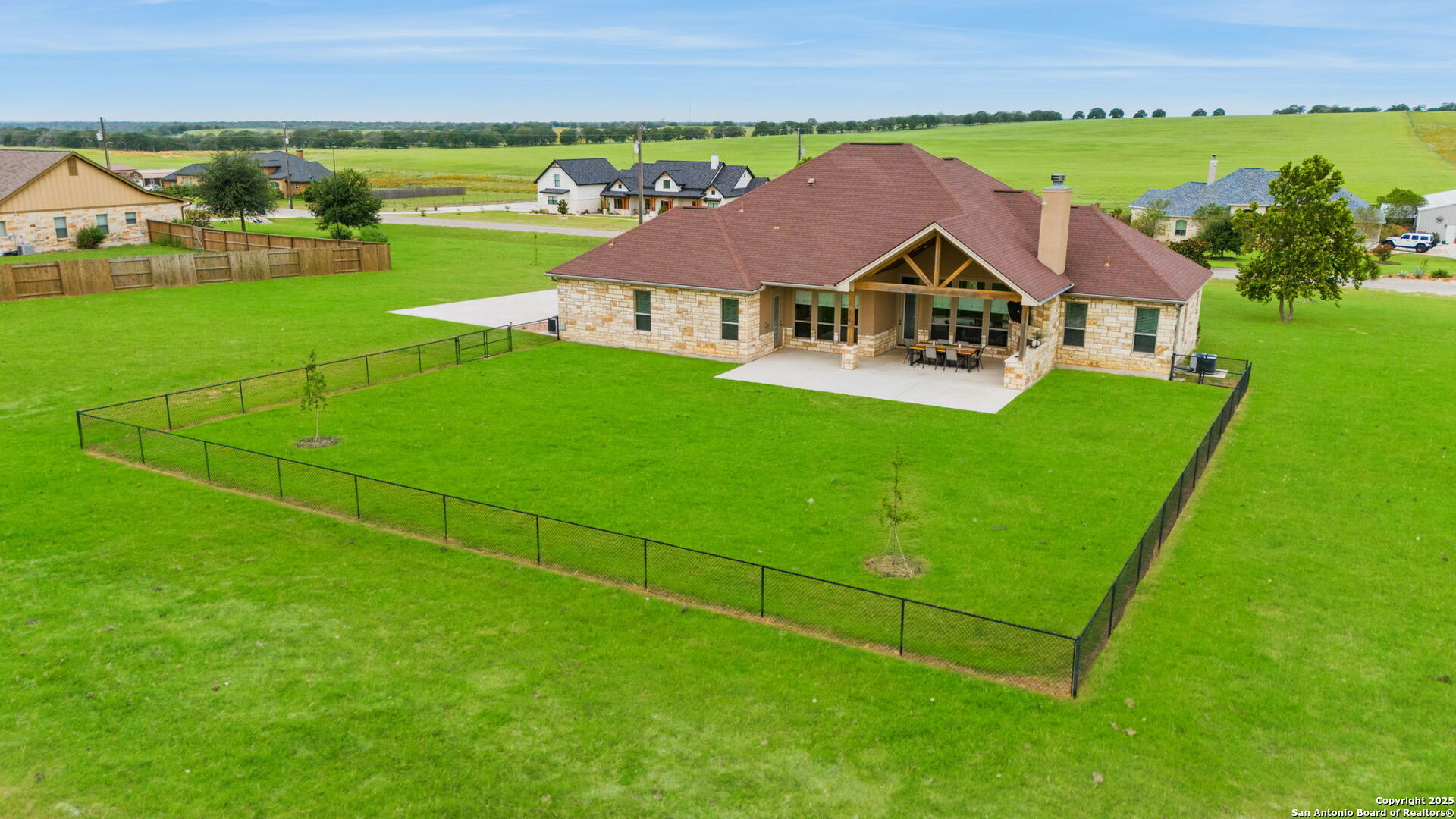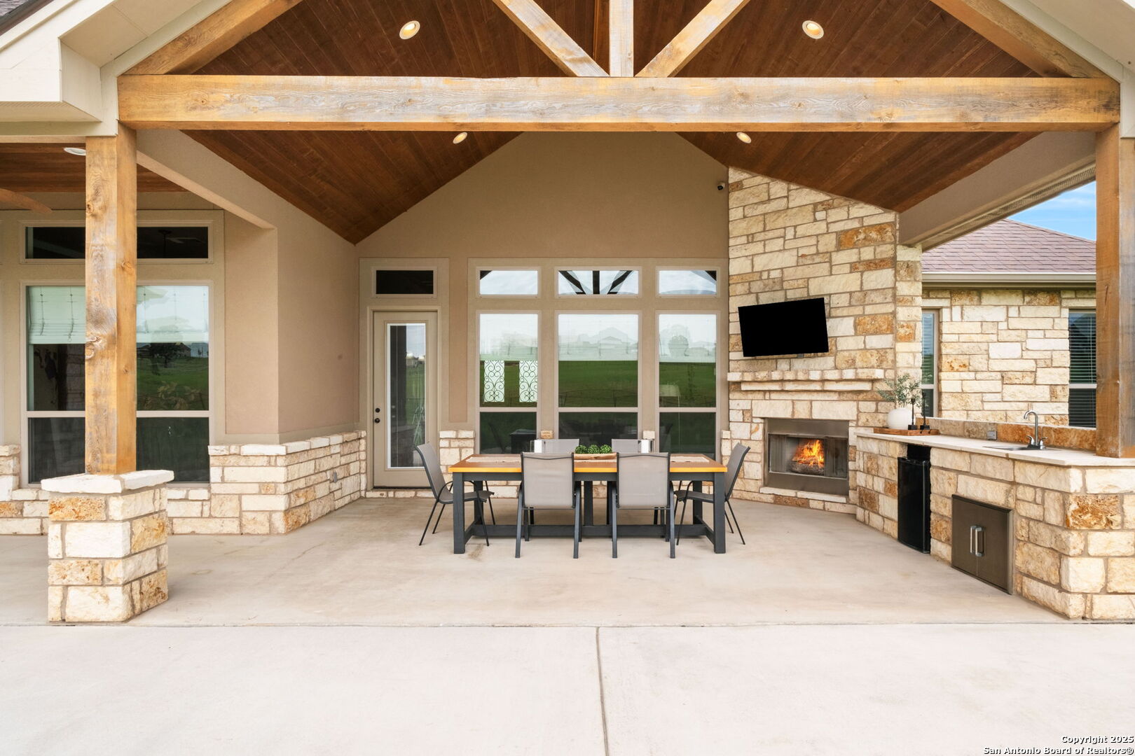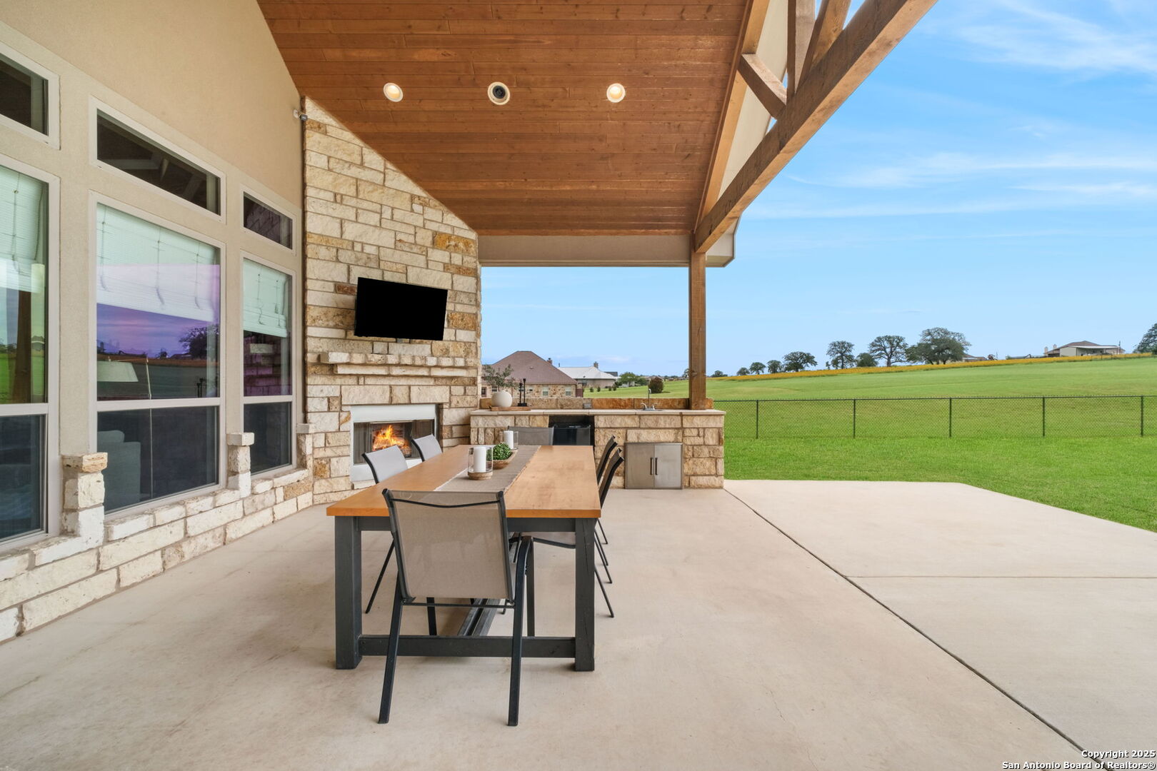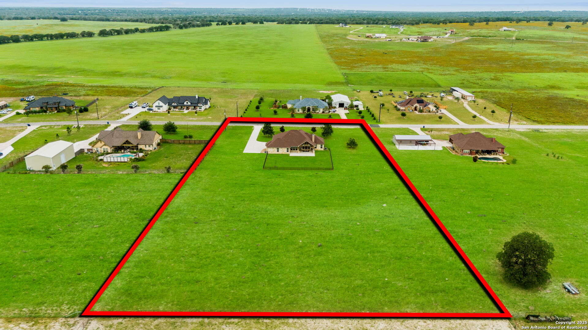 ONE-OF-A-KIND CUSTOM HOME WITH UP TO $80K IN UPGRADES & FEATURES NOW OFFERED AT $640K!! Discover your dream home on over three acres of elevated property offering breathtaking views in a neighborhood where spacious lots ensure ultimate privacy. This gorgeous custom stone and stucco residence showcases meticulous craftsmanship throughout its thoughtfully designed 2,794 square feet. The split floor plan maximizes natural light through oversized windows and dramatic clerestory features, creating an airy atmosphere enhanced by decorative high ceilings, elegant crown molding, and graceful arched doorways. The heart of the home features a striking floor-to-ceiling stone fireplace, while the gourmet kitchen impresses with its stone arch details, granite countertops, stainless steel appliances, and wraparound bar perfect for entertaining. Three well-appointed bedrooms include a luxurious primary suite with private patio access and barn door entry to a spa-like bathroom featuring a custom stone tiled walk-through shower and oversized soaking tub. A dedicated office provides the perfect work-from-home retreat, positioned away from bedrooms for optimal privacy. Step outside to your personal oasis featuring an oversized covered patio complete with outdoor kitchen and wood-burning fireplace - perfect for entertaining under the Texas sky. Premium features include a three-car side-entry garage with smart technology integration, central vacuum system, outdoor weather monitoring, security camera coverage around perimeter of home and meticulous attention to detail throughout. Every detail reflects the owner's dedication to quality, from custom stonework to immaculate maintenance standards. This rare opportunity combines luxury living with rural tranquility and every detail make this property a standout choice for the Buyer seeking something truly special.