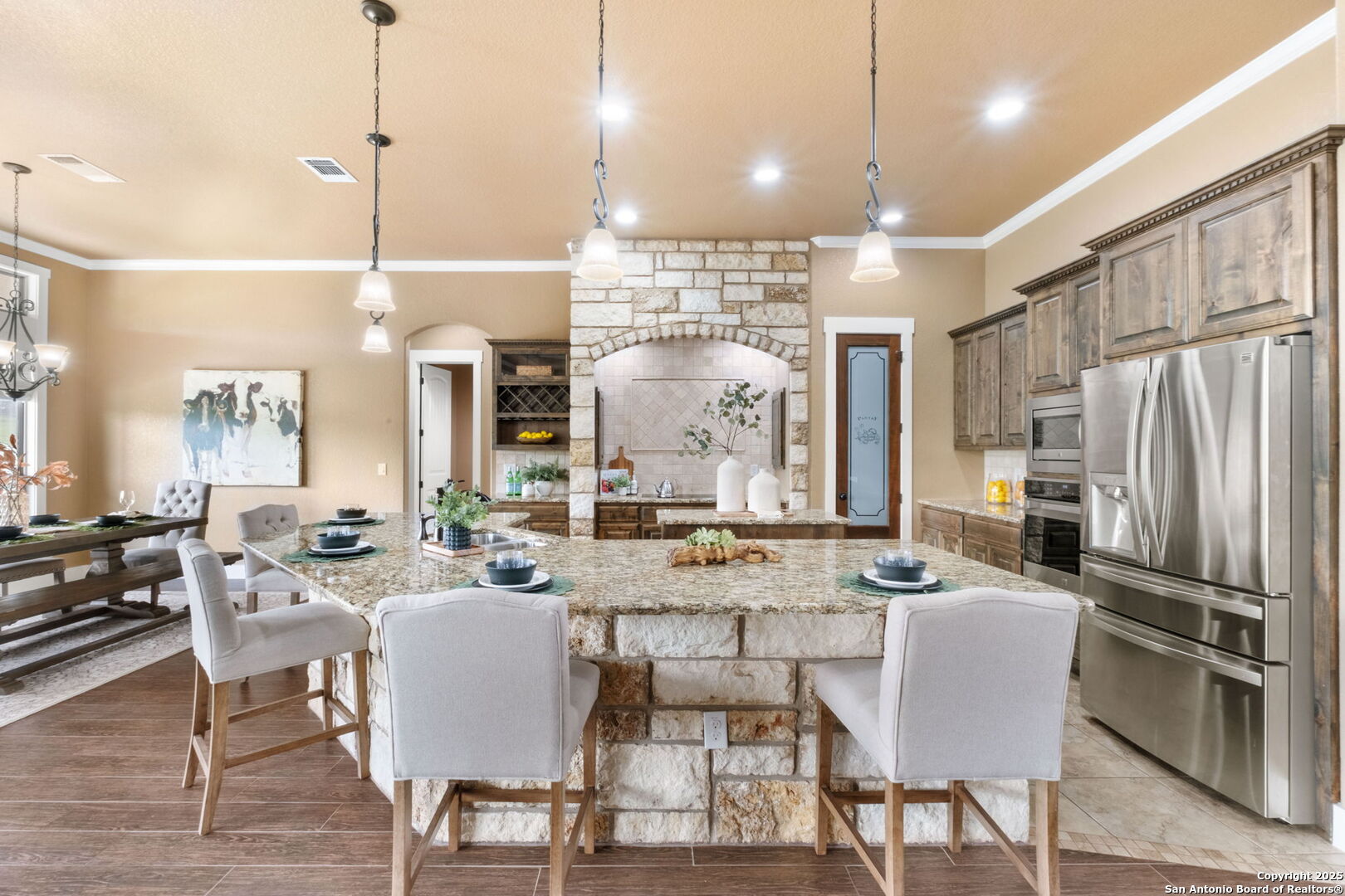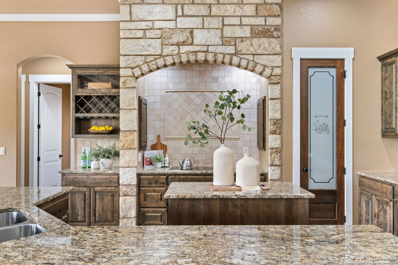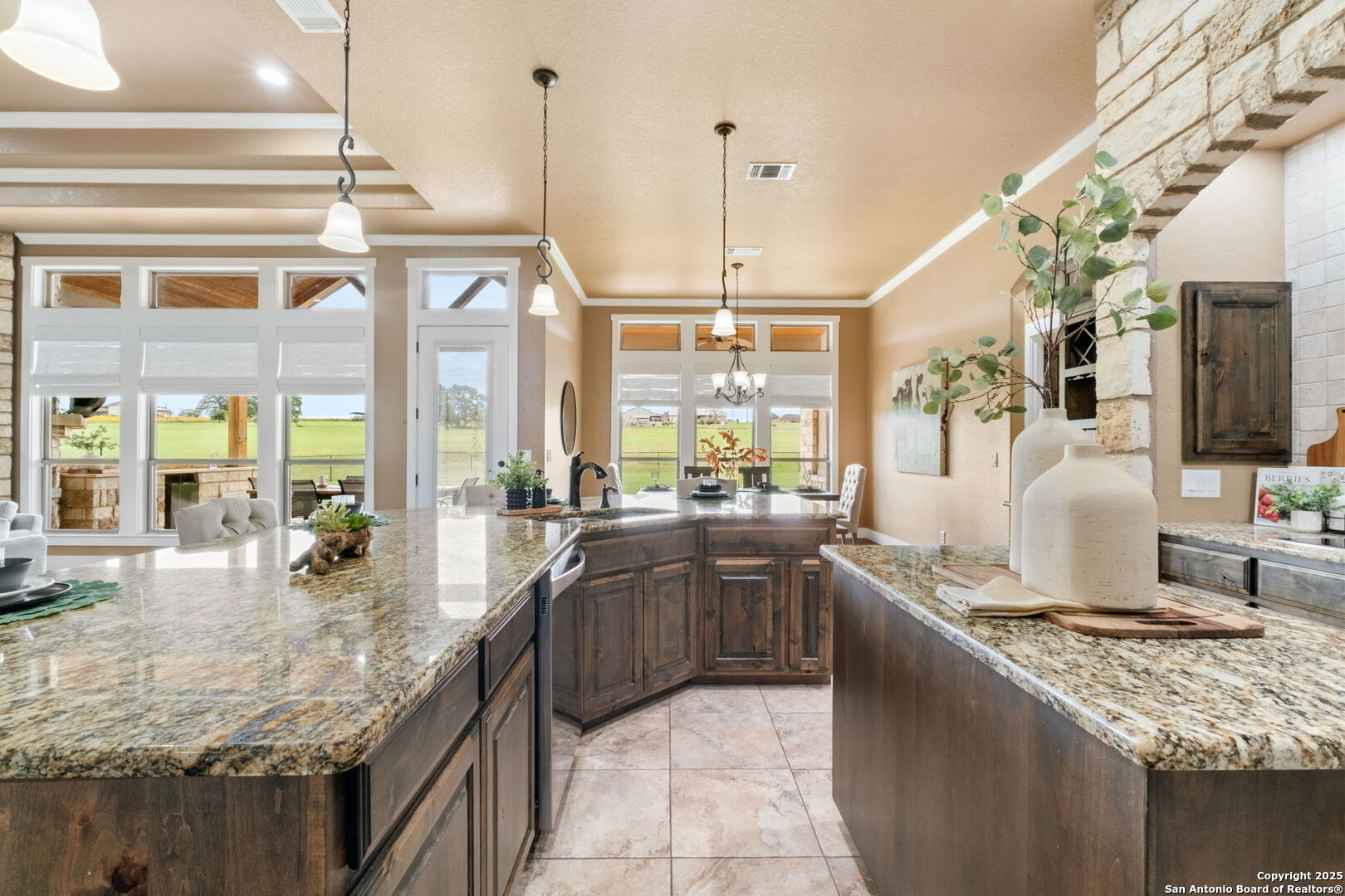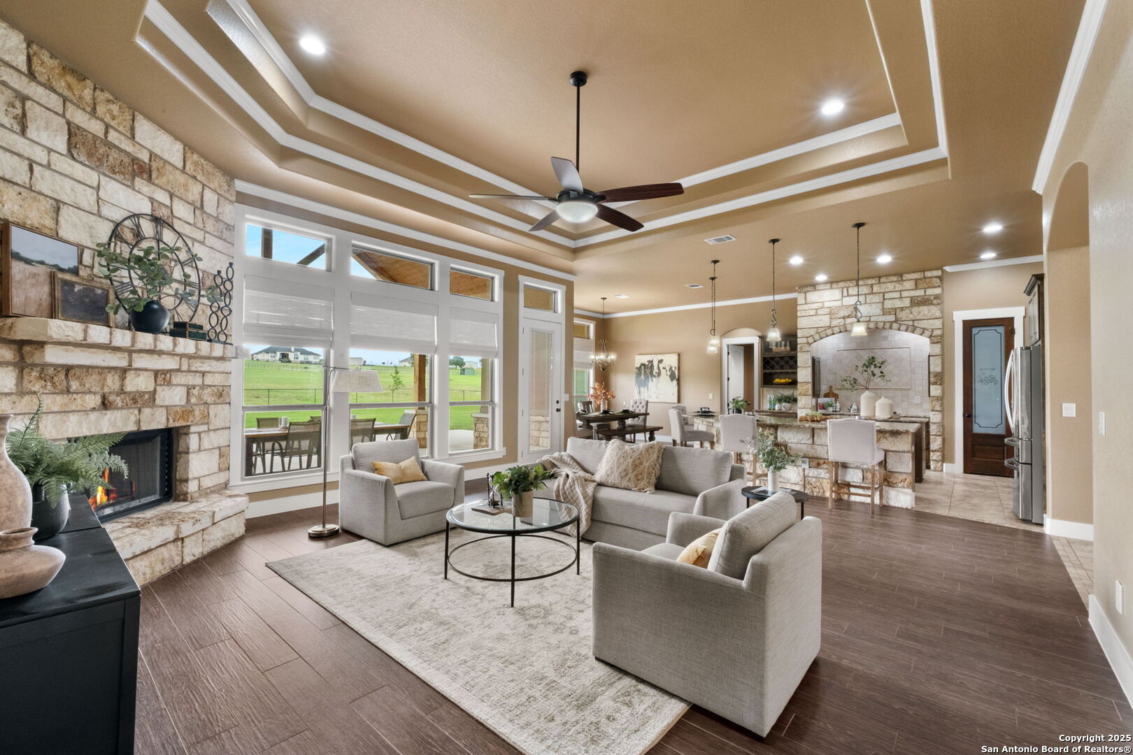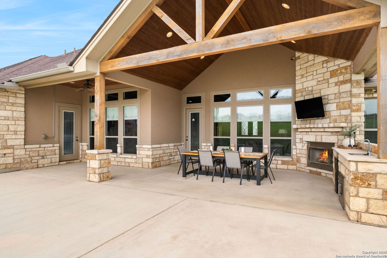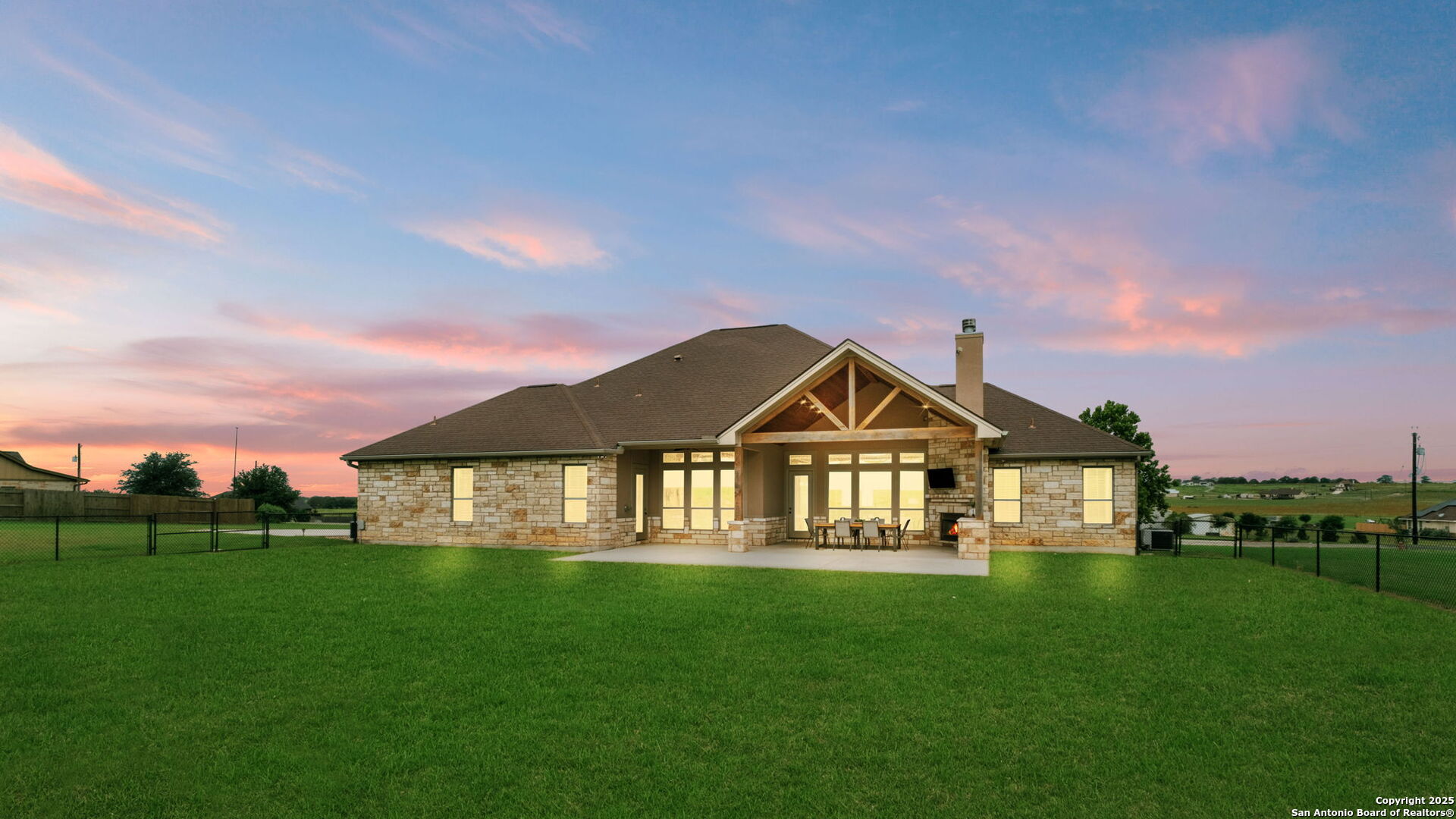 ONE-OF-A-KIND CUSTOM HOME WITH UP TO $80K IN UPGRADES & FEATURES NOW OFFERED AT $640K!! Discover your dream home on over three acres of elevated property offering breathtaking views in a neighborhood where spacious lots ensure ultimate privacy. This gorgeous custom stone and stucco residence showcases meticulous craftsmanship throughout its thoughtfully designed 2,794 square feet. The split floor plan maximizes natural light through oversized windows and dramatic clerestory features, creating an airy atmosphere enhanced by decorative high ceilings, elegant crown molding, and graceful arched doorways. The heart of the home features a striking floor-to-ceiling stone fireplace, while the gourmet kitchen impresses with its stone arch details, granite countertops, stainless steel appliances, and wraparound bar perfect for entertaining. Three well-appointed bedrooms include a luxurious primary suite with private patio access and barn door entry to a spa-like bathroom featuring a custom stone tiled walk-through shower and oversized soaking tub. A dedicated office provides the perfect work-from-home retreat, positioned away from bedrooms for optimal privacy. Step outside to your personal oasis featuring an oversized covered patio complete with outdoor kitchen and wood-burning fireplace - perfect for entertaining under the Texas sky. Premium features include a three-car side-entry garage with smart technology integration, central vacuum system, outdoor weather monitoring, security camera coverage around perimeter of home and meticulous attention to detail throughout. Every detail reflects the owner's dedication to quality, from custom stonework to immaculate maintenance standards. This rare opportunity combines luxury living with rural tranquility and every detail make this property a standout choice for the Buyer seeking something truly special.