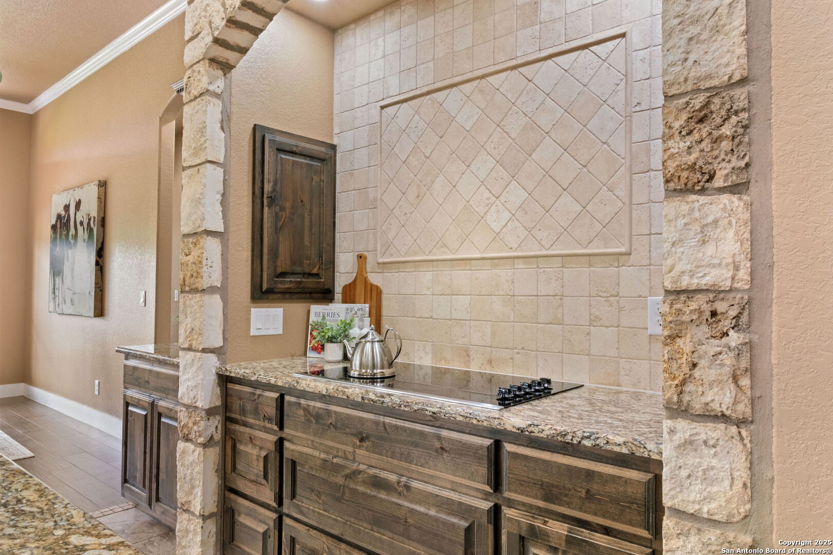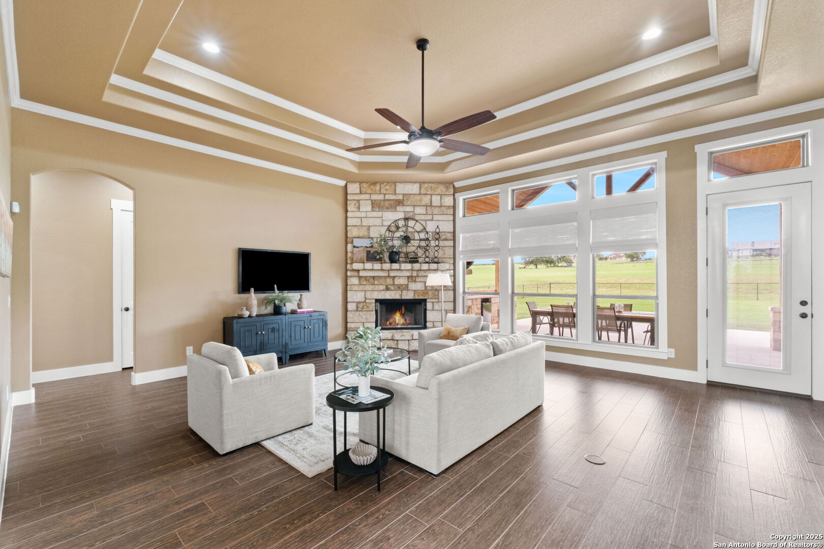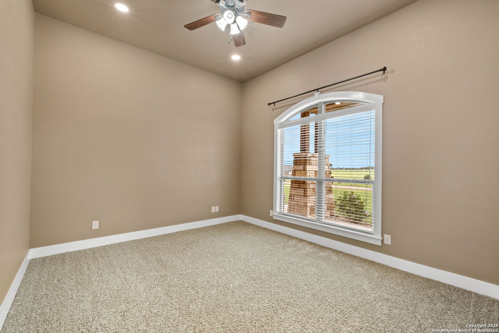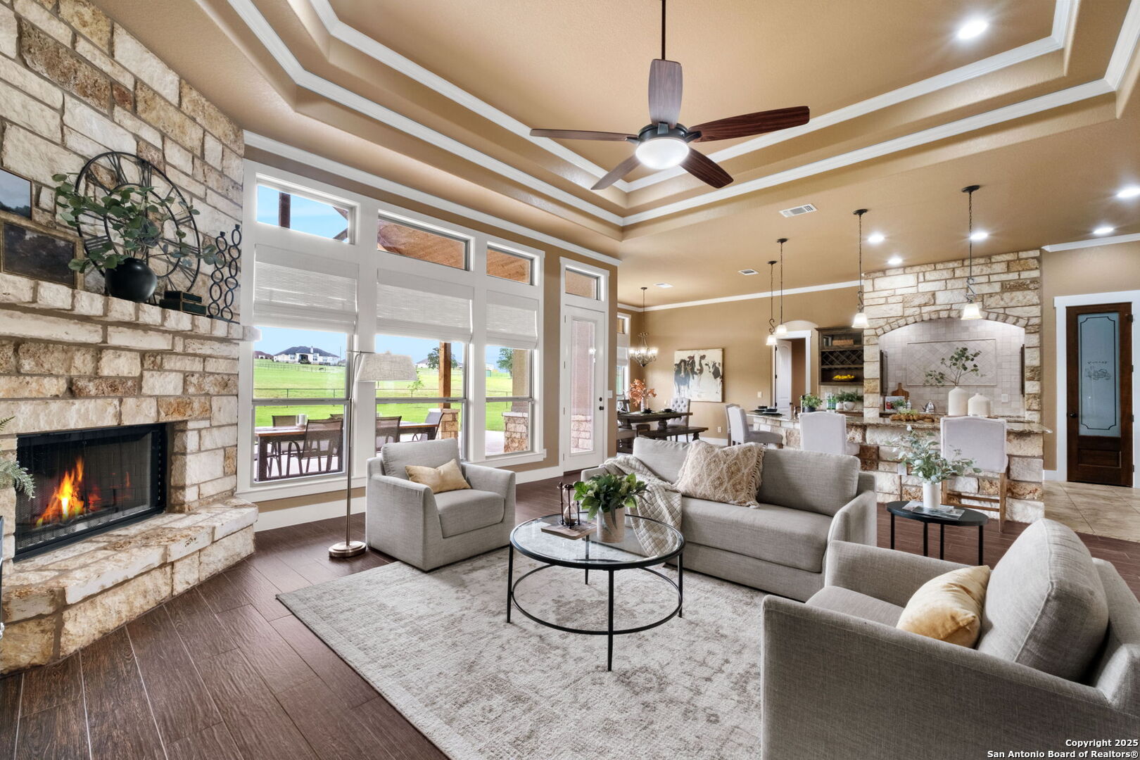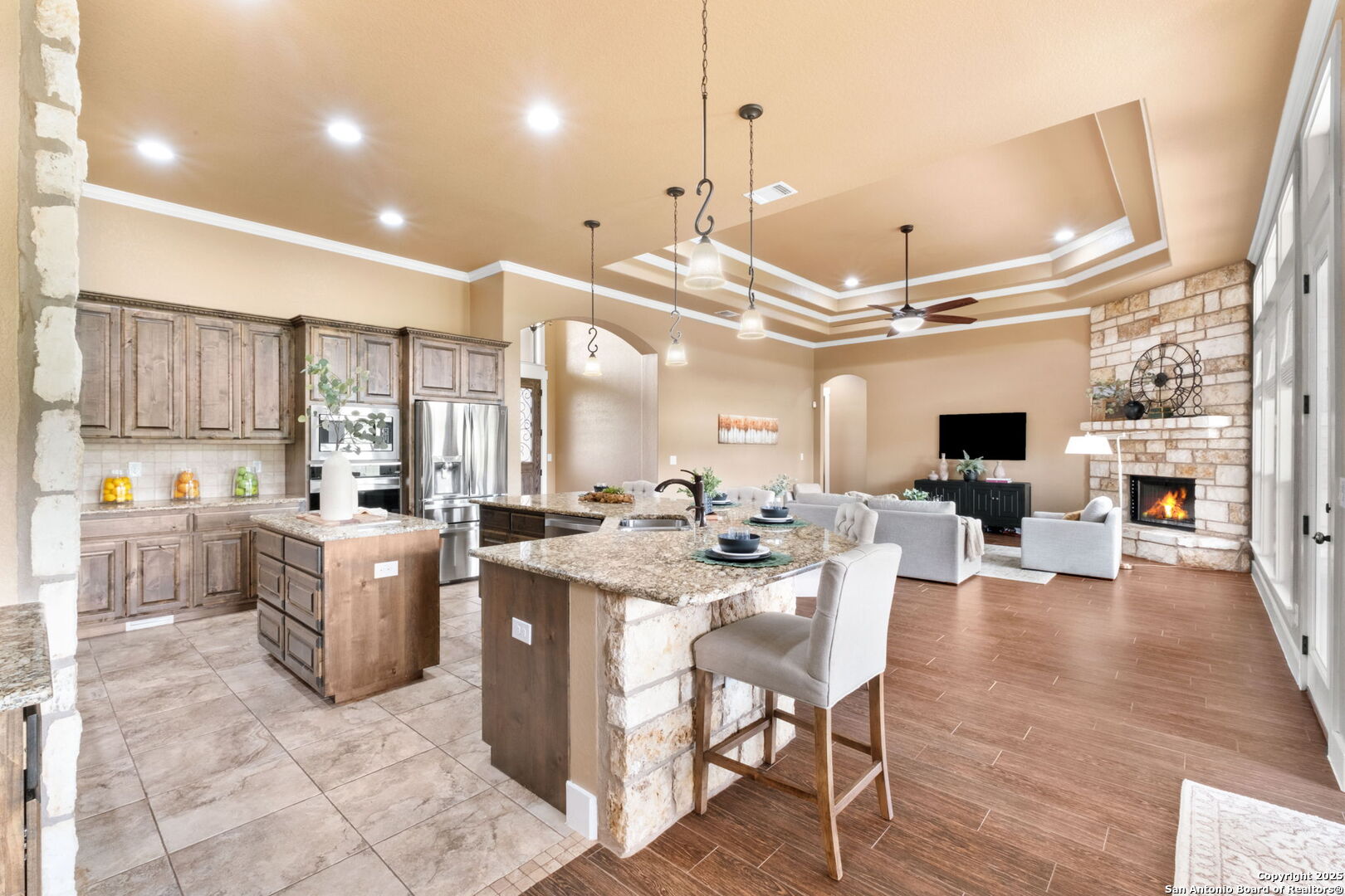 ONE-OF-A-KIND CUSTOM HOME WITH UP TO $80K IN UPGRADES & FEATURES NOW OFFERED AT $640K!! Discover your dream home on over three acres of elevated property offering breathtaking views in a neighborhood where spacious lots ensure ultimate privacy. This gorgeous custom stone and stucco residence showcases meticulous craftsmanship throughout its thoughtfully designed 2,794 square feet. The split floor plan maximizes natural light through oversized windows and dramatic clerestory features, creating an airy atmosphere enhanced by decorative high ceilings, elegant crown molding, and graceful arched doorways. The heart of the home features a striking floor-to-ceiling stone fireplace, while the gourmet kitchen impresses with its stone arch details, granite countertops, stainless steel appliances, and wraparound bar perfect for entertaining. Three well-appointed bedrooms include a luxurious primary suite with private patio access and barn door entry to a spa-like bathroom featuring a custom stone tiled walk-through shower and oversized soaking tub. A dedicated office provides the perfect work-from-home retreat, positioned away from bedrooms for optimal privacy. Step outside to your personal oasis featuring an oversized covered patio complete with outdoor kitchen and wood-burning fireplace - perfect for entertaining under the Texas sky. Premium features include a three-car side-entry garage with smart technology integration, central vacuum system, outdoor weather monitoring, security camera coverage around perimeter of home and meticulous attention to detail throughout. Every detail reflects the owner's dedication to quality, from custom stonework to immaculate maintenance standards. This rare opportunity combines luxury living with rural tranquility and every detail make this property a standout choice for the Buyer seeking something truly special.