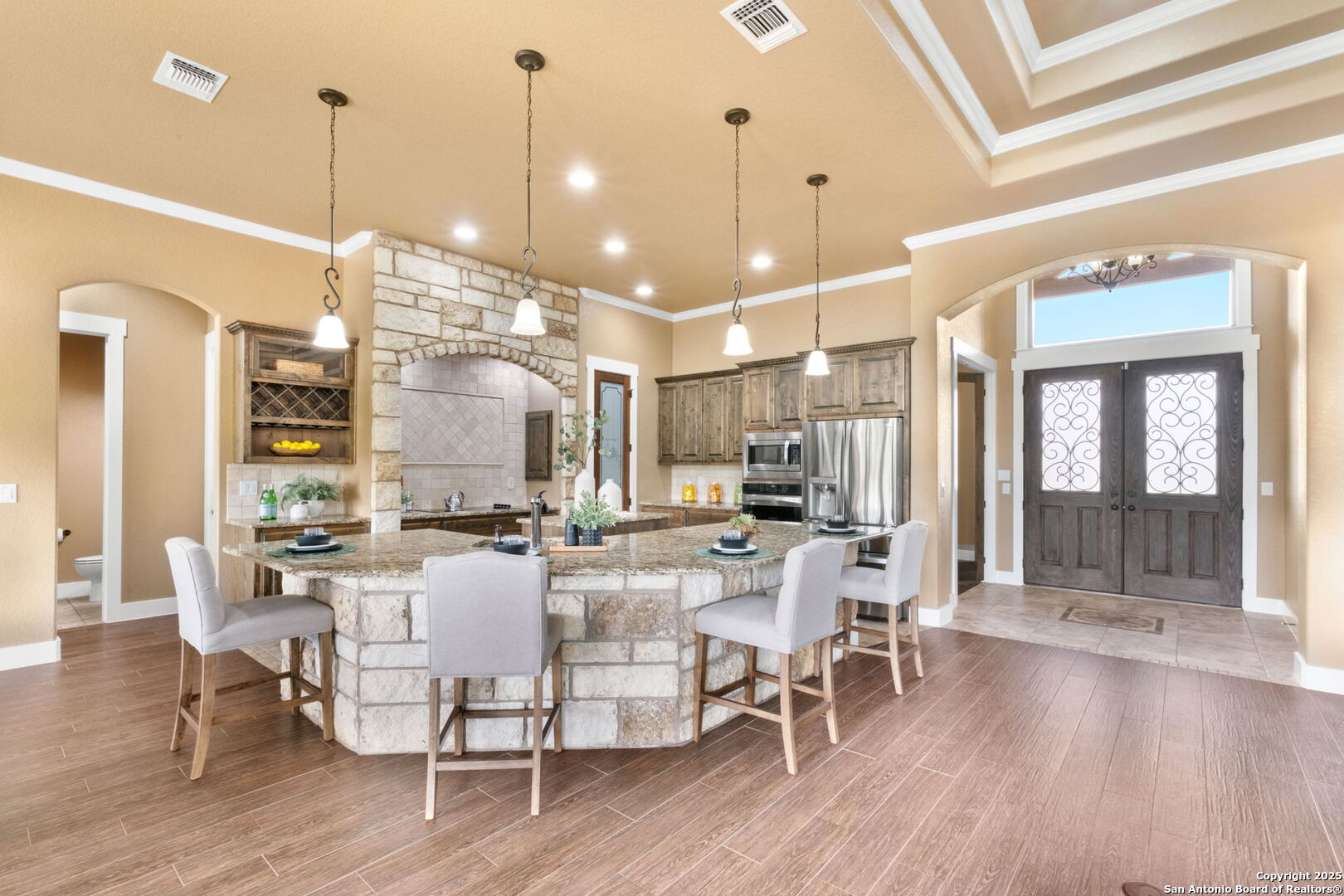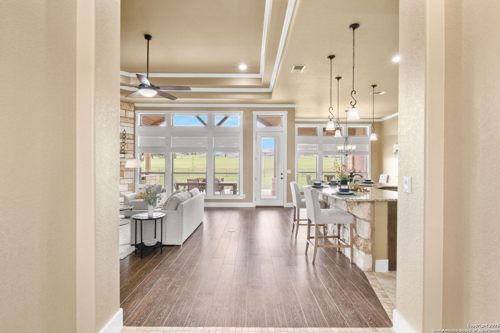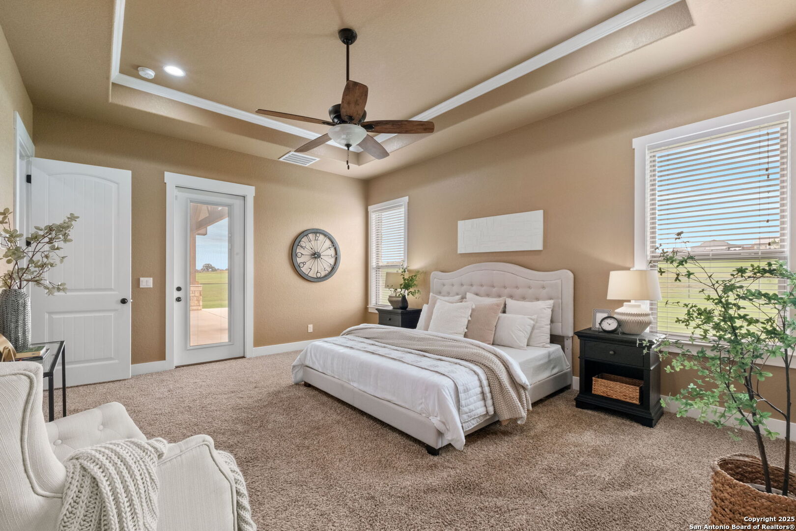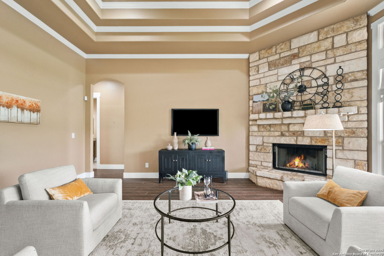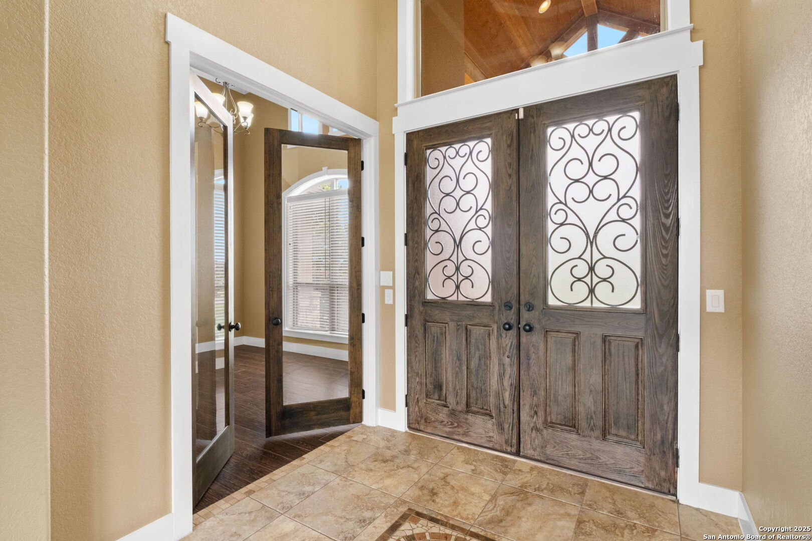 ONE-OF-A-KIND CUSTOM HOME WITH UP TO $80K IN UPGRADES & FEATURES NOW OFFERED AT $640K!! Discover your dream home on over three acres of elevated property offering breathtaking views in a neighborhood where spacious lots ensure ultimate privacy. This gorgeous custom stone and stucco residence showcases meticulous craftsmanship throughout its thoughtfully designed 2,794 square feet. The split floor plan maximizes natural light through oversized windows and dramatic clerestory features, creating an airy atmosphere enhanced by decorative high ceilings, elegant crown molding, and graceful arched doorways. The heart of the home features a striking floor-to-ceiling stone fireplace, while the gourmet kitchen impresses with its stone arch details, granite countertops, stainless steel appliances, and wraparound bar perfect for entertaining. Three well-appointed bedrooms include a luxurious primary suite with private patio access and barn door entry to a spa-like bathroom featuring a custom stone tiled walk-through shower and oversized soaking tub. A dedicated office provides the perfect work-from-home retreat, positioned away from bedrooms for optimal privacy. Step outside to your personal oasis featuring an oversized covered patio complete with outdoor kitchen and wood-burning fireplace - perfect for entertaining under the Texas sky. Premium features include a three-car side-entry garage with smart technology integration, central vacuum system, outdoor weather monitoring, security camera coverage around perimeter of home and meticulous attention to detail throughout. Every detail reflects the owner's dedication to quality, from custom stonework to immaculate maintenance standards. This rare opportunity combines luxury living with rural tranquility and every detail make this property a standout choice for the Buyer seeking something truly special.