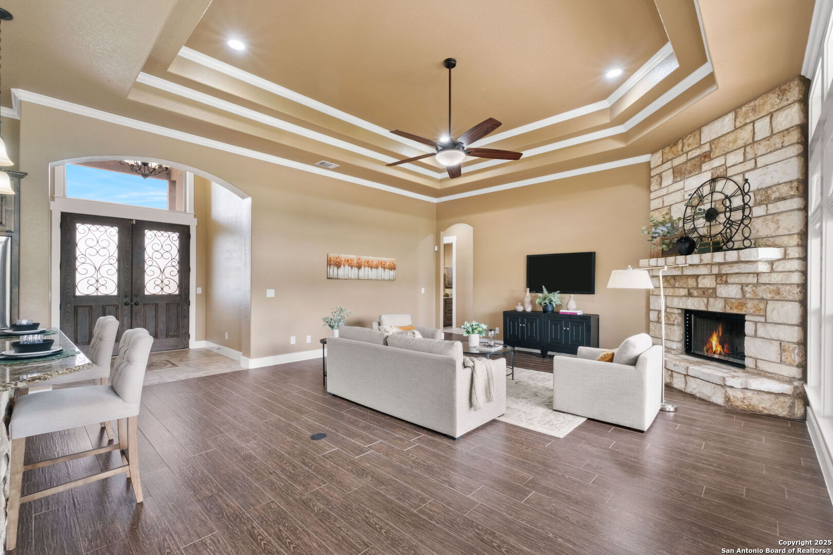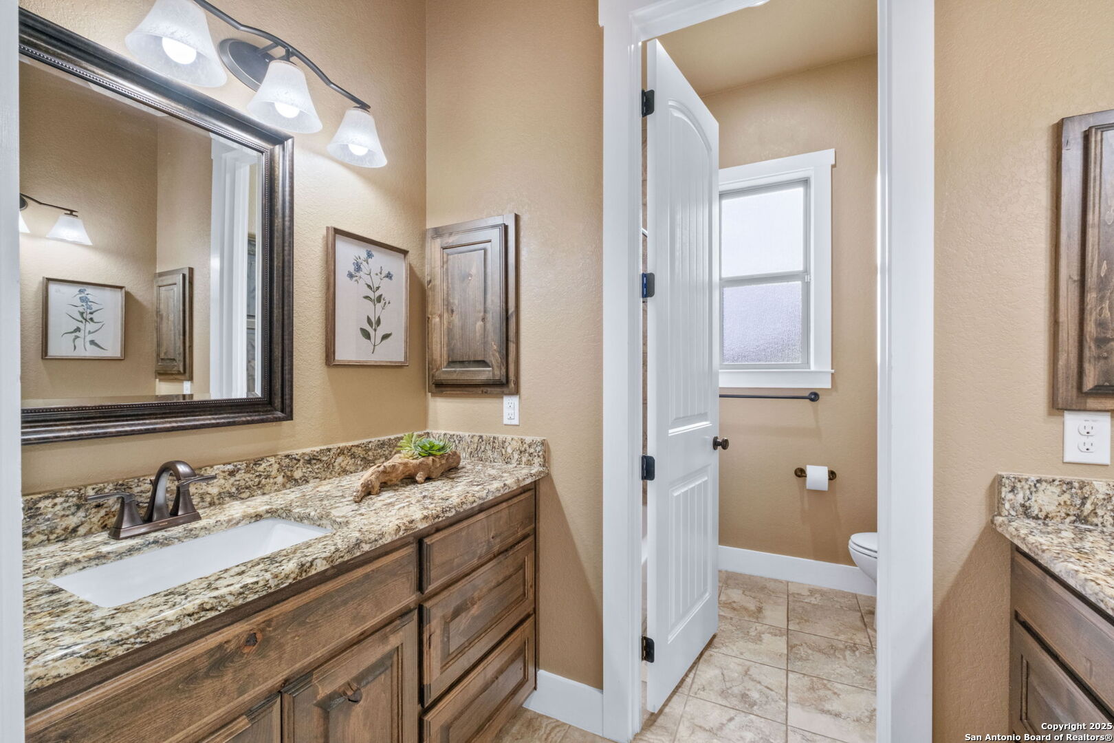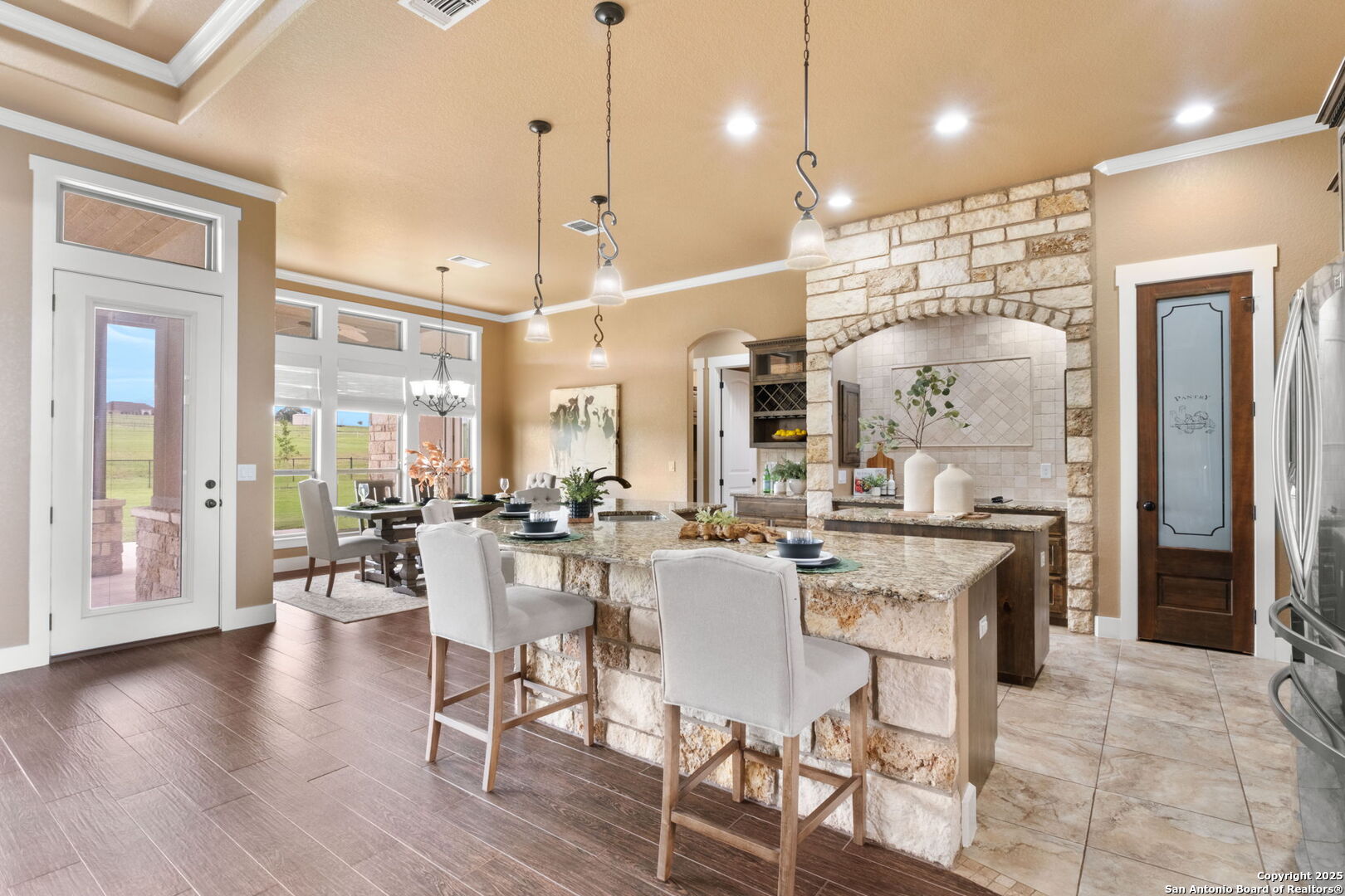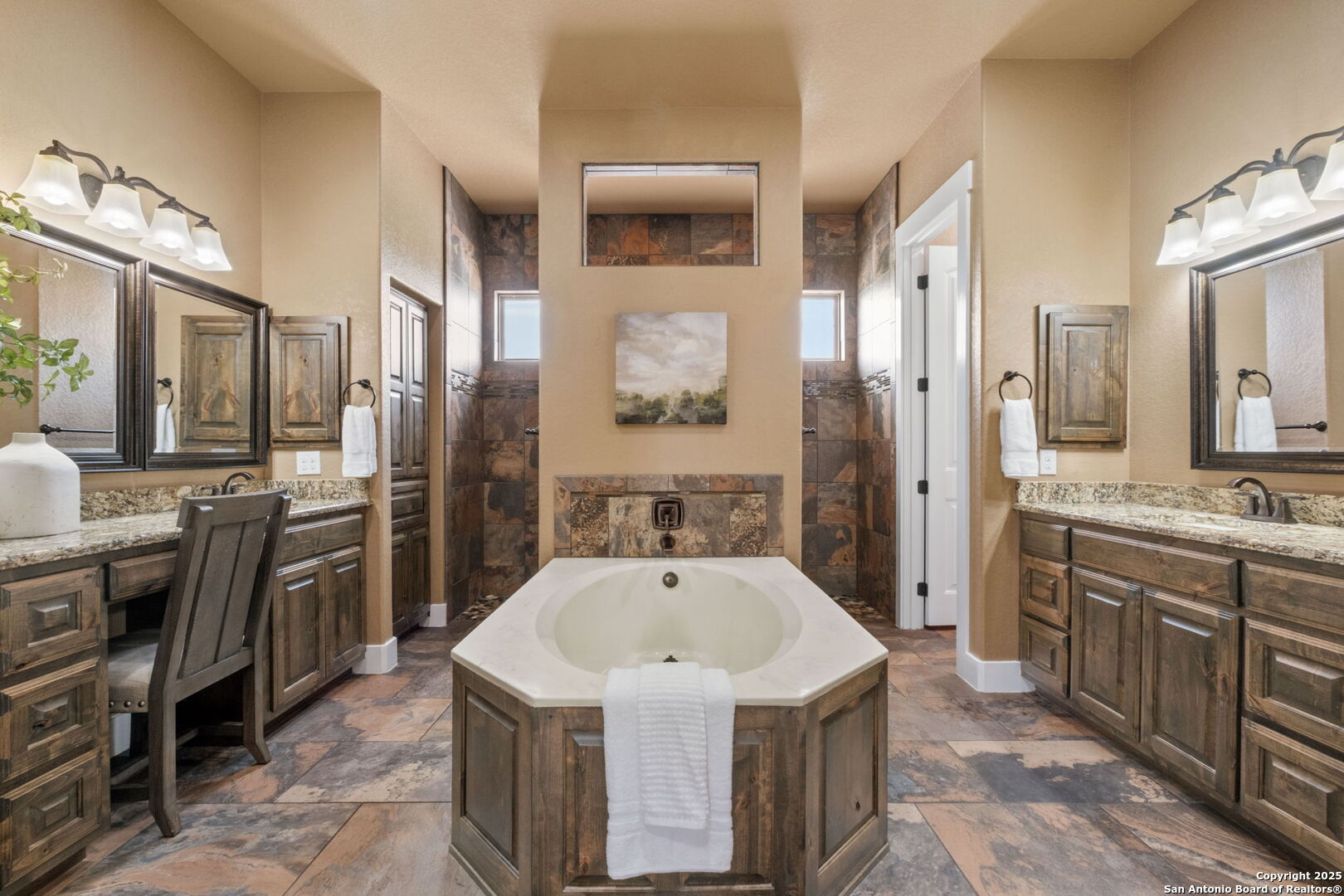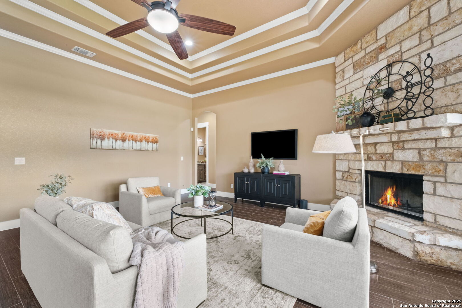 ONE-OF-A-KIND CUSTOM HOME WITH UP TO $80K IN UPGRADES & FEATURES NOW OFFERED AT $640K!! Discover your dream home on over three acres of elevated property offering breathtaking views in a neighborhood where spacious lots ensure ultimate privacy. This gorgeous custom stone and stucco residence showcases meticulous craftsmanship throughout its thoughtfully designed 2,794 square feet. The split floor plan maximizes natural light through oversized windows and dramatic clerestory features, creating an airy atmosphere enhanced by decorative high ceilings, elegant crown molding, and graceful arched doorways. The heart of the home features a striking floor-to-ceiling stone fireplace, while the gourmet kitchen impresses with its stone arch details, granite countertops, stainless steel appliances, and wraparound bar perfect for entertaining. Three well-appointed bedrooms include a luxurious primary suite with private patio access and barn door entry to a spa-like bathroom featuring a custom stone tiled walk-through shower and oversized soaking tub. A dedicated office provides the perfect work-from-home retreat, positioned away from bedrooms for optimal privacy. Step outside to your personal oasis featuring an oversized covered patio complete with outdoor kitchen and wood-burning fireplace - perfect for entertaining under the Texas sky. Premium features include a three-car side-entry garage with smart technology integration, central vacuum system, outdoor weather monitoring, security camera coverage around perimeter of home and meticulous attention to detail throughout. Every detail reflects the owner's dedication to quality, from custom stonework to immaculate maintenance standards. This rare opportunity combines luxury living with rural tranquility and every detail make this property a standout choice for the Buyer seeking something truly special.