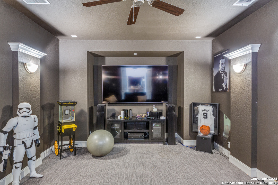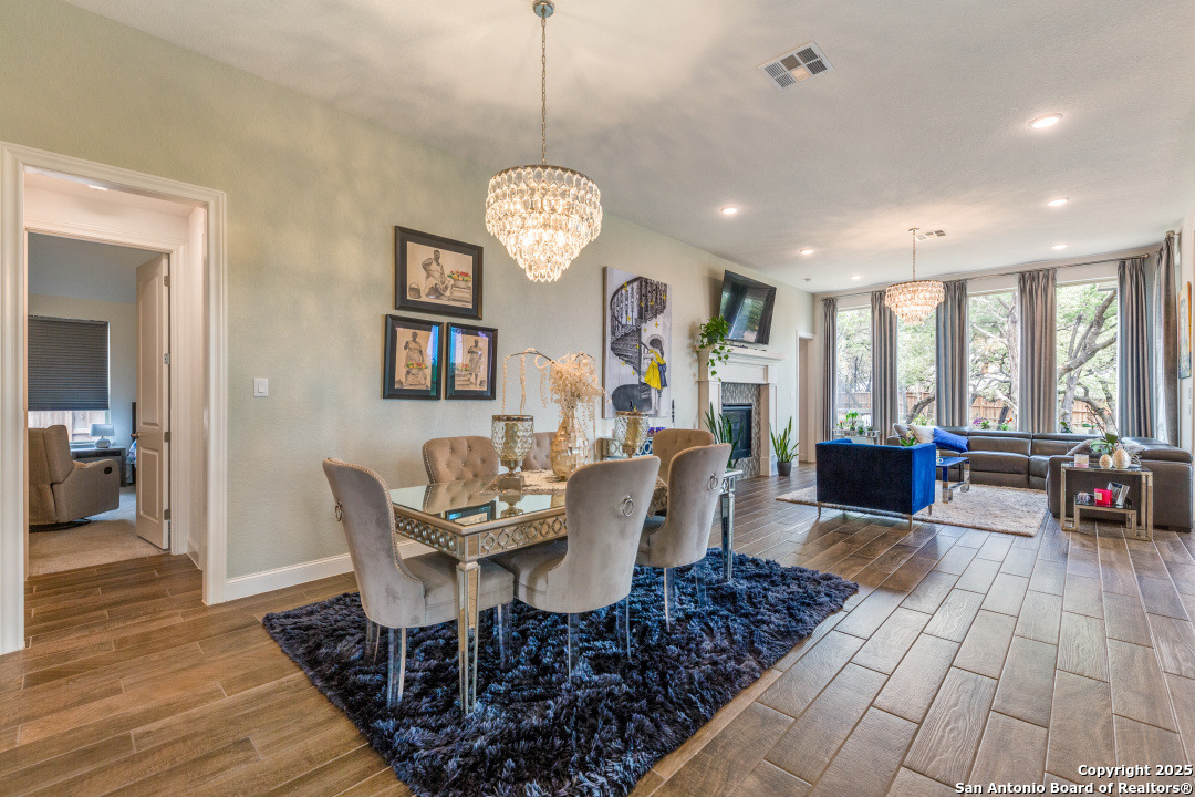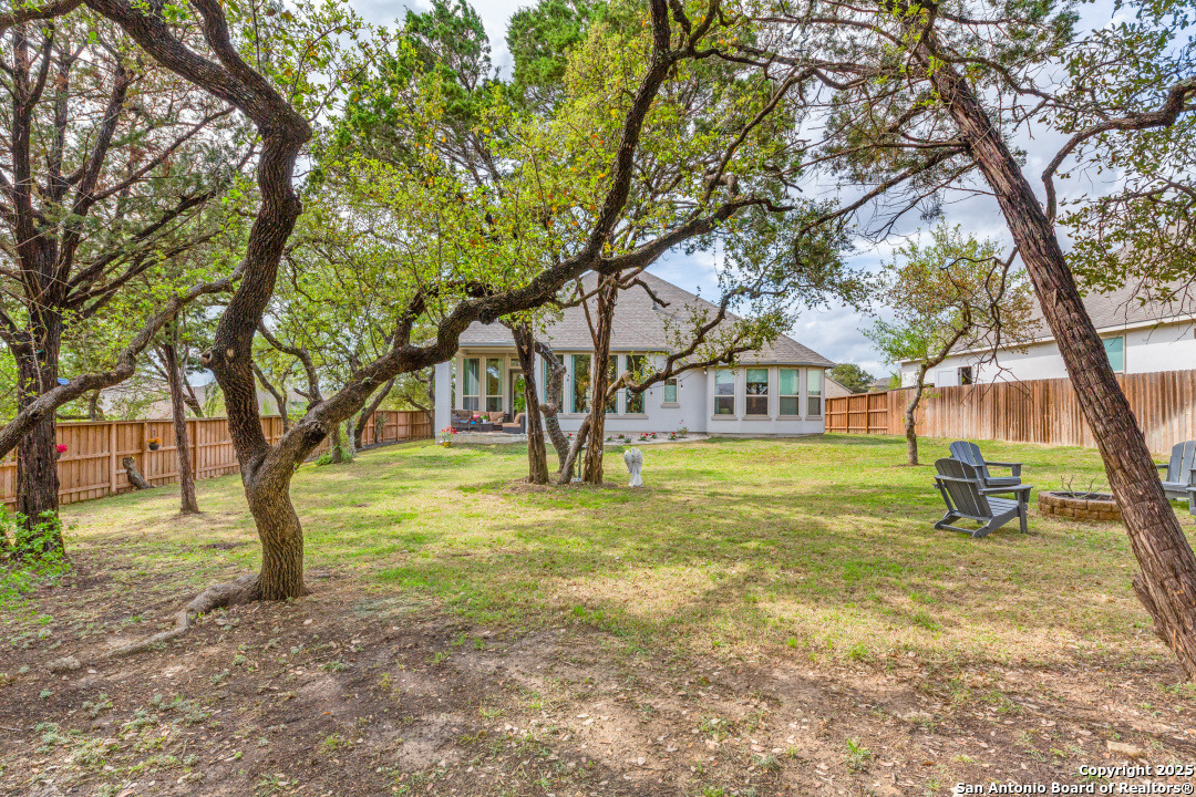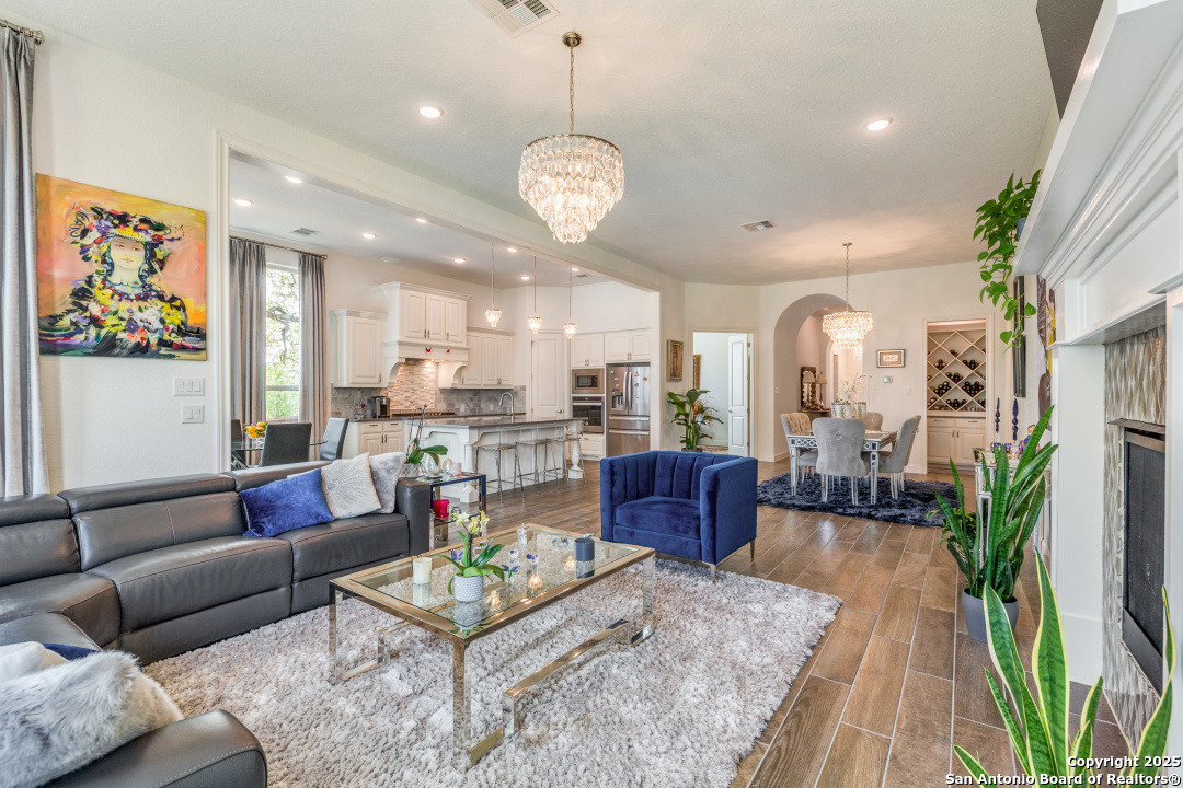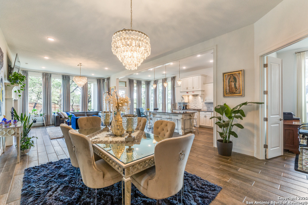 Elegant home with soaring ceilings, designer chandeliers & open-concept living perfect for entertaining. Spacious kitchen with oversized island flows into living & dining. Media room offers the ideal spot for movie nights. Covered patio overlooks large wooded backyard-private, serene & ready for a pool! Located in a gated community with resort-style amenities including water park & more. Features: meditation room, expansive primary closet, tankless water heater, 3-car tandem garage, sprinkler system, and walls of windows for natural light. Just 2 minutes from TPC golf course. A perfect blend of elegance, comfort & community lifestyle.