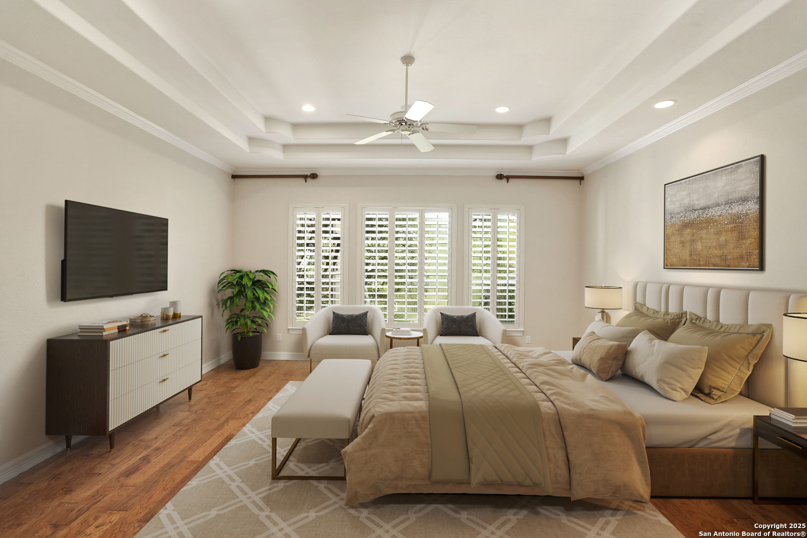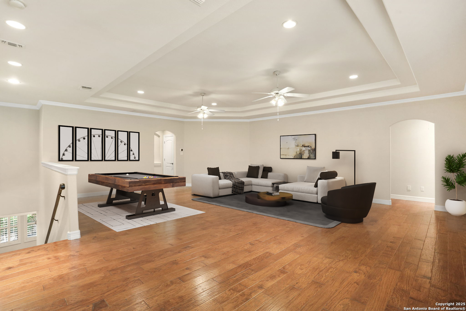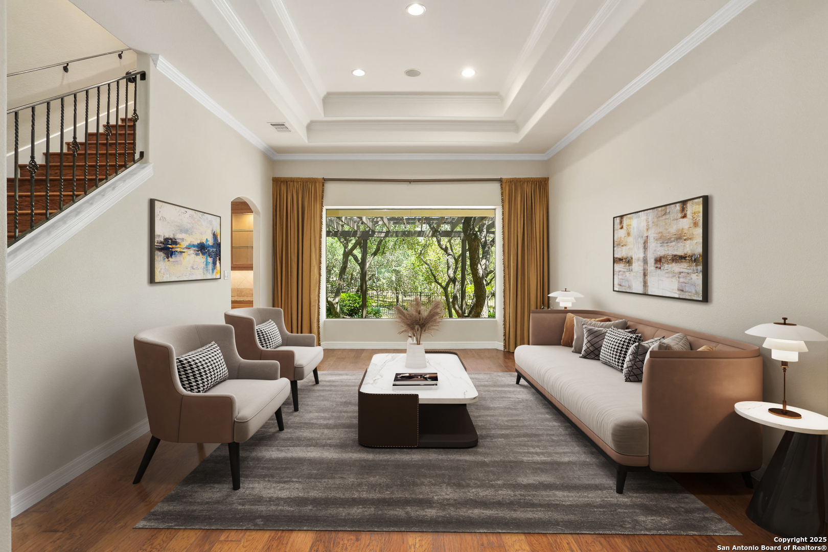 Location. Luxury. Lifestyle. Looking for the perfect blend of luxury living, unbeatable location and top-tier security? Welcome to The Estates of Canyon Springs- a prestigious guard-gated golf course community just north of Stone Oak. This exquisite one-owner Burdick Custom Home, set on a private greenbelt lot, is the ultimate expression of refined Hill Country living. Step inside and be captivated by the grand entry, flanked by a formal living and/or dining area-ideal for elegant entertaining or intimate family gatherings. The chef's kitchen is a culinary masterpiece, featuring abundant white oak custom cabinetry, a large center island, gas cooking, double ovens, a built-in refrigerator and thoughtful finishes that make cooking a joy. The open-concept great room impresses with a decorative TV wall and custom built-ins, including a hidden bookcase that leads to a secret study-a unique touch that adds both charm and function. Designed with privacy in mind, the primary suite is its own secluded retreat, complete with two generous walk-in closets, built-in drawer storage and a spa-like bath featuring a soaking tub and walk-in shower for the ultimate relaxation. A private guest suite is also located on the main level-perfect for multigenerational living or overnight visitors. Upstairs, you'll find three spacious secondary bedrooms (all with walk-in closets), two full baths (including an ensuite and a Jack-and-Jill), and an oversized game room-ideal for movie nights, gaming or homework zones. Step outside to your private backyard paradise. Lush landscaping surrounds a sparkling Keith Zars pool with a tranquil waterfall, attached hot tub and an expansive covered patio with a cozy outdoor fireplace. The extended pavilion is already outfitted with a gas hook-up-ready for your dream outdoor kitchen. Architectural details abound-from crown molding and plantation shutters to a water softener and more-this home is built for comfort, style and enduring quality. Luxury, Privacy and Timeless Elegance. Highly rated NEISD schools. Don't miss your chance to own a home that truly has it all.