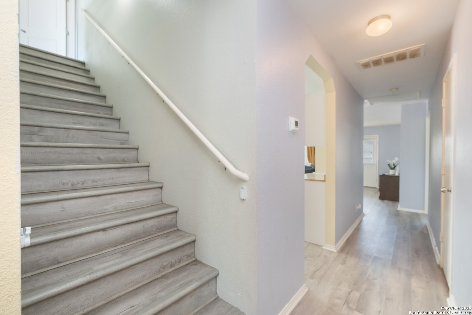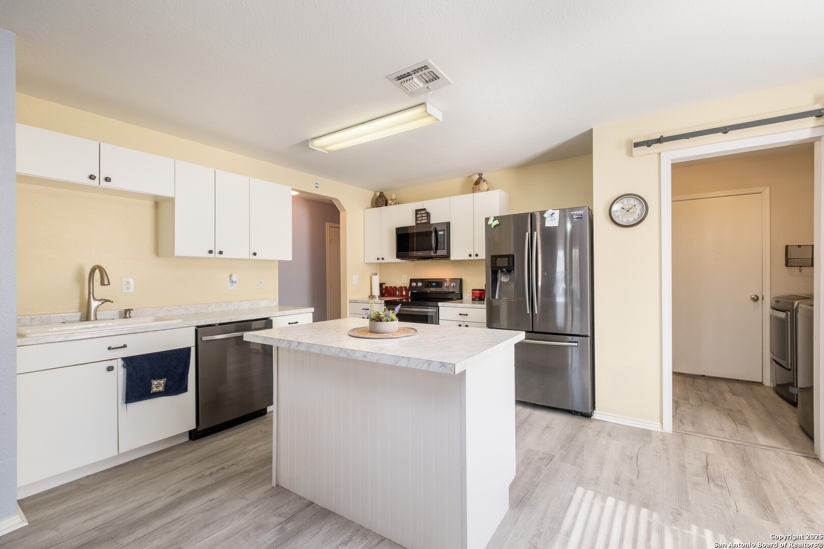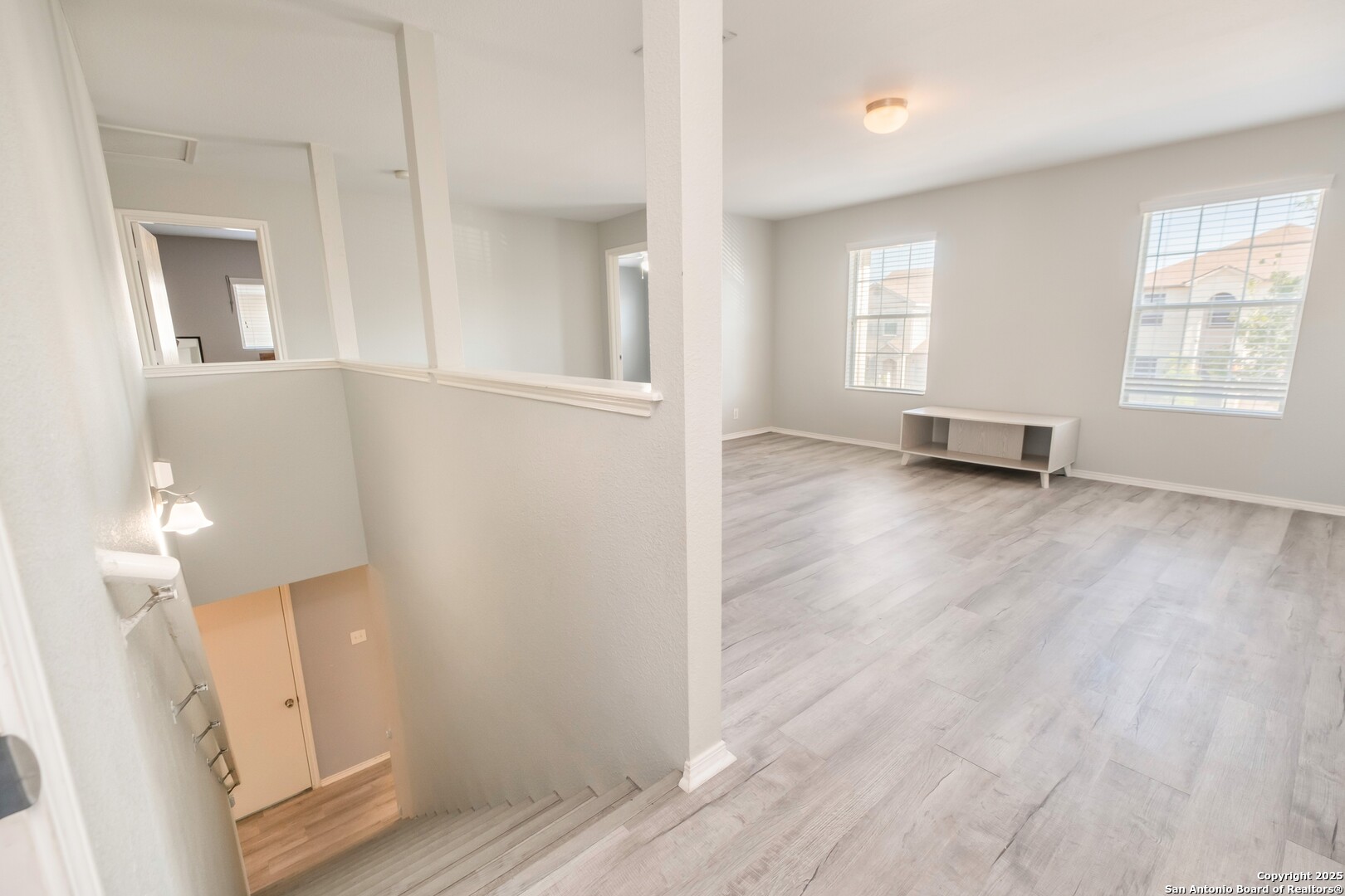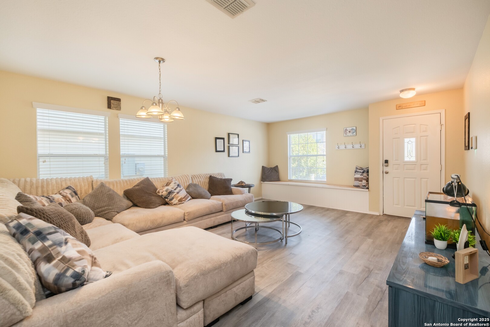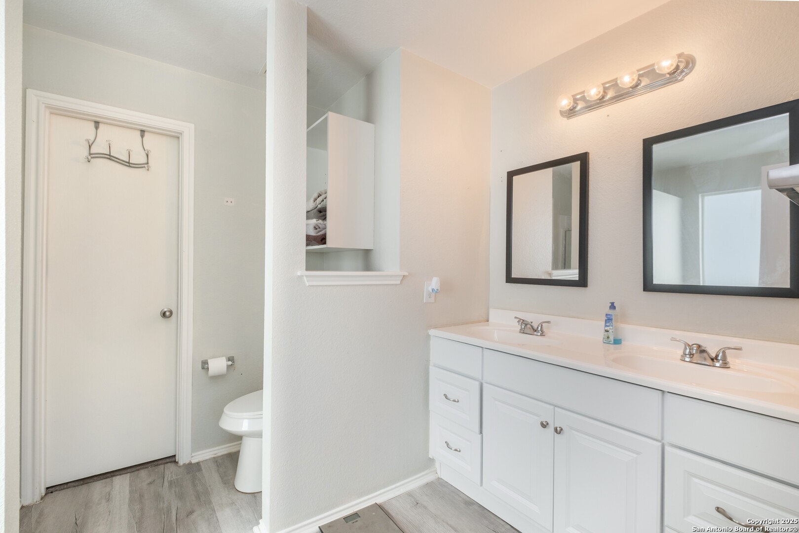 Welcome to this beautifully maintained two-story home boasting 2,556 sq ft of living space in the sought-after Bulverde Village community. You'll find 5 bedrooms, 2.5 bathrooms, giving plenty of room for family, guests, or a home office. The home features a 2-car attached garage, multiple living areas, and a cozy fireplace anchoring the main living room. The open island kitchen flows into one of the living spaces, allowing for effortless entertaining and everyday living. The layout is thoughtfully designed, with the primary bedroom on the main level, offering a private retreat featuring an ensuite bath with a double vanity, a garden tub, a separate walk-in shower, and a walk-in closet. Upstairs, you'll find the remaining carpeted bedrooms, along with a huge family room, giving your family or guests their own comfortable space. Outside, enjoy a fenced yard with a convenient sprinkler system and a covered patio perfect for relaxing or hosting. The community's amenities complete the lifestyle - this home sits in the park-and-playground-focused Creekhaven neighborhood of Bulverde Village and is close to shopping and major thoroughfares.