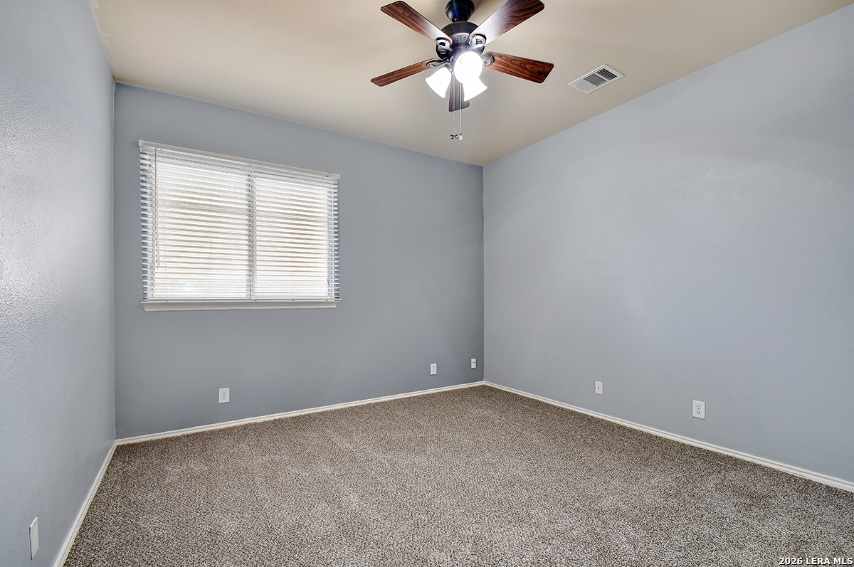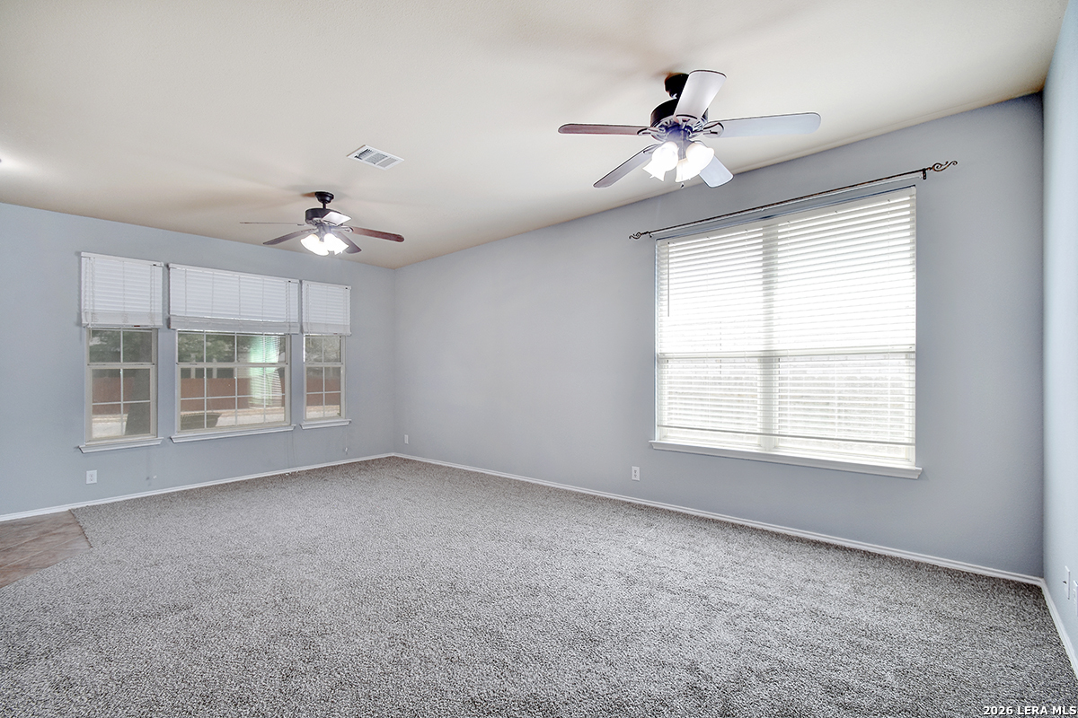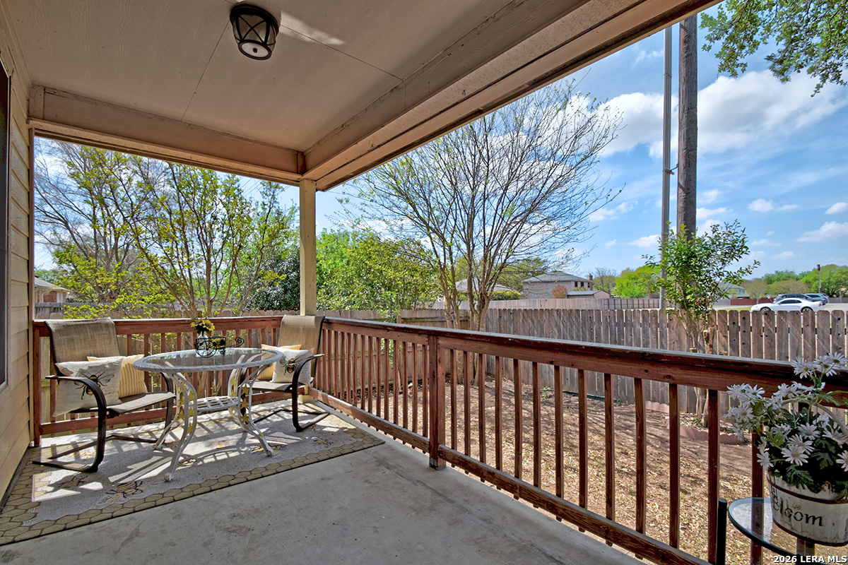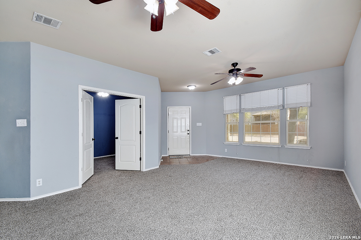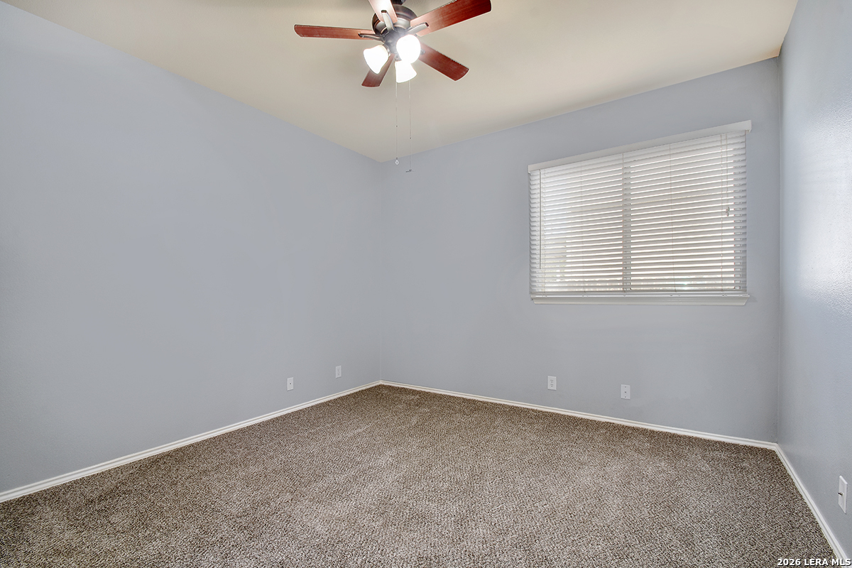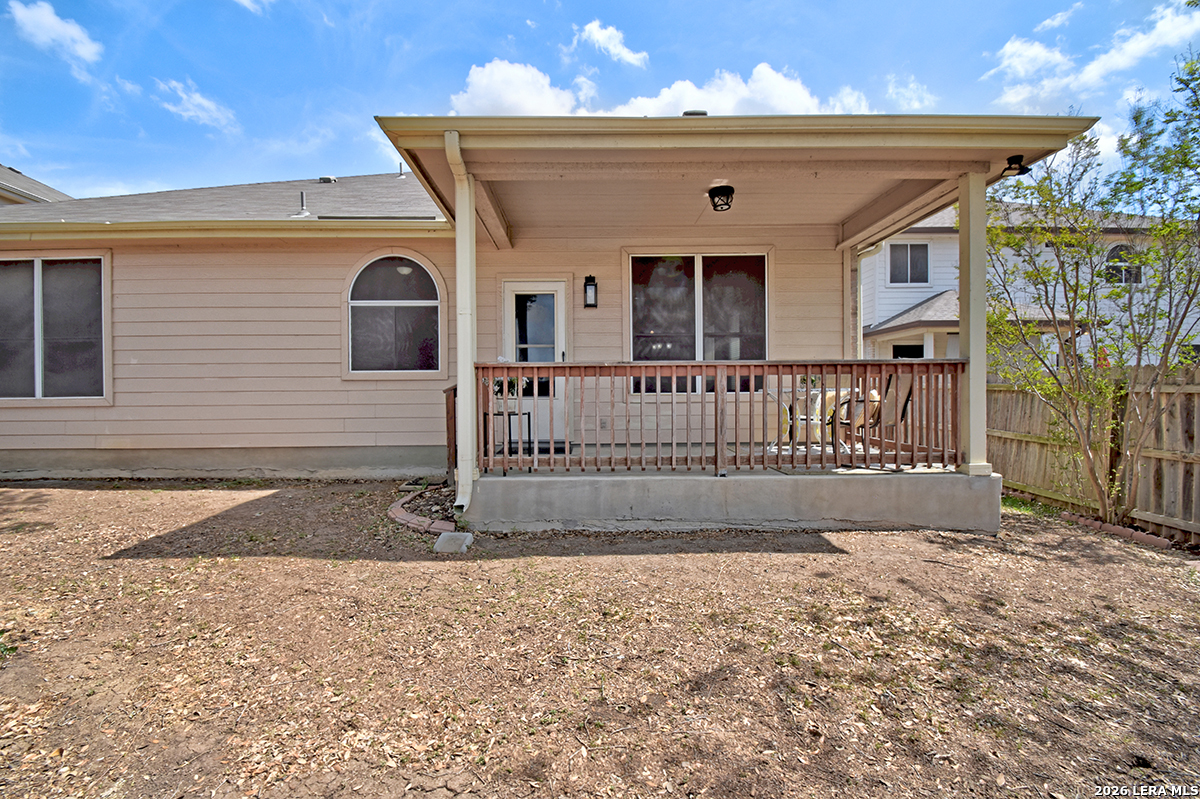 Move-in ready and beautifully maintained, this single-story home in Cibolo sits on a level lot with no steps, offering both comfort and accessibility. Featuring 4 spacious bedrooms and 2 full bathrooms, this home also includes two living areas and two dining spaces-perfect for everyday living and entertaining. Recent updates include a freshly painted interior and brand-new carpet, while ceiling fans in every room add comfort throughout. The kitchen is a standout, boasting abundant 42" cabinetry with 14 cabinets and 9 drawers, providing exceptional storage and functionality. The private primary suite is located at the back of the home and features a generously sized walk-in closet and an en suite bathroom complete with a double vanity, relaxing garden tub, and separate shower. The versatile fourth bedroom, highlighted by double doors, can easily serve as a home office, study, workout room, or media/game space-ideal for today's flexible lifestyle. Enjoy peaceful outdoor living with both a covered front porch and a covered back patio. The fully fenced backyard is shaded and private, featuring tangerine trees, a large storage building, plenty of room for pets, and no rear neighbors. Additional features include a two-car garage with pull-down attic access and durable aluminum stairs, plus plumbing in place for a water softener. Residents of Falcon Ridge enjoy access to community amenities including a park, playground, BBQ grills, and a large pool. Conveniently located near major highways, this home offers quick access to Randolph Air Force Base, schools, shopping, dining, and entertainment-just minutes from H-E-B and Walmart.