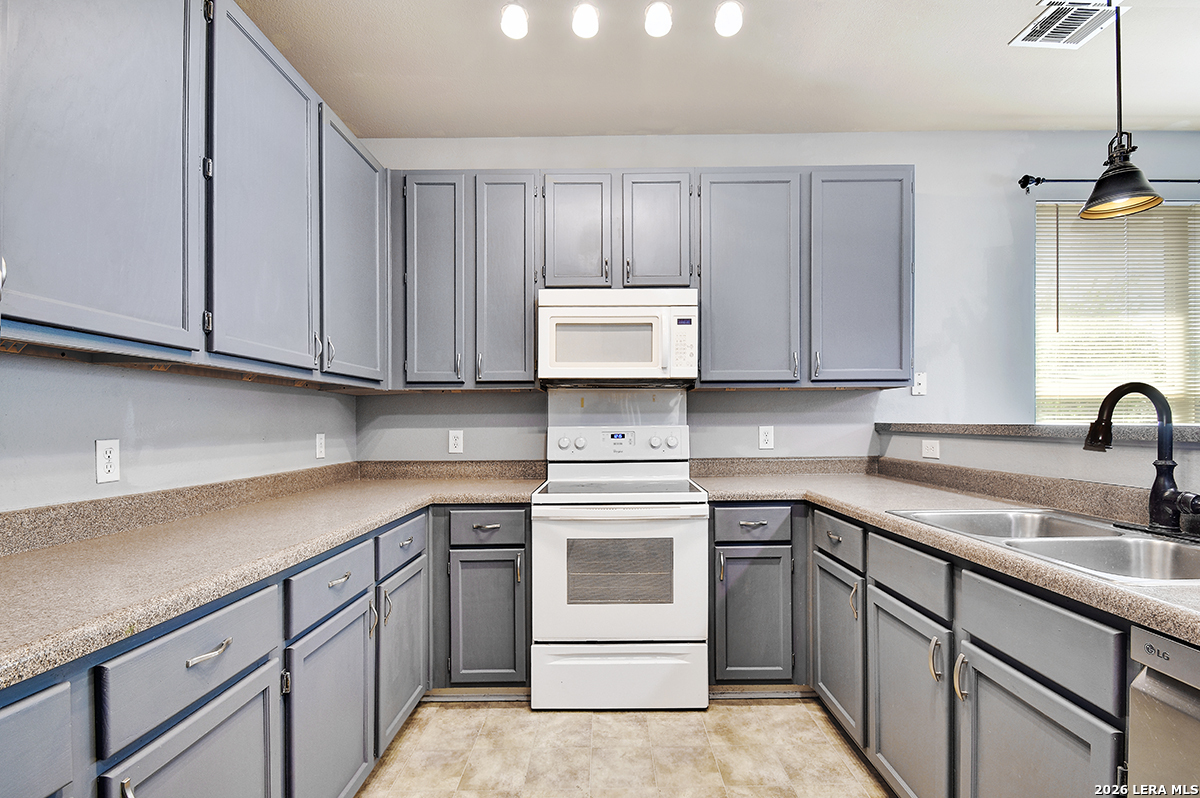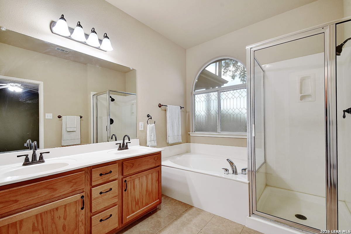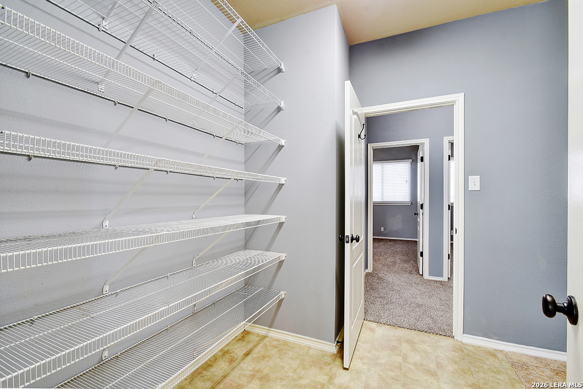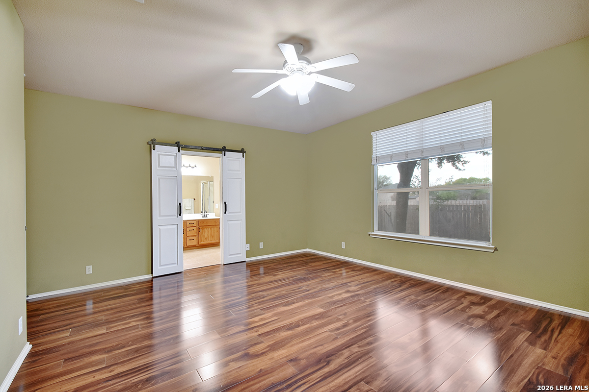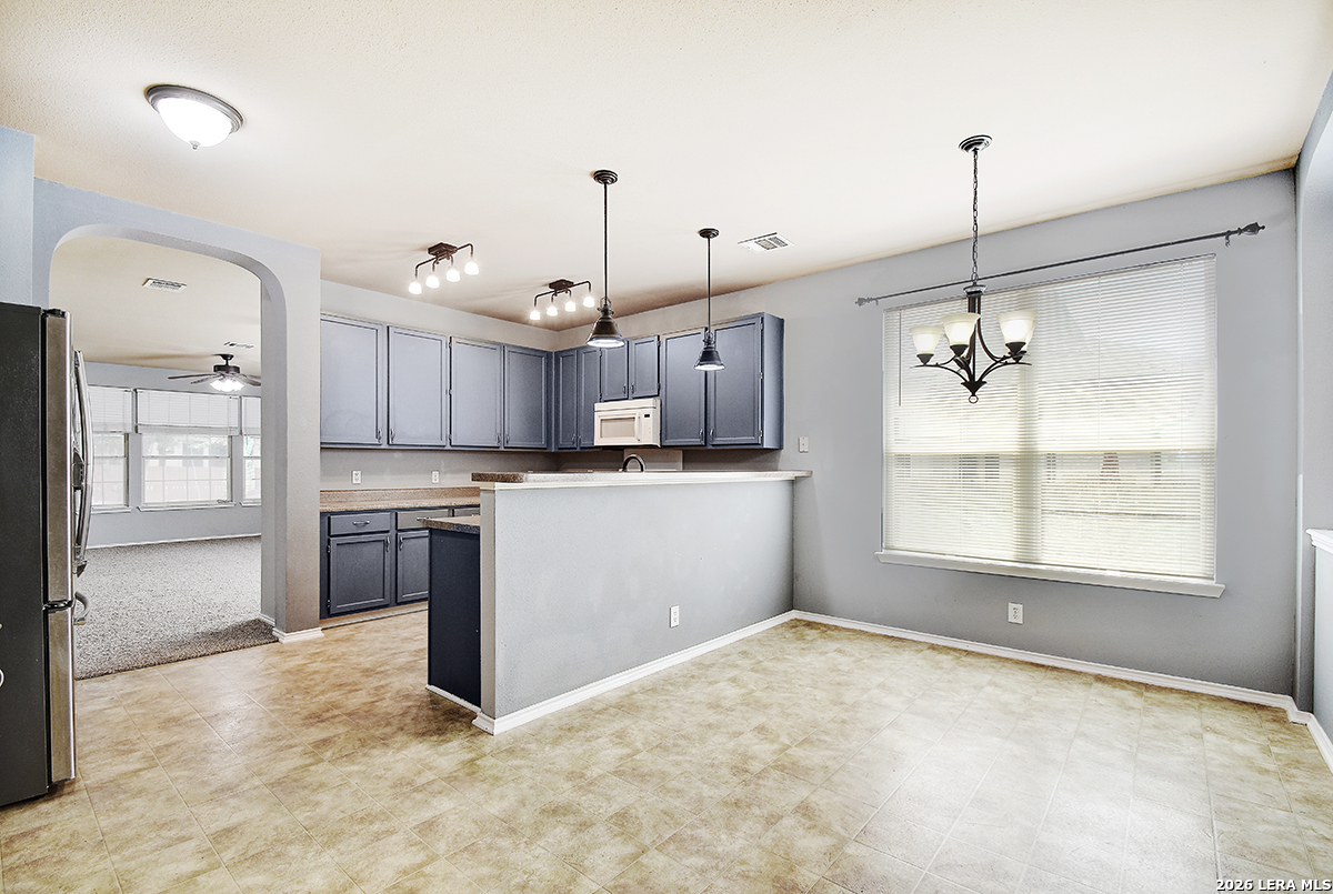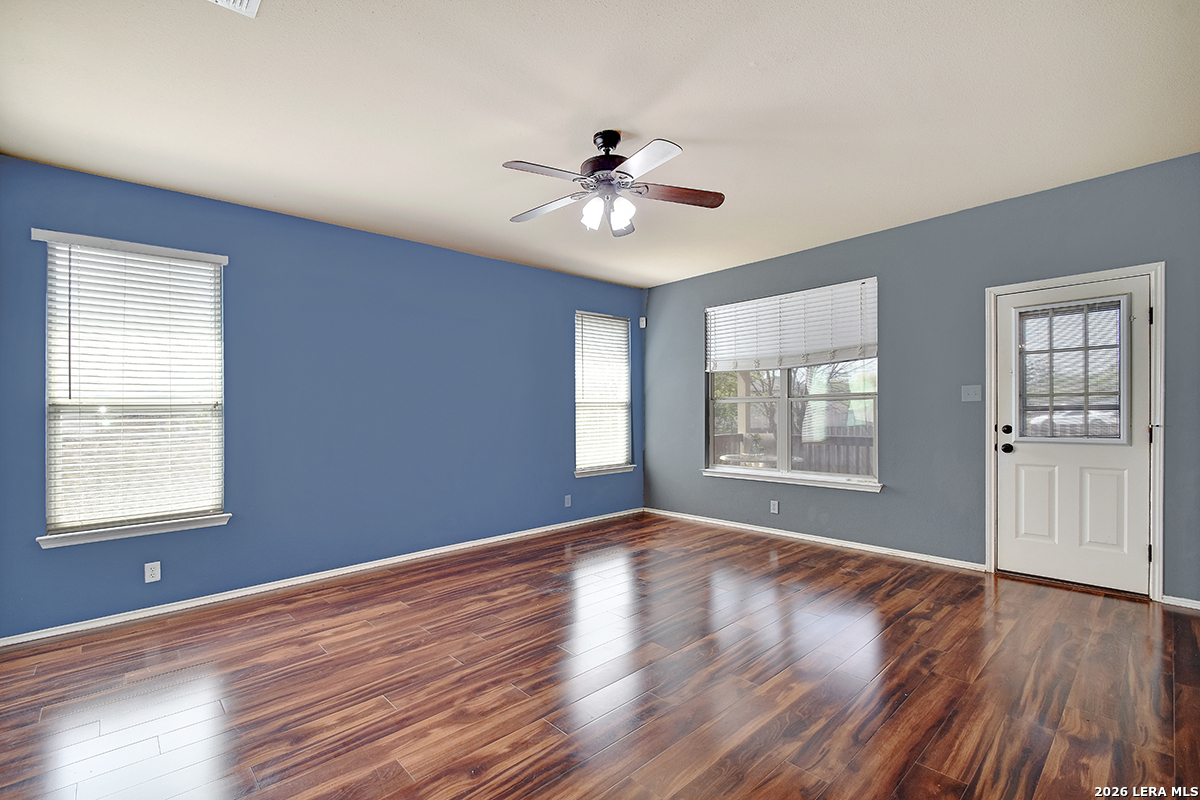 Move-in ready and beautifully maintained, this single-story home in Cibolo sits on a level lot with no steps, offering both comfort and accessibility. Featuring 4 spacious bedrooms and 2 full bathrooms, this home also includes two living areas and two dining spaces-perfect for everyday living and entertaining. Recent updates include a freshly painted interior and brand-new carpet, while ceiling fans in every room add comfort throughout. The kitchen is a standout, boasting abundant 42" cabinetry with 14 cabinets and 9 drawers, providing exceptional storage and functionality. The private primary suite is located at the back of the home and features a generously sized walk-in closet and an en suite bathroom complete with a double vanity, relaxing garden tub, and separate shower. The versatile fourth bedroom, highlighted by double doors, can easily serve as a home office, study, workout room, or media/game space-ideal for today's flexible lifestyle. Enjoy peaceful outdoor living with both a covered front porch and a covered back patio. The fully fenced backyard is shaded and private, featuring tangerine trees, a large storage building, plenty of room for pets, and no rear neighbors. Additional features include a two-car garage with pull-down attic access and durable aluminum stairs, plus plumbing in place for a water softener. Residents of Falcon Ridge enjoy access to community amenities including a park, playground, BBQ grills, and a large pool. Conveniently located near major highways, this home offers quick access to Randolph Air Force Base, schools, shopping, dining, and entertainment-just minutes from H-E-B and Walmart.
