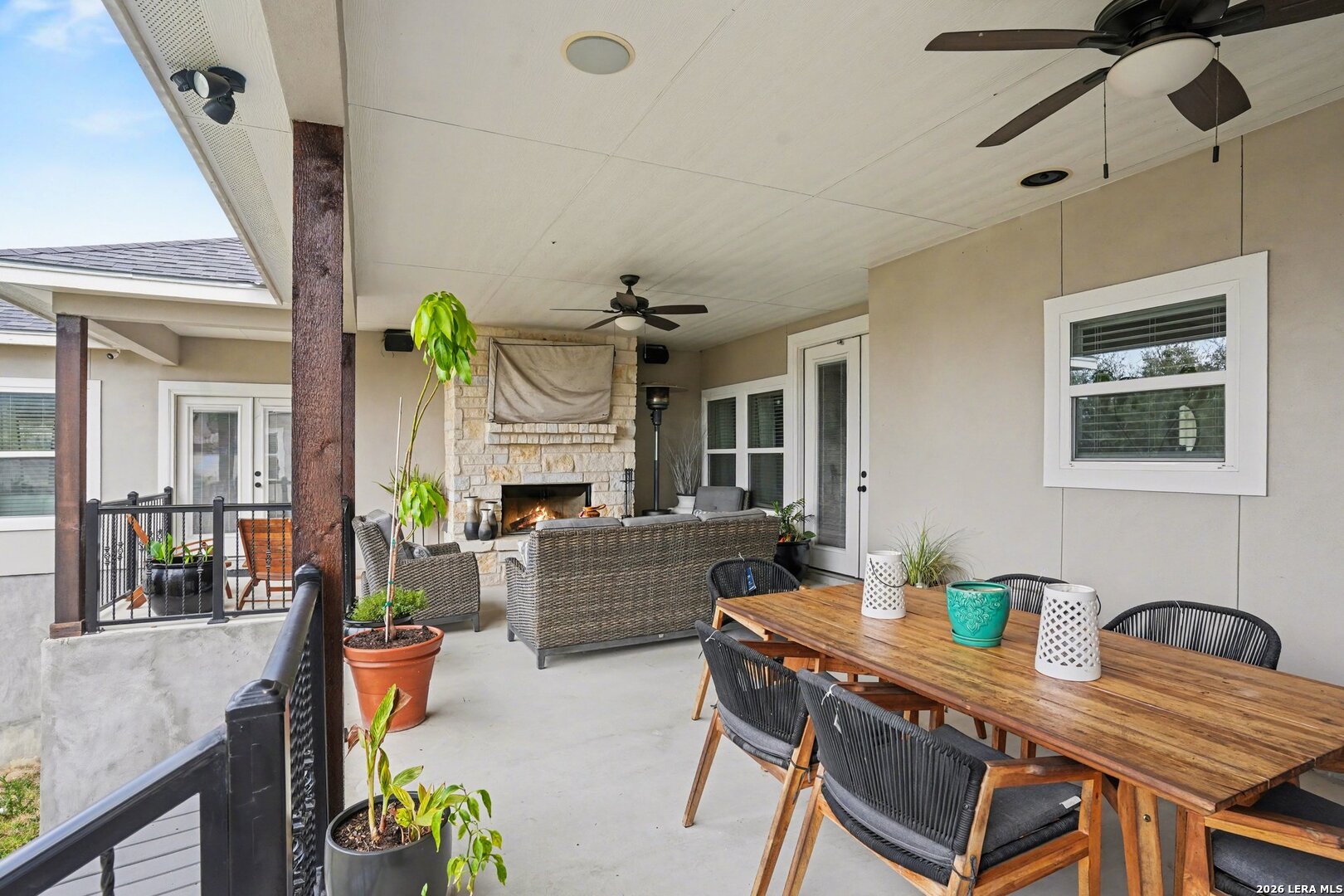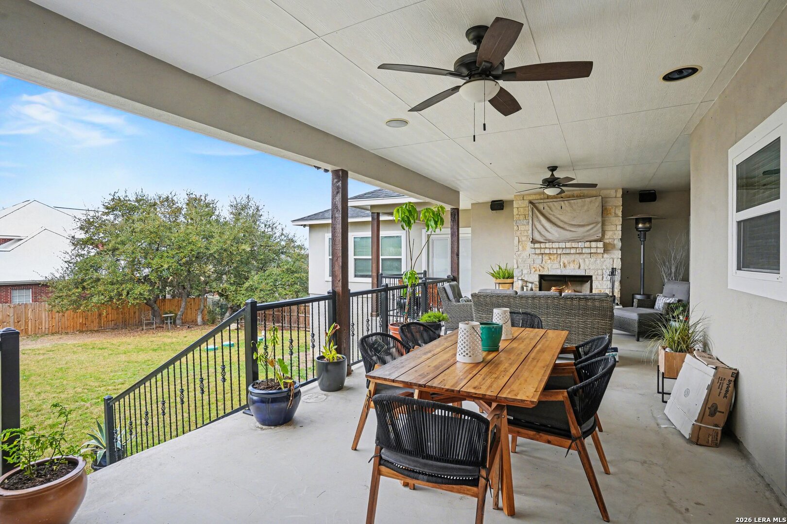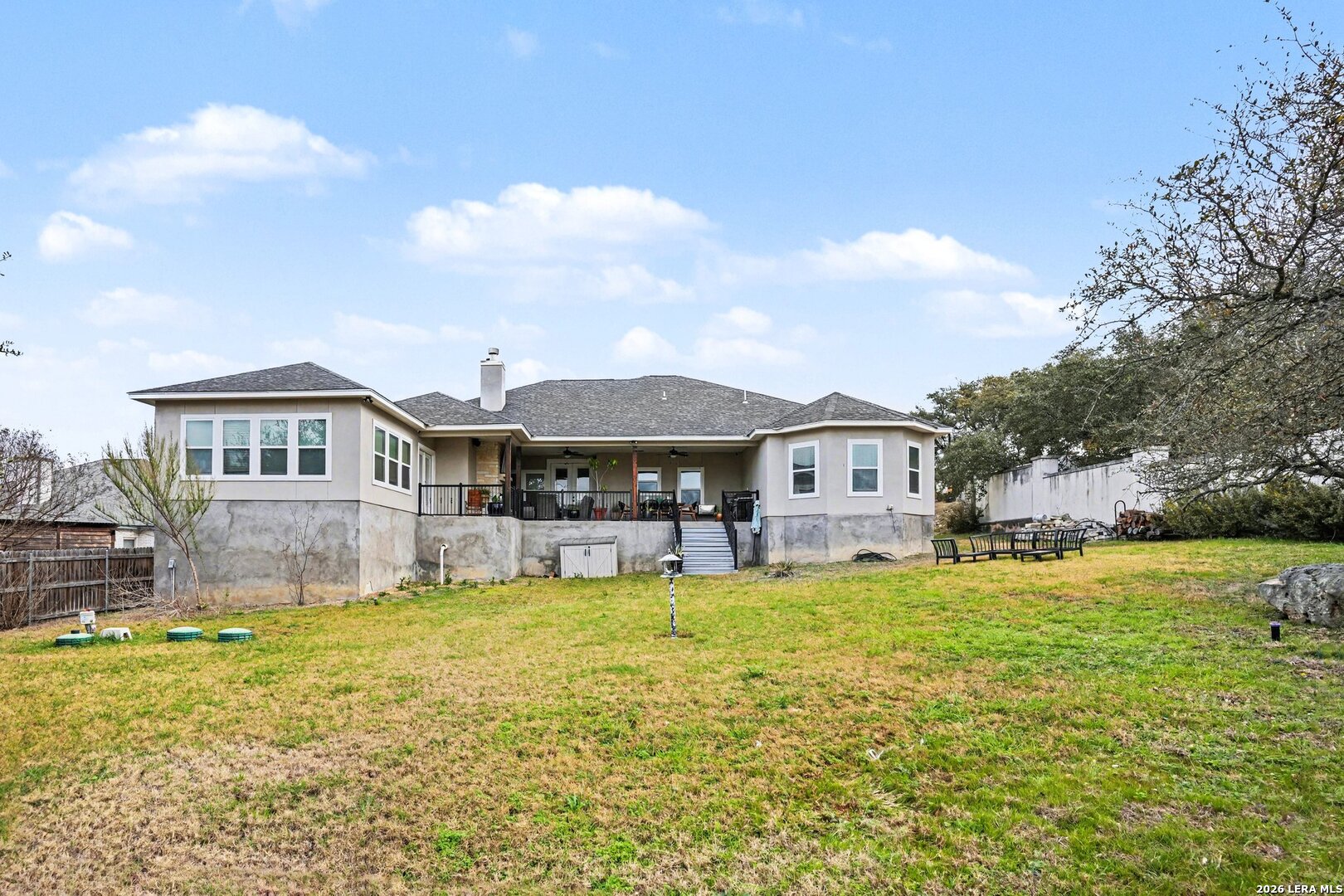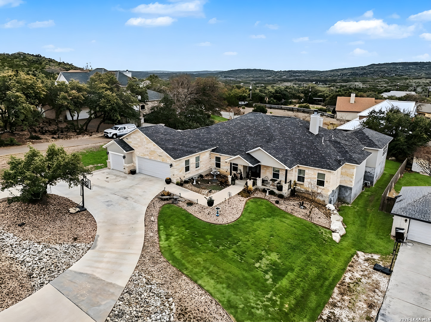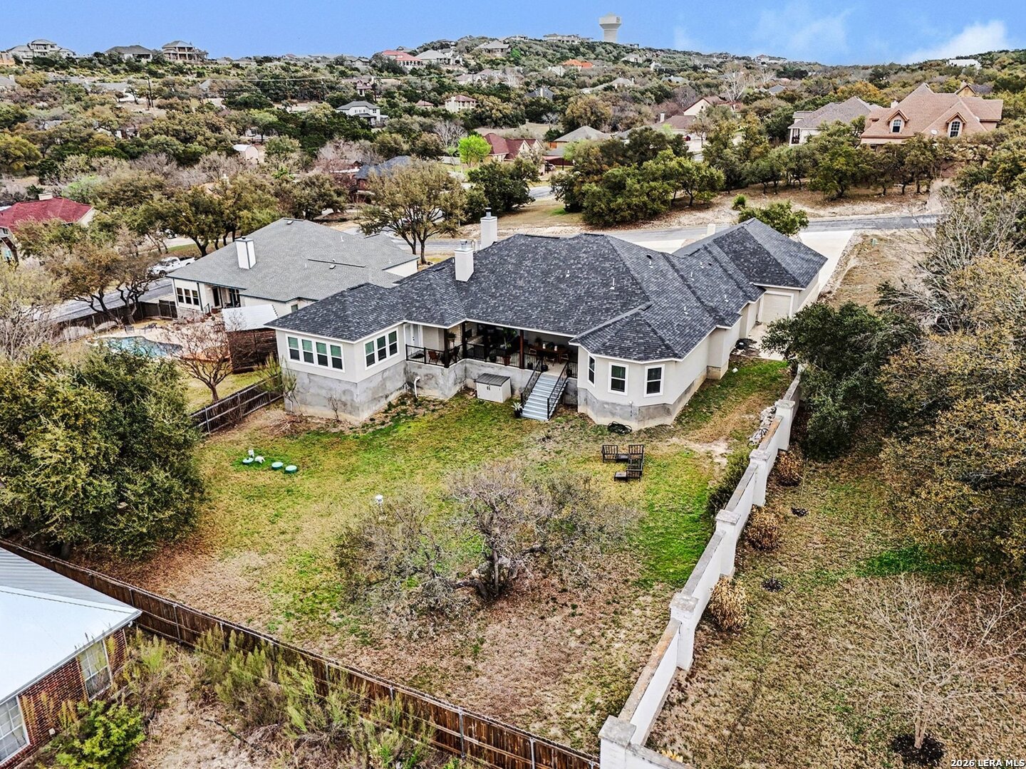Located on approximately a half-acre lot in the desirable Timberwood Park community, this custom-built 3-bedroom home with circular driveway offers space, quality construction, and exceptional entertainment features. Conveniently situated just off Blanco Road, the home provides easy access to the highway while maintaining a private, spacious setting. The property features four sides masonry construction and 100% tile flooring throughout with no carpet. Inside, you'll find a functional layout with generously sized bedrooms, each offering two closets, and a huge walk-in pantry that complements the custom kitchen complete with a pot filler. All windows in home feature a tilt inward for easy cleaning. The oversized game room is perfect for entertaining and includes a $20,000 surround sound system along with a 120-inch screen and built-in projector for an incredible home theater experience. The living area features one of two wood-burning fireplaces, adding warmth and charm. The spacious primary suite offers a spa-like bathroom with a rainfall shower and jetted soaking tub. Step outside to an extended covered patio designed for entertaining, featuring its own fireplace, TV, and surround sound. Additional highlights include a three-bay garage, full security system with outdoor cameras, and an aerobic sprinkler system. This home combines custom design, modern entertainment, and comfortable living on a generous lot.