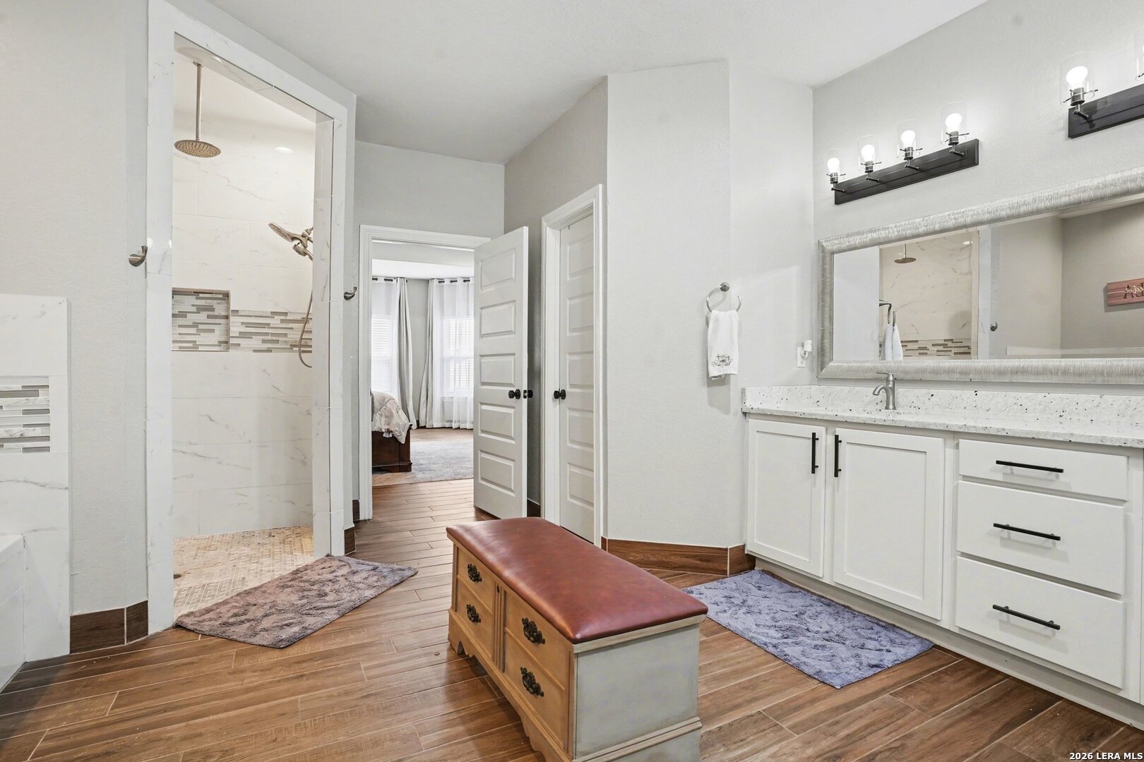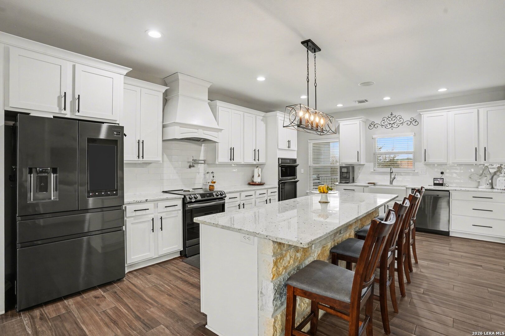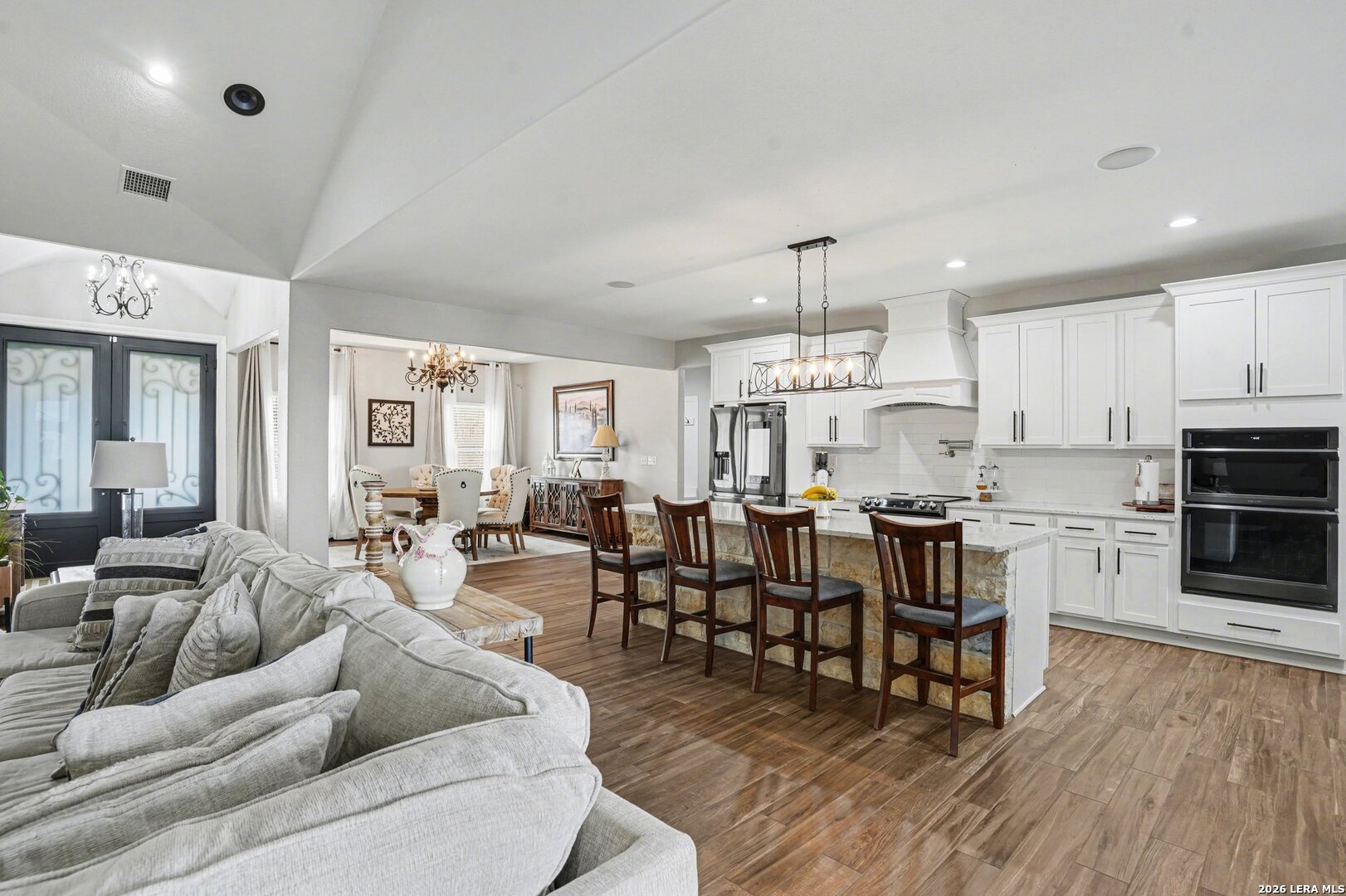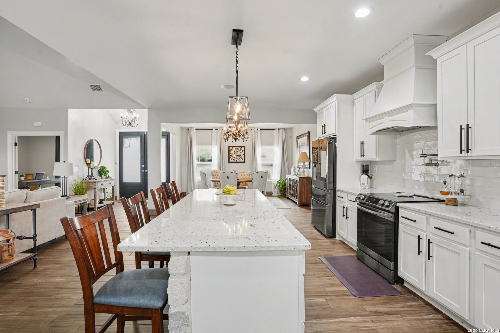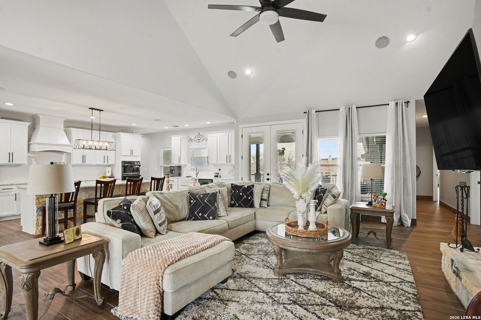 Located on approximately a half-acre lot in the desirable Timberwood Park community, this custom-built 3-bedroom home with circular driveway offers space, quality construction, and exceptional entertainment features. Conveniently situated just off Blanco Road, the home provides easy access to the highway while maintaining a private, spacious setting. The property features four sides masonry construction and 100% tile flooring throughout with no carpet. Inside, you'll find a functional layout with generously sized bedrooms, each offering two closets, and a huge walk-in pantry that complements the custom kitchen complete with a pot filler. All windows in home feature a tilt inward for easy cleaning. The oversized game room is perfect for entertaining and includes a $20,000 surround sound system along with a 120-inch screen and built-in projector for an incredible home theater experience. The living area features one of two wood-burning fireplaces, adding warmth and charm. The spacious primary suite offers a spa-like bathroom with a rainfall shower and jetted soaking tub. Step outside to an extended covered patio designed for entertaining, featuring its own fireplace, TV, and surround sound. Additional highlights include a three-bay garage, full security system with outdoor cameras, and an aerobic sprinkler system. This home combines custom design, modern entertainment, and comfortable living on a generous lot.