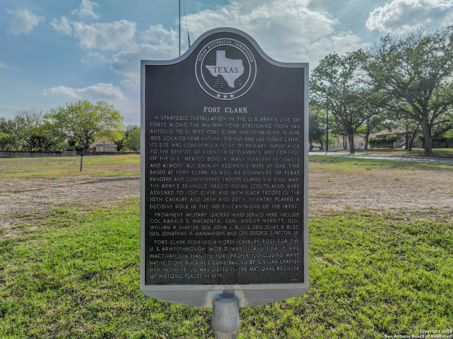 3 Bedroom 2 Bath 1,605 sq ft open floor plan house with wood burning fireplace, 2 car attached garage and a two car carport. Here is just a touch of information on this historic Fort. If you love history you'll love this place! Fort Clark Springs is a 2,700 acre gated resort and leisure living community bordering US Highway 90 at Brackettville, Texas. Permanent residents, Winter Texans, and visitors from all over the world embrace the historical significance and natural beauty surrounding this unique place. The Fort Clark Springs Pool is the third largest in Texas and stays 68 degrees year round. The surrounding park offers picnic areas equipped with BBQ cooking facilities and tables. Homes and buildable lots of all shapes, sizes, and prices can be found. Members and Residents enjoy numerous amenities, miles of nature and recreational trails, serene wildlife, shooting range, hunting areas, airport, beautiful large pecan trees an 18-hole golf course, historic buildings and museum, miles of trails, event venues, and for overnight guests a Motel, RV Park, and Campground. Here you will be living amongst history. See Fort Clarks property in additional media and a drone video of the Fort amenities.