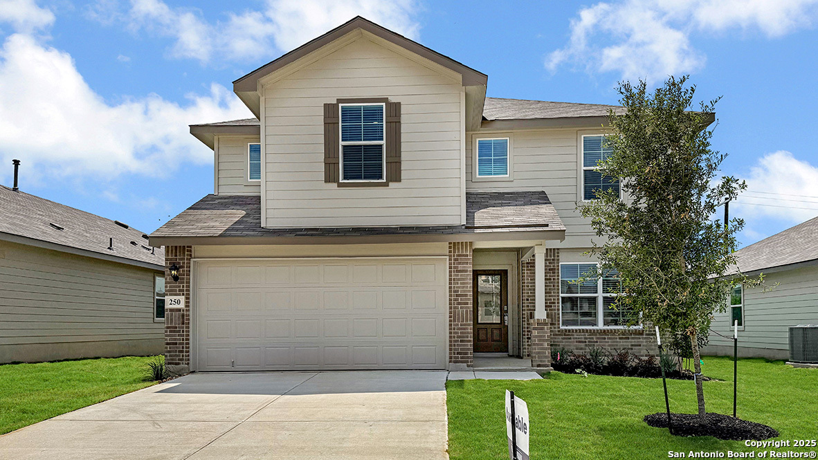 The Lombardi is a two-story, 2539 square foot, 5-bedroom, 2.5 bathroom, 2-car garage layout. A deep-set, covered porch opens to a foyer, formal dining room, and powder room. A butler entry connects the dining room and spacious kitchen lined with abundant cabinet and counterspace. Classic white subway tile backsplash is a perfect accent. The large kitchen island faces the family room. The private main bedroom suite is located off the family room and features a separate tub and shower, double vanity sinks, ceramic tile flooring, private water closet and a large walk-in closet. A downstairs utility room is located off the entry foyer and a storage space is located under the stairs. The second floor includes a versatile loft area with plenty of natural light, a full bath, four secondary bedrooms, and spacious closets. Additional features include 9-foot ceilings, 2-inch faux wood blinds throughout the home, luxury vinyl plank flooring in entryway, family room, kitchen, and dining room, ceramic tile at all bathrooms and utility room, pre-plumb for water softener loop, and full yard landscaping and irrigation. You'll enjoy added security in your new home with our Home is Connected features. Using one central hub that talks to all the devices in your home, you can control the lights, thermostat and locks, all from your cellular device.