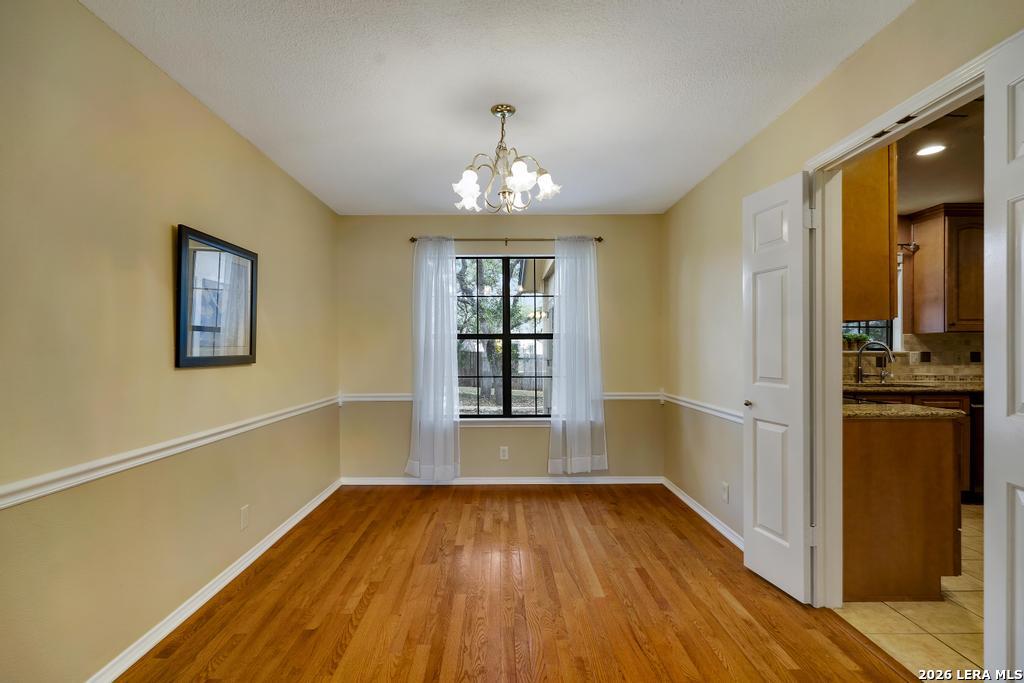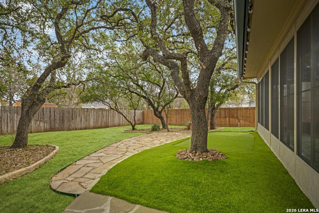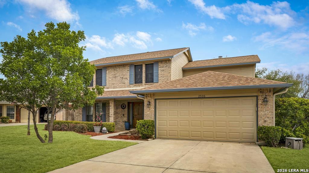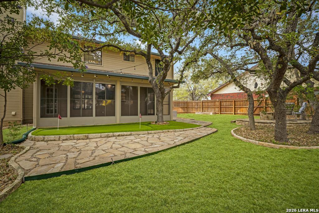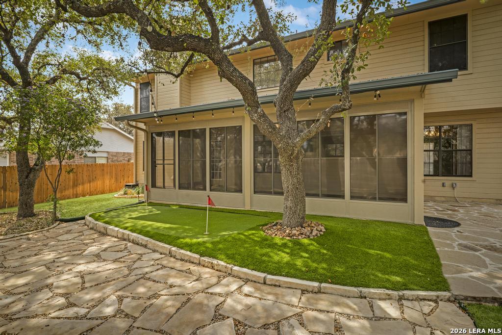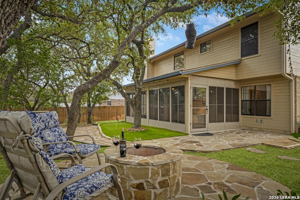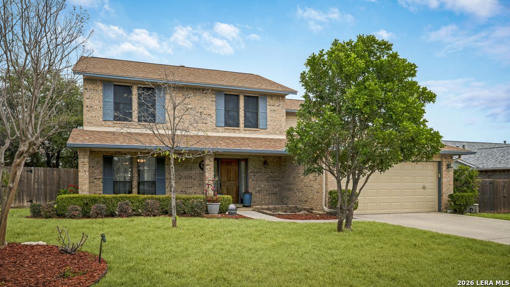 Charming two-story brick traditional home in the outstanding Woodglen neighborhood is located on a private cul-de-sac and exudes warmth and comfort throughout. This very well-maintained house is turn-key and offers 4 bedrooms with 2 full baths and one-half bath. The main floor features 2 living areas, including a family room with brick fireplace and gas logs. Beautiful custom, soft-close cabinets from Cardell Cabinetry, provide abundant storage in the kitchen, along with granite counters and black & stainless appliances, stainless sink and a cute breakfast nook overlooking the sunroom and backyard. Wonderful natural light fills the separate dining room, located just off the kitchen, and flows into the formal living space accented by original oak wood floors! All windows on the main floor have solar screens. Another exquisite feature of the home is the large, screened in sunroom overlooking a lush backyard with mature trees. The sunroom has solar screened windows with removable plastic panels, a ceiling fan and water resistant vinyl flooring. A stately wood staircase leads to the upper floor and its removable banister is a striking feature that allows easy movement of large furniture up and down! The newly painted primary suite allows for a king size bed and is paired with an updated bathroom, offering a single vanity with double sinks, a garden tub, and a custom-designed tiled shower with raindrop glass. Secondary bedrooms and another updated bathroom are located just down the wood-floored hallway and each room offers ceiling fans, ample closet space, and additional solar screens on windows that block solar heat and UV rays reducing indoor temps and lowering cooling costs. The amazing park-like, backyard is shaded by mature trees and features a fun outdoor putting green as well as a flagstone walkway and elevated outdoor fire pit, plus a storage shed with electricity and raised garden beds all surrounded by a privacy fence! Rounding out this incredible property is a 2-car garage with a work area, work bench, shelving and cabinets, dedicated freezer plug, lighted attic access -- partially floored, along with a newer garage door installed 2025. You will also find a Kinetico water softener (conveys) and in-ground sprinkler controls. The home has whole surge protection added in 2021, and a newer composite roof installed in 2025 with six inch gutters. Located close to shopping and health facilities, and situated just minutes from both Loop 1604 and Loop 410, neighborhood amenities include a swimming pool, kiddie pool, tennis court, pickle ball courts, basketball court and picnic area.