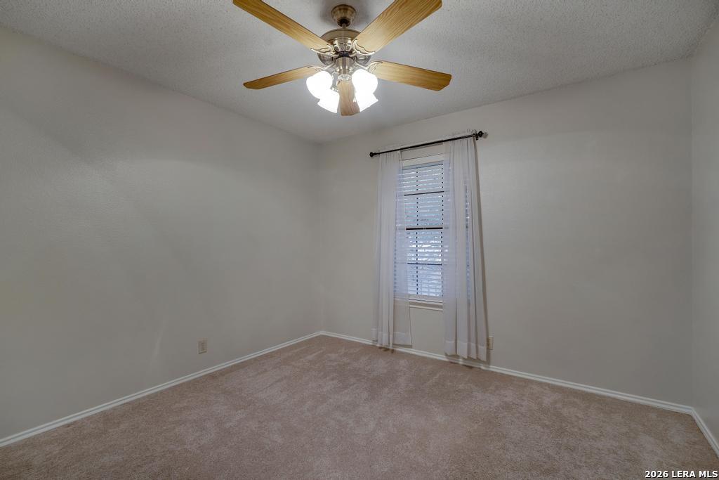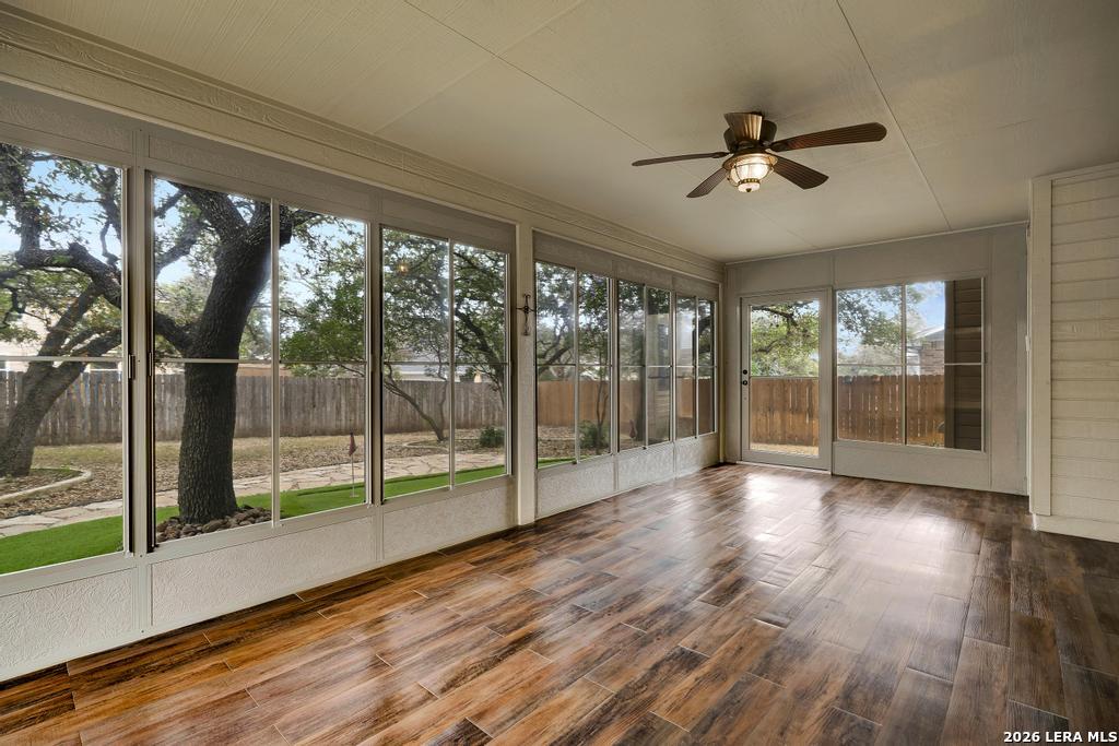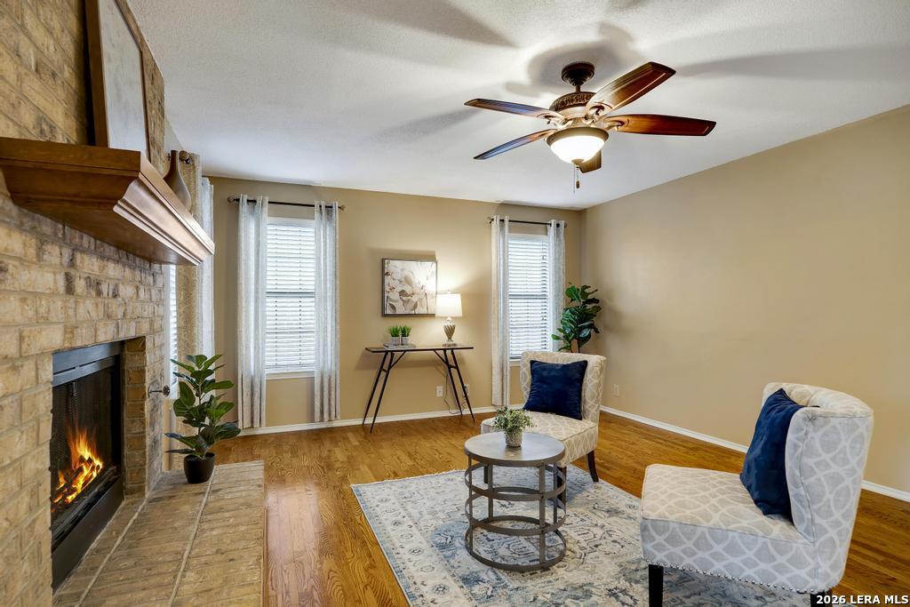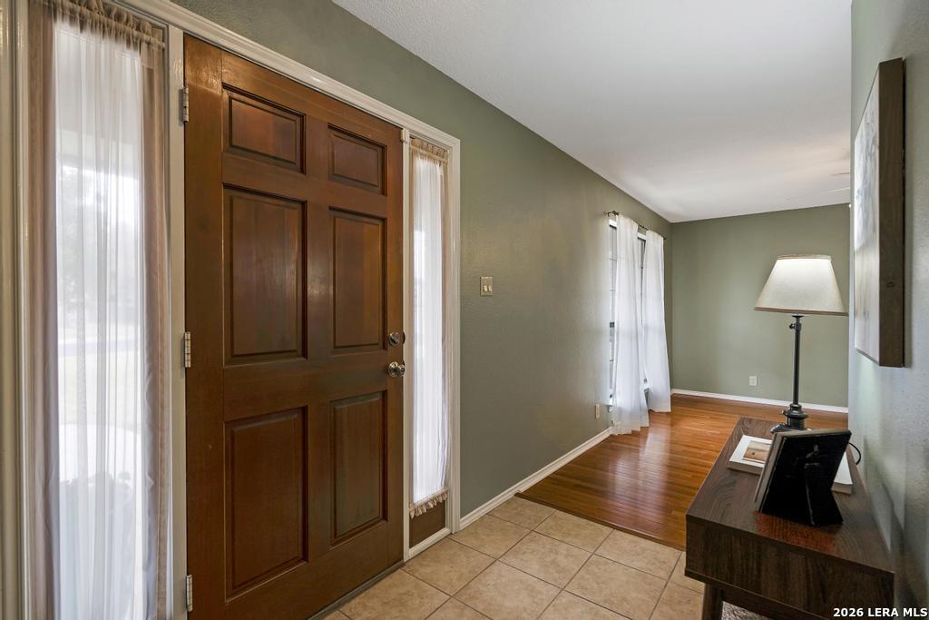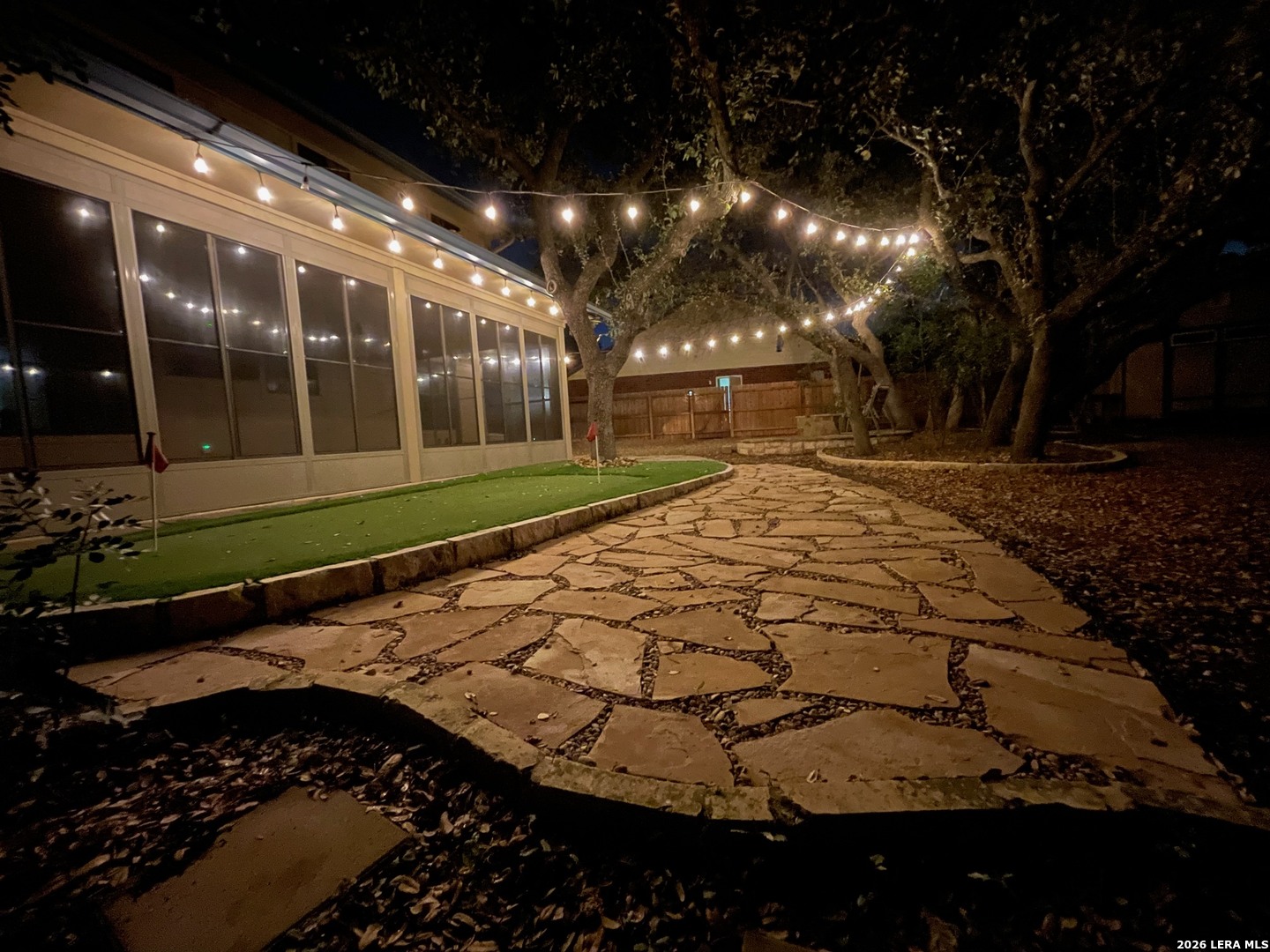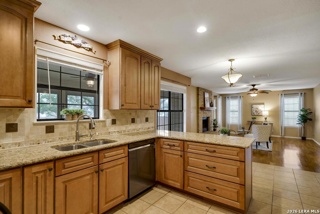 Charming two-story brick traditional home in the outstanding Woodglen neighborhood is located on a private cul-de-sac and exudes warmth and comfort throughout. This very well-maintained house is turn-key and offers 4 bedrooms with 2 full baths and one-half bath. The main floor features 2 living areas, including a family room with brick fireplace and gas logs. Beautiful custom, soft-close cabinets from Cardell Cabinetry, provide abundant storage in the kitchen, along with granite counters and black & stainless appliances, stainless sink and a cute breakfast nook overlooking the sunroom and backyard. Wonderful natural light fills the separate dining room, located just off the kitchen, and flows into the formal living space accented by original oak wood floors! All windows on the main floor have solar screens. Another exquisite feature of the home is the large, screened in sunroom overlooking a lush backyard with mature trees. The sunroom has solar screened windows with removable plastic panels, a ceiling fan and water resistant vinyl flooring. A stately wood staircase leads to the upper floor and its removable banister is a striking feature that allows easy movement of large furniture up and down! The newly painted primary suite allows for a king size bed and is paired with an updated bathroom, offering a single vanity with double sinks, a garden tub, and a custom-designed tiled shower with raindrop glass. Secondary bedrooms and another updated bathroom are located just down the wood-floored hallway and each room offers ceiling fans, ample closet space, and additional solar screens on windows that block solar heat and UV rays reducing indoor temps and lowering cooling costs. The amazing park-like, backyard is shaded by mature trees and features a fun outdoor putting green as well as a flagstone walkway and elevated outdoor fire pit, plus a storage shed with electricity and raised garden beds all surrounded by a privacy fence! Rounding out this incredible property is a 2-car garage with a work area, work bench, shelving and cabinets, dedicated freezer plug, lighted attic access -- partially floored, along with a newer garage door installed 2025. You will also find a Kinetico water softener (conveys) and in-ground sprinkler controls. The home has whole surge protection added in 2021, and a newer composite roof installed in 2025 with six inch gutters. Located close to shopping and health facilities, and situated just minutes from both Loop 1604 and Loop 410, neighborhood amenities include a swimming pool, kiddie pool, tennis court, pickle ball courts, basketball court and picnic area.