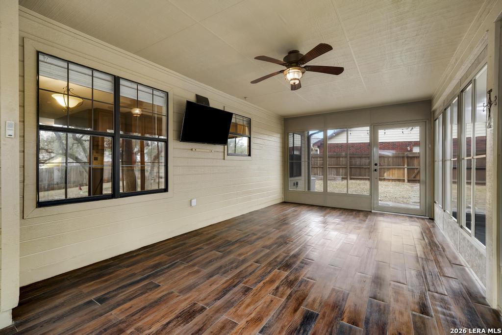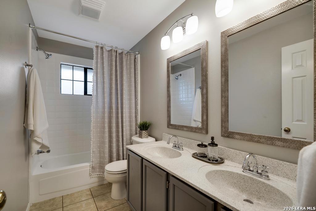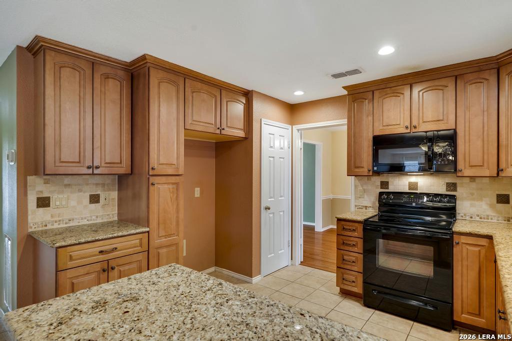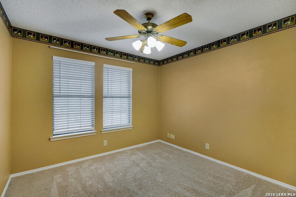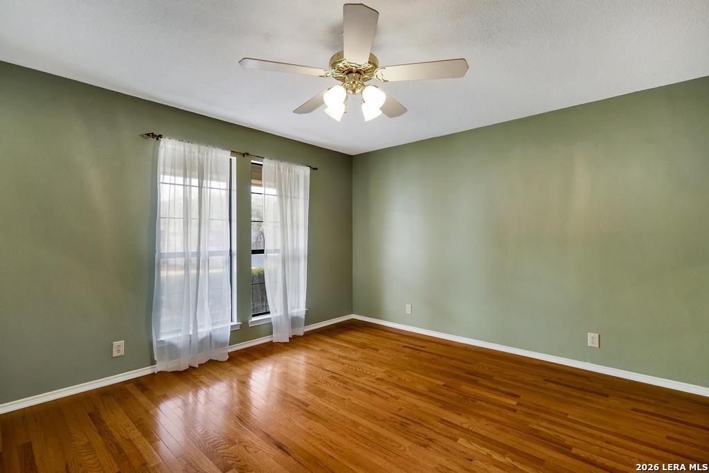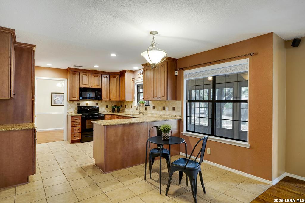 Charming two-story brick traditional home in the outstanding Woodglen neighborhood is located on a private cul-de-sac and exudes warmth and comfort throughout. This very well-maintained house is turn-key and offers 4 bedrooms with 2 full baths and one-half bath. The main floor features 2 living areas, including a family room with brick fireplace and gas logs. Beautiful custom, soft-close cabinets from Cardell Cabinetry, provide abundant storage in the kitchen, along with granite counters and black & stainless appliances, stainless sink and a cute breakfast nook overlooking the sunroom and backyard. Wonderful natural light fills the separate dining room, located just off the kitchen, and flows into the formal living space accented by original oak wood floors! All windows on the main floor have solar screens. Another exquisite feature of the home is the large, screened in sunroom overlooking a lush backyard with mature trees. The sunroom has solar screened windows with removable plastic panels, a ceiling fan and water resistant vinyl flooring. A stately wood staircase leads to the upper floor and its removable banister is a striking feature that allows easy movement of large furniture up and down! The newly painted primary suite allows for a king size bed and is paired with an updated bathroom, offering a single vanity with double sinks, a garden tub, and a custom-designed tiled shower with raindrop glass. Secondary bedrooms and another updated bathroom are located just down the wood-floored hallway and each room offers ceiling fans, ample closet space, and additional solar screens on windows that block solar heat and UV rays reducing indoor temps and lowering cooling costs. The amazing park-like, backyard is shaded by mature trees and features a fun outdoor putting green as well as a flagstone walkway and elevated outdoor fire pit, plus a storage shed with electricity and raised garden beds all surrounded by a privacy fence! Rounding out this incredible property is a 2-car garage with a work area, work bench, shelving and cabinets, dedicated freezer plug, lighted attic access -- partially floored, along with a newer garage door installed 2025. You will also find a Kinetico water softener (conveys) and in-ground sprinkler controls. The home has whole surge protection added in 2021, and a newer composite roof installed in 2025 with six inch gutters. Located close to shopping and health facilities, and situated just minutes from both Loop 1604 and Loop 410, neighborhood amenities include a swimming pool, kiddie pool, tennis court, pickle ball courts, basketball court and picnic area.