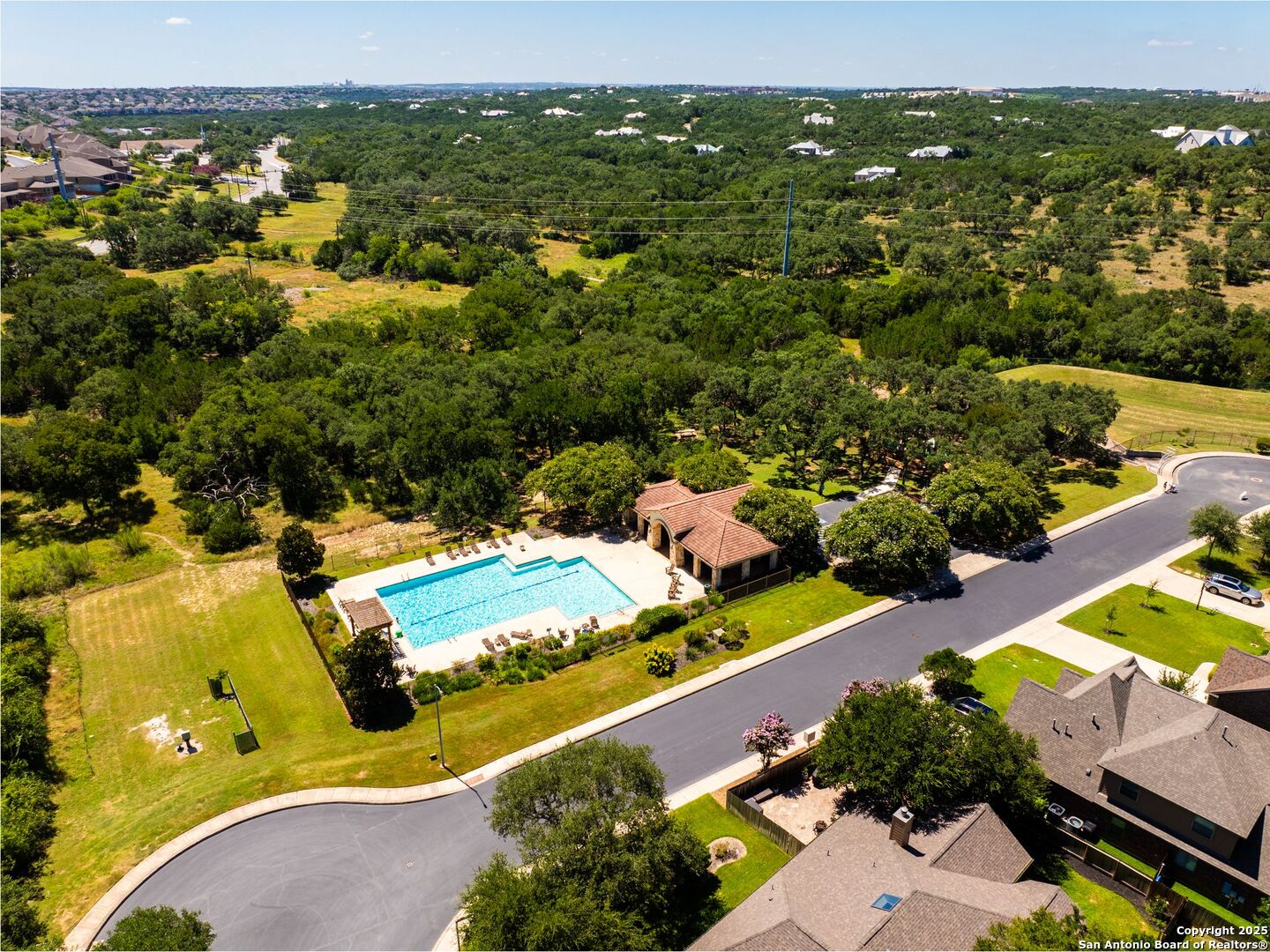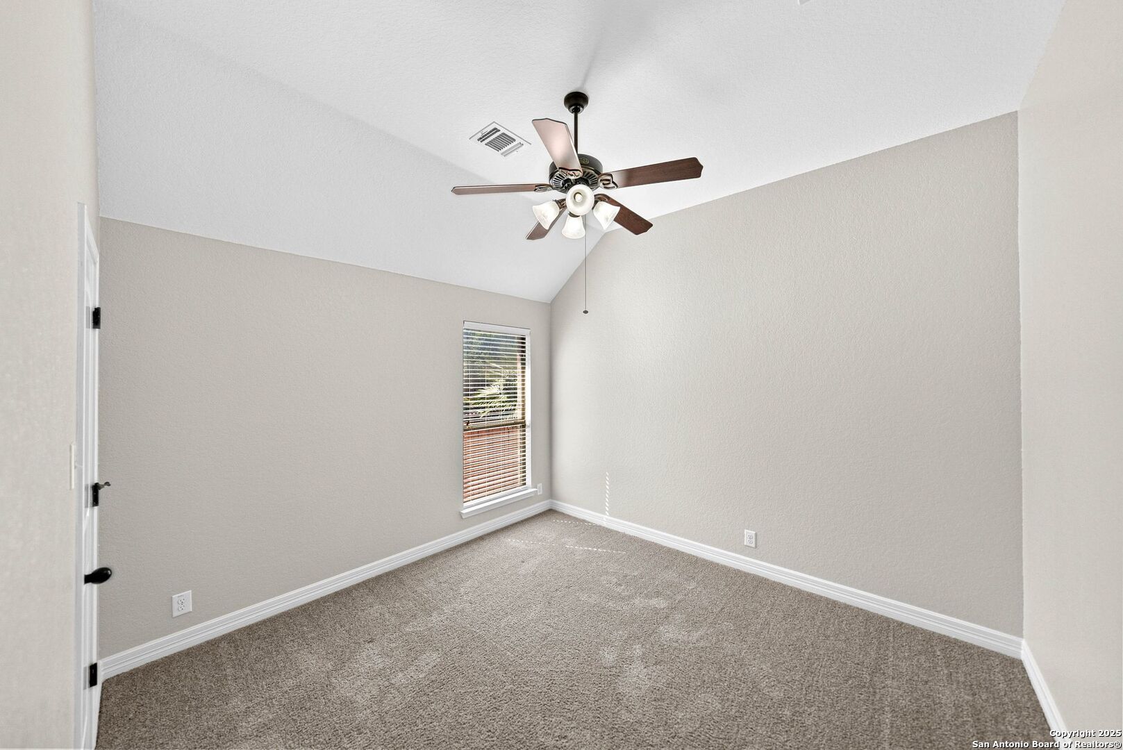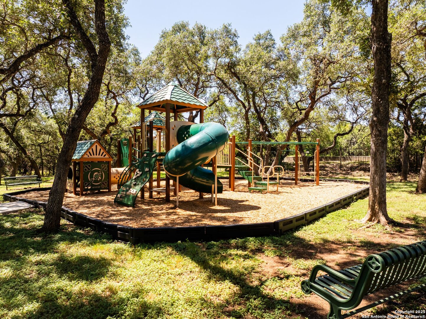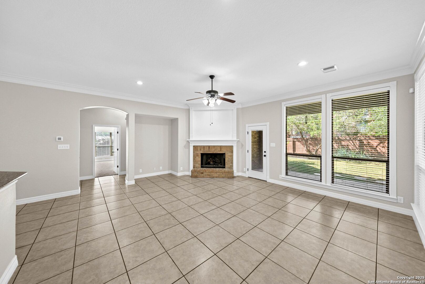Set within the charming, gated community of Belterra, this single-story gem sits proudly on a corner lot, radiating curb appeal with its all-brick exterior and inviting covered porch. From the moment you approach, you will notice the tall, richly stained wood door with an ornate glass feature that sets the tone for what awaits inside. The foyer makes an impression with its spacious feel, high ceilings, and 18x18 tile that gives the space a clean and polished look. To your right, a private office with French doors and large bay windows creates the perfect work-from-home haven or a quiet space to focus. Across the hall, a dedicated dining area makes hosting family dinners or holiday gatherings effortless, positioned perfectly next to the kitchen. The kitchen is where this home truly shines. Designed for both everyday function and entertaining, it boasts granite countertops, stainless steel appliances including a refrigerator, and a 5-burner gas cooktop. The center island provides extra storage and electrical outlets for meal prep or baking days, while bar seating and a built-in breakfast nook with bench seating make casual meals a breeze. A generous walk-in pantry keeps everything organized and close at hand. The open-concept living room is the heart of the home, anchored by a gas-burning fireplace that invites you to settle in on cooler evenings. Large windows flood the room with natural light and provide a view of the backyard, while direct access to the covered patio makes indoor-outdoor living seamless. The oversized primary suite feels like its own retreat. With soft carpeting underfoot, bay windows that bring in morning light, and a ceiling fan for comfort, this room is made for unwinding. The en suite bathroom is spacious and well appointed, featuring dual vanities with an oversized mirror, a jetted soaking tub for end-of-day relaxation, a separate tiled shower, and a walk-in closet large enough to keep everything organized. The three additional guest bedrooms each come with walk-in closets, ceiling fans, and large windows, offering plenty of space for family or visitors. They share a thoughtfully designed Jack and Jill bathroom with dual and single vanities, plenty of storage, and a tub-shower combo with tile surround. Practical touches like the utility room with full-size washer and dryer connections, cabinetry, and an extra storage closet make everyday chores easier. Step outside to the covered back patio with embellished tile and pull-down shades, perfect for quiet coffee mornings or weekend barbecues. The level, fenced-in yard offers privacy and space to play, and the two-car attached garage adds convenience. Living here means access to controlled neighborhood gates, a community pool, a barbecue area, and a playground. All of this within the highly rated Comal ISD, making it a wonderful place to call home.