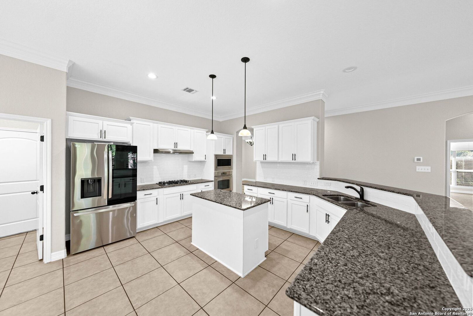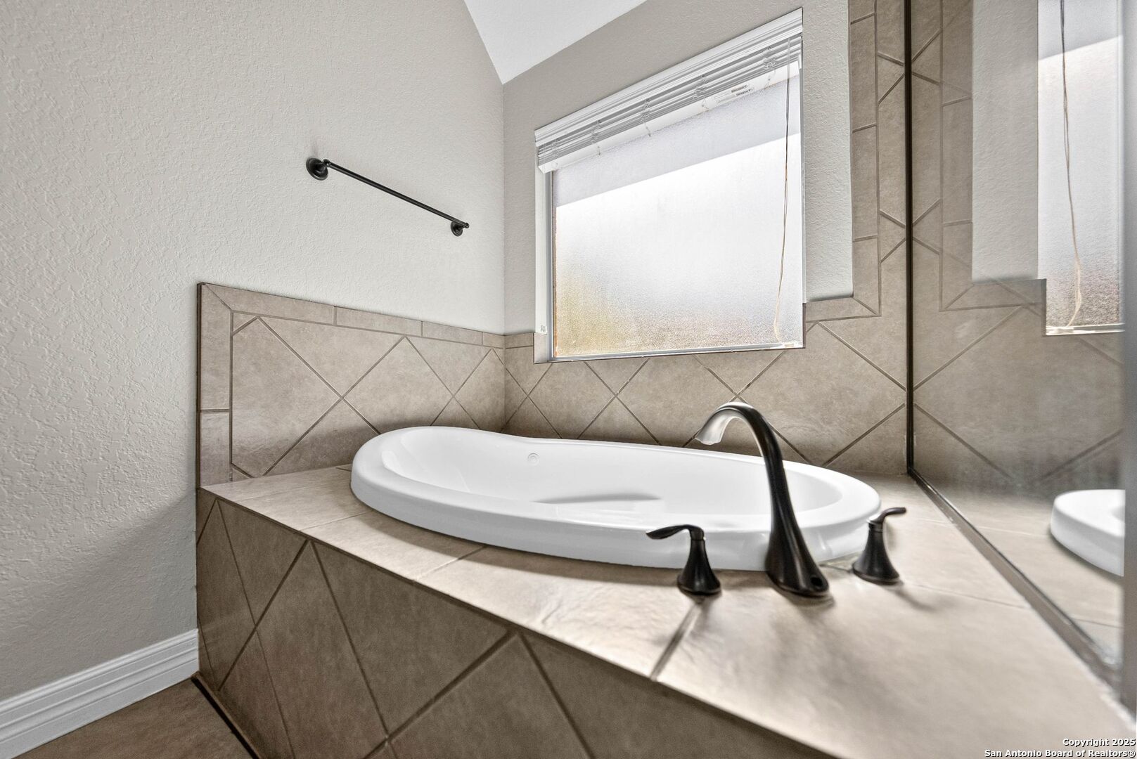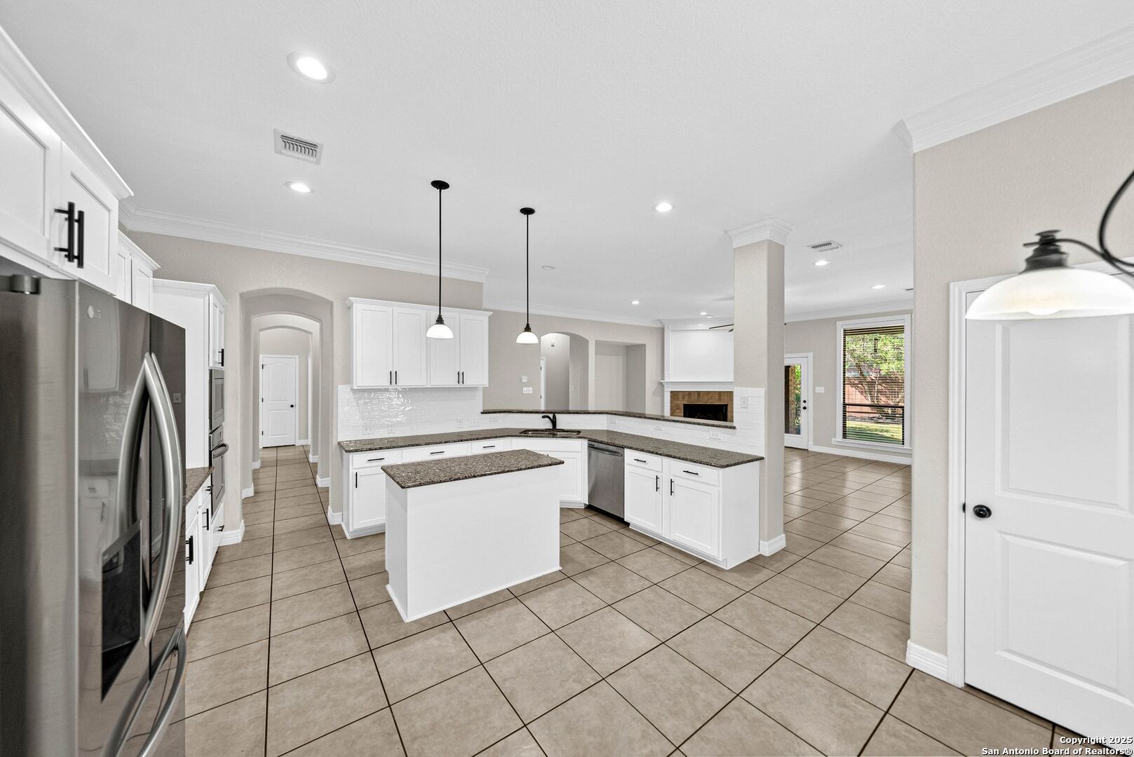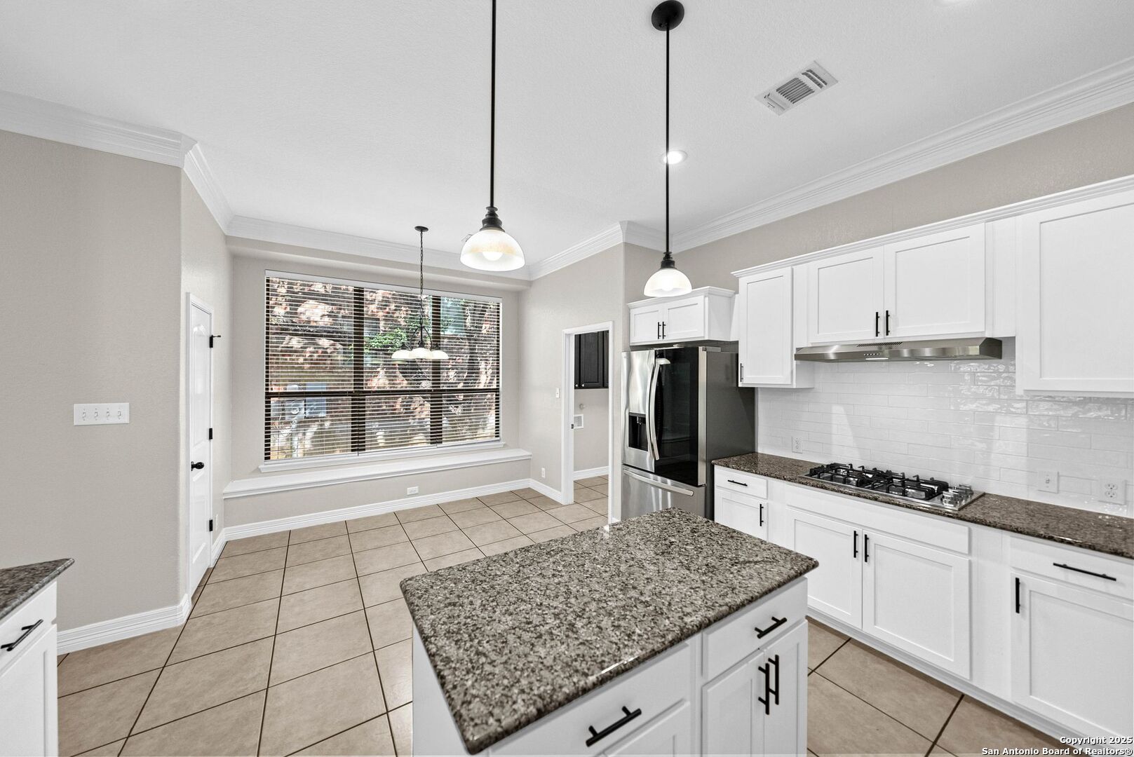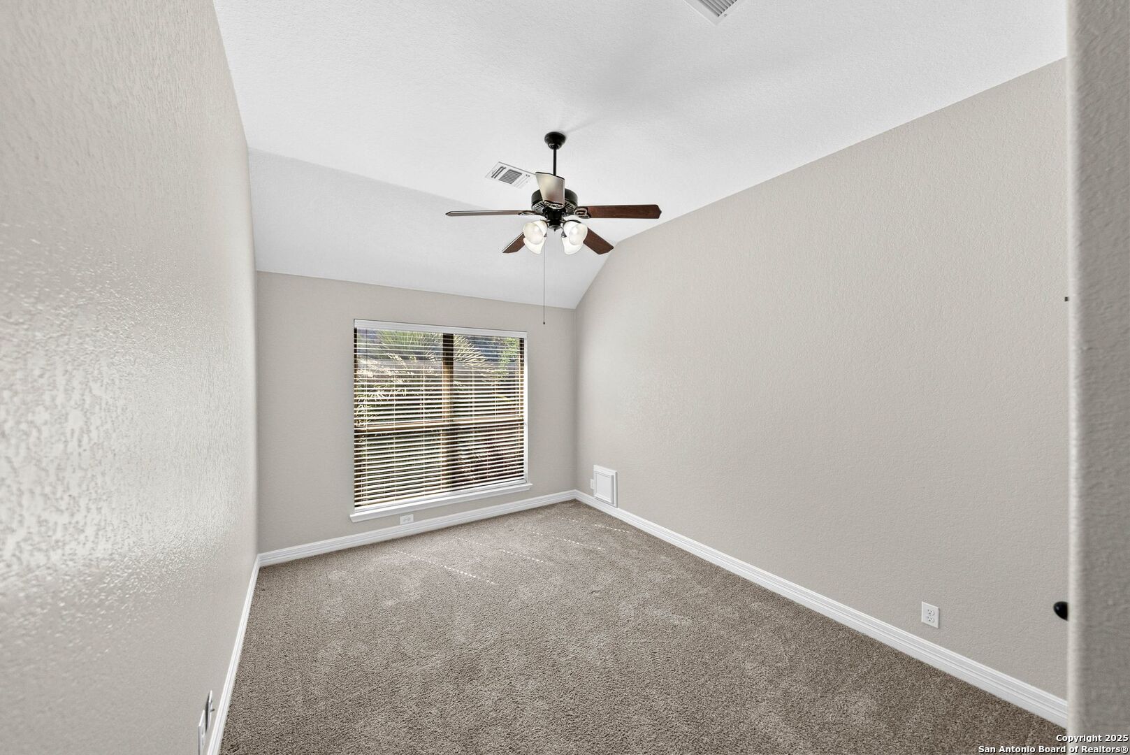 Set within the charming, gated community of Belterra, this single-story gem sits proudly on a corner lot, radiating curb appeal with its all-brick exterior and inviting covered porch. From the moment you approach, you will notice the tall, richly stained wood door with an ornate glass feature that sets the tone for what awaits inside. The foyer makes an impression with its spacious feel, high ceilings, and 18x18 tile that gives the space a clean and polished look. To your right, a private office with French doors and large bay windows creates the perfect work-from-home haven or a quiet space to focus. Across the hall, a dedicated dining area makes hosting family dinners or holiday gatherings effortless, positioned perfectly next to the kitchen. The kitchen is where this home truly shines. Designed for both everyday function and entertaining, it boasts granite countertops, stainless steel appliances including a refrigerator, and a 5-burner gas cooktop. The center island provides extra storage and electrical outlets for meal prep or baking days, while bar seating and a built-in breakfast nook with bench seating make casual meals a breeze. A generous walk-in pantry keeps everything organized and close at hand. The open-concept living room is the heart of the home, anchored by a gas-burning fireplace that invites you to settle in on cooler evenings. Large windows flood the room with natural light and provide a view of the backyard, while direct access to the covered patio makes indoor-outdoor living seamless. The oversized primary suite feels like its own retreat. With soft carpeting underfoot, bay windows that bring in morning light, and a ceiling fan for comfort, this room is made for unwinding. The en suite bathroom is spacious and well appointed, featuring dual vanities with an oversized mirror, a jetted soaking tub for end-of-day relaxation, a separate tiled shower, and a walk-in closet large enough to keep everything organized. The three additional guest bedrooms each come with walk-in closets, ceiling fans, and large windows, offering plenty of space for family or visitors. They share a thoughtfully designed Jack and Jill bathroom with dual and single vanities, plenty of storage, and a tub-shower combo with tile surround. Practical touches like the utility room with full-size washer and dryer connections, cabinetry, and an extra storage closet make everyday chores easier. Step outside to the covered back patio with embellished tile and pull-down shades, perfect for quiet coffee mornings or weekend barbecues. The level, fenced-in yard offers privacy and space to play, and the two-car attached garage adds convenience. Living here means access to controlled neighborhood gates, a community pool, a barbecue area, and a playground. All of this within the highly rated Comal ISD, making it a wonderful place to call home.