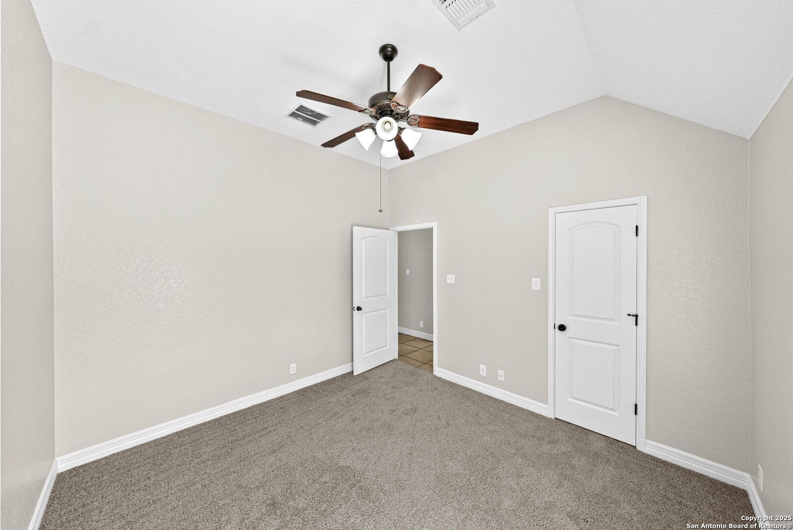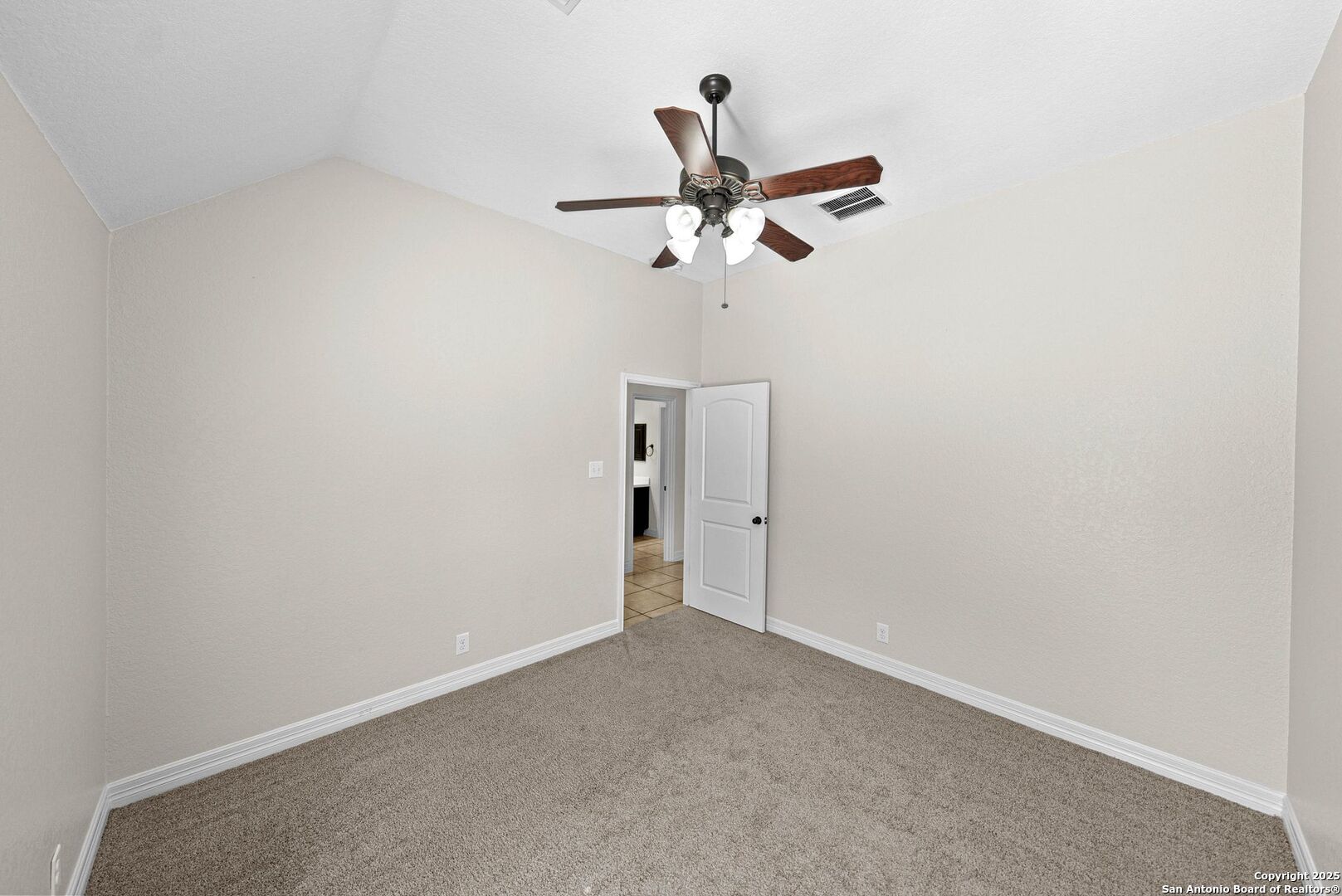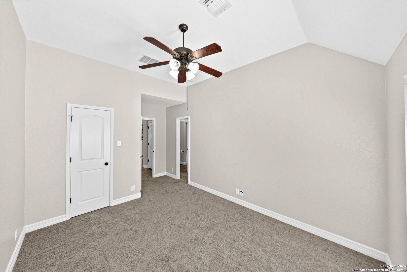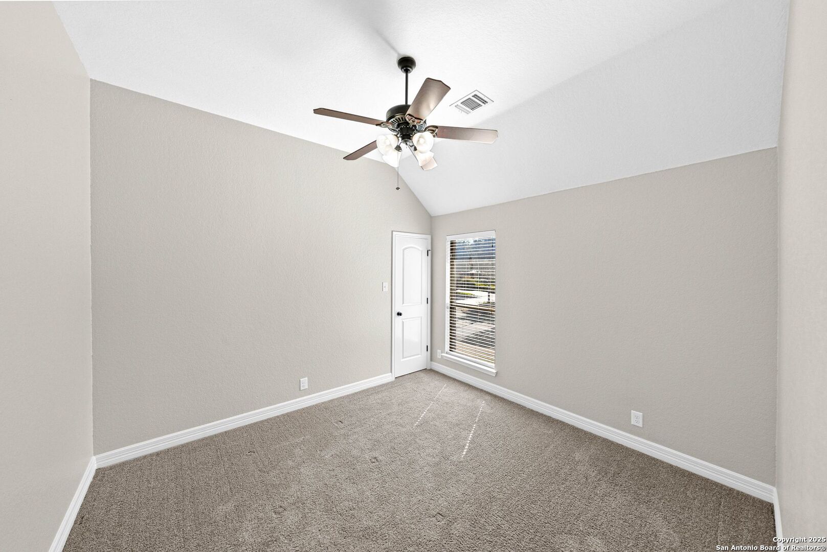 Set within the charming, gated community of Belterra, this single-story gem sits proudly on a corner lot, radiating curb appeal with its all-brick exterior and inviting covered porch. From the moment you approach, you will notice the tall, richly stained wood door with an ornate glass feature that sets the tone for what awaits inside. The foyer makes an impression with its spacious feel, high ceilings, and 18x18 tile that gives the space a clean and polished look. To your right, a private office with French doors and large bay windows creates the perfect work-from-home haven or a quiet space to focus. Across the hall, a dedicated dining area makes hosting family dinners or holiday gatherings effortless, positioned perfectly next to the kitchen. The kitchen is where this home truly shines. Designed for both everyday function and entertaining, it boasts granite countertops, stainless steel appliances including a refrigerator, and a 5-burner gas cooktop. The center island provides extra storage and electrical outlets for meal prep or baking days, while bar seating and a built-in breakfast nook with bench seating make casual meals a breeze. A generous walk-in pantry keeps everything organized and close at hand. The open-concept living room is the heart of the home, anchored by a gas-burning fireplace that invites you to settle in on cooler evenings. Large windows flood the room with natural light and provide a view of the backyard, while direct access to the covered patio makes indoor-outdoor living seamless. The oversized primary suite feels like its own retreat. With soft carpeting underfoot, bay windows that bring in morning light, and a ceiling fan for comfort, this room is made for unwinding. The en suite bathroom is spacious and well appointed, featuring dual vanities with an oversized mirror, a jetted soaking tub for end-of-day relaxation, a separate tiled shower, and a walk-in closet large enough to keep everything organized. The three additional guest bedrooms each come with walk-in closets, ceiling fans, and large windows, offering plenty of space for family or visitors. They share a thoughtfully designed Jack and Jill bathroom with dual and single vanities, plenty of storage, and a tub-shower combo with tile surround. Practical touches like the utility room with full-size washer and dryer connections, cabinetry, and an extra storage closet make everyday chores easier. Step outside to the covered back patio with embellished tile and pull-down shades, perfect for quiet coffee mornings or weekend barbecues. The level, fenced-in yard offers privacy and space to play, and the two-car attached garage adds convenience. Living here means access to controlled neighborhood gates, a community pool, a barbecue area, and a playground. All of this within the highly rated Comal ISD, making it a wonderful place to call home.