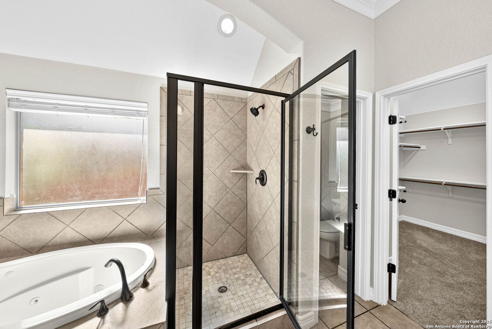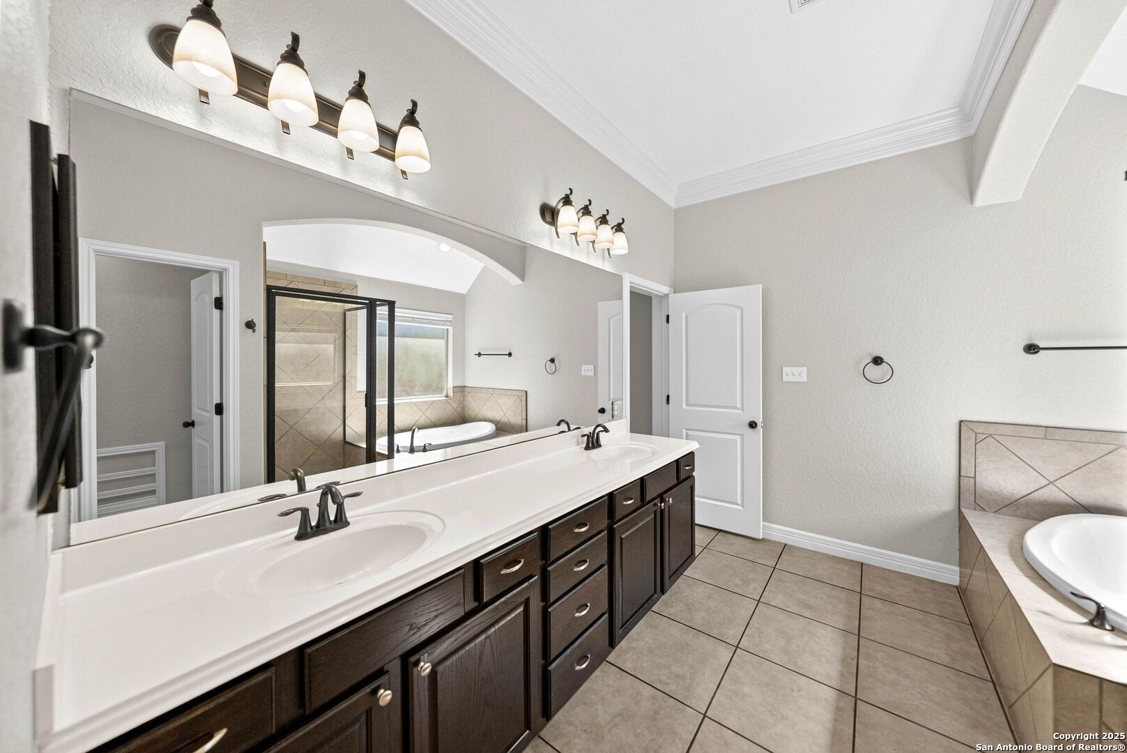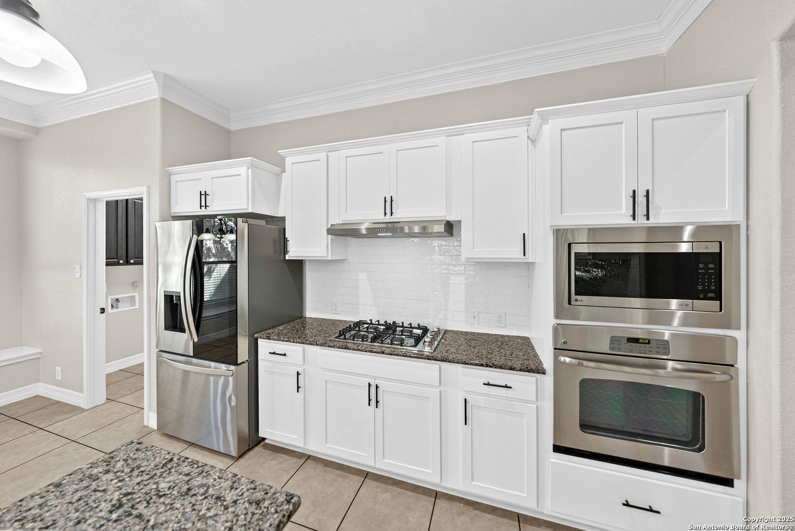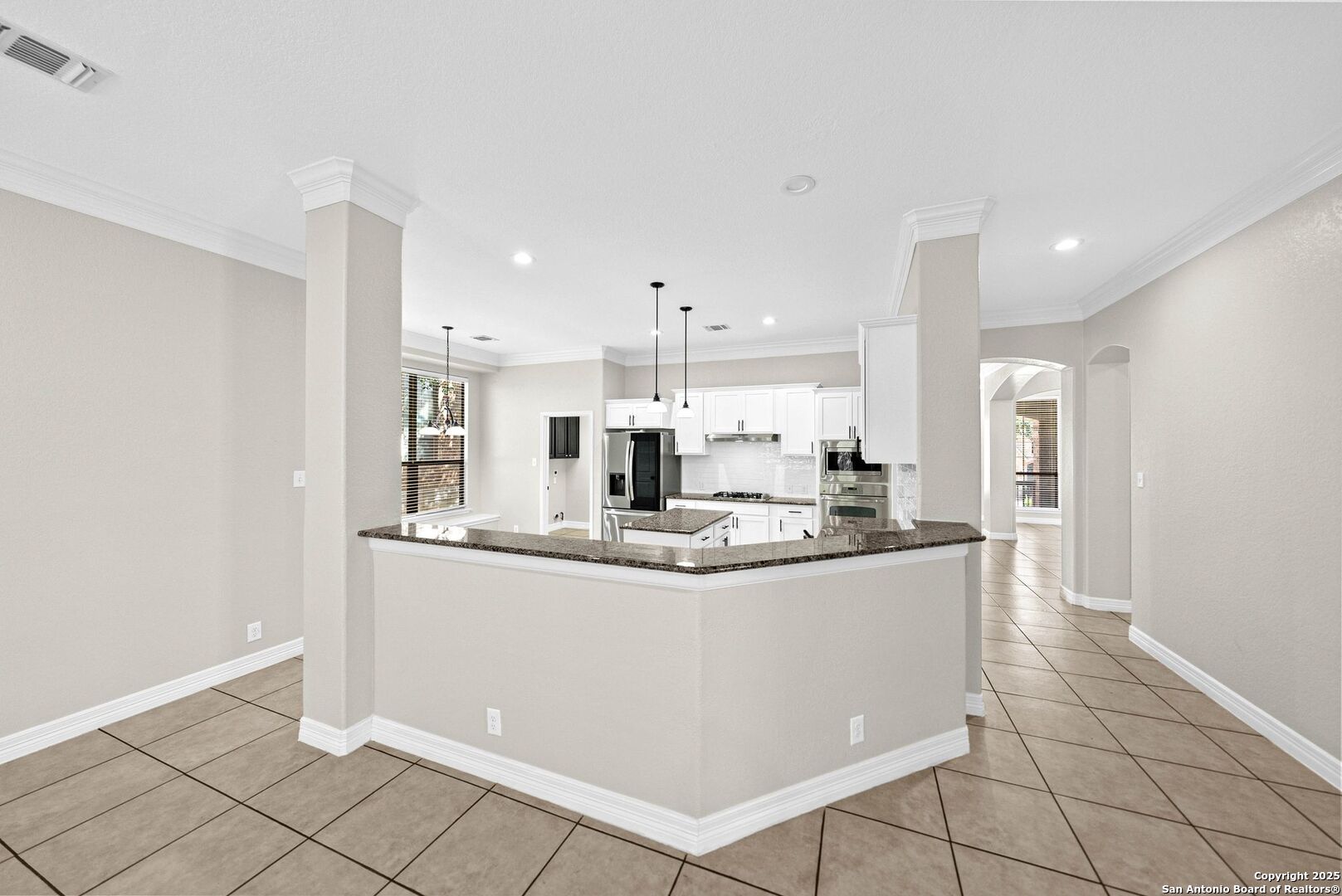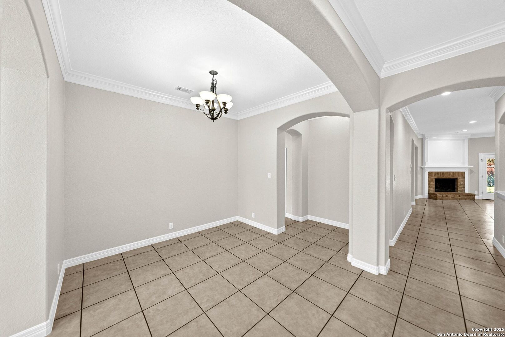Set within the charming, gated community of Belterra, this single-story gem sits proudly on a corner lot, radiating curb appeal with its all-brick exterior and inviting covered porch. From the moment you approach, you will notice the tall, richly stained wood door with an ornate glass feature that sets the tone for what awaits inside. The foyer makes an impression with its spacious feel, high ceilings, and 18x18 tile that gives the space a clean and polished look. To your right, a private office with French doors and large bay windows creates the perfect work-from-home haven or a quiet space to focus. Across the hall, a dedicated dining area makes hosting family dinners or holiday gatherings effortless, positioned perfectly next to the kitchen. The kitchen is where this home truly shines. Designed for both everyday function and entertaining, it boasts granite countertops, stainless steel appliances including a refrigerator, and a 5-burner gas cooktop. The center island provides extra storage and electrical outlets for meal prep or baking days, while bar seating and a built-in breakfast nook with bench seating make casual meals a breeze. A generous walk-in pantry keeps everything organized and close at hand. The open-concept living room is the heart of the home, anchored by a gas-burning fireplace that invites you to settle in on cooler evenings. Large windows flood the room with natural light and provide a view of the backyard, while direct access to the covered patio makes indoor-outdoor living seamless. The oversized primary suite feels like its own retreat. With soft carpeting underfoot, bay windows that bring in morning light, and a ceiling fan for comfort, this room is made for unwinding. The en suite bathroom is spacious and well appointed, featuring dual vanities with an oversized mirror, a jetted soaking tub for end-of-day relaxation, a separate tiled shower, and a walk-in closet large enough to keep everything organized. The three additional guest bedrooms each come with walk-in closets, ceiling fans, and large windows, offering plenty of space for family or visitors. They share a thoughtfully designed Jack and Jill bathroom with dual and single vanities, plenty of storage, and a tub-shower combo with tile surround. Practical touches like the utility room with full-size washer and dryer connections, cabinetry, and an extra storage closet make everyday chores easier. Step outside to the covered back patio with embellished tile and pull-down shades, perfect for quiet coffee mornings or weekend barbecues. The level, fenced-in yard offers privacy and space to play, and the two-car attached garage adds convenience. Living here means access to controlled neighborhood gates, a community pool, a barbecue area, and a playground. All of this within the highly rated Comal ISD, making it a wonderful place to call home.