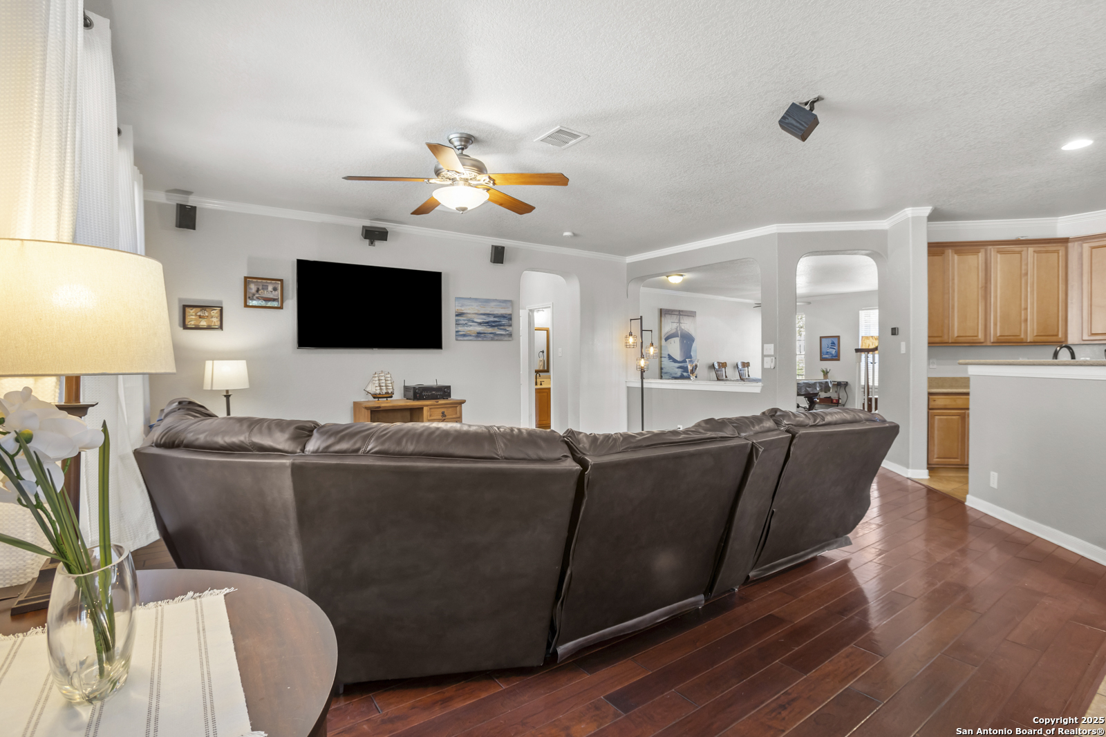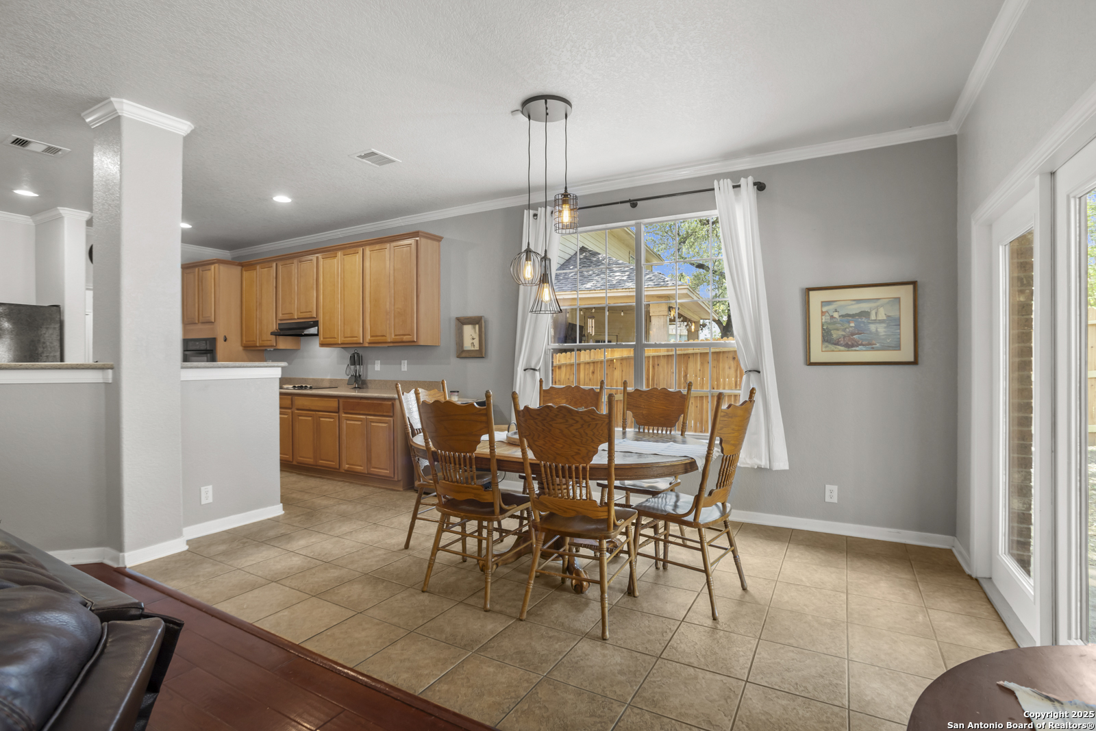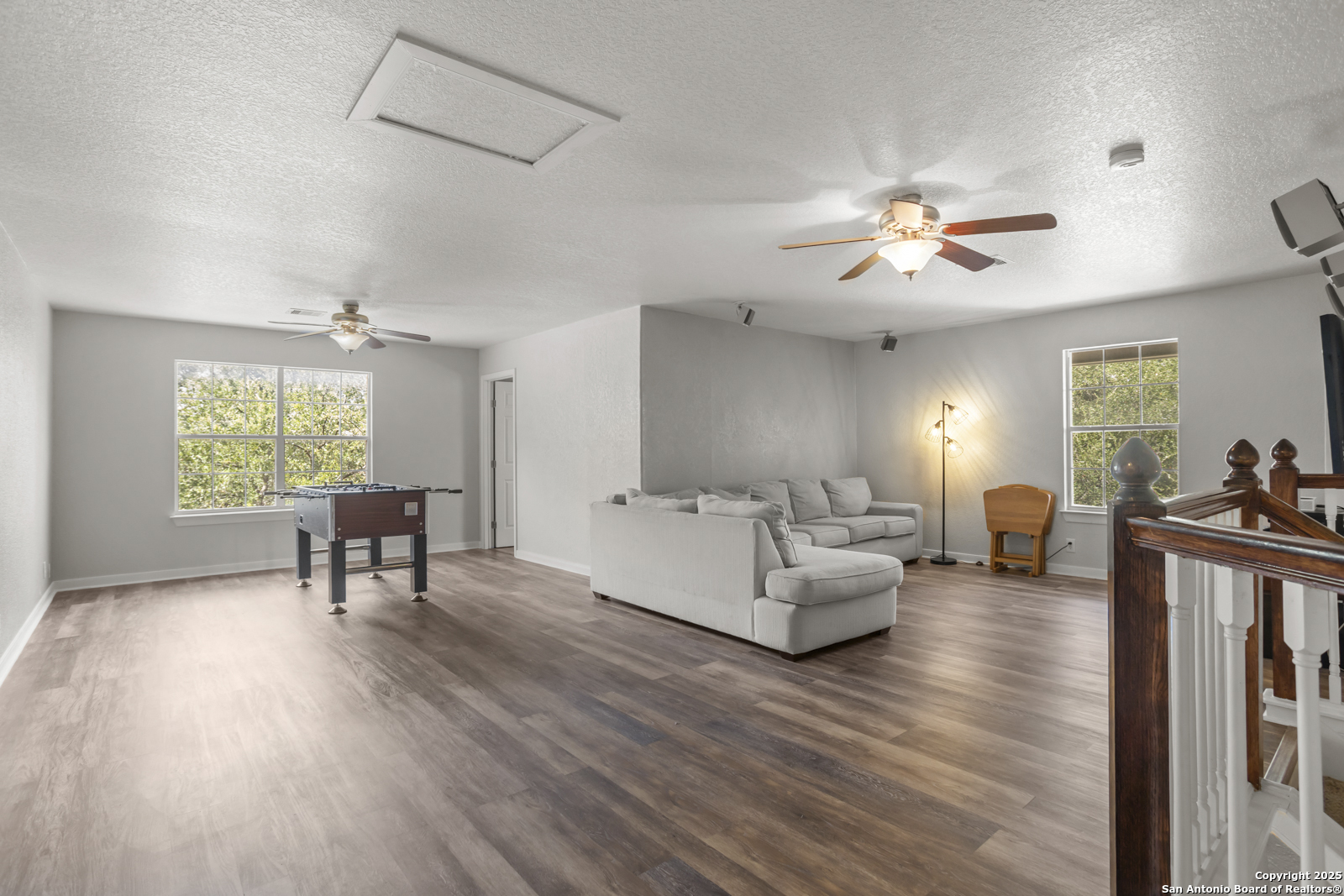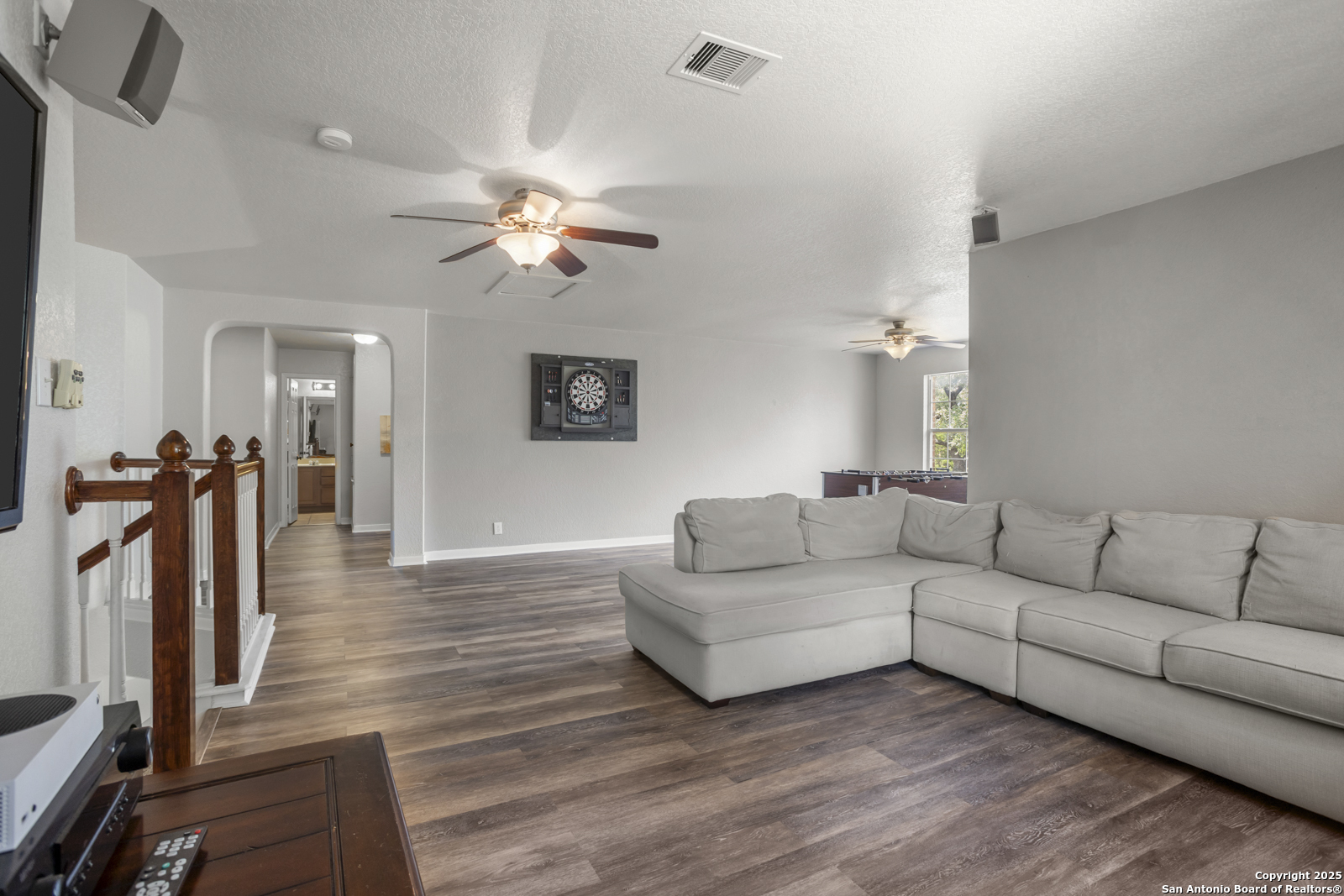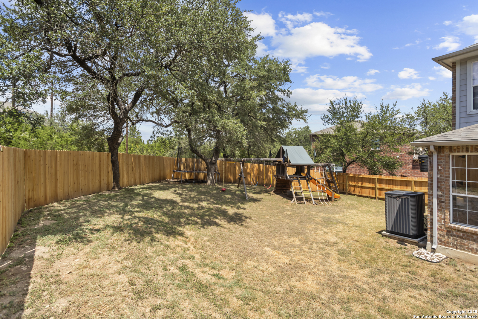Welcome to 25127 Royal Land, a beautifully appointed 3,521 sq ft home offering 4 bedrooms and 2.5 baths in the sought-after Stage Run community of Northwest San Antonio. From the moment you step inside you're greeted by a welcoming entry and formal dining room that flow into a spacious open-concept living area where the kitchen, breakfast bar, and family room connect seamlessly, perfect for both everyday living and entertaining. The kitchen boasts quartz countertops, abundant cabinet space, and a layout designed for convenience and gatherings. The oversized master suite offers plenty of room for a sitting area and a spa-like bath with a double vanity, separate shower, and a luxurious Jacuzzi tub. Upstairs, a generous loft anchors the remaining bedrooms, providing an ideal spot for a game room, home office, or media space. Fresh paint, crown molding, and an updated half bath add a refined touch throughout. Outside, enjoy an extended covered patio with ceiling fans, built-in speakers, and wiring for a hot tub overlooking a large shaded backyard with mature trees and outdoor lighting. The home is plumbed for a water softener and features a 2020 HVAC replacement for peace of mind. Located less than a mile from Aue Elementary, major grocery stores, shopping, and theme parks, with community amenities including a soccer field, basketball court, trails, park, and dog park, this property offers the perfect balance of comfort, style, and convenience.