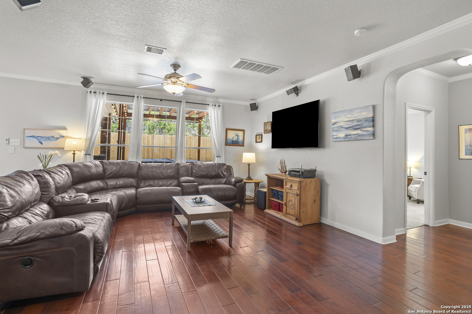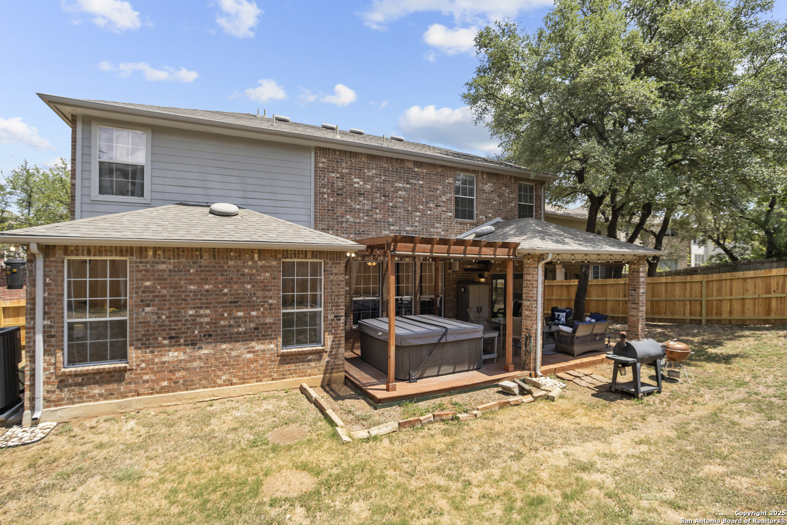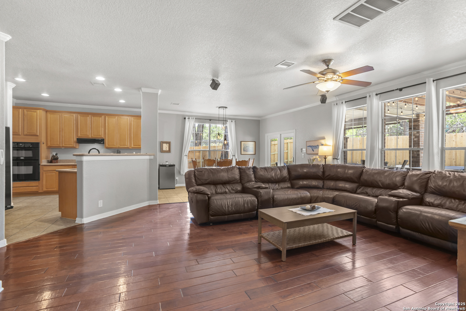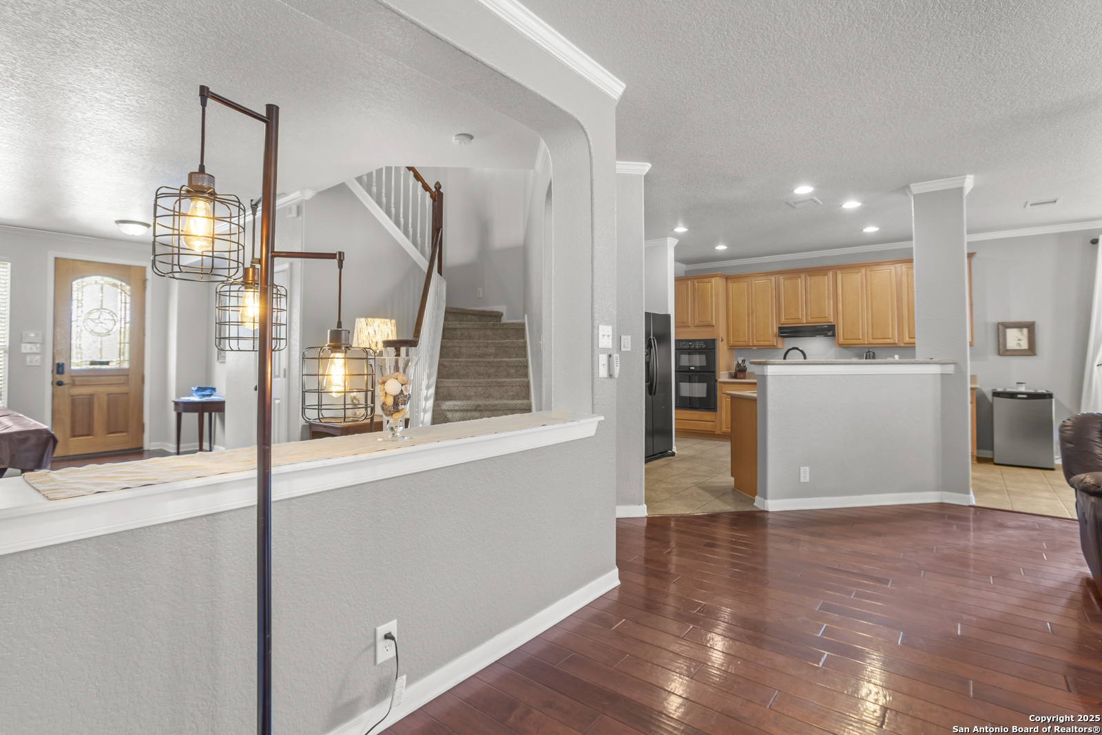 Welcome to 25127 Royal Land, a beautifully appointed 3,521 sq ft home offering 4 bedrooms and 2.5 baths in the sought-after Stage Run community of Northwest San Antonio. From the moment you step inside you're greeted by a welcoming entry and formal dining room that flow into a spacious open-concept living area where the kitchen, breakfast bar, and family room connect seamlessly, perfect for both everyday living and entertaining. The kitchen boasts quartz countertops, abundant cabinet space, and a layout designed for convenience and gatherings. The oversized master suite offers plenty of room for a sitting area and a spa-like bath with a double vanity, separate shower, and a luxurious Jacuzzi tub. Upstairs, a generous loft anchors the remaining bedrooms, providing an ideal spot for a game room, home office, or media space. Fresh paint, crown molding, and an updated half bath add a refined touch throughout. Outside, enjoy an extended covered patio with ceiling fans, built-in speakers, and wiring for a hot tub overlooking a large shaded backyard with mature trees and outdoor lighting. The home is plumbed for a water softener and features a 2020 HVAC replacement for peace of mind. Located less than a mile from Aue Elementary, major grocery stores, shopping, and theme parks, with community amenities including a soccer field, basketball court, trails, park, and dog park, this property offers the perfect balance of comfort, style, and convenience.