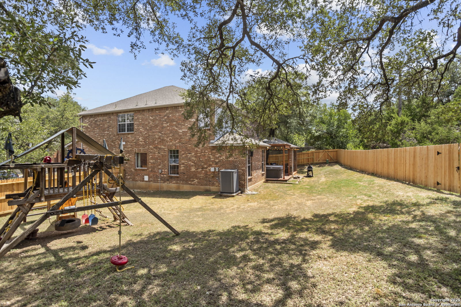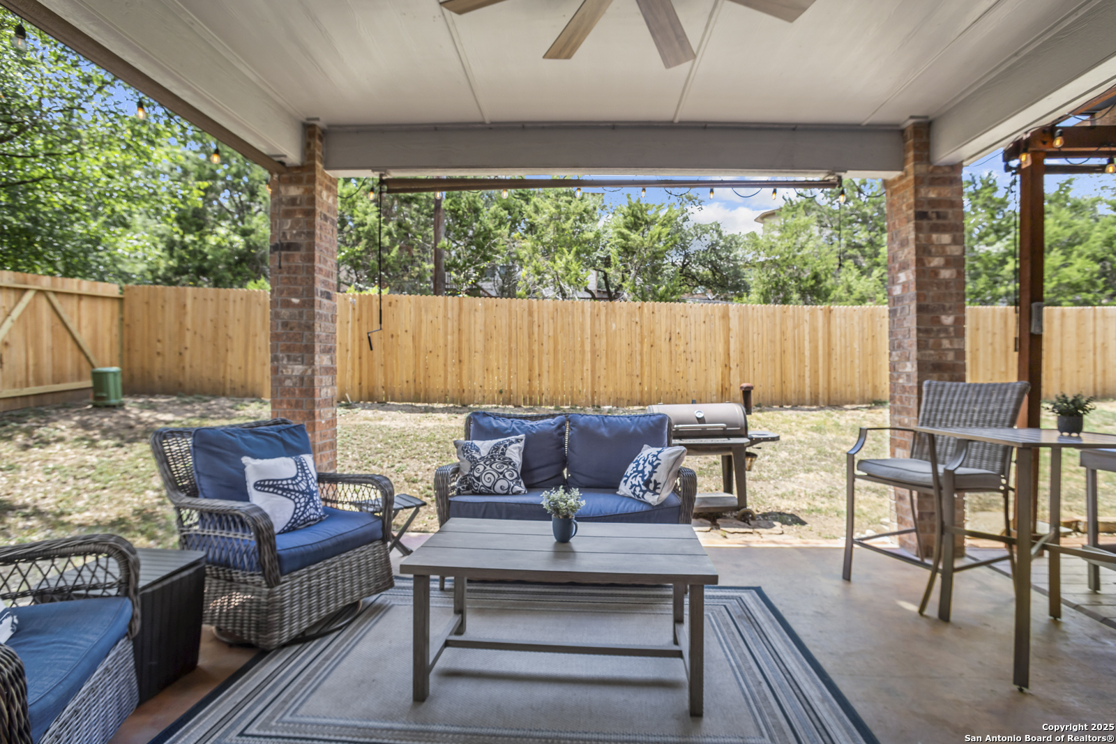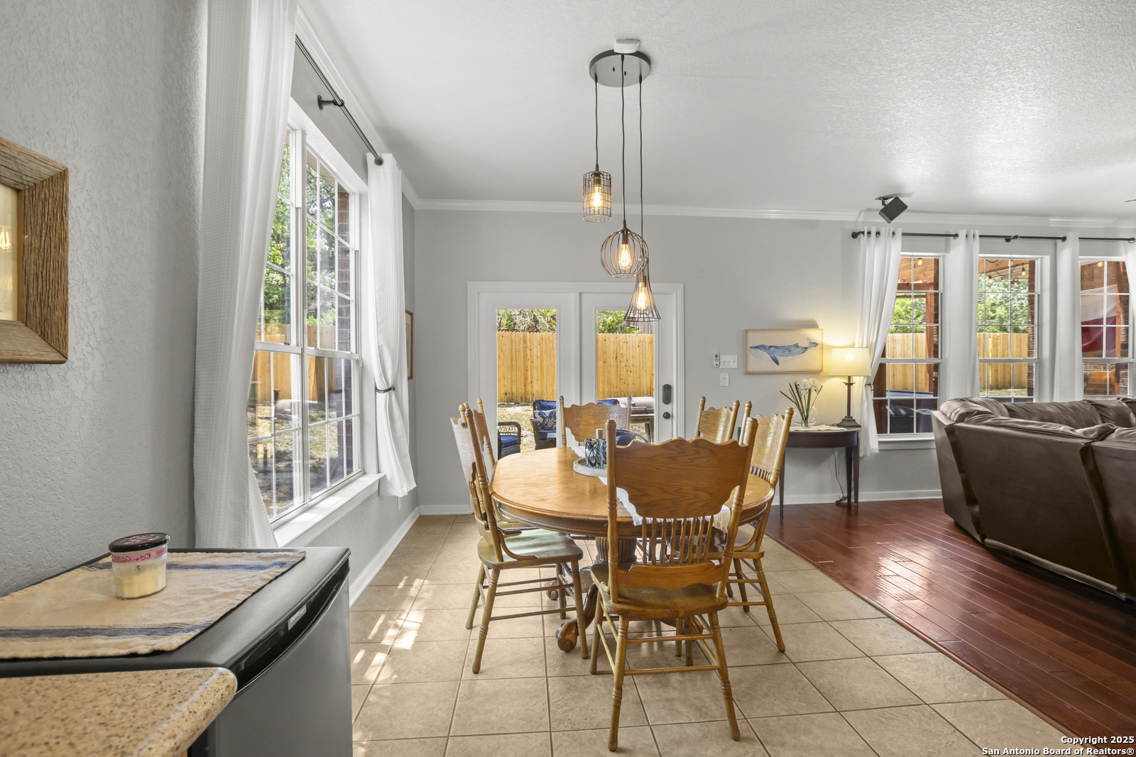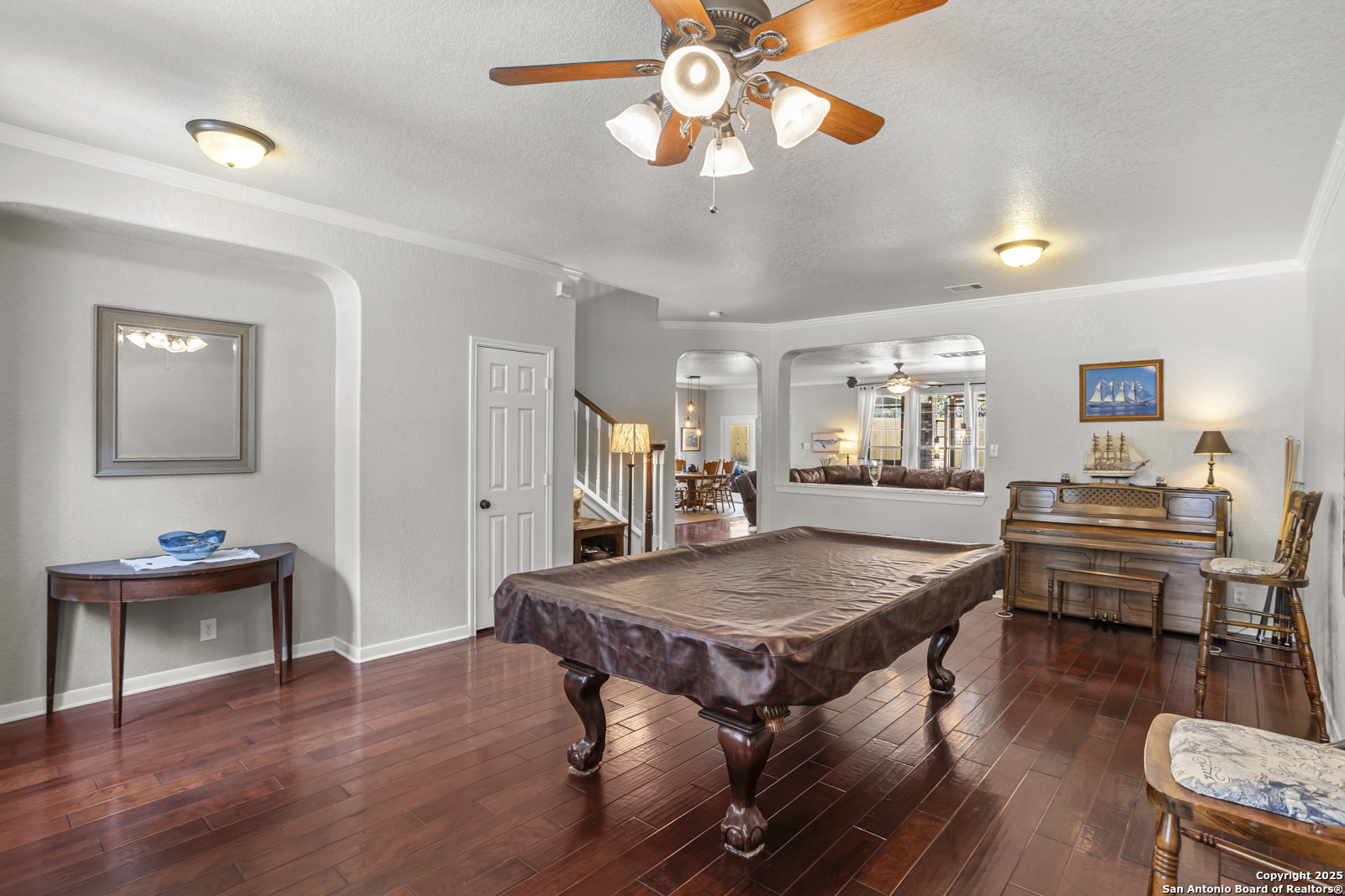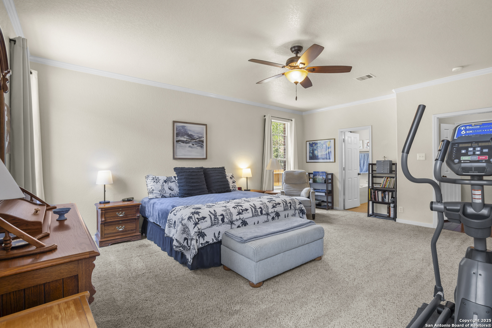 Welcome to 25127 Royal Land, a beautifully appointed 3,521 sq ft home offering 4 bedrooms and 2.5 baths in the sought-after Stage Run community of Northwest San Antonio. From the moment you step inside you're greeted by a welcoming entry and formal dining room that flow into a spacious open-concept living area where the kitchen, breakfast bar, and family room connect seamlessly, perfect for both everyday living and entertaining. The kitchen boasts quartz countertops, abundant cabinet space, and a layout designed for convenience and gatherings. The oversized master suite offers plenty of room for a sitting area and a spa-like bath with a double vanity, separate shower, and a luxurious Jacuzzi tub. Upstairs, a generous loft anchors the remaining bedrooms, providing an ideal spot for a game room, home office, or media space. Fresh paint, crown molding, and an updated half bath add a refined touch throughout. Outside, enjoy an extended covered patio with ceiling fans, built-in speakers, and wiring for a hot tub overlooking a large shaded backyard with mature trees and outdoor lighting. The home is plumbed for a water softener and features a 2020 HVAC replacement for peace of mind. Located less than a mile from Aue Elementary, major grocery stores, shopping, and theme parks, with community amenities including a soccer field, basketball court, trails, park, and dog park, this property offers the perfect balance of comfort, style, and convenience.