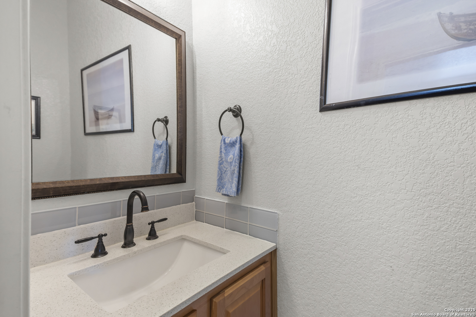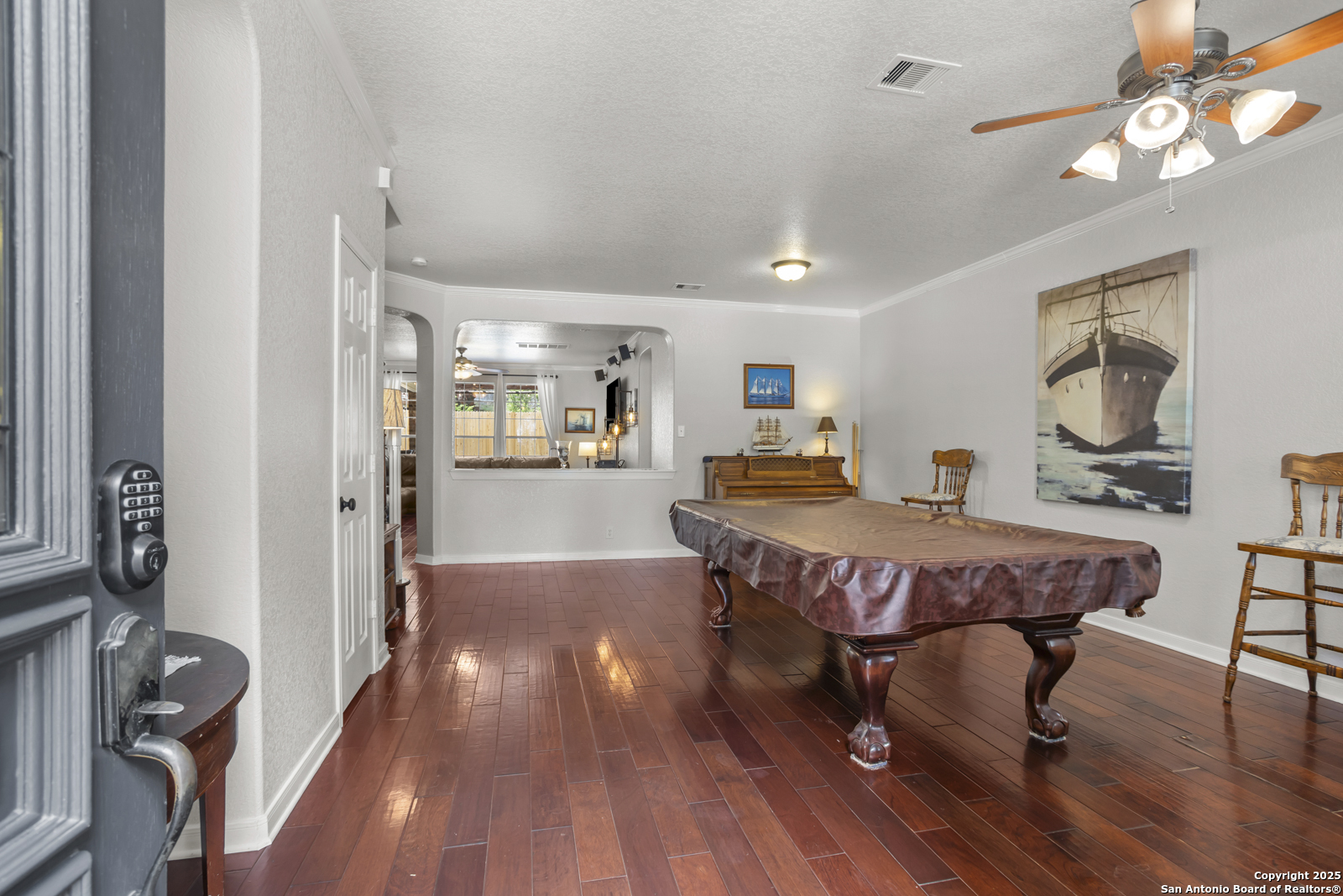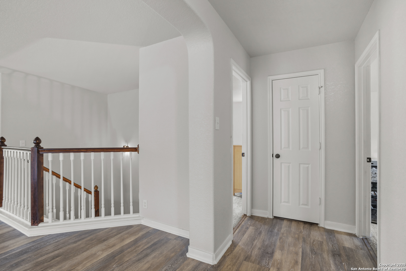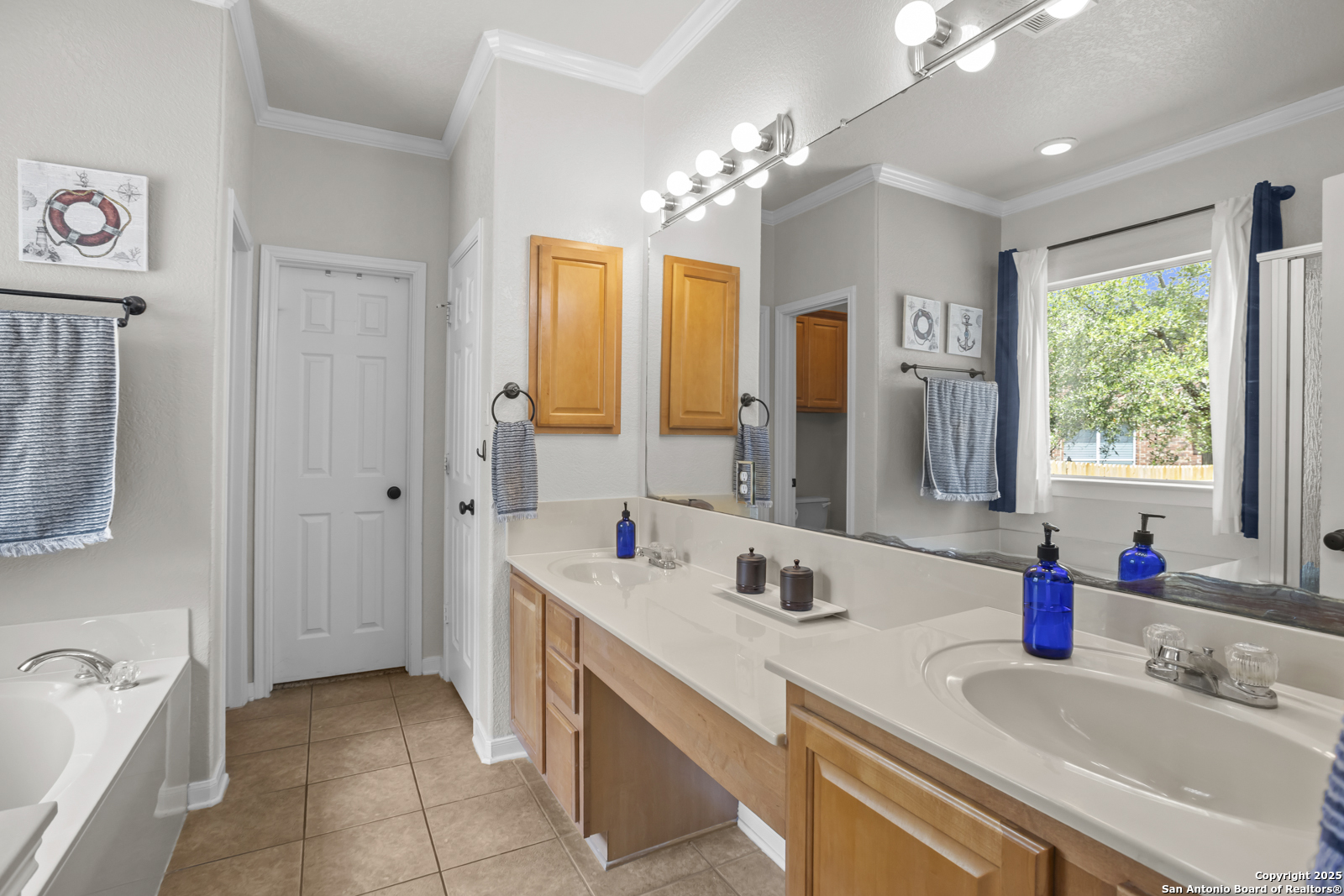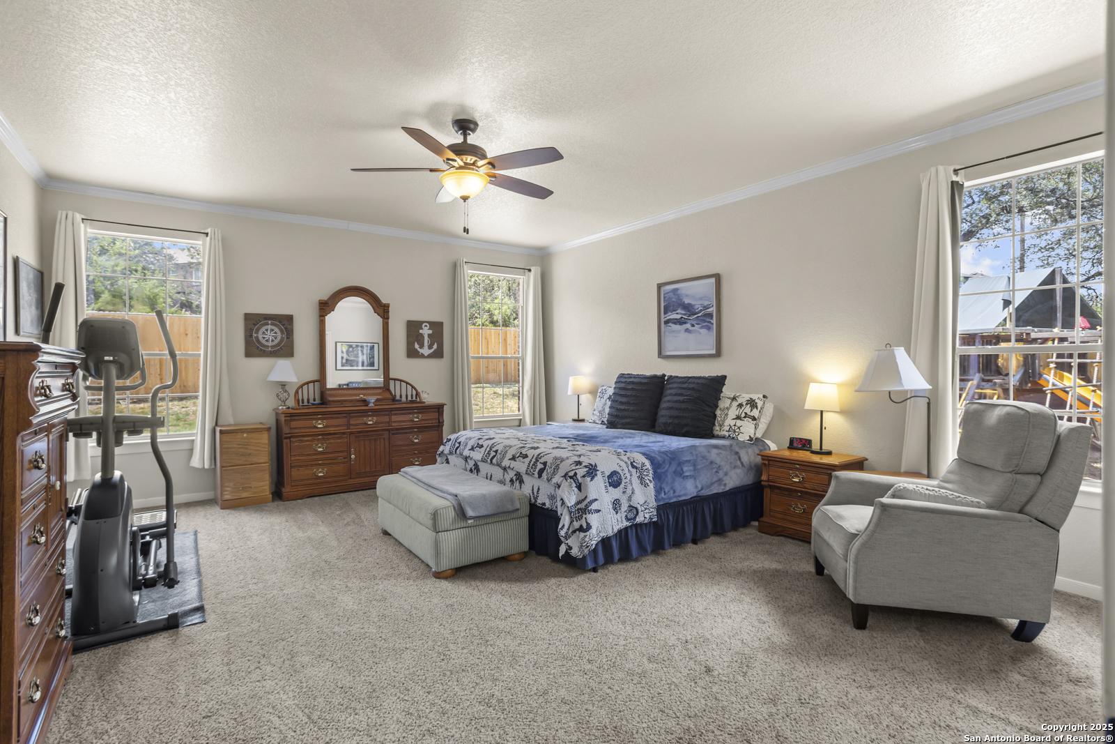 Welcome to 25127 Royal Land, a beautifully appointed 3,521 sq ft home offering 4 bedrooms and 2.5 baths in the sought-after Stage Run community of Northwest San Antonio. From the moment you step inside you're greeted by a welcoming entry and formal dining room that flow into a spacious open-concept living area where the kitchen, breakfast bar, and family room connect seamlessly, perfect for both everyday living and entertaining. The kitchen boasts quartz countertops, abundant cabinet space, and a layout designed for convenience and gatherings. The oversized master suite offers plenty of room for a sitting area and a spa-like bath with a double vanity, separate shower, and a luxurious Jacuzzi tub. Upstairs, a generous loft anchors the remaining bedrooms, providing an ideal spot for a game room, home office, or media space. Fresh paint, crown molding, and an updated half bath add a refined touch throughout. Outside, enjoy an extended covered patio with ceiling fans, built-in speakers, and wiring for a hot tub overlooking a large shaded backyard with mature trees and outdoor lighting. The home is plumbed for a water softener and features a 2020 HVAC replacement for peace of mind. Located less than a mile from Aue Elementary, major grocery stores, shopping, and theme parks, with community amenities including a soccer field, basketball court, trails, park, and dog park, this property offers the perfect balance of comfort, style, and convenience.