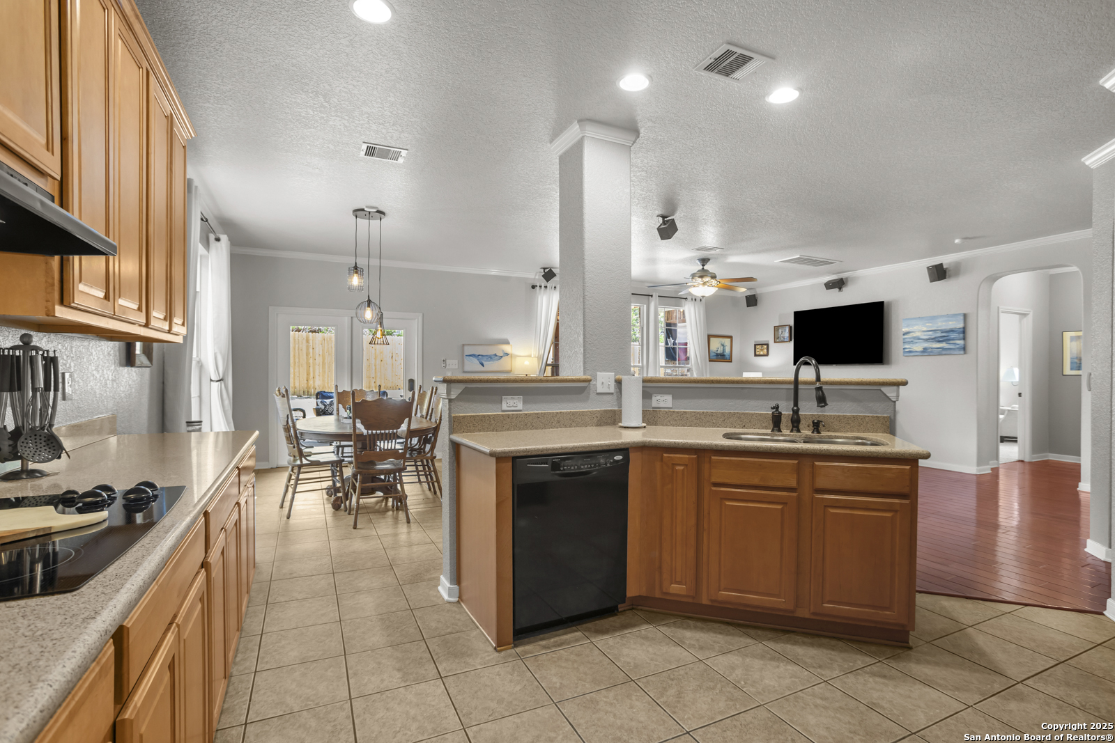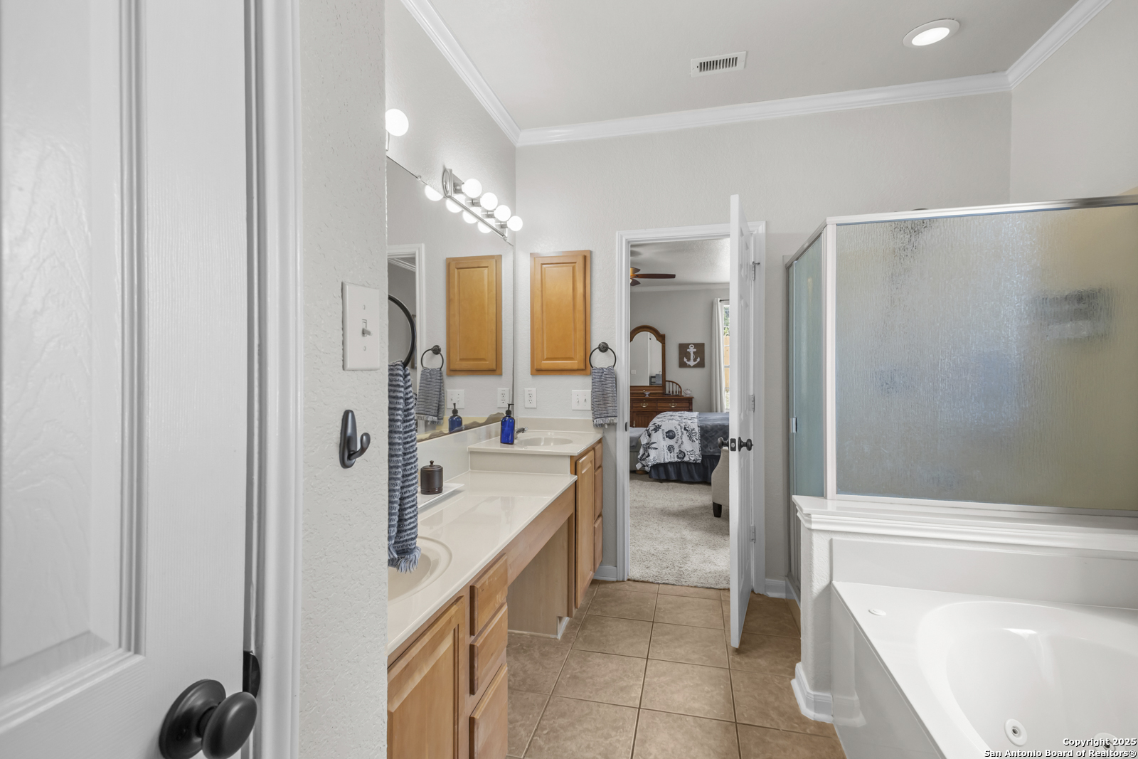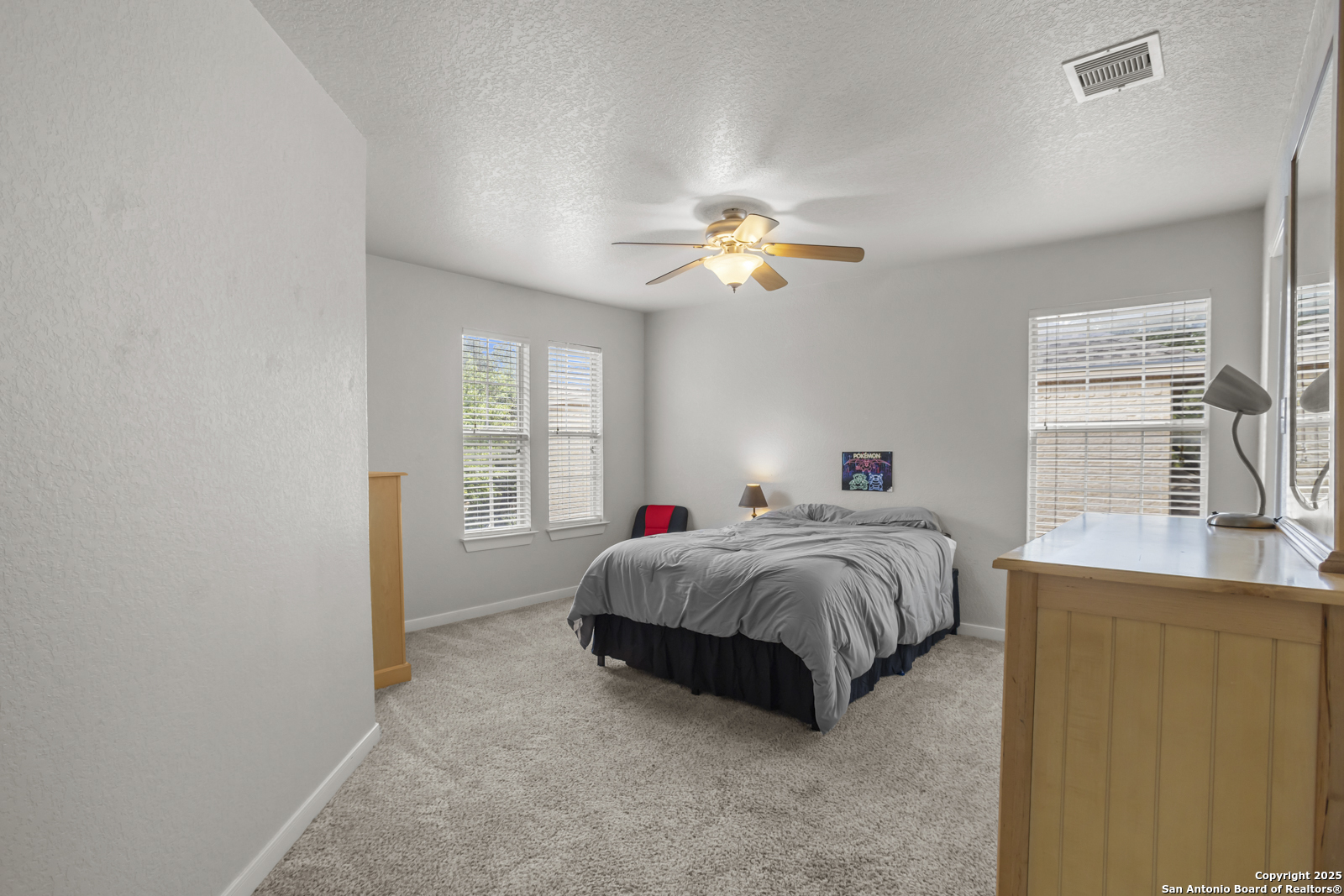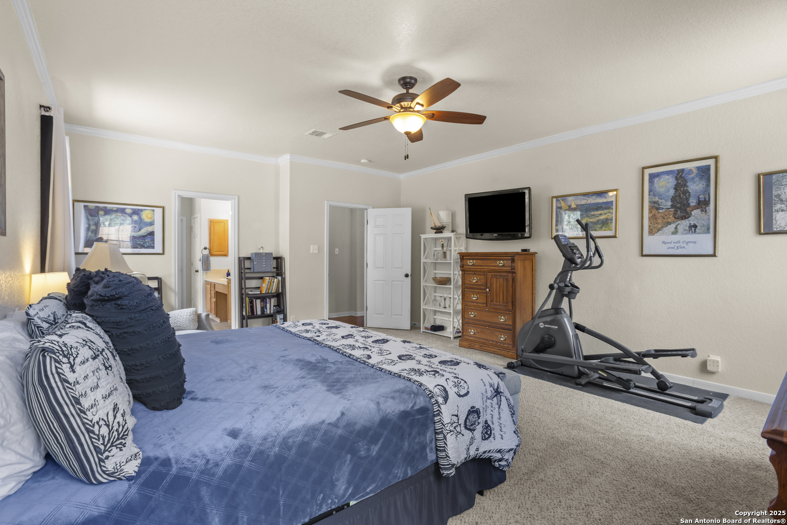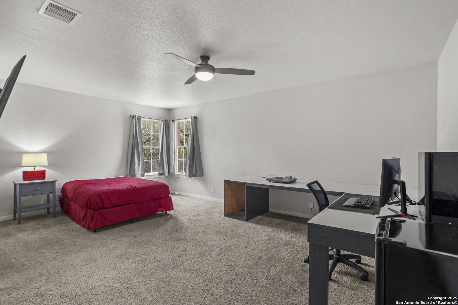 Welcome to 25127 Royal Land, a beautifully appointed 3,521 sq ft home offering 4 bedrooms and 2.5 baths in the sought-after Stage Run community of Northwest San Antonio. From the moment you step inside you're greeted by a welcoming entry and formal dining room that flow into a spacious open-concept living area where the kitchen, breakfast bar, and family room connect seamlessly, perfect for both everyday living and entertaining. The kitchen boasts quartz countertops, abundant cabinet space, and a layout designed for convenience and gatherings. The oversized master suite offers plenty of room for a sitting area and a spa-like bath with a double vanity, separate shower, and a luxurious Jacuzzi tub. Upstairs, a generous loft anchors the remaining bedrooms, providing an ideal spot for a game room, home office, or media space. Fresh paint, crown molding, and an updated half bath add a refined touch throughout. Outside, enjoy an extended covered patio with ceiling fans, built-in speakers, and wiring for a hot tub overlooking a large shaded backyard with mature trees and outdoor lighting. The home is plumbed for a water softener and features a 2020 HVAC replacement for peace of mind. Located less than a mile from Aue Elementary, major grocery stores, shopping, and theme parks, with community amenities including a soccer field, basketball court, trails, park, and dog park, this property offers the perfect balance of comfort, style, and convenience.