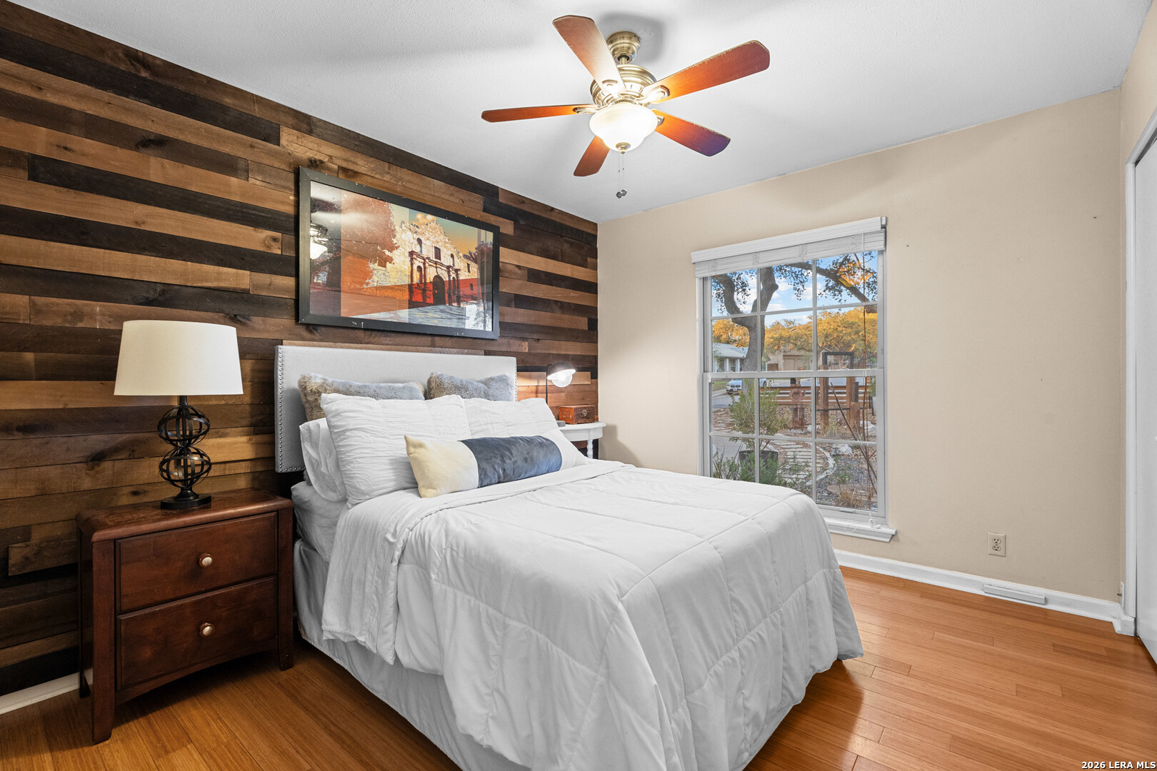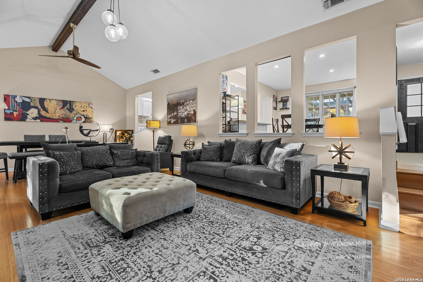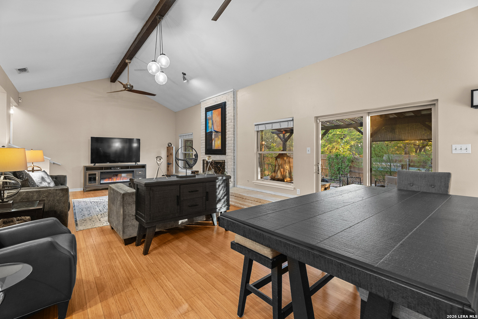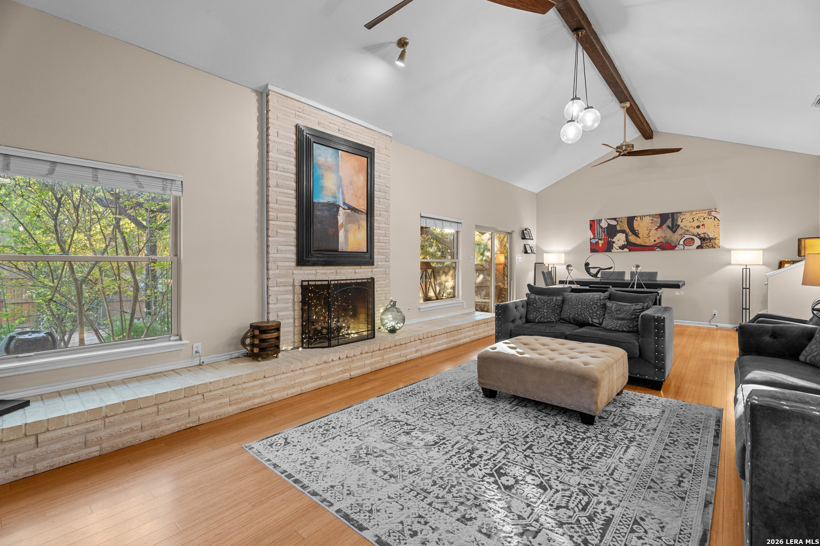 Welcome to this beautifully maintained split-level home located in the highly sought-after Oak Hollow / Thousand Oaks area. Nestled in a quiet setting, this home offers a great balance of character, functionality, and modern updates throughout. As you enter, you're greeted by an expansive 32x16 sunken living room featuring vaulted ceilings with exposed beams and a striking floor-to-ceiling brick fireplace that anchors the space. The layout flows seamlessly into the dining area and kitchen, creating an open feel that's perfect for both everyday living and entertaining. The kitchen is well appointed with Silestone countertops, stainless steel appliances, a breakfast bar, a built-in desk area, and ample cabinet space. The primary suite offers a comfortable retreat with high ceilings, dual closets including a spacious walk-in, custom his-and-her built-ins, and an updated bathroom featuring dual vanities. Two additional bedrooms provide flexibility for guests, a home office, or additional living space. Throughout the home, you'll find bamboo wood and tile flooring, fresh interior paint, and energy-efficient Low-E custom Kolbe windows that bring in great natural light. The home also includes a water softener, an HVAC system with enhanced air filtration, and an AC condenser replaced approximately four years ago. The oversized two-car garage features a dedicated workspace with a built-in workbench, ample cabinetry, and additional storage, ideal for projects or organization. Step outside to a covered patio, concrete entertaining space, and lush landscaping with mature oak trees and stone walkways, creating a private and peaceful outdoor retreat.