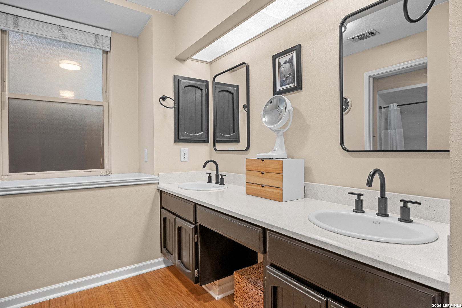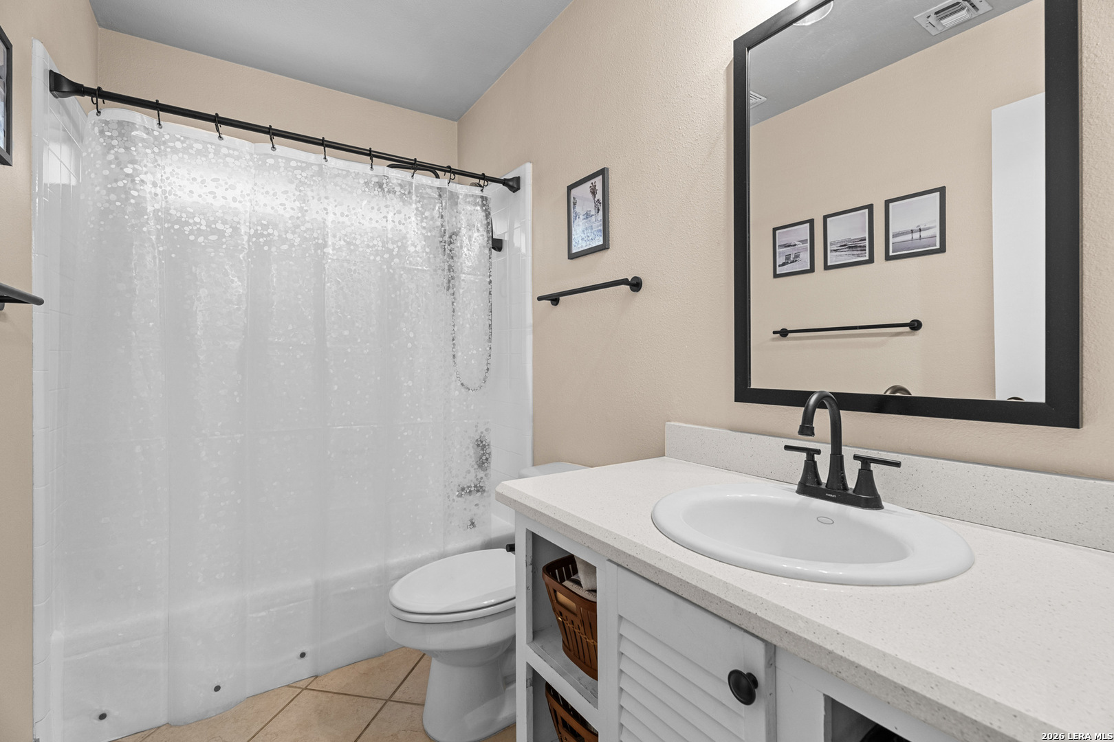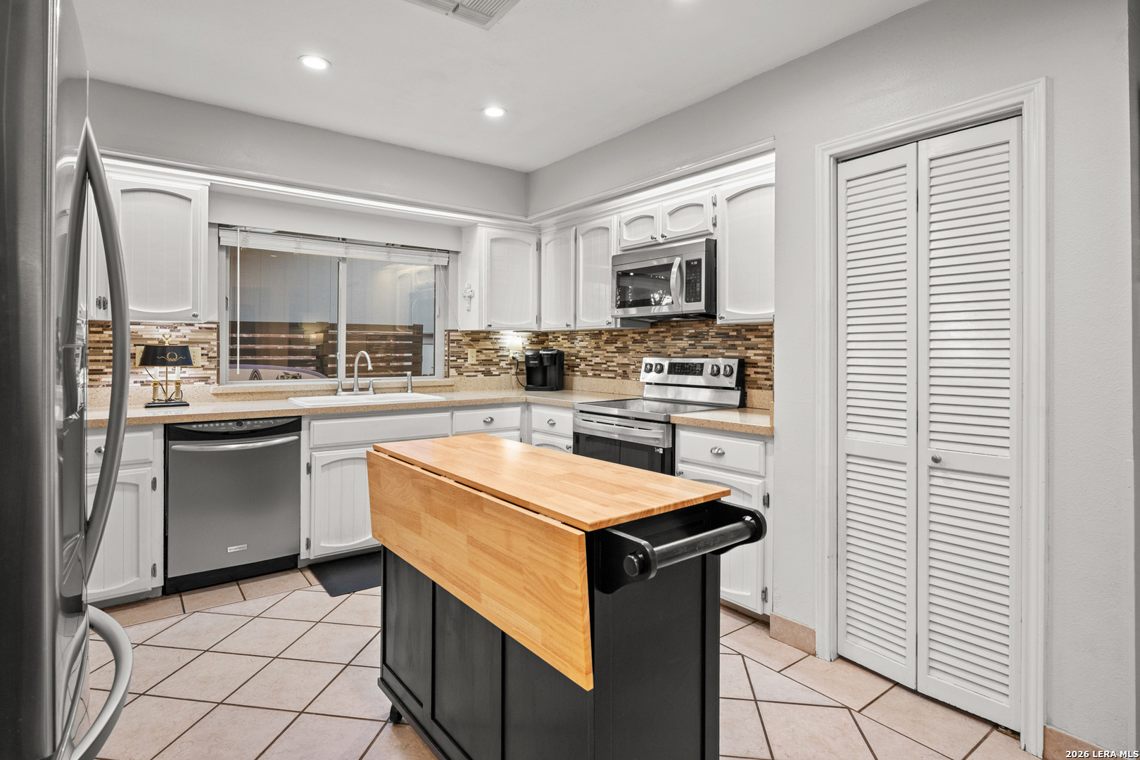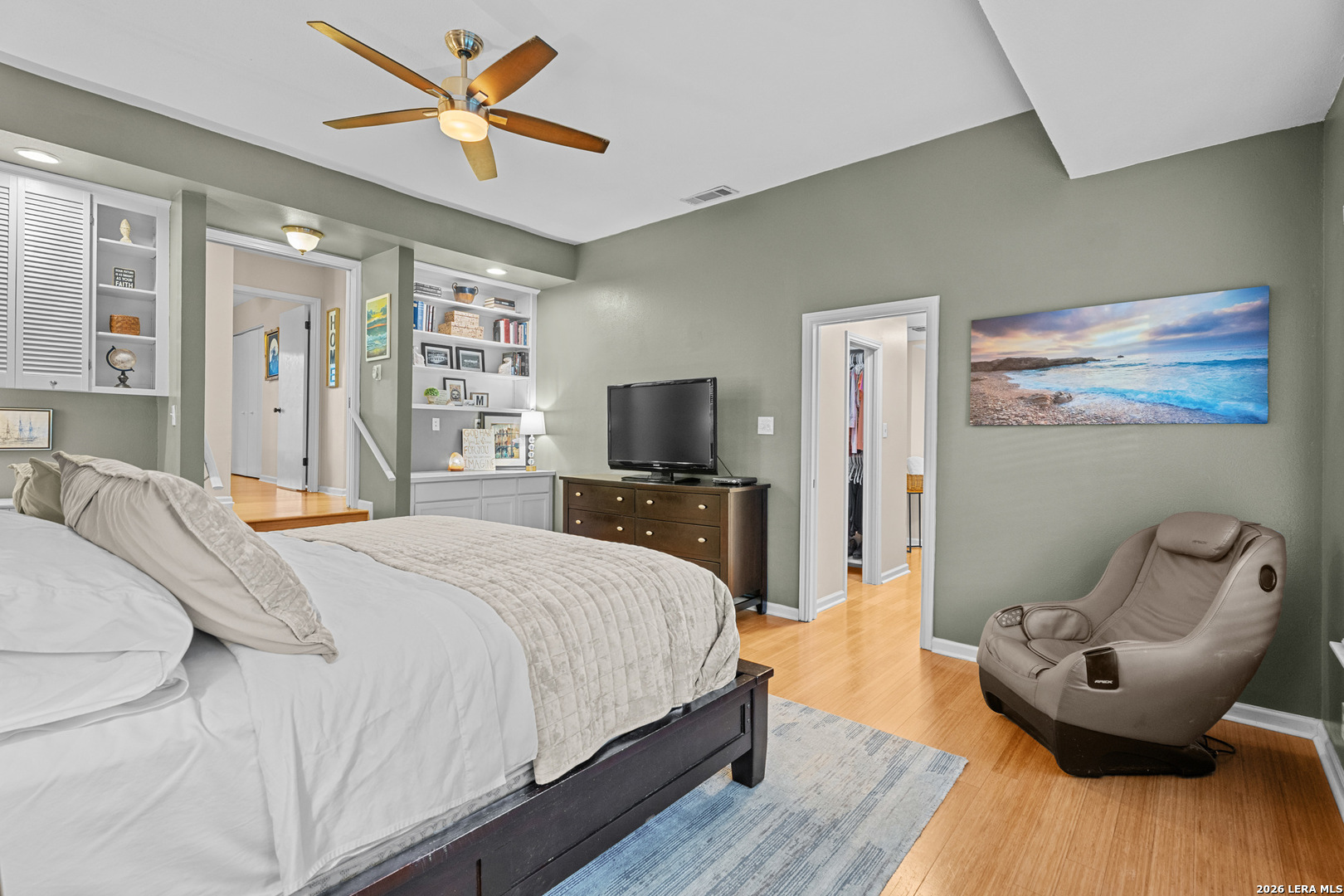 Welcome to this beautifully maintained split-level home located in the highly sought-after Oak Hollow / Thousand Oaks area. Nestled in a quiet setting, this home offers a great balance of character, functionality, and modern updates throughout. As you enter, you're greeted by an expansive 32x16 sunken living room featuring vaulted ceilings with exposed beams and a striking floor-to-ceiling brick fireplace that anchors the space. The layout flows seamlessly into the dining area and kitchen, creating an open feel that's perfect for both everyday living and entertaining. The kitchen is well appointed with Silestone countertops, stainless steel appliances, a breakfast bar, a built-in desk area, and ample cabinet space. The primary suite offers a comfortable retreat with high ceilings, dual closets including a spacious walk-in, custom his-and-her built-ins, and an updated bathroom featuring dual vanities. Two additional bedrooms provide flexibility for guests, a home office, or additional living space. Throughout the home, you'll find bamboo wood and tile flooring, fresh interior paint, and energy-efficient Low-E custom Kolbe windows that bring in great natural light. The home also includes a water softener, an HVAC system with enhanced air filtration, and an AC condenser replaced approximately four years ago. The oversized two-car garage features a dedicated workspace with a built-in workbench, ample cabinetry, and additional storage, ideal for projects or organization. Step outside to a covered patio, concrete entertaining space, and lush landscaping with mature oak trees and stone walkways, creating a private and peaceful outdoor retreat.