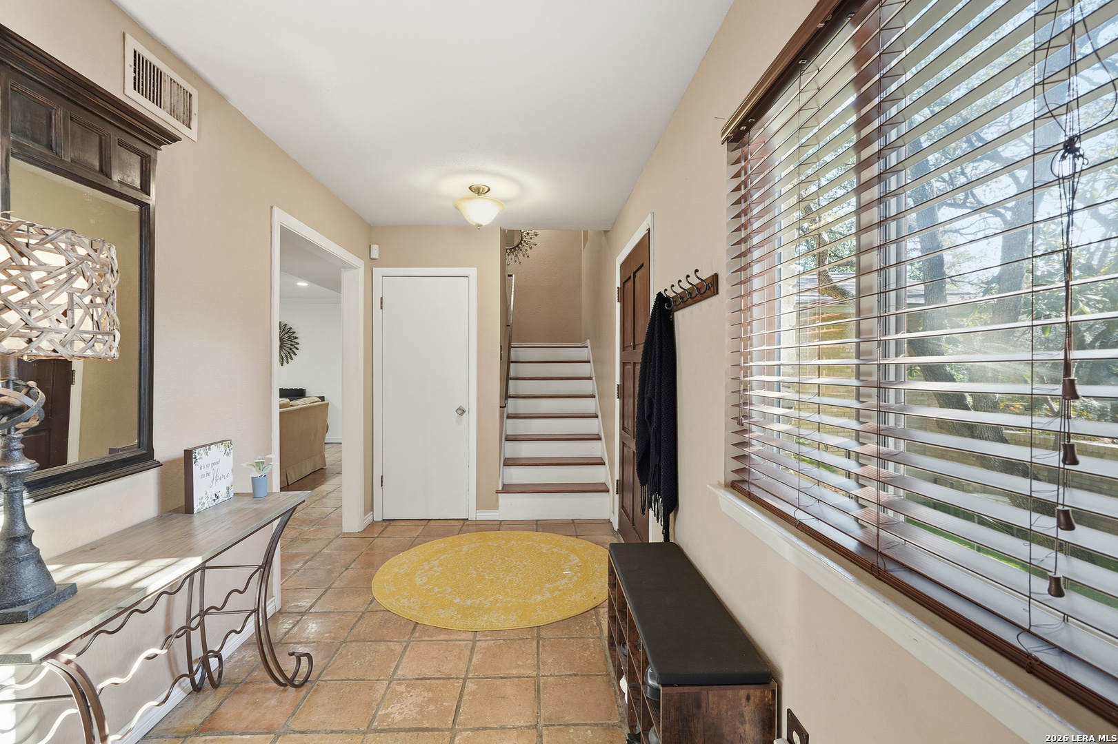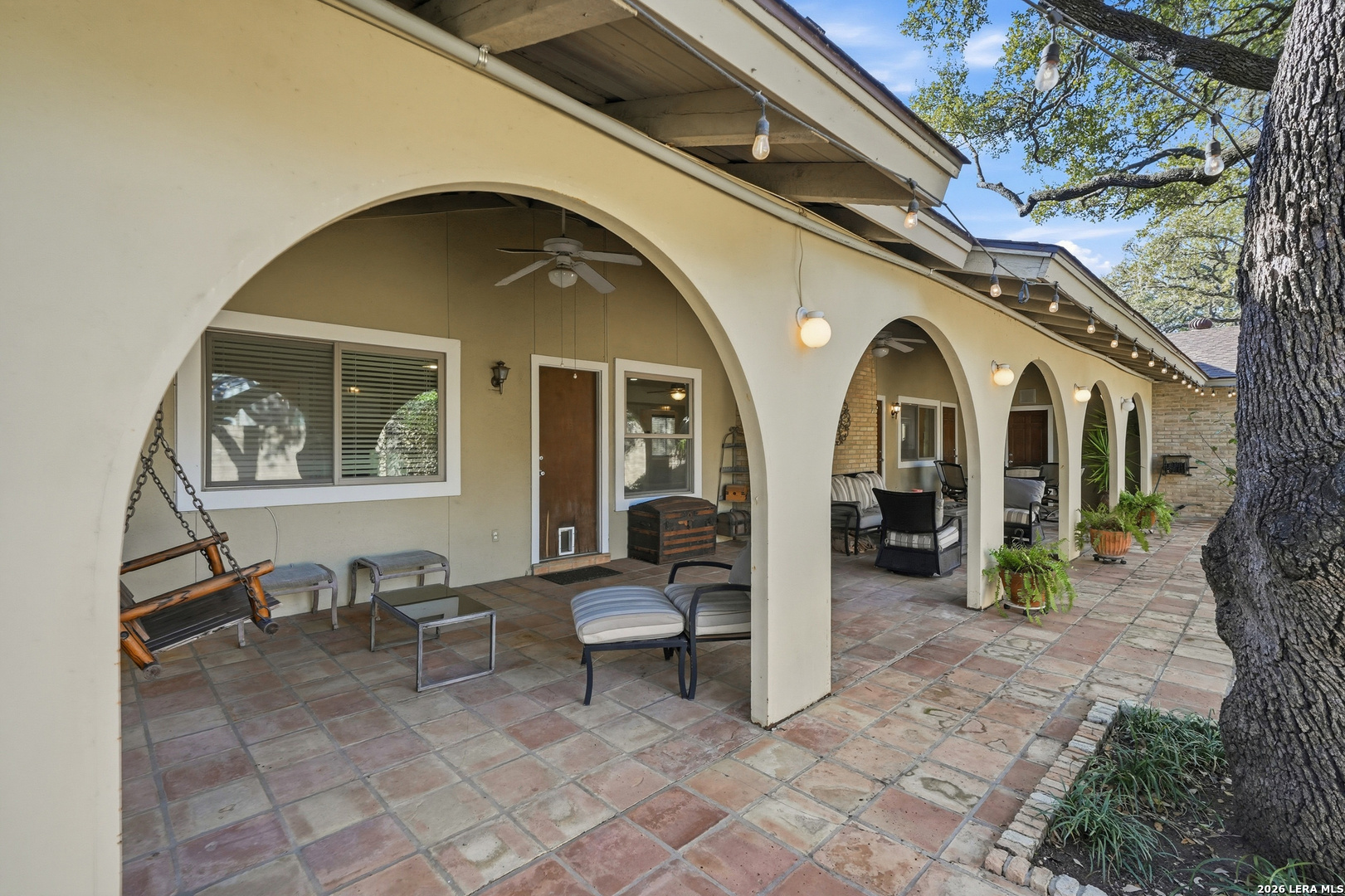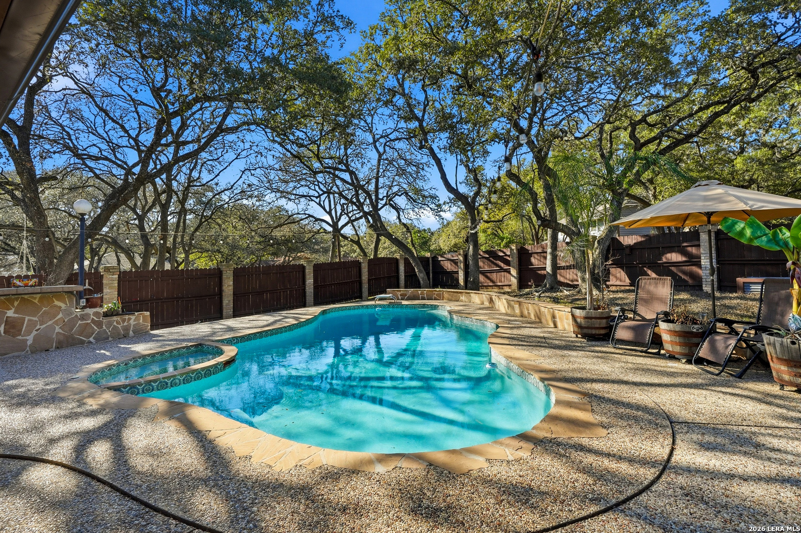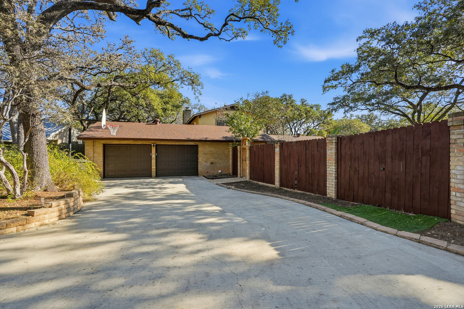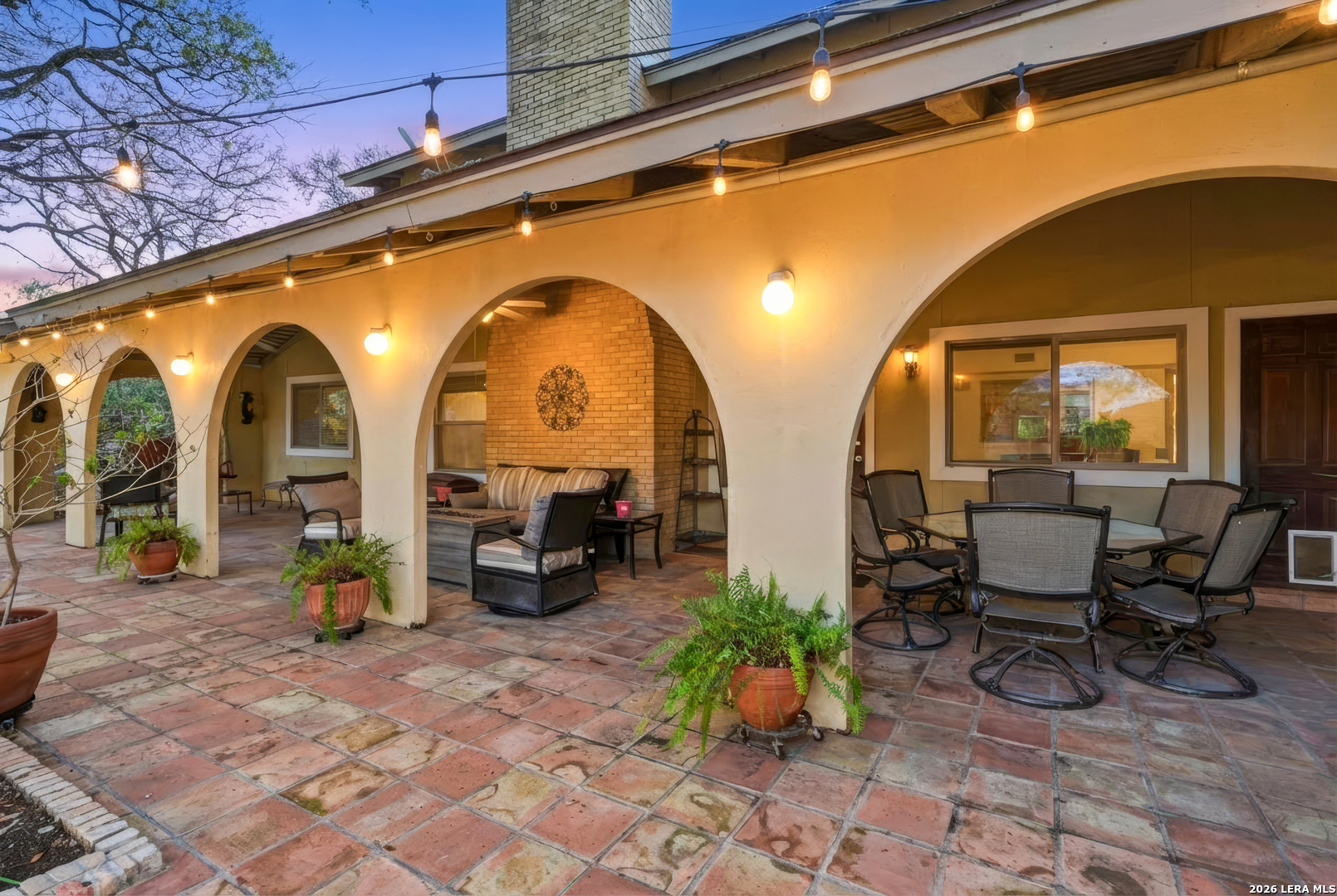 AMAZING OPPORTUNITY to own this Spanish-style retreat with a HACIENDA FLAIR! The grand courtyard entrance is just the beginning... You'll impress your guests with the outdoor living spaces--relaxing DIVING POOL/SPA, multiple seating areas, and the PRIVATE 1100sf PATIO/COURTYARD, complete with antique doors from Mexico! Imagine the parties! Location is UNBEATABLE--so convenient to Med Ctr/USAA/UTSA/Downtown--yet nestled in a quiet, low-traffic neighborhood! Inside you'll find a VIBRANT, ECLECTIC MIX of traditional and modern styles, from the bright family room with REAL HARDWOOD FLOORS to the sleek modern kitchen (completely redone in 2018), to the traditional WOODBURNING FIREPLACE and saltillo tile floors... Large primary bedroom downstairs connects to the office/craftroom/nursery, plus 3 bedrooms and 2 full baths upstairs. BEAUTIFULLY UPDATED KITCHEN includes 38' feet of granite countertops, high-end stainless appliances (refrigerator stays), and TONS OF CABINET SPACE*** 5 burner gas stove and built in microwave/convection oven*** Updates include: New pool pump & filter 2025***New water softener and on-demand water heater in 2024***New garage doors 2025***ALL APPLIANCES can remain, including washer and gas dryer***Utility shed with electric***Huge .4 acre corner lot covered in mature oaks***Full sprinkler system***TONS of storage inside and out***Multiple fruit trees***You'll practically need a map to navigate around the grounds, but YOU'LL LOVE DISCOVERING THE TREASURES FOUND HERE! Homes like this don't come on the market often!!