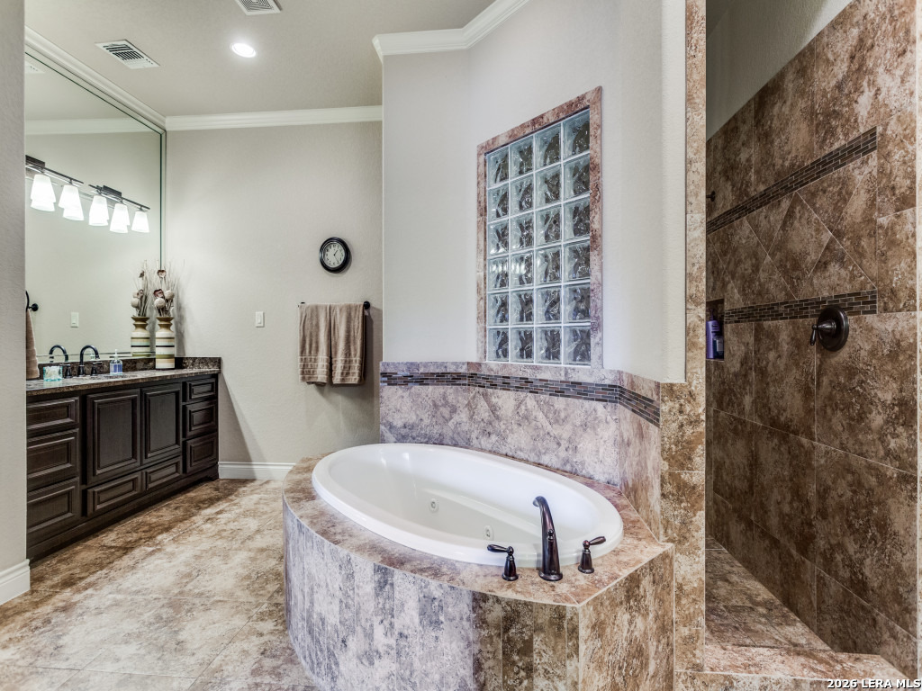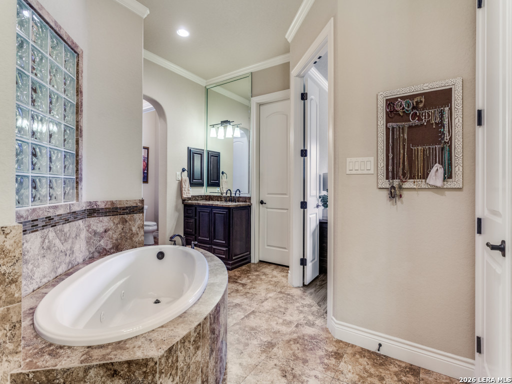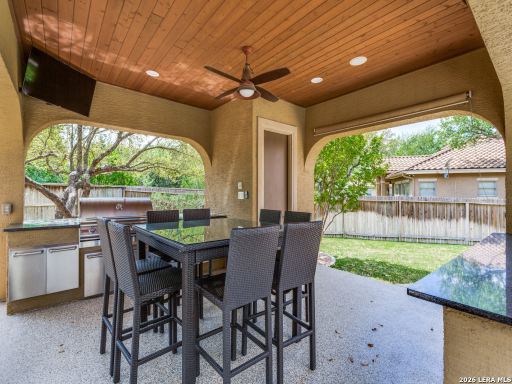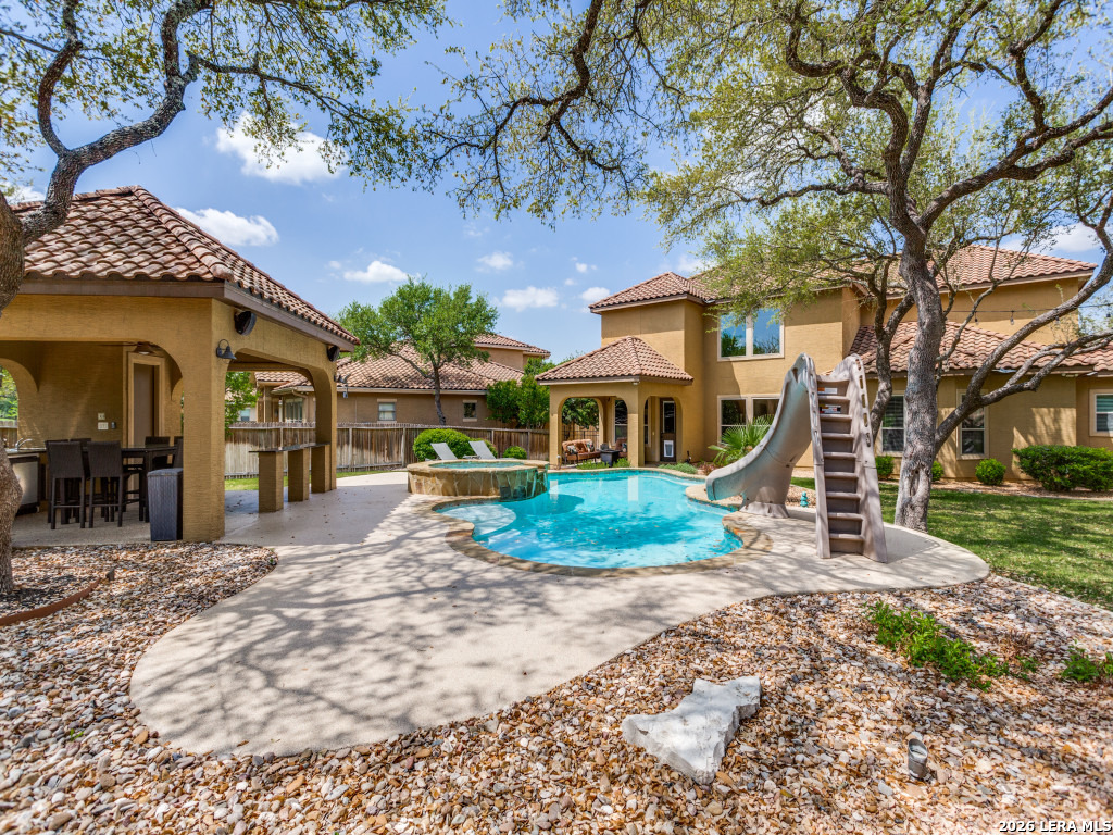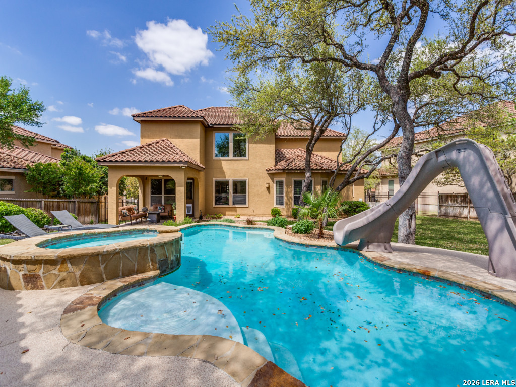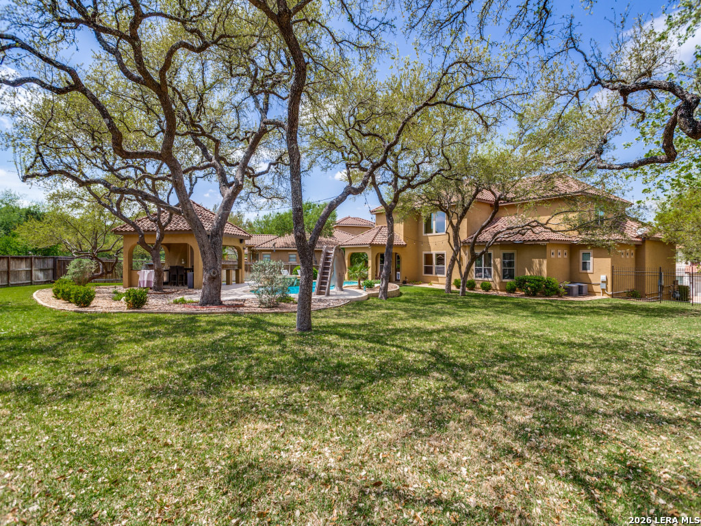 Welcome home to this gorgeous Mediterranean-style gem in the highly sought after community of The Heights of Stone Oak "Estancia" in San Antonio. This generous sized lot features a backyard paradise with pool/spa, outdoor pavilion and kitchen with 1/2 bath, and beautiful and mature trees. A spacious primary suite with sitting area, leads into a beautifully appointed bath. Wonderful open floor plan with Island Kitchen and large living room make this home ideal for entertaining. A Media room to enjoy all of your favorite movies is situated upstairs right off the game room, and the home features three other good sized bedrooms with bedrooms two and three sharing a Jack and Jill bath, and bedroom 4 with it's own bath. Located in the highly acclaimed North East Independent School District, this home is also just minutes away from shopping, dining, and major highways. This home is a must-see!!