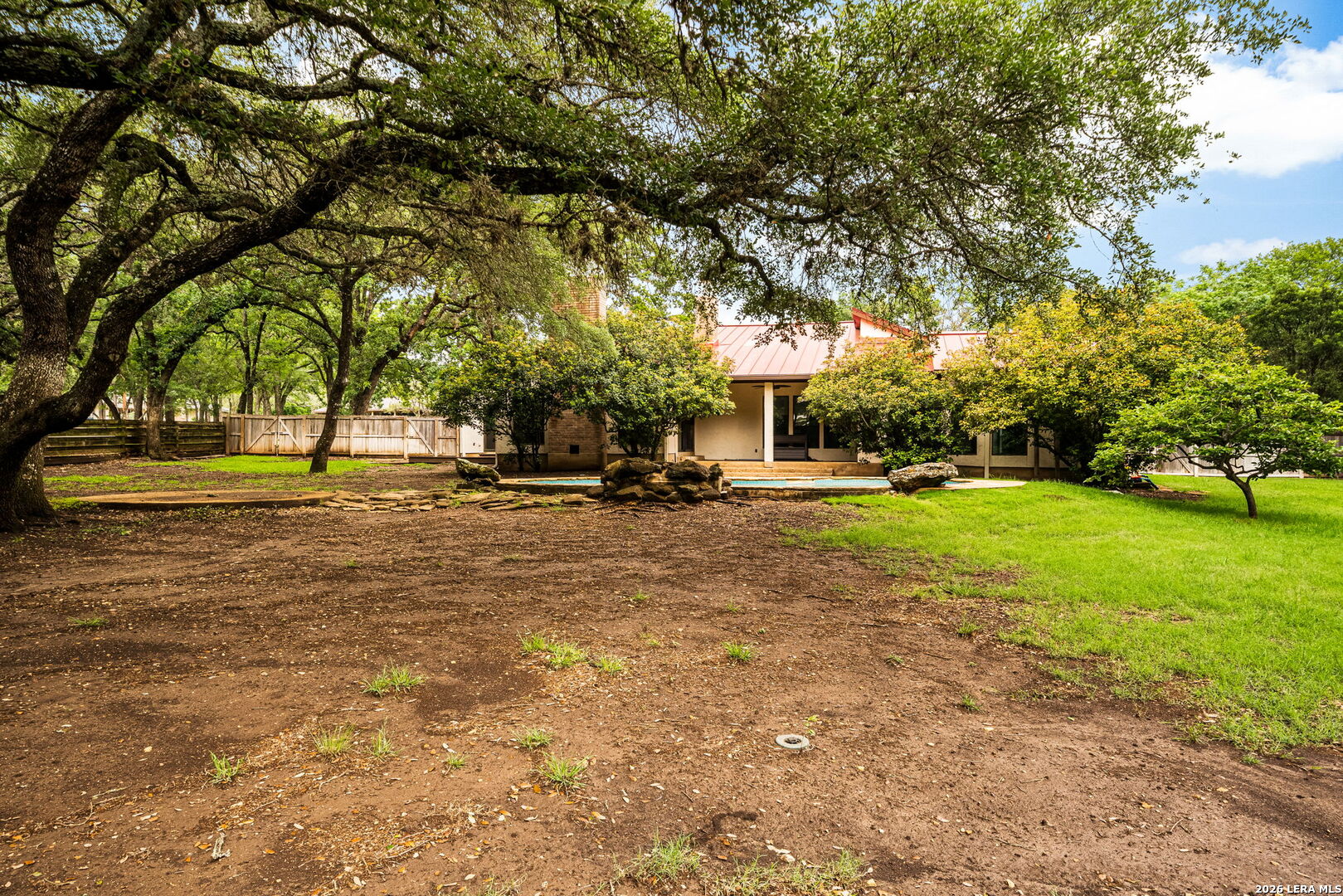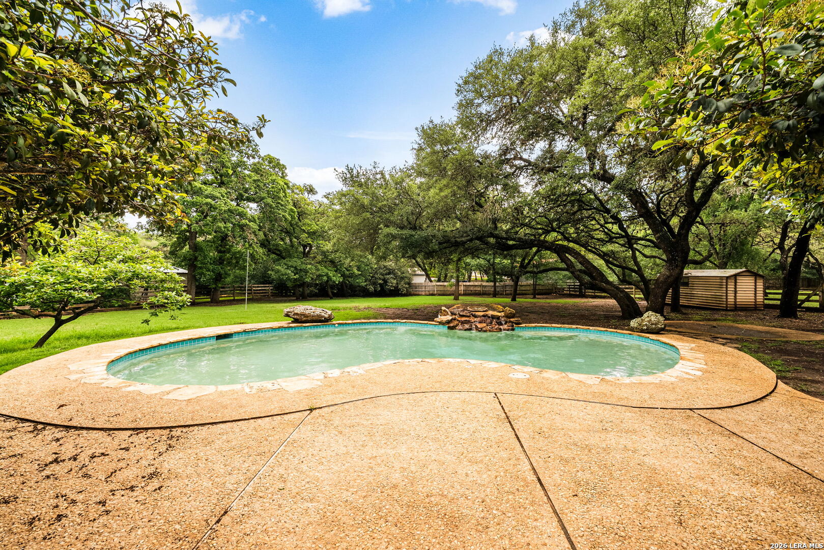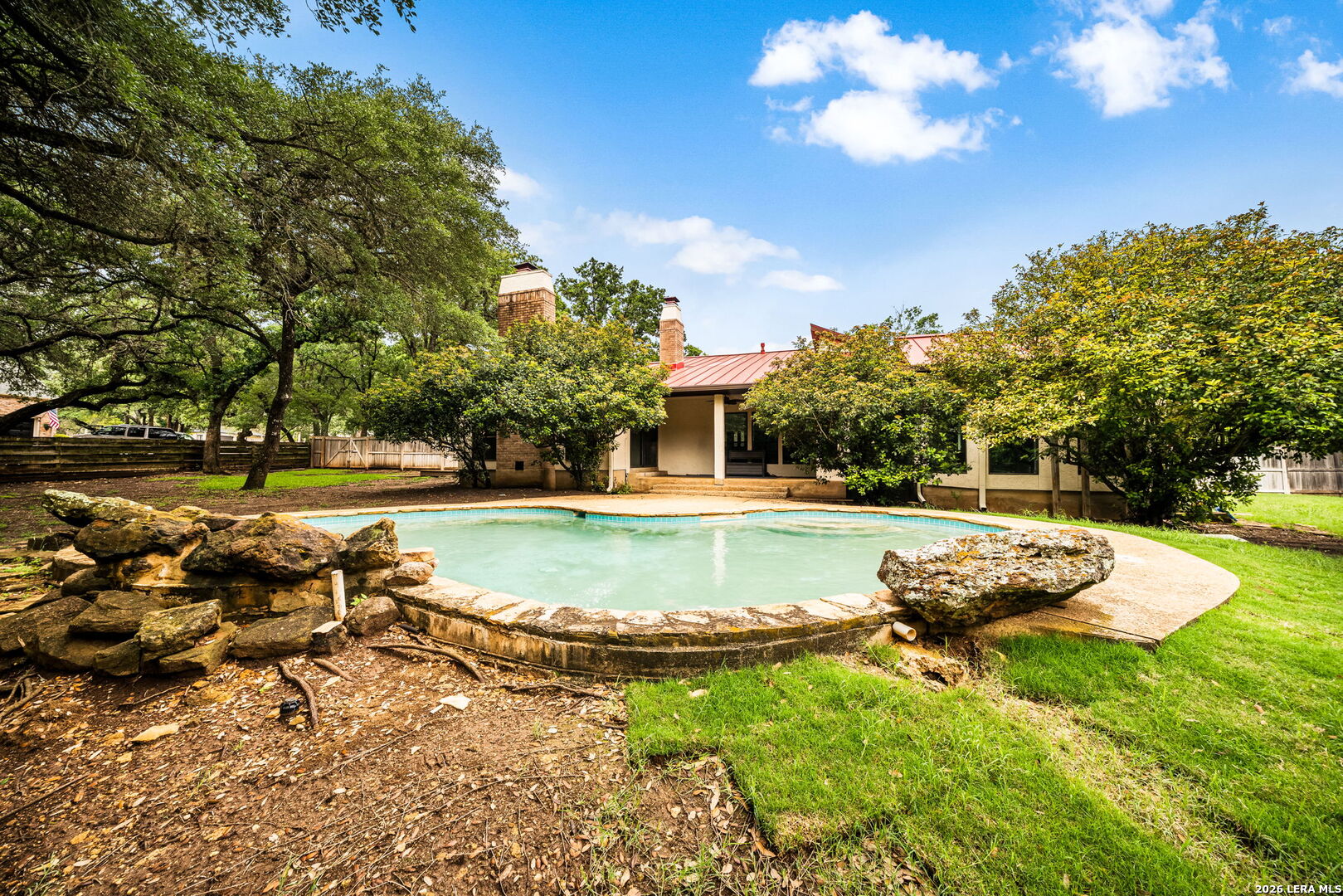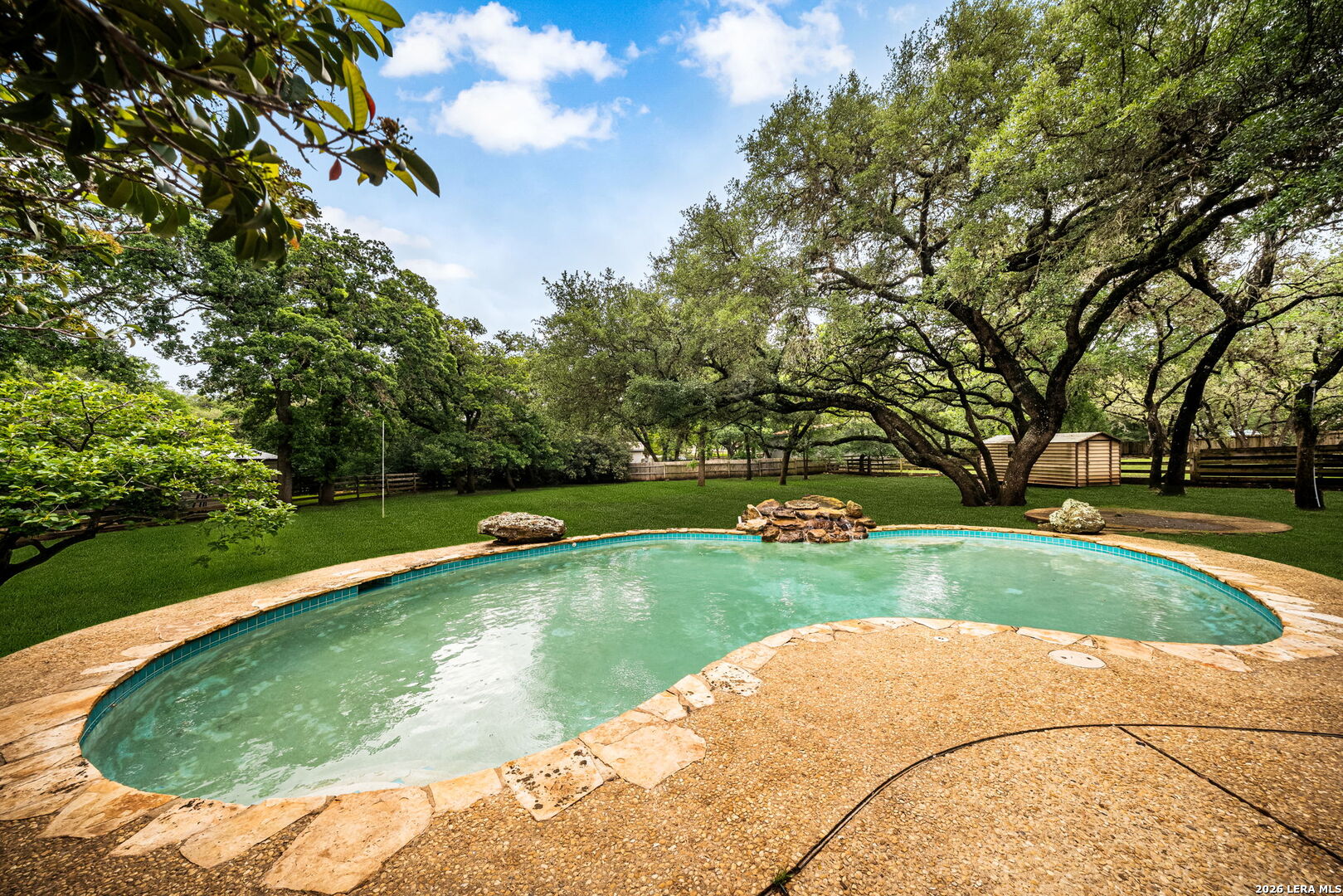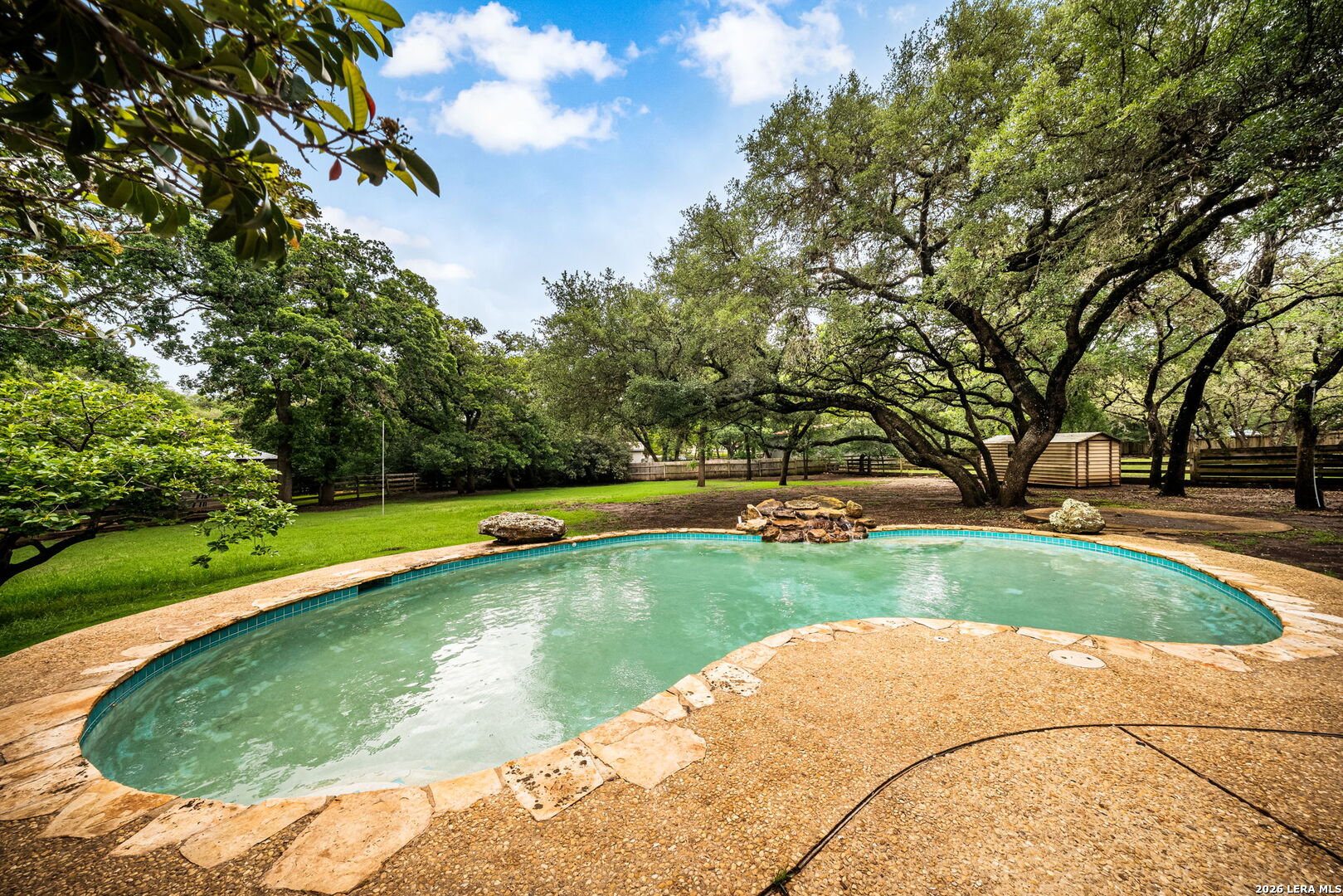 Beautiful single story home on 1 acre in sought after Scenic Oaks. This inviting property features an inground pool surrounded by mature, gorgeous trees, creating a private backyard retreat. Interior offers ceramic tile throughout , a dedicated office, and huge family room with cozy fireplace. Separate living and dining areas provide flexible space for entertaining. The lovely primary suite includes a sitting area and private access to the pool area. High open ceilings, a beautiful metal roof and rambling space make this a great find for anyone looking for privacy, convenience, comfort and outdoor living.