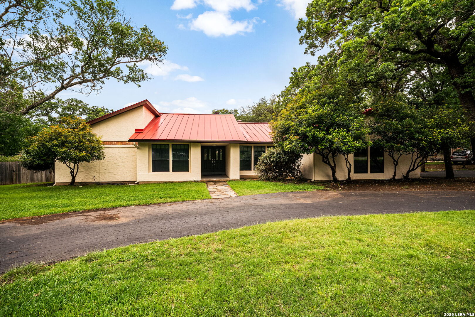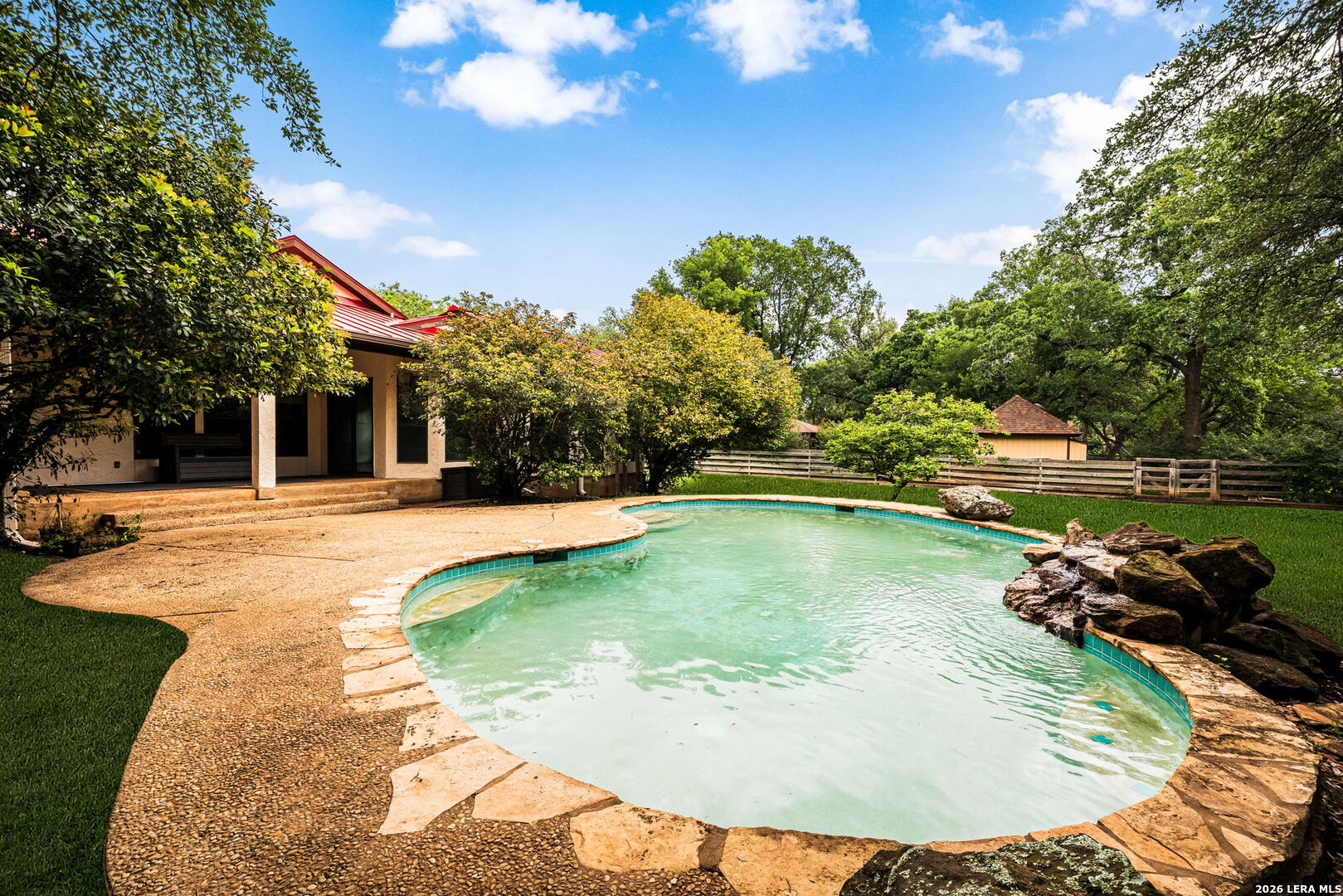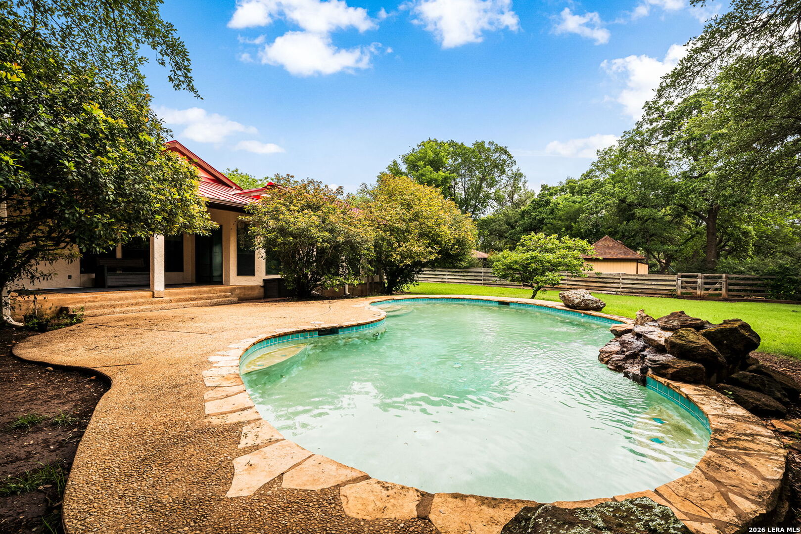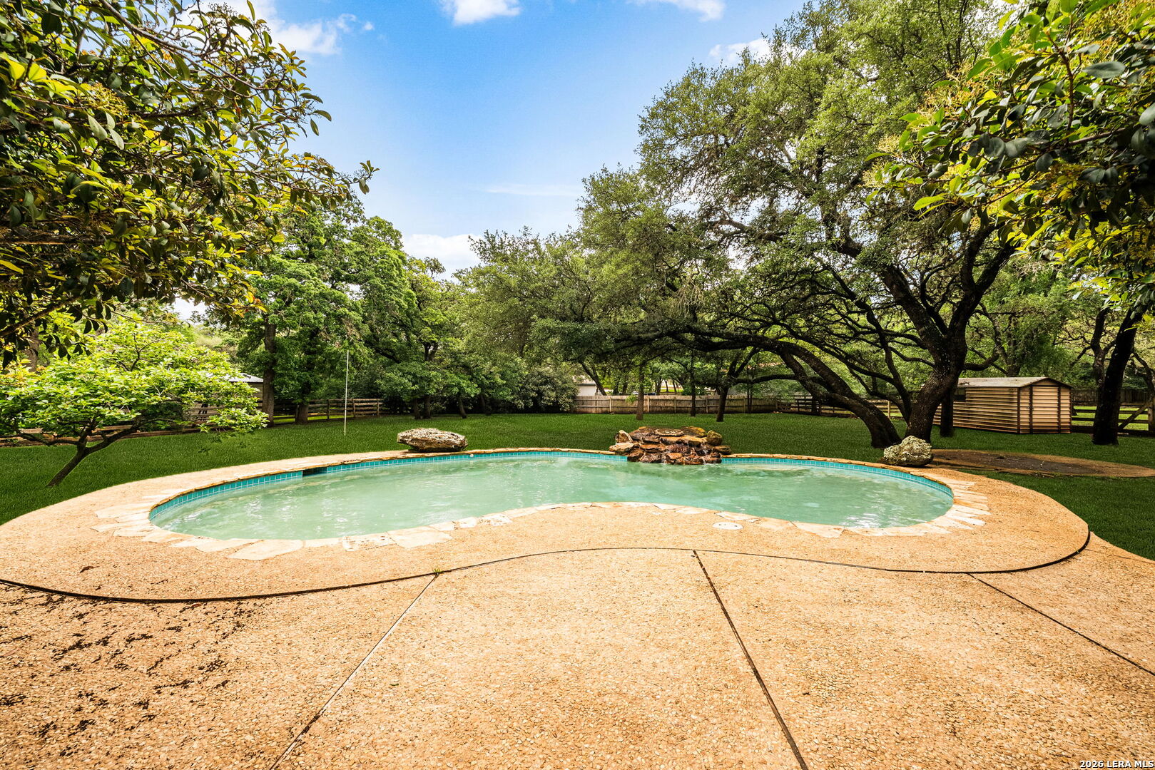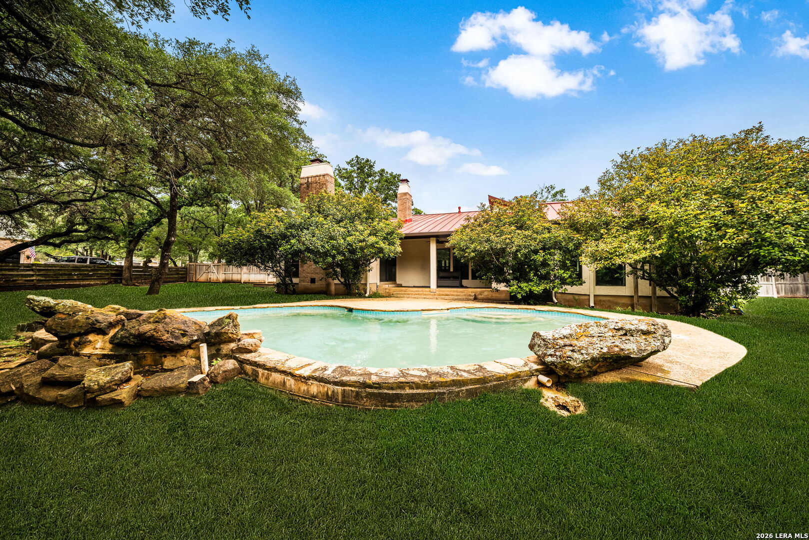 Beautiful single story home on 1 acre in sought after Scenic Oaks. This inviting property features an inground pool surrounded by mature, gorgeous trees, creating a private backyard retreat. Interior offers ceramic tile throughout , a dedicated office, and huge family room with cozy fireplace. Separate living and dining areas provide flexible space for entertaining. The lovely primary suite includes a sitting area and private access to the pool area. High open ceilings, a beautiful metal roof and rambling space make this a great find for anyone looking for privacy, convenience, comfort and outdoor living.