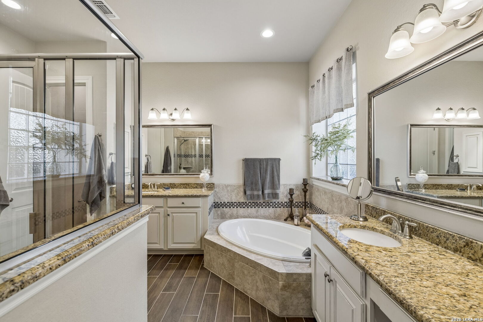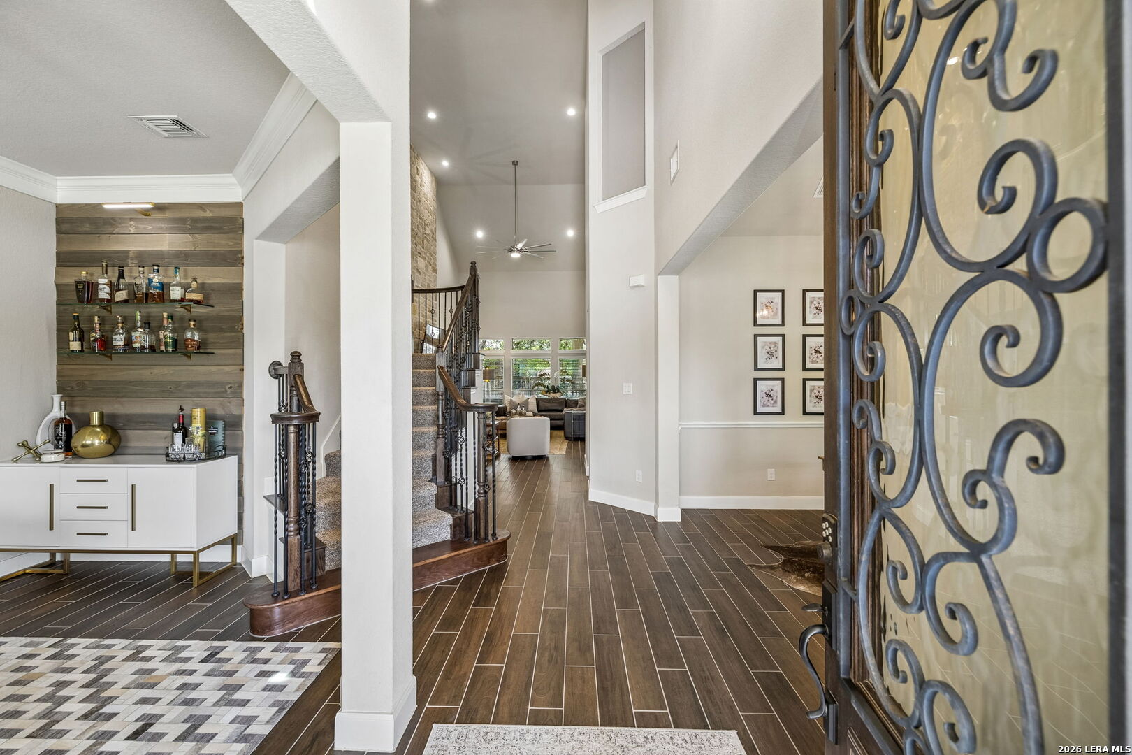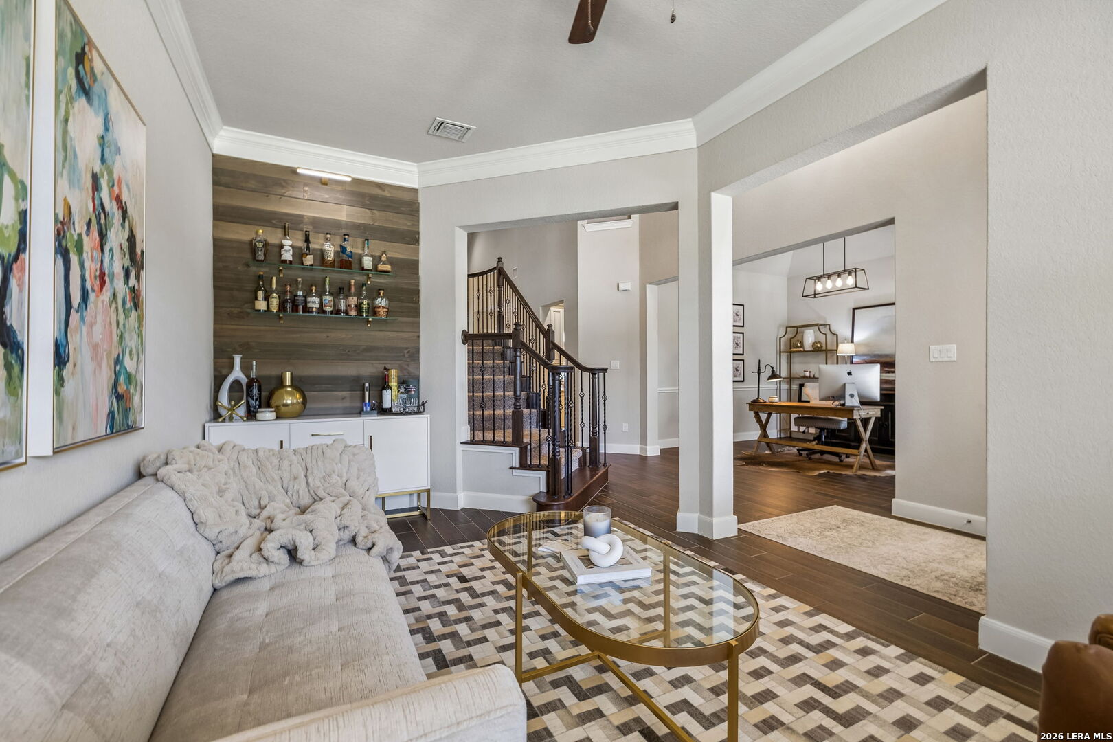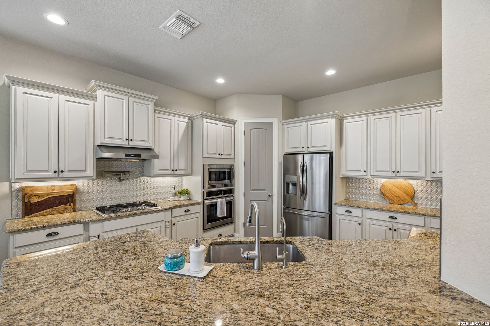 Garage gym setup, community pool and playground amenities, and convenient access to town-this New Braunfels home delivers everyday comfort and flexibility. The open floor plan features soaring ceilings, abundant natural light, and a dramatic floor-to-ceiling stone fireplace anchoring the main living area. The kitchen includes granite countertops, stainless appliances, gas cooktop with pot filler, center island seating, and walk-in pantry. A dedicated office provides workspace flexibility, while the upstairs game room offers additional living space for recreation or relaxation. The primary suite includes a garden tub, separate shower, dual-sink vanity, and walk-in closet. Outdoor features include a covered patio with ceiling fans, private backyard with fire pit, sprinkler system, and full privacy fencing. Additional highlights include a three-car garage and functional layout designed for everyday living.