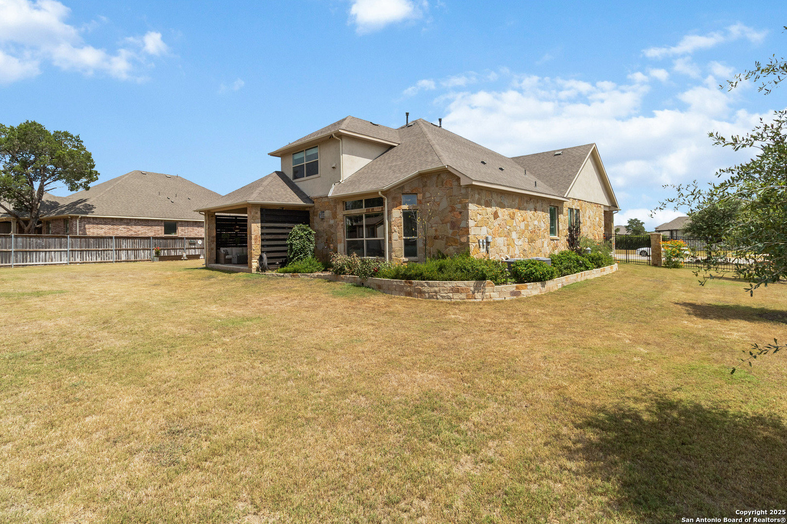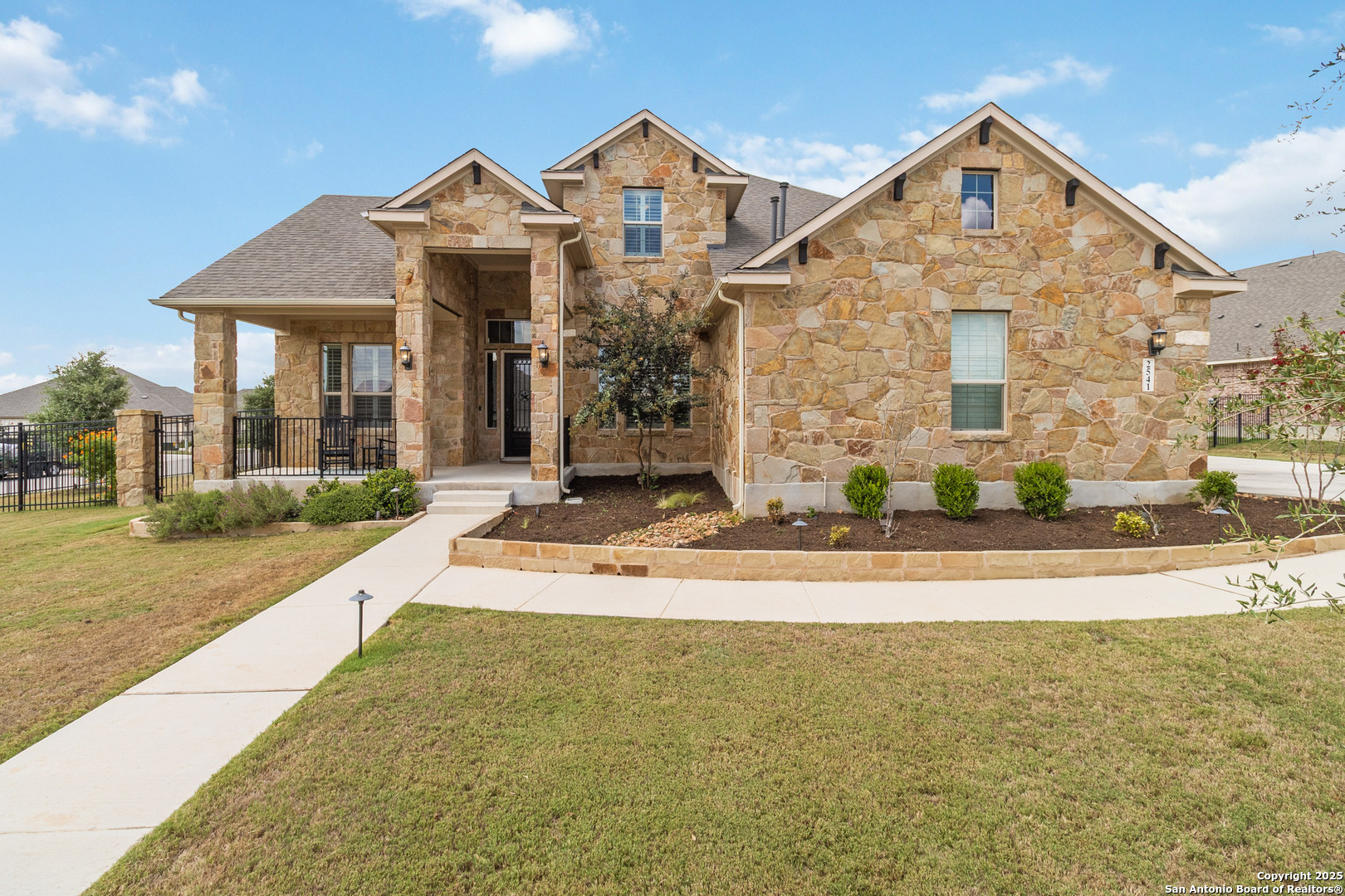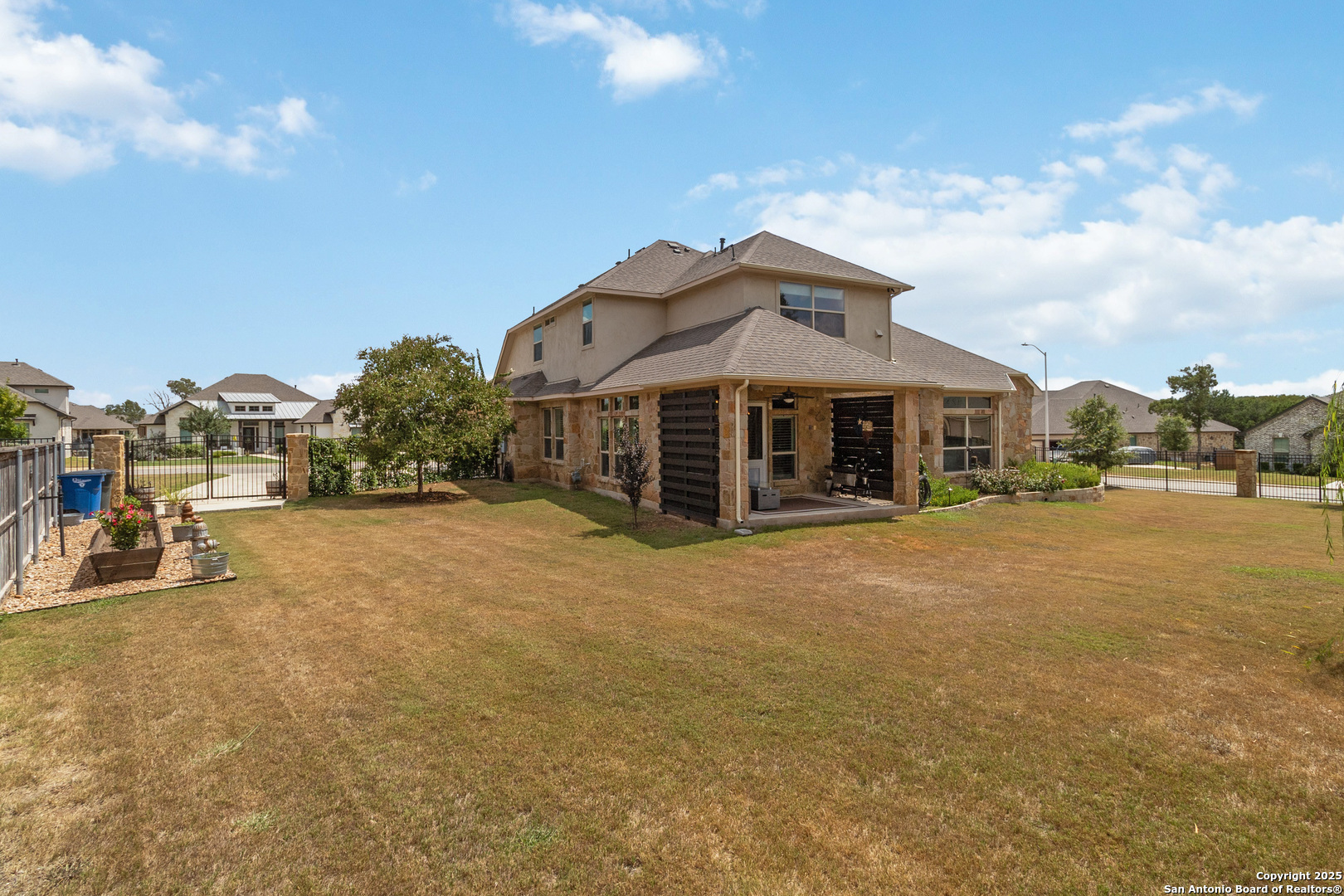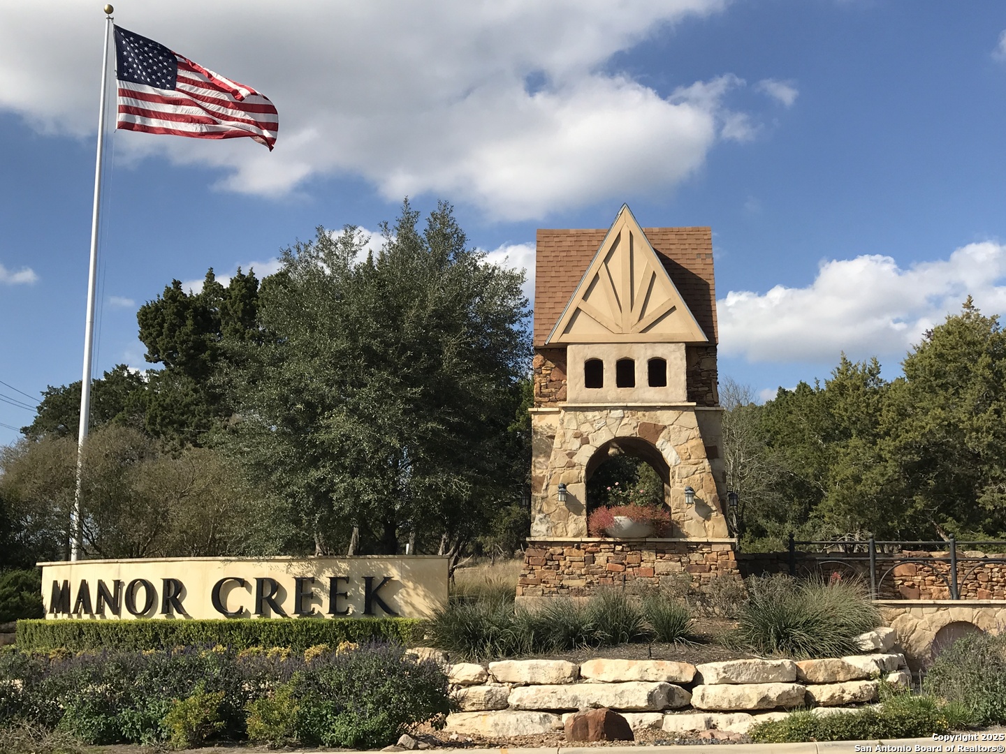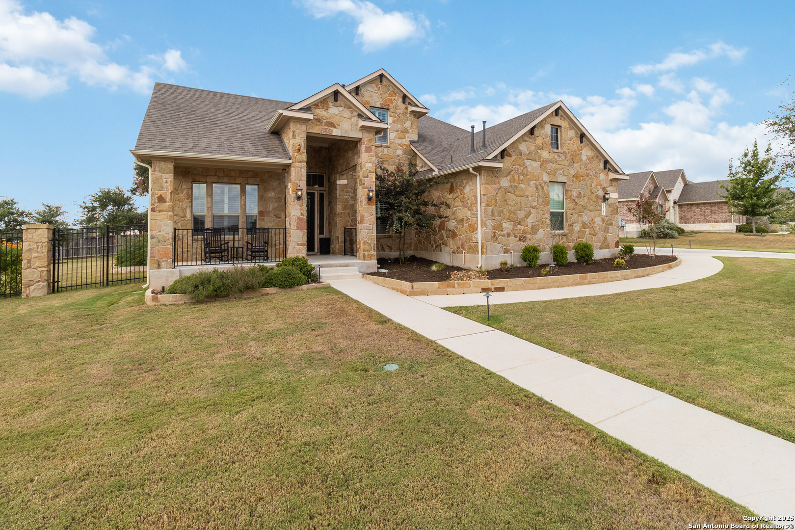Discover the perfect blend of comfort and Hill Country living in this gently lived in 5-bedroom, 4-bathroom home with 3,542 sq. ft., built in 2021 and set on a 0.42-acre corner lot in the sought-after Manor Creek community. Designed for both everyday living and entertaining, the home features engineered hardwood floors throughout, plantation shutters, and art niches that add style and character. Downstairs master bedroom offers a huge space with a spa like bathroom with split vanities, walk-in shower, deep walk-in closet with custom cabinets. The chef's kitchen is a highlight, offering gas cooking, pot filler, granite countertops, a rough cut granite island, and stainless steel appliances, all complemented by a reverse osmosis water system. Flexible spaces include a downstairs mother-in-law suite w/ walk-in shower, private office and a media room, while the 3-car side entry garage with epoxy floors, custom sink corner and a backyard 10x14 Tuff Shed provide excellent storage options. The driveway has also been extended for flexibility. Outdoors, enjoy beautifully landscaped yards with custom stone planters that create a peaceful setting. Beautiful trees compliment the corner lot with wrought iron fencing, stone complements and Malibu Lighting package that lights up the stone exterior at night. The patio has privacy panels, ceiling fan and water/gas outlets for an outdoor kitchen. Manor Creek offers a relaxing lifestyle with an Olympic-size pool, playground, and walking trail, all within a gated community known for its wide lots and Hill Country feel. With a 1.7 tax rate and easy access to New Braunfels shopping, dining, and recreation, this property combines tranquility with convenience. Wonderful granite counters with rough cut granite island, whole house vacuum, sound systems, iQPanel for the connected house, 2 hot water heaters, built-ins for storage, custom cabinets/counter in laundry room, contemporary updated lighting throughout and Builders warranty. The list of upgrades to this home is long and valued at approximately $100k per seller. Just minutes to schools, shopping and restaurants! Just minutes to downtown New Braunfels and 14 minutes to Gruene Historic area. Great location between San Antonio and Austin!