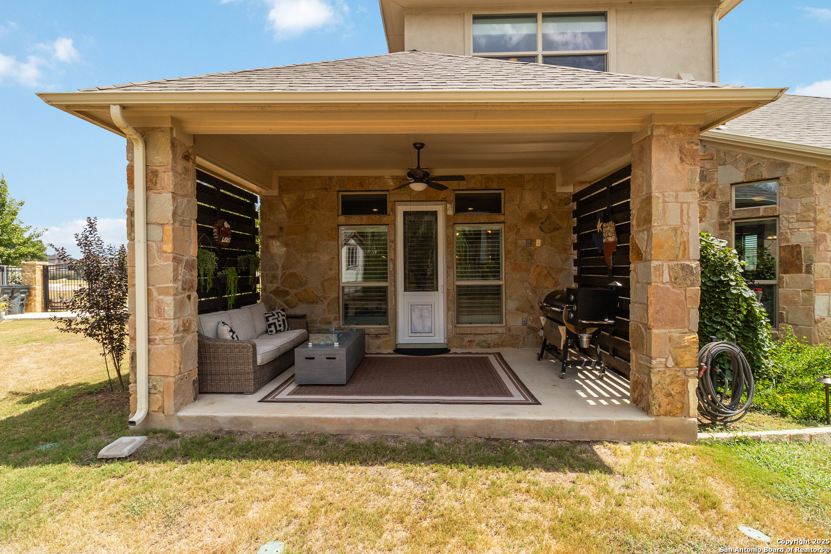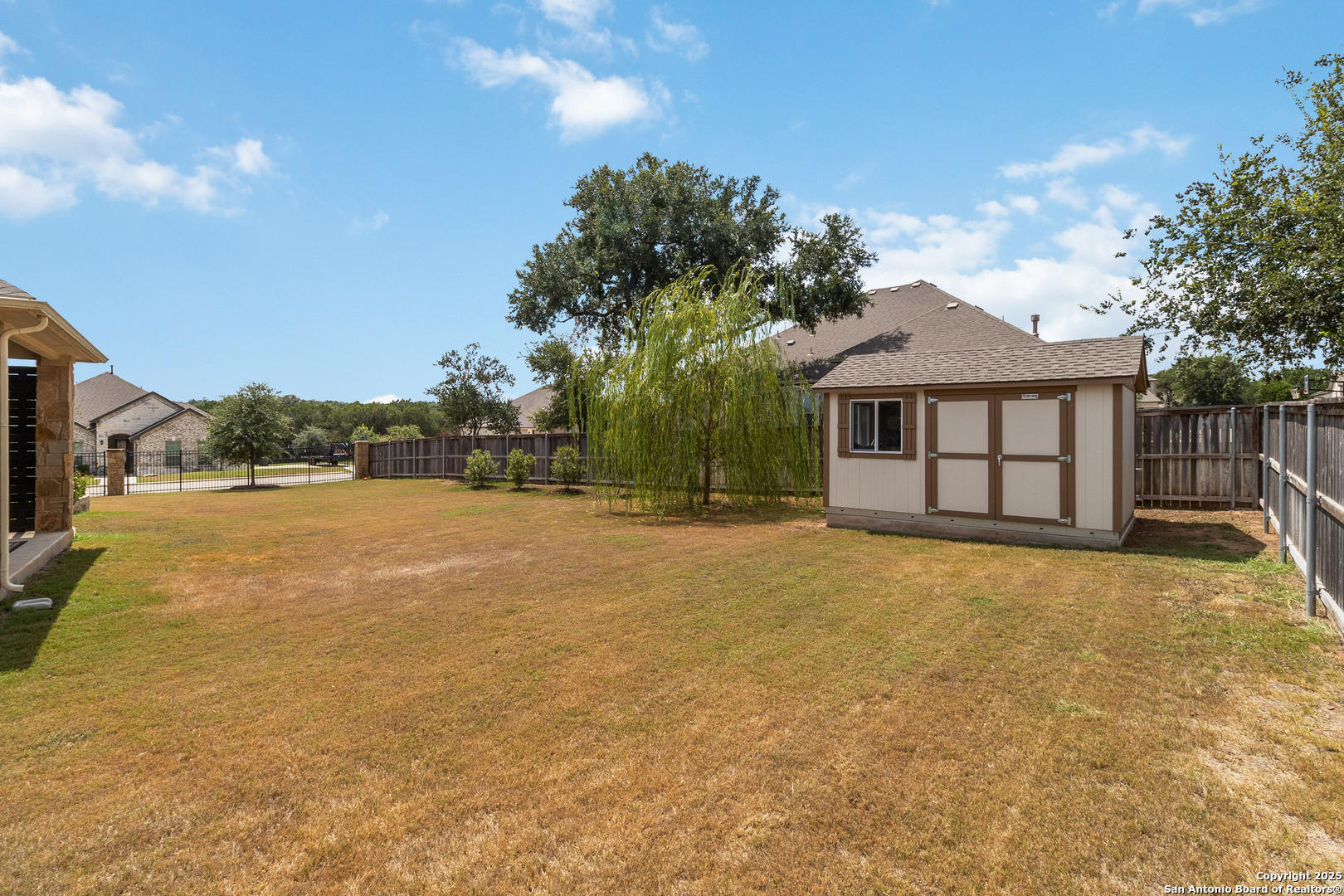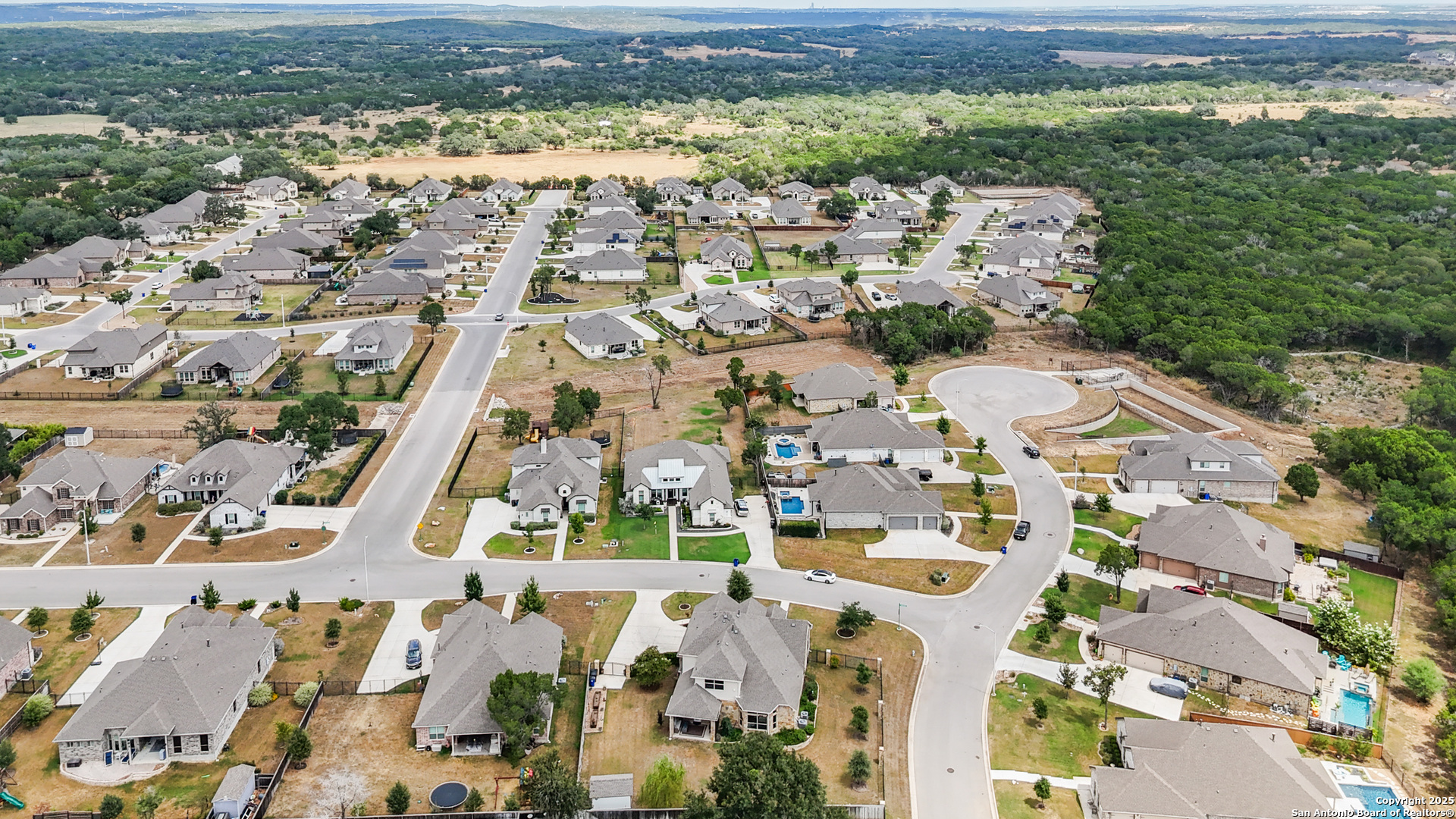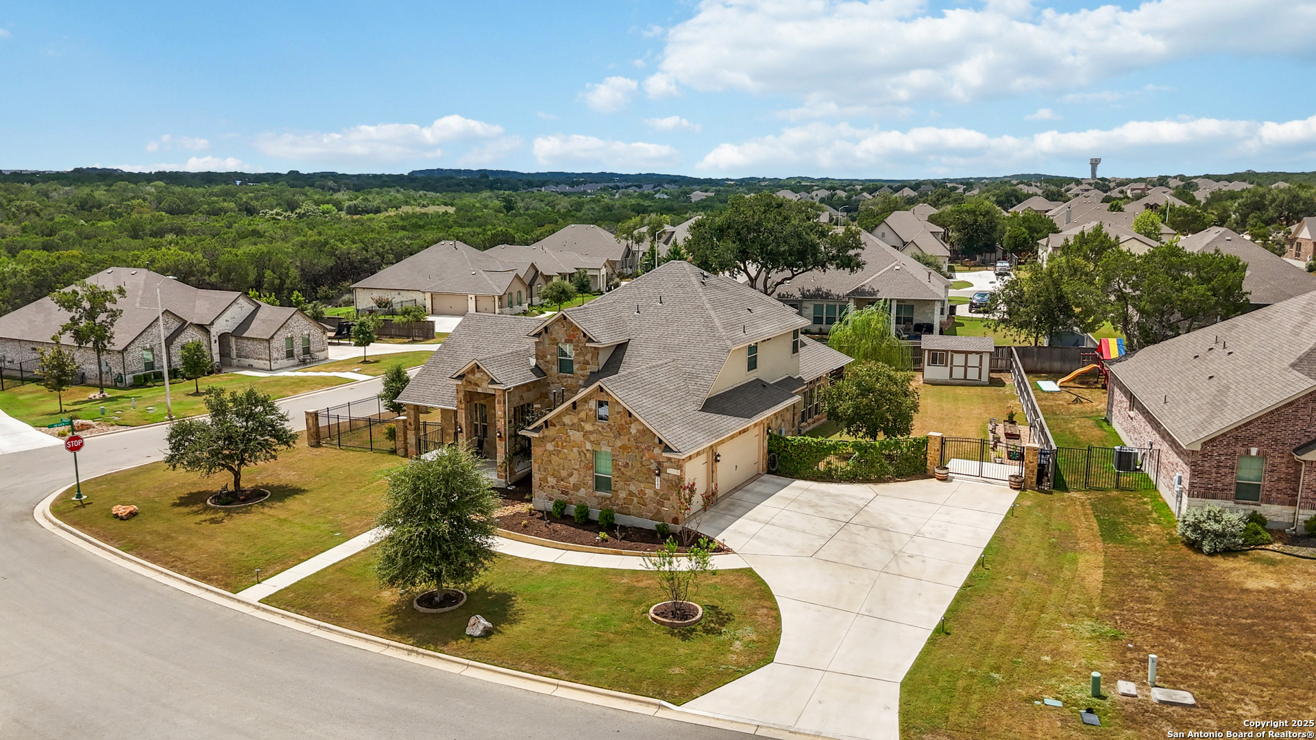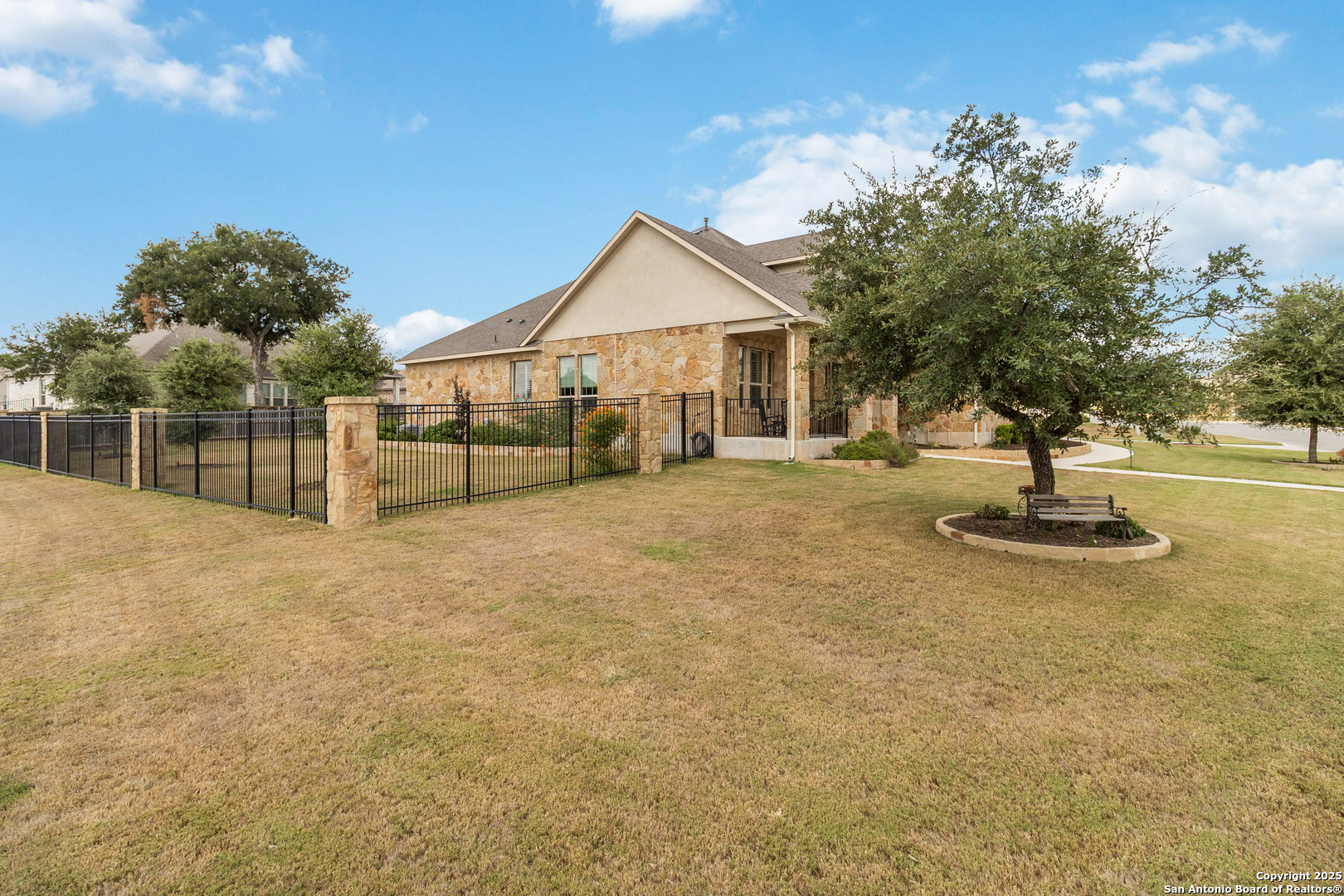Discover the perfect blend of comfort and Hill Country living in this gently lived in 5-bedroom, 4-bathroom home with 3,542 sq. ft., built in 2021 and set on a 0.42-acre corner lot in the sought-after Manor Creek community. Designed for both everyday living and entertaining, the home features engineered hardwood floors throughout, plantation shutters, and art niches that add style and character. Downstairs master bedroom offers a huge space with a spa like bathroom with split vanities, walk-in shower, deep walk-in closet with custom cabinets. The chef's kitchen is a highlight, offering gas cooking, pot filler, granite countertops, a rough cut granite island, and stainless steel appliances, all complemented by a reverse osmosis water system. Flexible spaces include a downstairs mother-in-law suite w/ walk-in shower, private office and a media room, while the 3-car side entry garage with epoxy floors, custom sink corner and a backyard 10x14 Tuff Shed provide excellent storage options. The driveway has also been extended for flexibility. Outdoors, enjoy beautifully landscaped yards with custom stone planters that create a peaceful setting. Beautiful trees compliment the corner lot with wrought iron fencing, stone complements and Malibu Lighting package that lights up the stone exterior at night. The patio has privacy panels, ceiling fan and water/gas outlets for an outdoor kitchen. Manor Creek offers a relaxing lifestyle with an Olympic-size pool, playground, and walking trail, all within a gated community known for its wide lots and Hill Country feel. With a 1.7 tax rate and easy access to New Braunfels shopping, dining, and recreation, this property combines tranquility with convenience. Wonderful granite counters with rough cut granite island, whole house vacuum, sound systems, iQPanel for the connected house, 2 hot water heaters, built-ins for storage, custom cabinets/counter in laundry room, contemporary updated lighting throughout and Builders warranty. The list of upgrades to this home is long and valued at approximately $100k per seller. Just minutes to schools, shopping and restaurants! Just minutes to downtown New Braunfels and 14 minutes to Gruene Historic area. Great location between San Antonio and Austin!