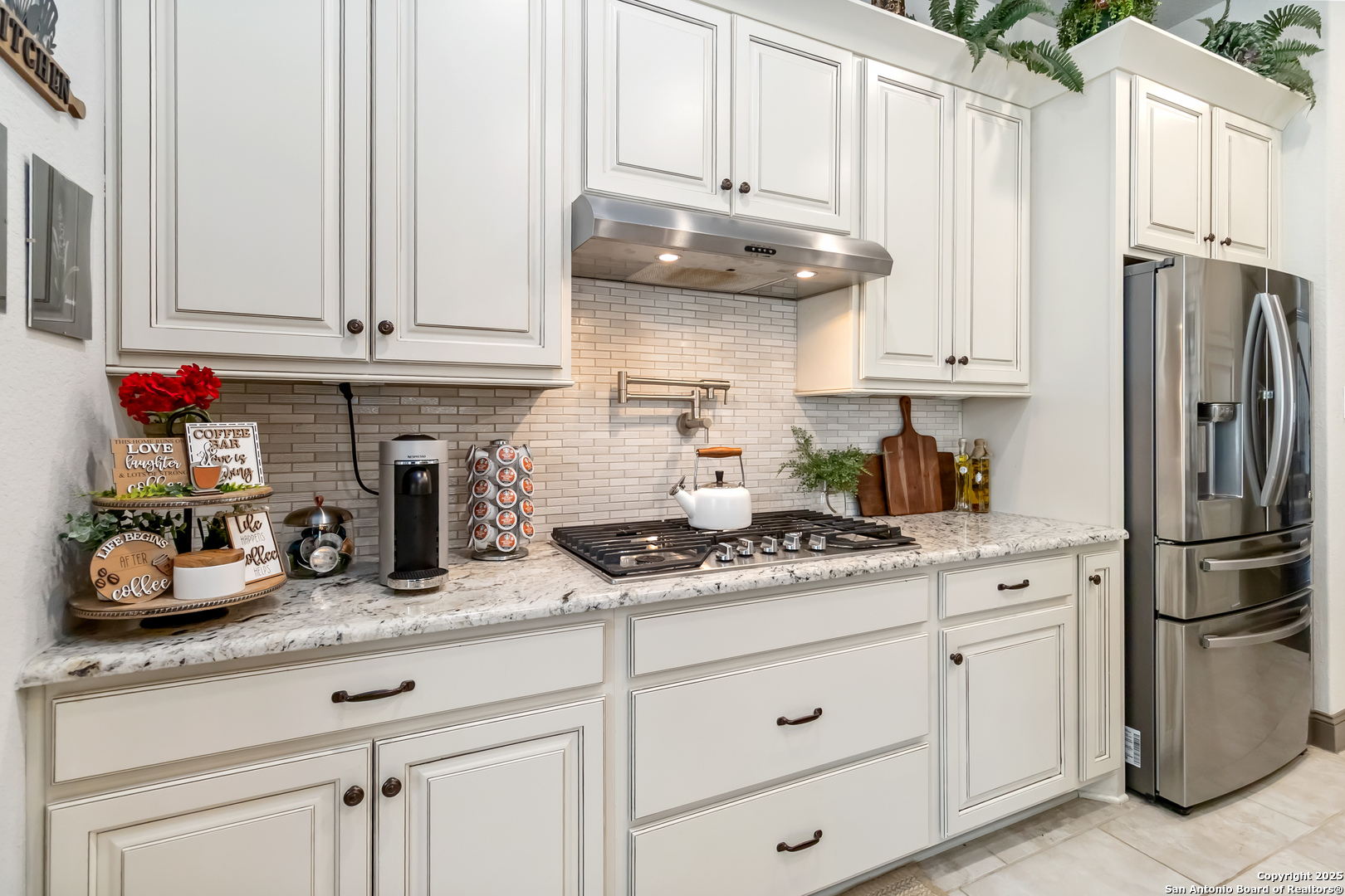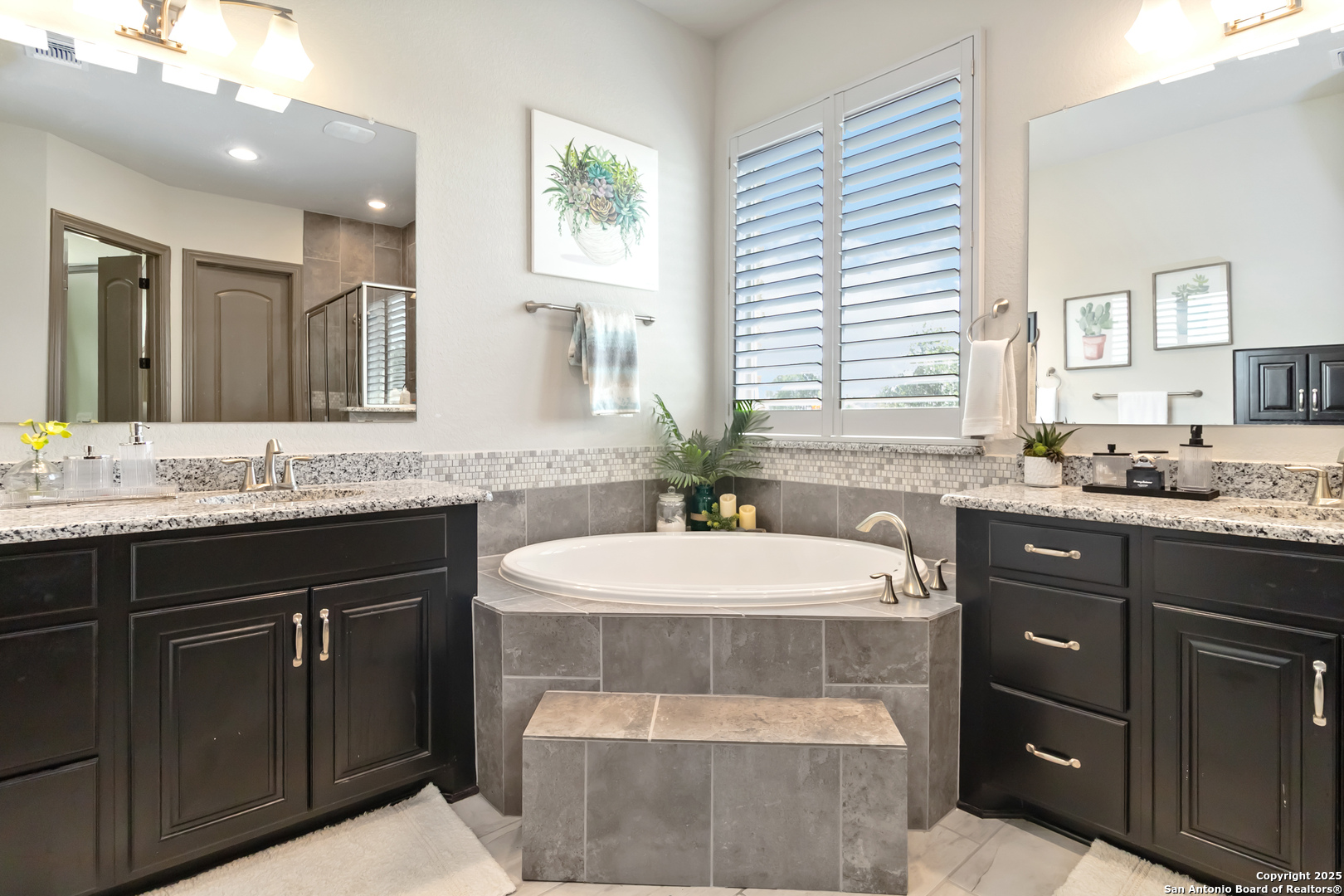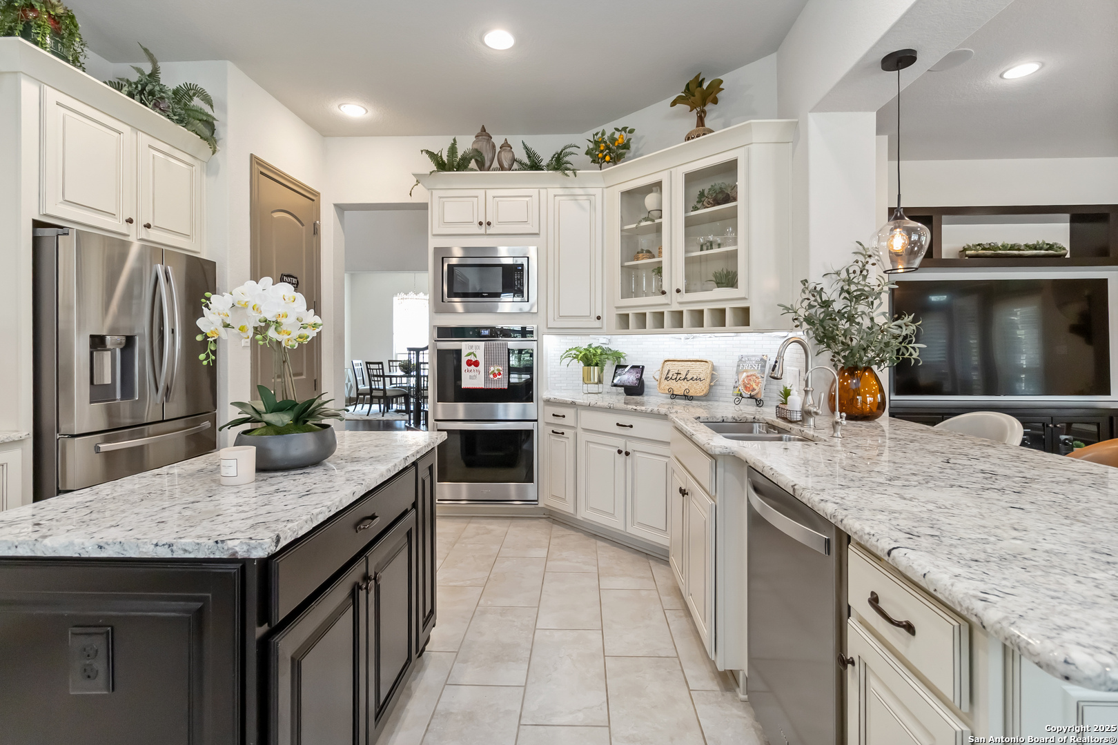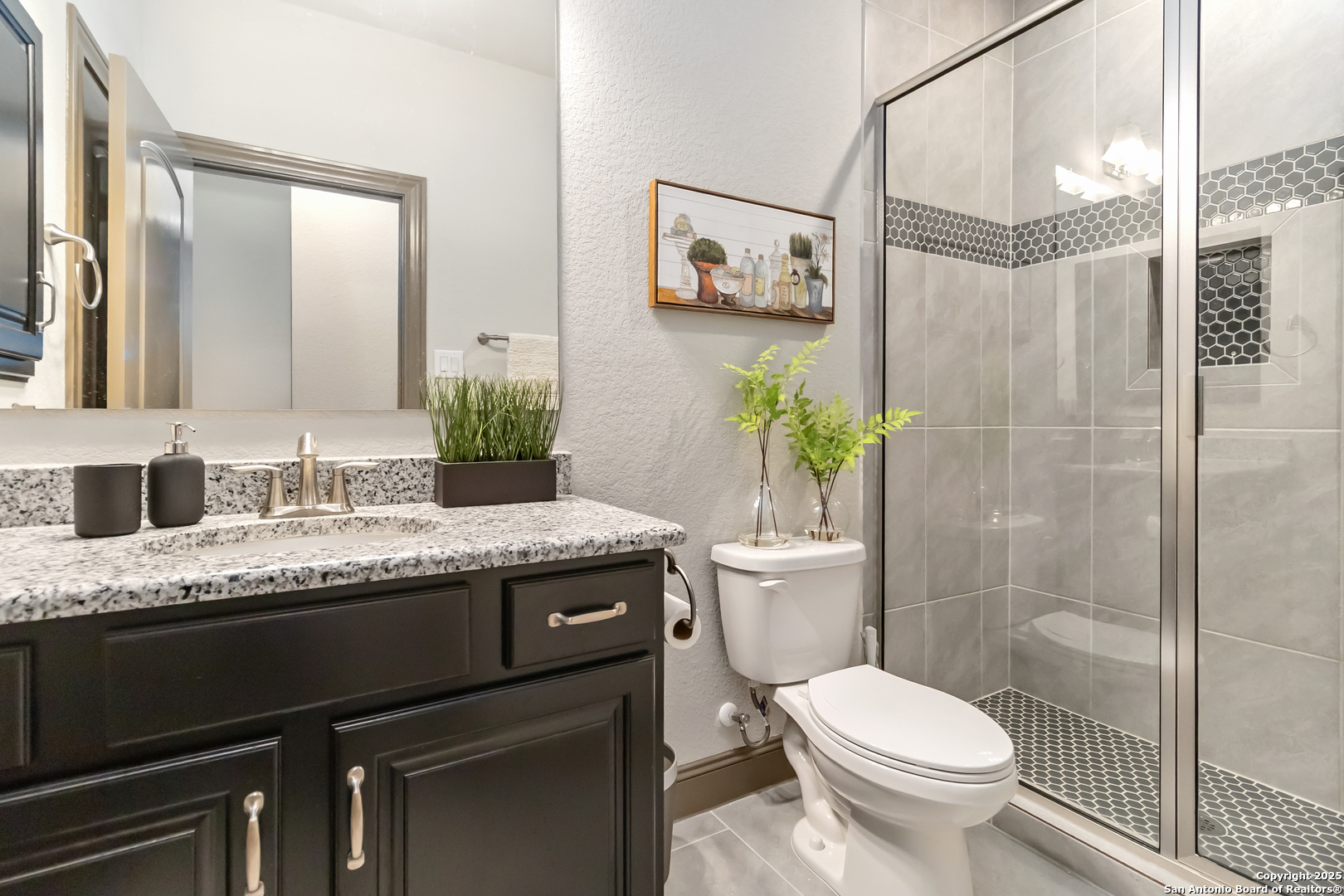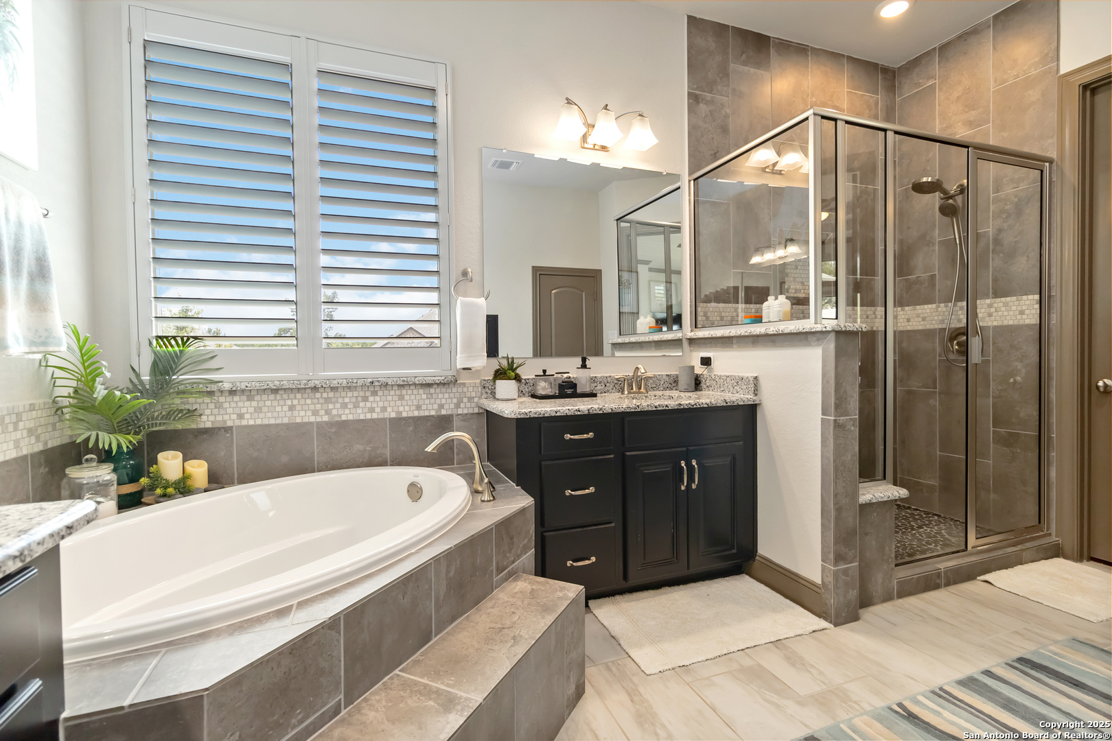 Discover the perfect blend of comfort and Hill Country living in this gently lived in 5-bedroom, 4-bathroom home with 3,542 sq. ft., built in 2021 and set on a 0.42-acre corner lot in the sought-after Manor Creek community. Designed for both everyday living and entertaining, the home features engineered hardwood floors throughout, plantation shutters, and art niches that add style and character. Downstairs master bedroom offers a huge space with a spa like bathroom with split vanities, walk-in shower, deep walk-in closet with custom cabinets. The chef's kitchen is a highlight, offering gas cooking, pot filler, granite countertops, a rough cut granite island, and stainless steel appliances, all complemented by a reverse osmosis water system. Flexible spaces include a downstairs mother-in-law suite w/ walk-in shower, private office and a media room, while the 3-car side entry garage with epoxy floors, custom sink corner and a backyard 10x14 Tuff Shed provide excellent storage options. The driveway has also been extended for flexibility. Outdoors, enjoy beautifully landscaped yards with custom stone planters that create a peaceful setting. Beautiful trees compliment the corner lot with wrought iron fencing, stone complements and Malibu Lighting package that lights up the stone exterior at night. The patio has privacy panels, ceiling fan and water/gas outlets for an outdoor kitchen. Manor Creek offers a relaxing lifestyle with an Olympic-size pool, playground, and walking trail, all within a gated community known for its wide lots and Hill Country feel. With a 1.7 tax rate and easy access to New Braunfels shopping, dining, and recreation, this property combines tranquility with convenience. Wonderful granite counters with rough cut granite island, whole house vacuum, sound systems, iQPanel for the connected house, 2 hot water heaters, built-ins for storage, custom cabinets/counter in laundry room, contemporary updated lighting throughout and Builders warranty. The list of upgrades to this home is long and valued at approximately $100k per seller. Just minutes to schools, shopping and restaurants! Just minutes to downtown New Braunfels and 14 minutes to Gruene Historic area. Great location between San Antonio and Austin!