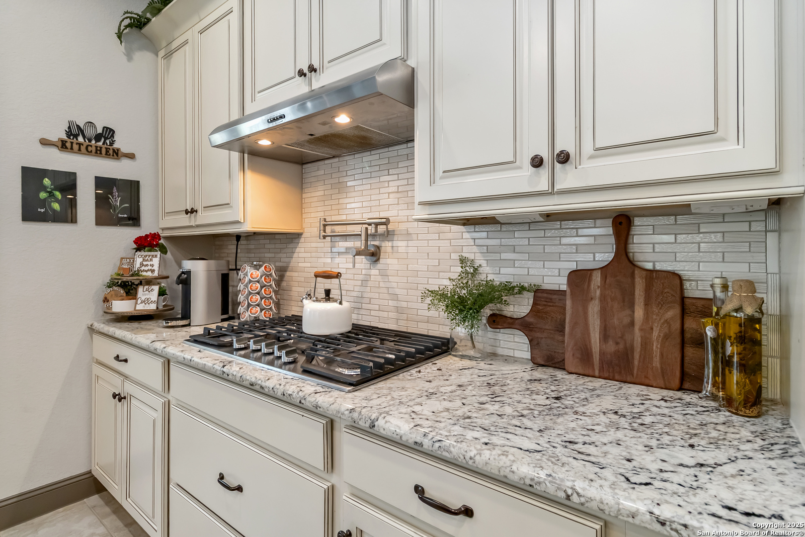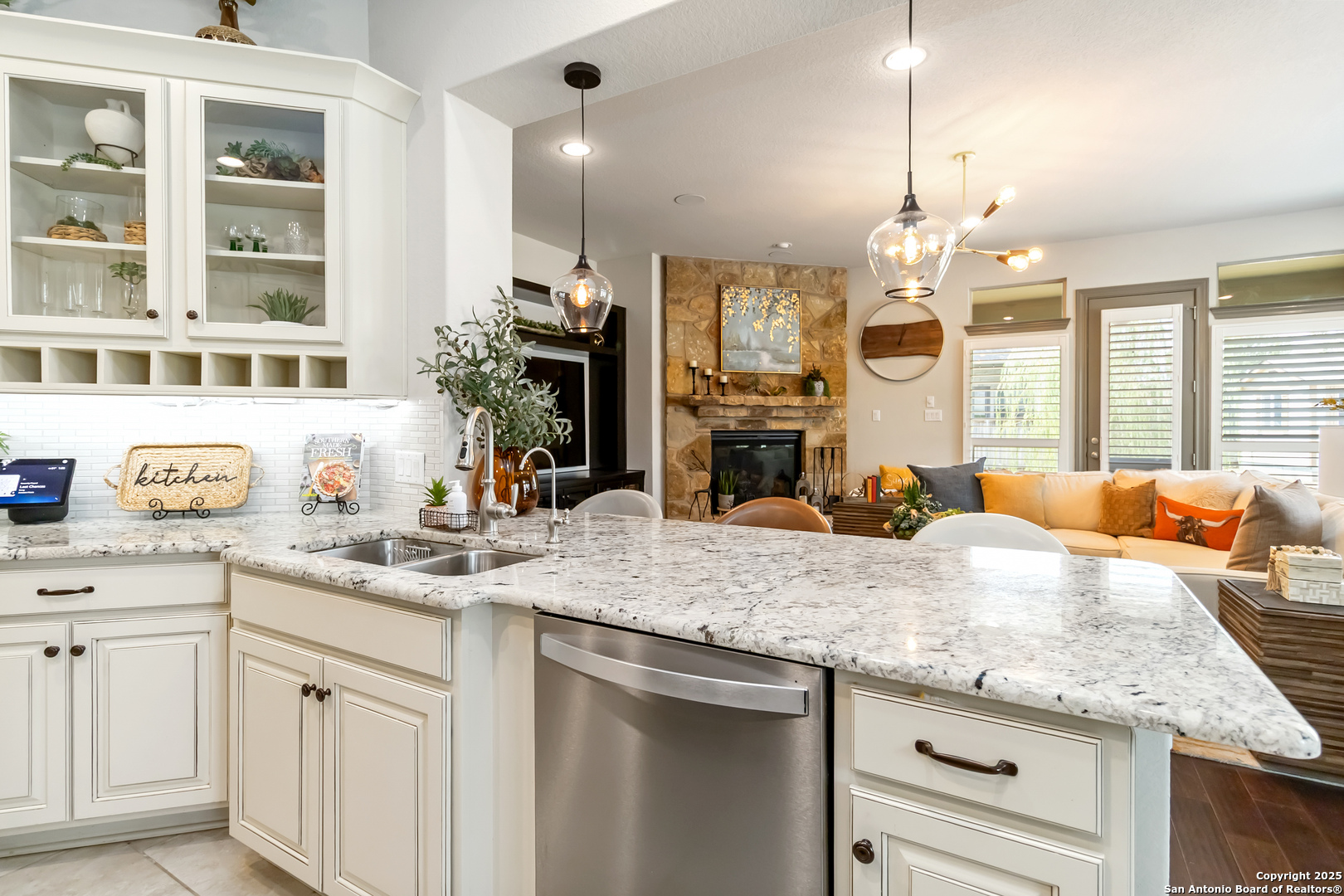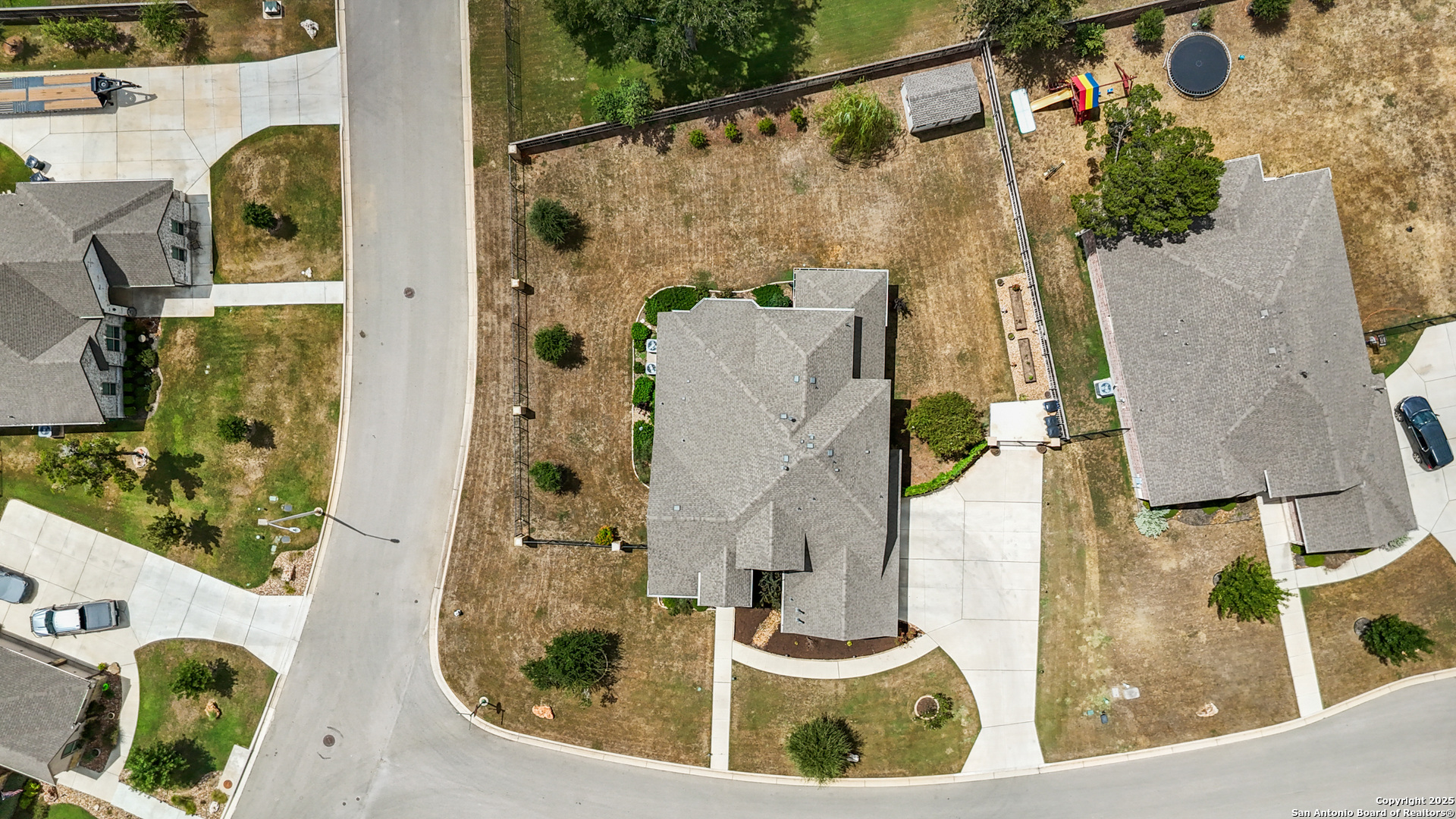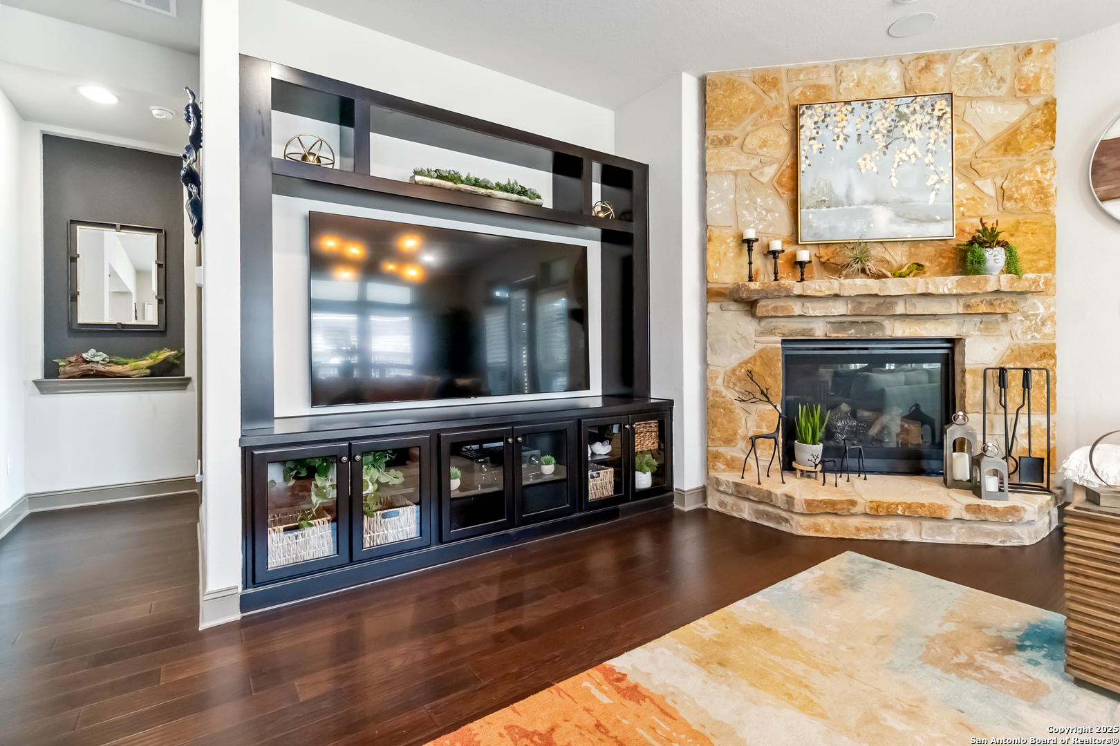 Discover the perfect blend of comfort and Hill Country living in this gently lived in 5-bedroom, 4-bathroom home with 3,542 sq. ft., built in 2021 and set on a 0.42-acre corner lot in the sought-after Manor Creek community. Designed for both everyday living and entertaining, the home features engineered hardwood floors throughout, plantation shutters, and art niches that add style and character. Downstairs master bedroom offers a huge space with a spa like bathroom with split vanities, walk-in shower, deep walk-in closet with custom cabinets. The chef's kitchen is a highlight, offering gas cooking, pot filler, granite countertops, a rough cut granite island, and stainless steel appliances, all complemented by a reverse osmosis water system. Flexible spaces include a downstairs mother-in-law suite w/ walk-in shower, private office and a media room, while the 3-car side entry garage with epoxy floors, custom sink corner and a backyard 10x14 Tuff Shed provide excellent storage options. The driveway has also been extended for flexibility. Outdoors, enjoy beautifully landscaped yards with custom stone planters that create a peaceful setting. Beautiful trees compliment the corner lot with wrought iron fencing, stone complements and Malibu Lighting package that lights up the stone exterior at night. The patio has privacy panels, ceiling fan and water/gas outlets for an outdoor kitchen. Manor Creek offers a relaxing lifestyle with an Olympic-size pool, playground, and walking trail, all within a gated community known for its wide lots and Hill Country feel. With a 1.7 tax rate and easy access to New Braunfels shopping, dining, and recreation, this property combines tranquility with convenience. Wonderful granite counters with rough cut granite island, whole house vacuum, sound systems, iQPanel for the connected house, 2 hot water heaters, built-ins for storage, custom cabinets/counter in laundry room, contemporary updated lighting throughout and Builders warranty. The list of upgrades to this home is long and valued at approximately $100k per seller. Just minutes to schools, shopping and restaurants! Just minutes to downtown New Braunfels and 14 minutes to Gruene Historic area. Great location between San Antonio and Austin!