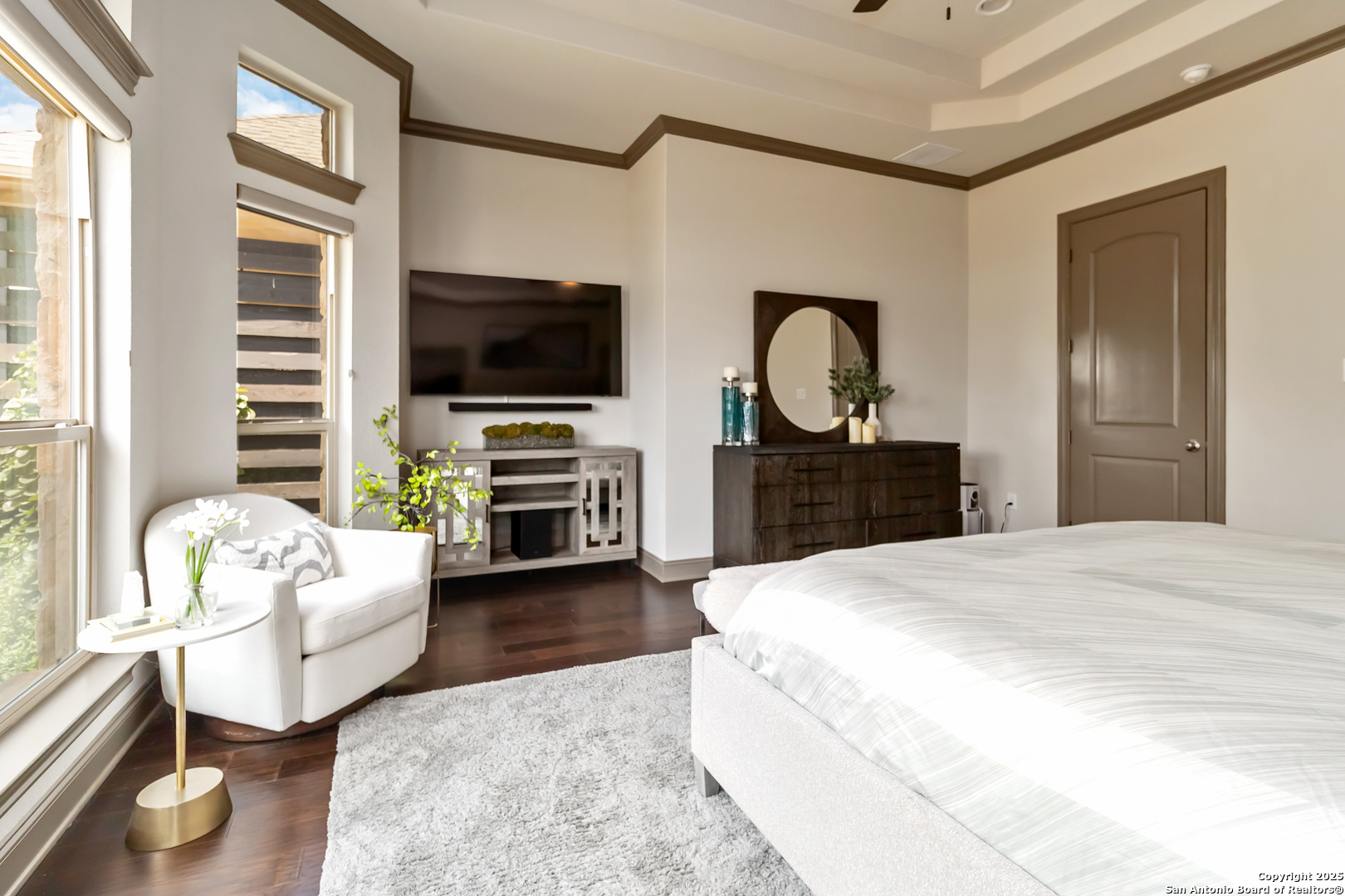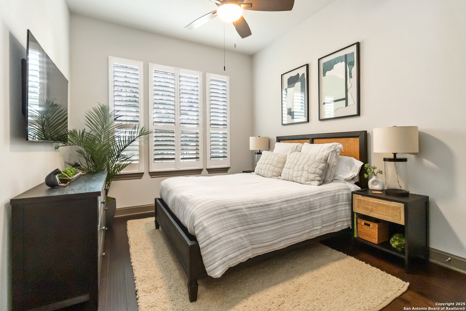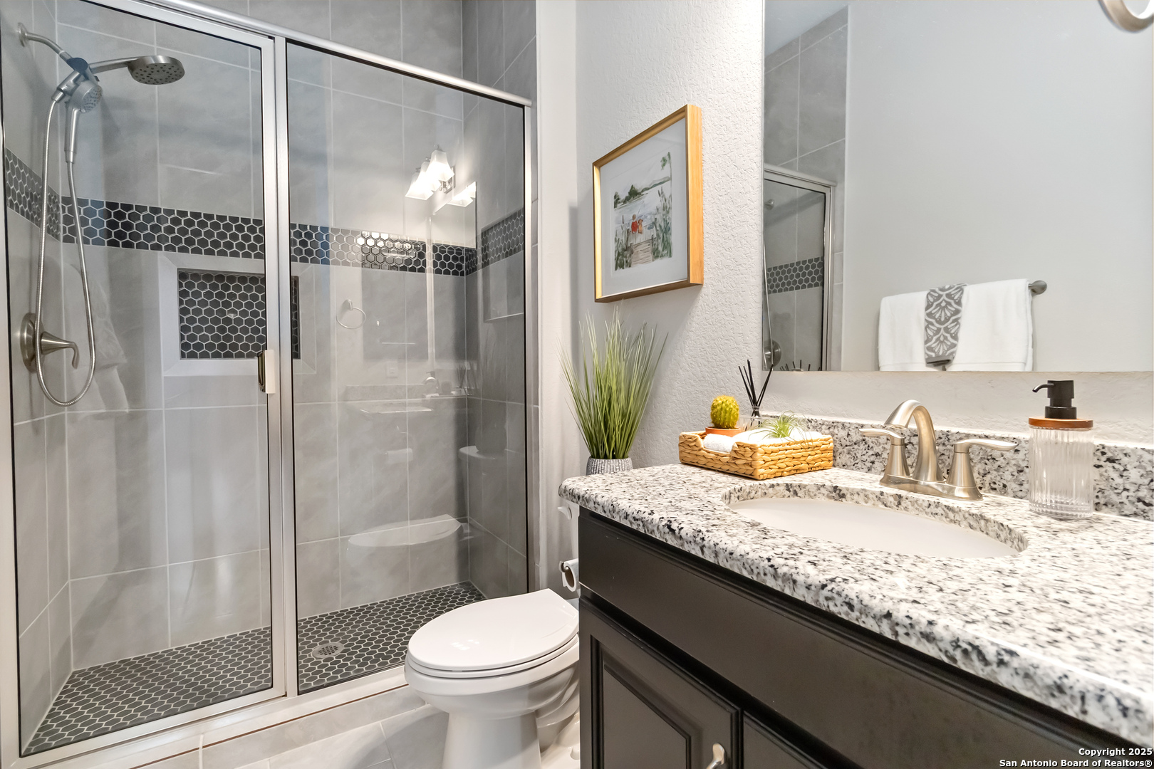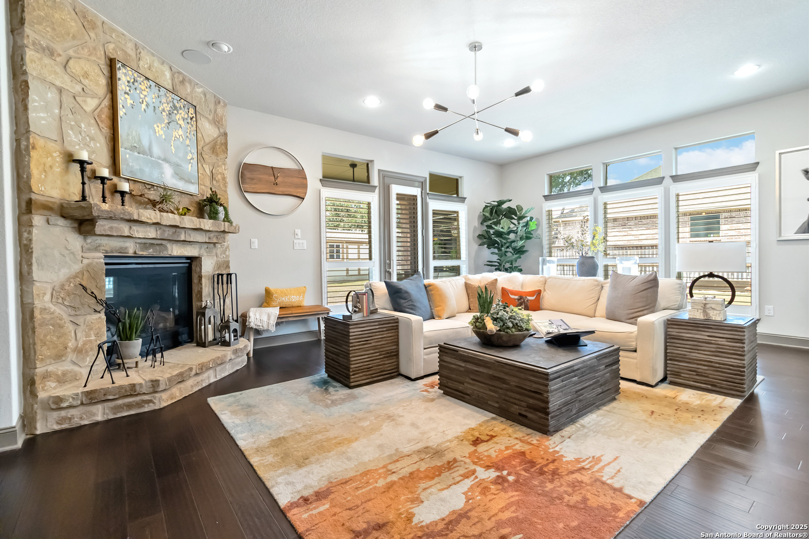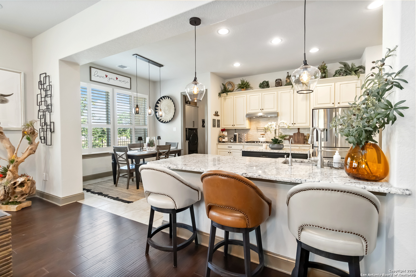 Discover the perfect blend of comfort and Hill Country living in this gently lived in 5-bedroom, 4-bathroom home with 3,542 sq. ft., built in 2021 and set on a 0.42-acre corner lot in the sought-after Manor Creek community. Designed for both everyday living and entertaining, the home features engineered hardwood floors throughout, plantation shutters, and art niches that add style and character. Downstairs master bedroom offers a huge space with a spa like bathroom with split vanities, walk-in shower, deep walk-in closet with custom cabinets. The chef's kitchen is a highlight, offering gas cooking, pot filler, granite countertops, a rough cut granite island, and stainless steel appliances, all complemented by a reverse osmosis water system. Flexible spaces include a downstairs mother-in-law suite w/ walk-in shower, private office and a media room, while the 3-car side entry garage with epoxy floors, custom sink corner and a backyard 10x14 Tuff Shed provide excellent storage options. The driveway has also been extended for flexibility. Outdoors, enjoy beautifully landscaped yards with custom stone planters that create a peaceful setting. Beautiful trees compliment the corner lot with wrought iron fencing, stone complements and Malibu Lighting package that lights up the stone exterior at night. The patio has privacy panels, ceiling fan and water/gas outlets for an outdoor kitchen. Manor Creek offers a relaxing lifestyle with an Olympic-size pool, playground, and walking trail, all within a gated community known for its wide lots and Hill Country feel. With a 1.7 tax rate and easy access to New Braunfels shopping, dining, and recreation, this property combines tranquility with convenience. Wonderful granite counters with rough cut granite island, whole house vacuum, sound systems, iQPanel for the connected house, 2 hot water heaters, built-ins for storage, custom cabinets/counter in laundry room, contemporary updated lighting throughout and Builders warranty. The list of upgrades to this home is long and valued at approximately $100k per seller. Just minutes to schools, shopping and restaurants! Just minutes to downtown New Braunfels and 14 minutes to Gruene Historic area. Great location between San Antonio and Austin!