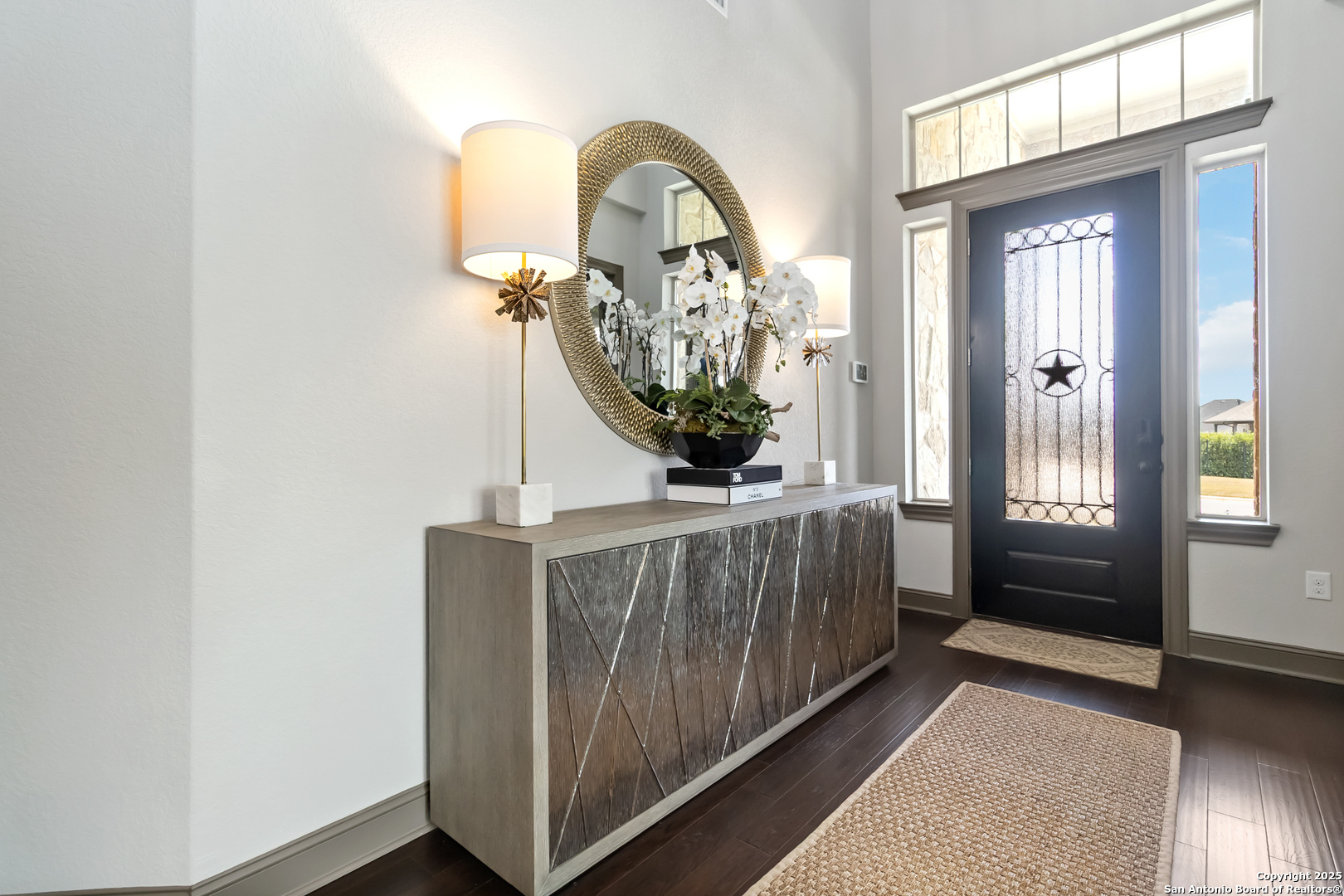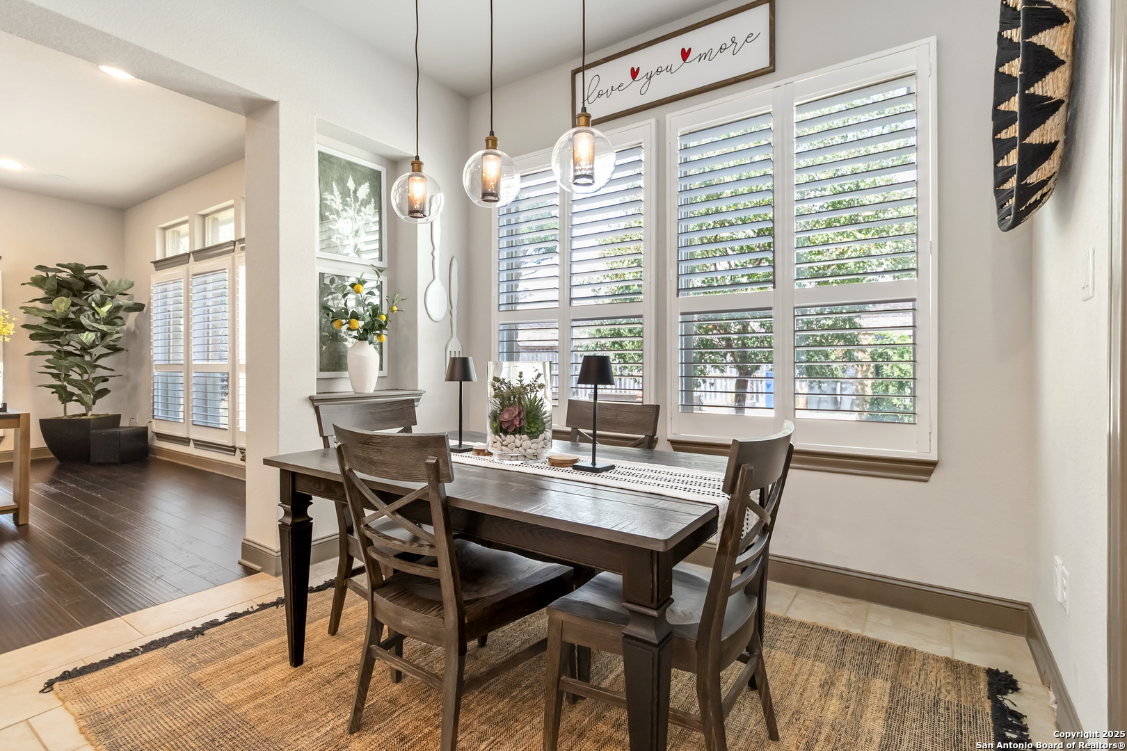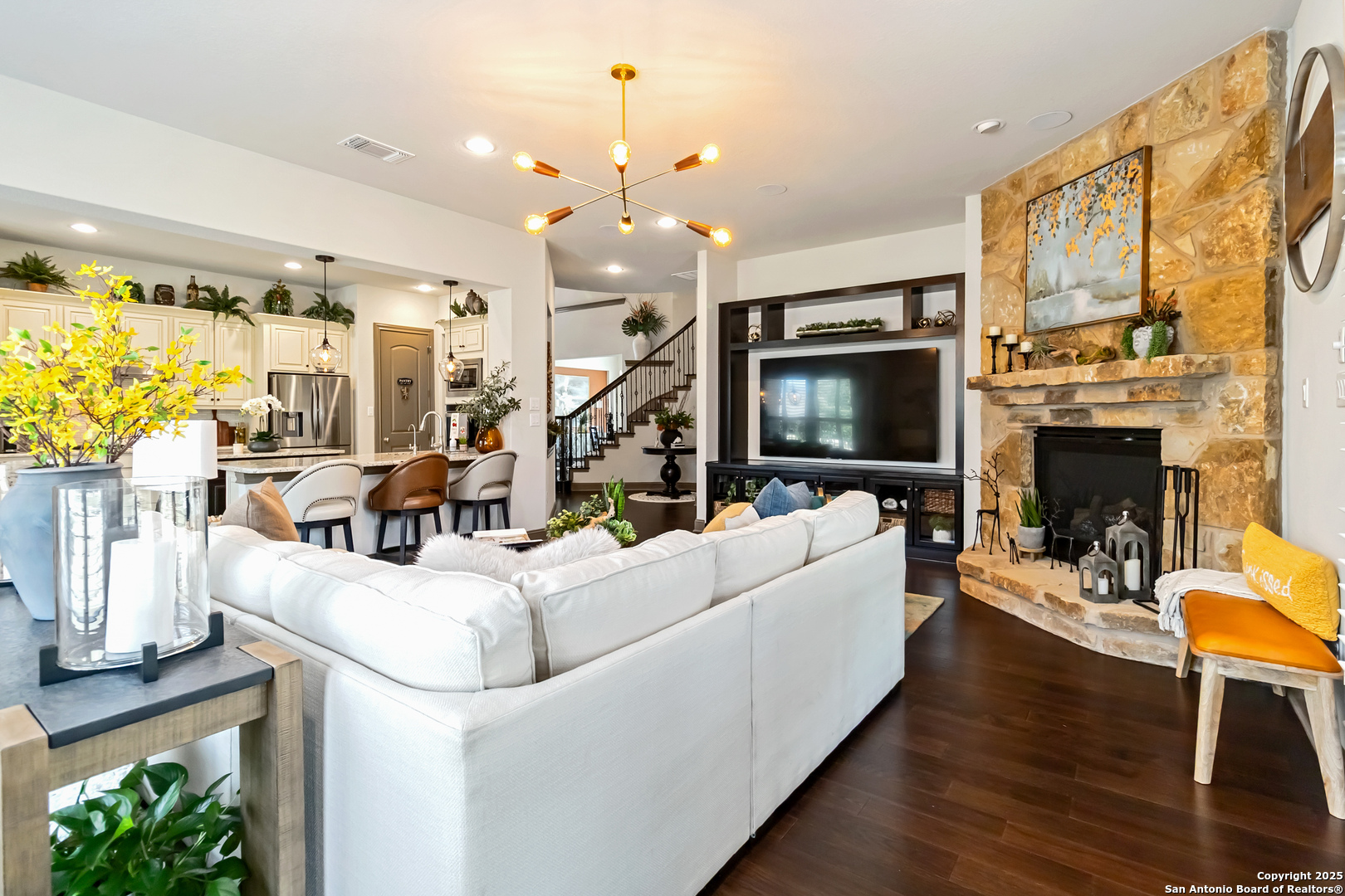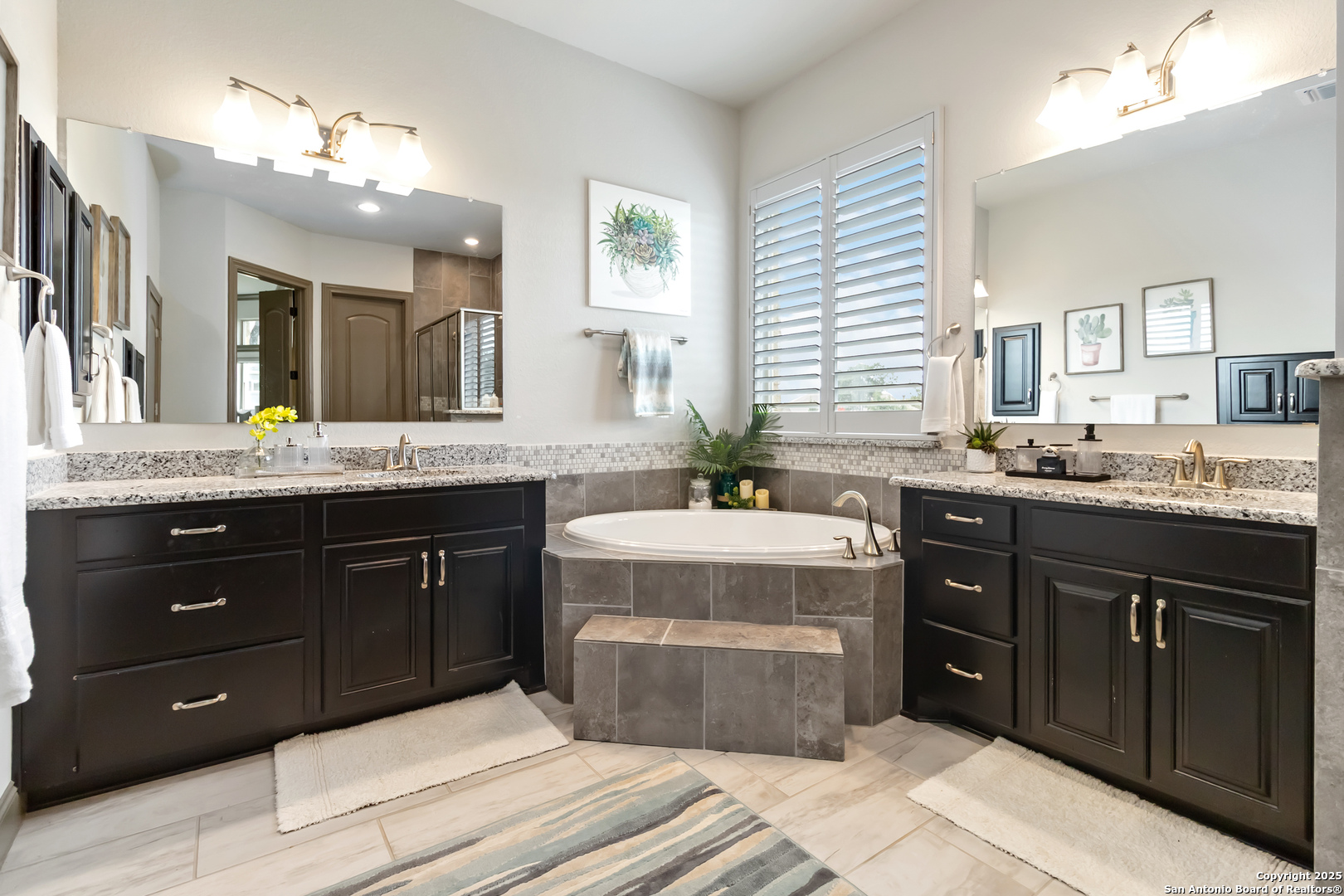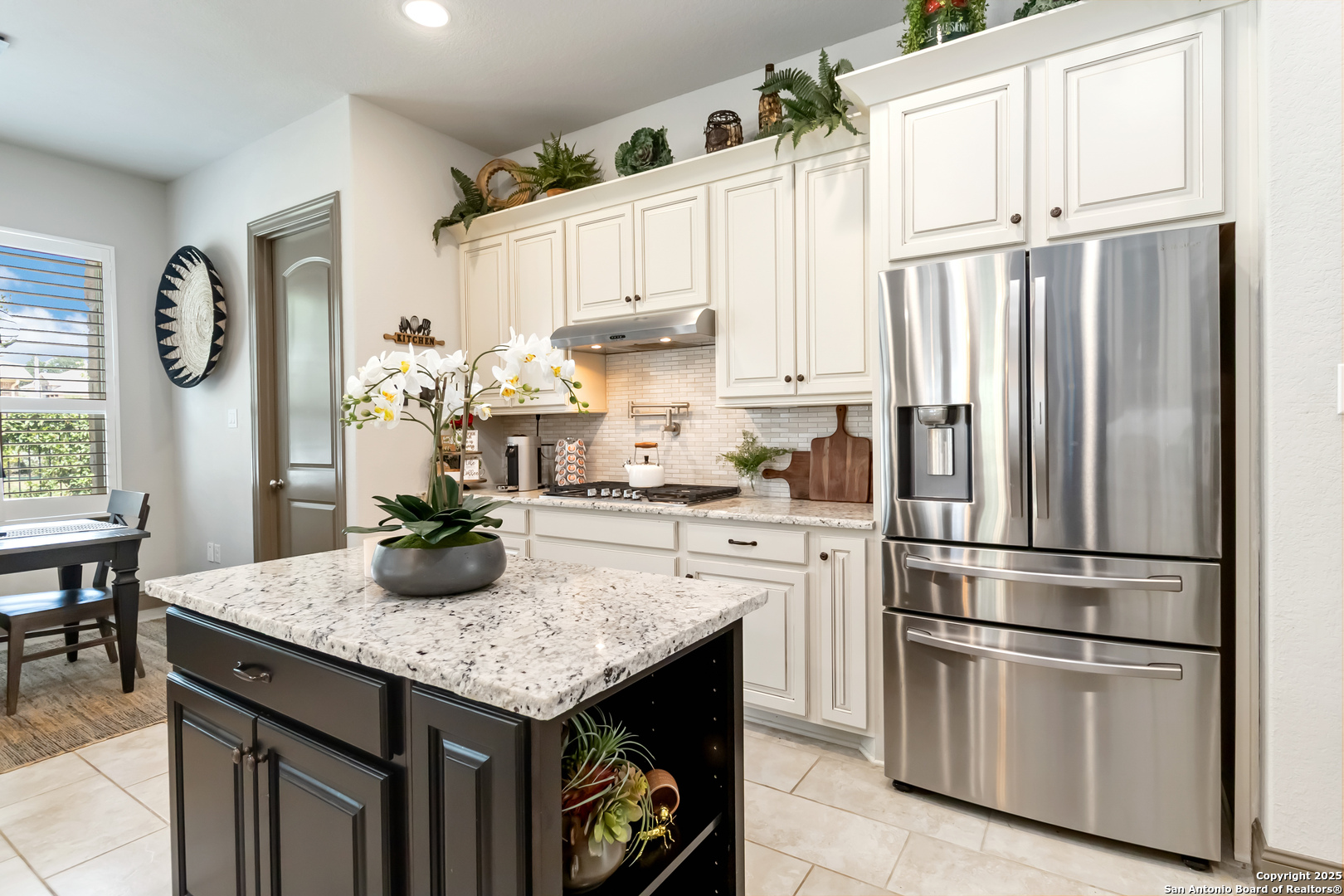 Discover the perfect blend of comfort and Hill Country living in this gently lived in 5-bedroom, 4-bathroom home with 3,542 sq. ft., built in 2021 and set on a 0.42-acre corner lot in the sought-after Manor Creek community. Designed for both everyday living and entertaining, the home features engineered hardwood floors throughout, plantation shutters, and art niches that add style and character. Downstairs master bedroom offers a huge space with a spa like bathroom with split vanities, walk-in shower, deep walk-in closet with custom cabinets. The chef's kitchen is a highlight, offering gas cooking, pot filler, granite countertops, a rough cut granite island, and stainless steel appliances, all complemented by a reverse osmosis water system. Flexible spaces include a downstairs mother-in-law suite w/ walk-in shower, private office and a media room, while the 3-car side entry garage with epoxy floors, custom sink corner and a backyard 10x14 Tuff Shed provide excellent storage options. The driveway has also been extended for flexibility. Outdoors, enjoy beautifully landscaped yards with custom stone planters that create a peaceful setting. Beautiful trees compliment the corner lot with wrought iron fencing, stone complements and Malibu Lighting package that lights up the stone exterior at night. The patio has privacy panels, ceiling fan and water/gas outlets for an outdoor kitchen. Manor Creek offers a relaxing lifestyle with an Olympic-size pool, playground, and walking trail, all within a gated community known for its wide lots and Hill Country feel. With a 1.7 tax rate and easy access to New Braunfels shopping, dining, and recreation, this property combines tranquility with convenience. Wonderful granite counters with rough cut granite island, whole house vacuum, sound systems, iQPanel for the connected house, 2 hot water heaters, built-ins for storage, custom cabinets/counter in laundry room, contemporary updated lighting throughout and Builders warranty. The list of upgrades to this home is long and valued at approximately $100k per seller. Just minutes to schools, shopping and restaurants! Just minutes to downtown New Braunfels and 14 minutes to Gruene Historic area. Great location between San Antonio and Austin!