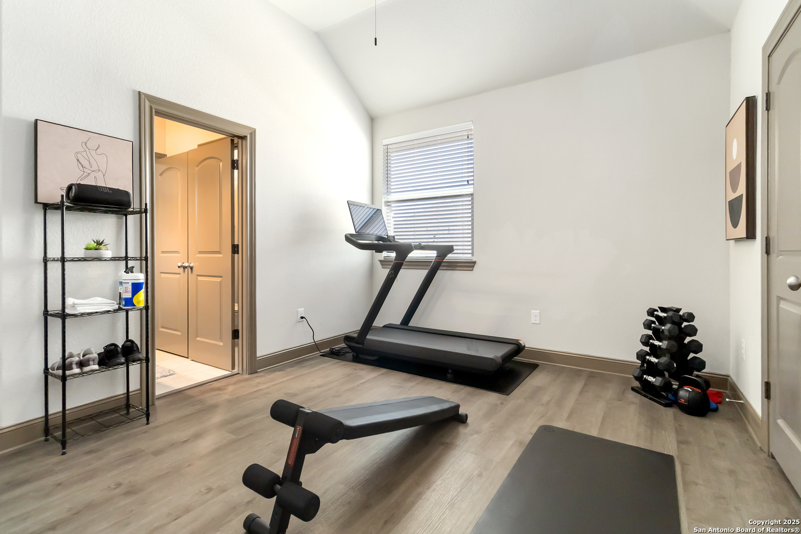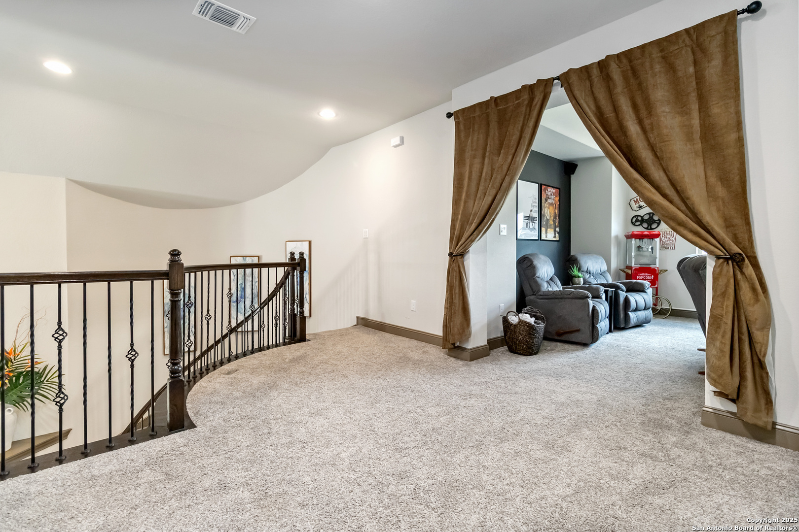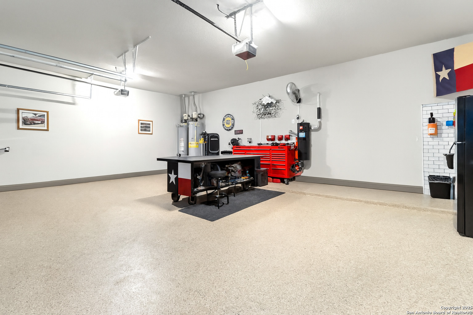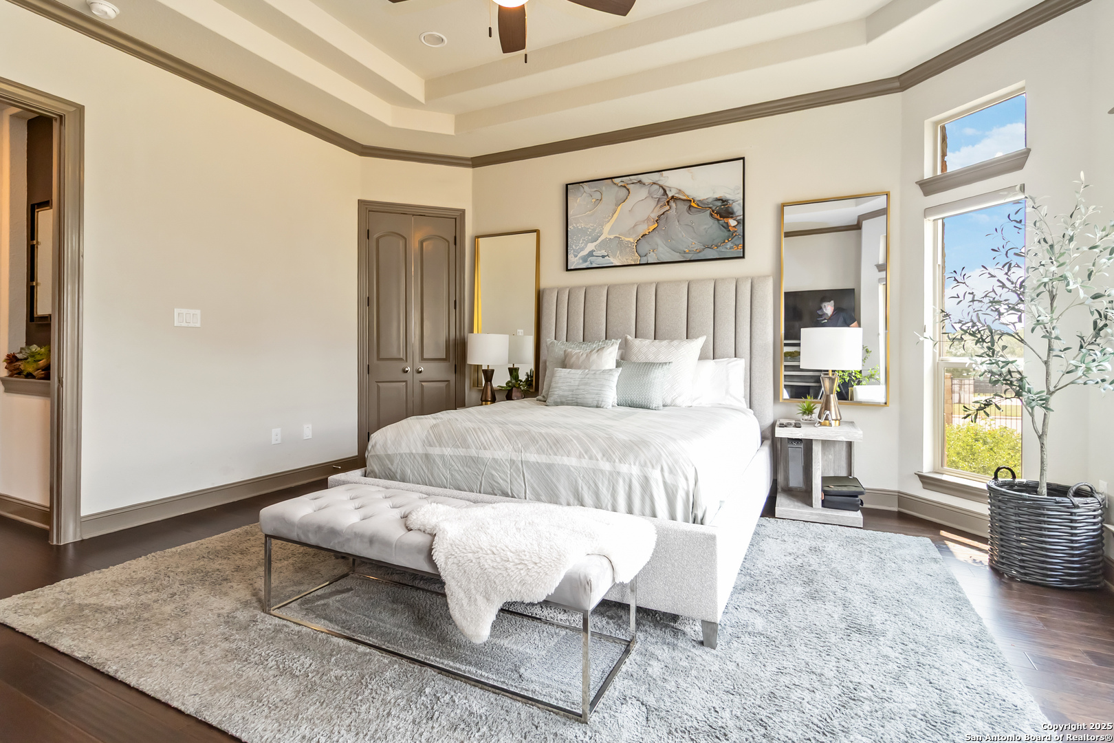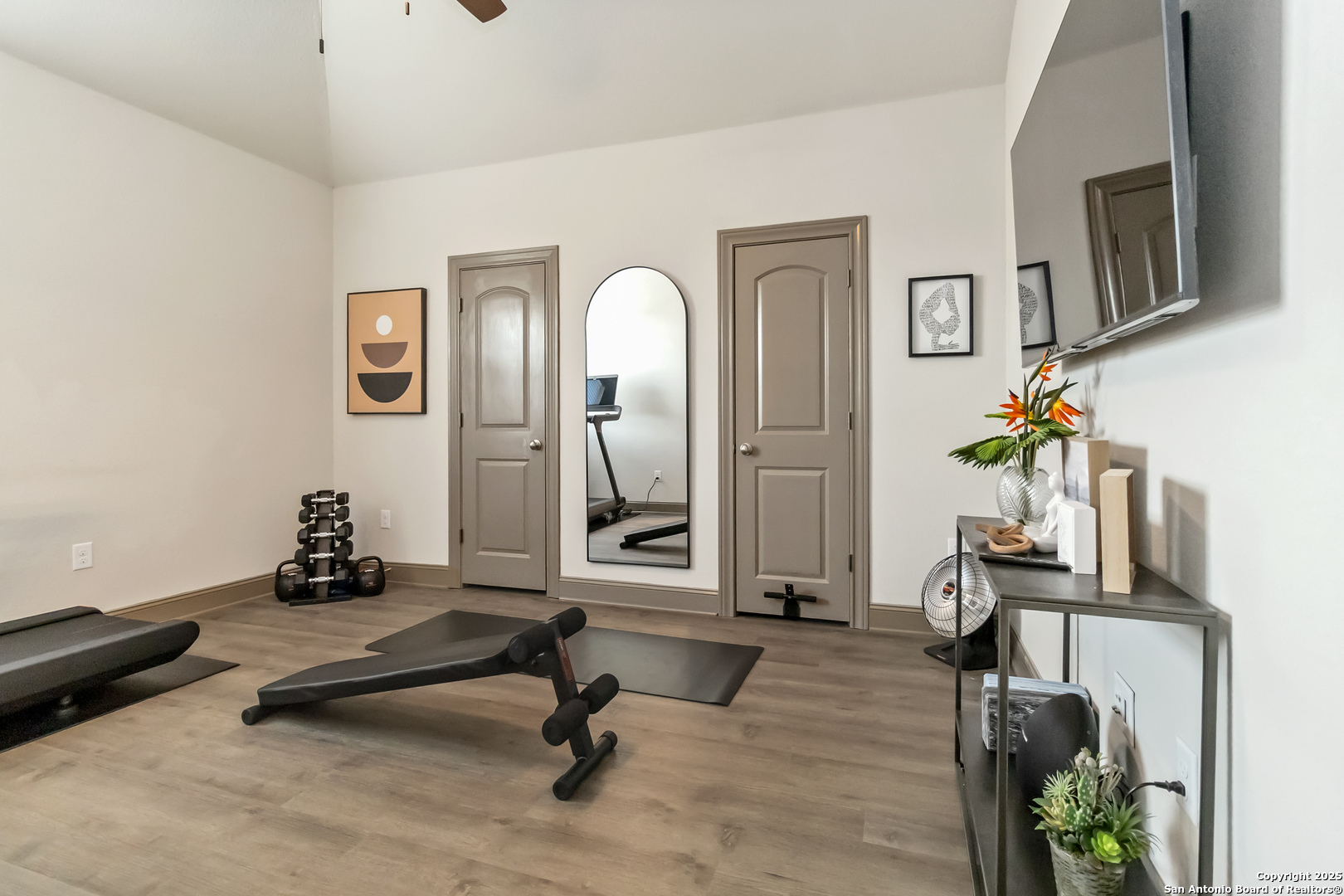 Discover the perfect blend of comfort and Hill Country living in this gently lived in 5-bedroom, 4-bathroom home with 3,542 sq. ft., built in 2021 and set on a 0.42-acre corner lot in the sought-after Manor Creek community. Designed for both everyday living and entertaining, the home features engineered hardwood floors throughout, plantation shutters, and art niches that add style and character. Downstairs master bedroom offers a huge space with a spa like bathroom with split vanities, walk-in shower, deep walk-in closet with custom cabinets. The chef's kitchen is a highlight, offering gas cooking, pot filler, granite countertops, a rough cut granite island, and stainless steel appliances, all complemented by a reverse osmosis water system. Flexible spaces include a downstairs mother-in-law suite w/ walk-in shower, private office and a media room, while the 3-car side entry garage with epoxy floors, custom sink corner and a backyard 10x14 Tuff Shed provide excellent storage options. The driveway has also been extended for flexibility. Outdoors, enjoy beautifully landscaped yards with custom stone planters that create a peaceful setting. Beautiful trees compliment the corner lot with wrought iron fencing, stone complements and Malibu Lighting package that lights up the stone exterior at night. The patio has privacy panels, ceiling fan and water/gas outlets for an outdoor kitchen. Manor Creek offers a relaxing lifestyle with an Olympic-size pool, playground, and walking trail, all within a gated community known for its wide lots and Hill Country feel. With a 1.7 tax rate and easy access to New Braunfels shopping, dining, and recreation, this property combines tranquility with convenience. Wonderful granite counters with rough cut granite island, whole house vacuum, sound systems, iQPanel for the connected house, 2 hot water heaters, built-ins for storage, custom cabinets/counter in laundry room, contemporary updated lighting throughout and Builders warranty. The list of upgrades to this home is long and valued at approximately $100k per seller. Just minutes to schools, shopping and restaurants! Just minutes to downtown New Braunfels and 14 minutes to Gruene Historic area. Great location between San Antonio and Austin!