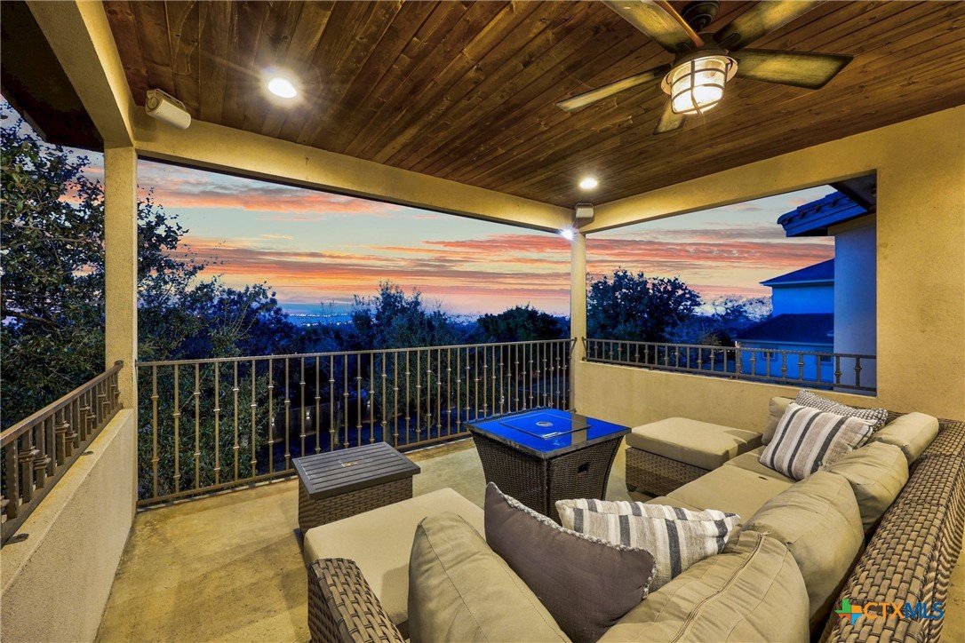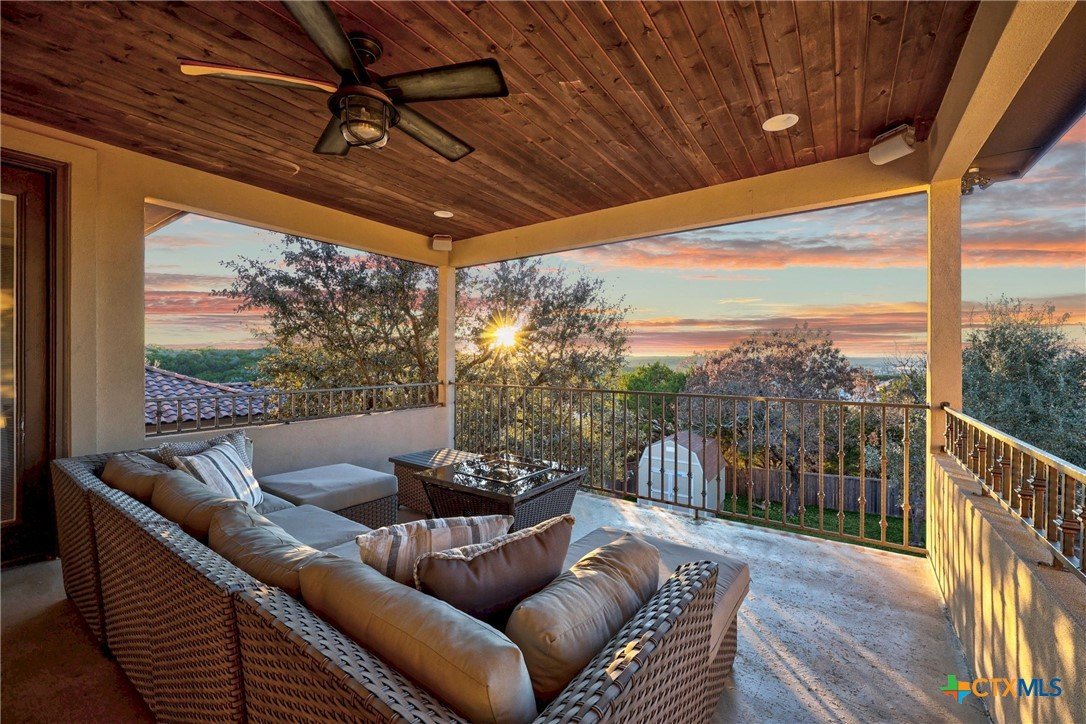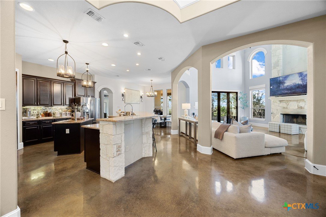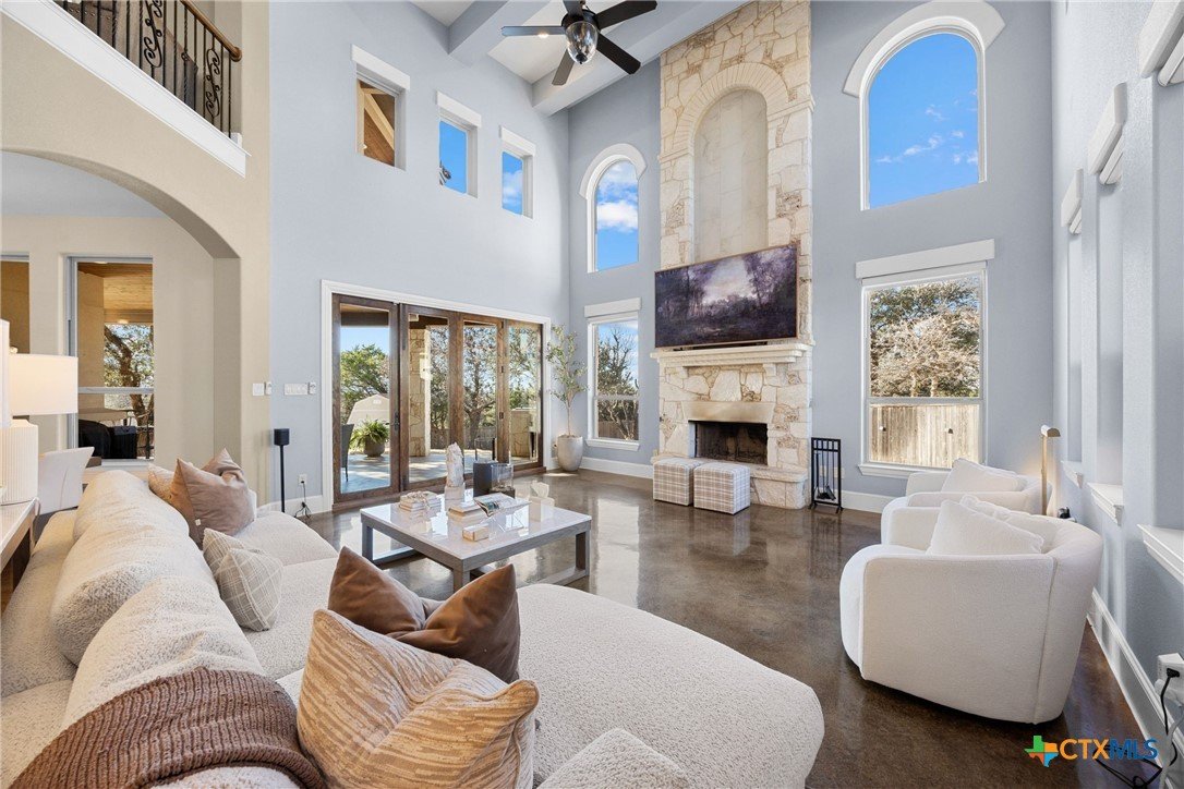 Experience refined Hill Country living in this exceptional 2018 Eddie Vale hilltop custom home in the highly sought-after Evergreen Estates community. Offering 4,078 square feet of thoughtfully designed space, this Tuscan-inspired residence features 6 bedrooms, 4.5 baths, and sits on 0.866 acres of scenic Texas landscape. Step inside to soaring ceilings and an open-concept layout that creates a grand yet welcoming atmosphere ideal for both everyday living and entertaining. A dramatic two-story stone fireplace anchors the spacious living area, while refined finishes and custom details elevate every space. The chef-inspired kitchen impresses with granite countertops, an oversized island, abundant custom cabinetry, gas cooking, double ovens, and a wine refrigerator, all flowing seamlessly into the dining and living areas for effortless gatherings. The main-level primary suite offers a spa-style bath complete with soaking tub, dual vanities, and a generous walk-in closet. Multiple living areas, a dedicated study, built-ins, wired sound, and smart home features add comfort and versatility. A hidden passage behind a built-in bookcase reveals a secure storm room, adding both function and intrigue. A separate guest home with private entrance and full kitchen provides exceptional flexibility for multigenerational living or hosting guests. The detached garage includes an extended-height stall designed for RV storage, while the attached garage and circular driveway offer ample parking. Enjoy the covered patio and balcony with elevated views, including glimpses of Stillhouse Hollow Lake, creating the perfect Texas country retreat. Schedule your private showing today.