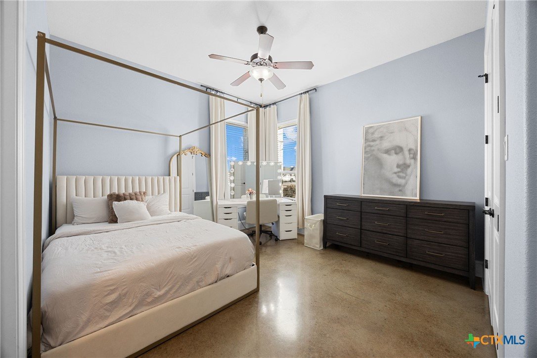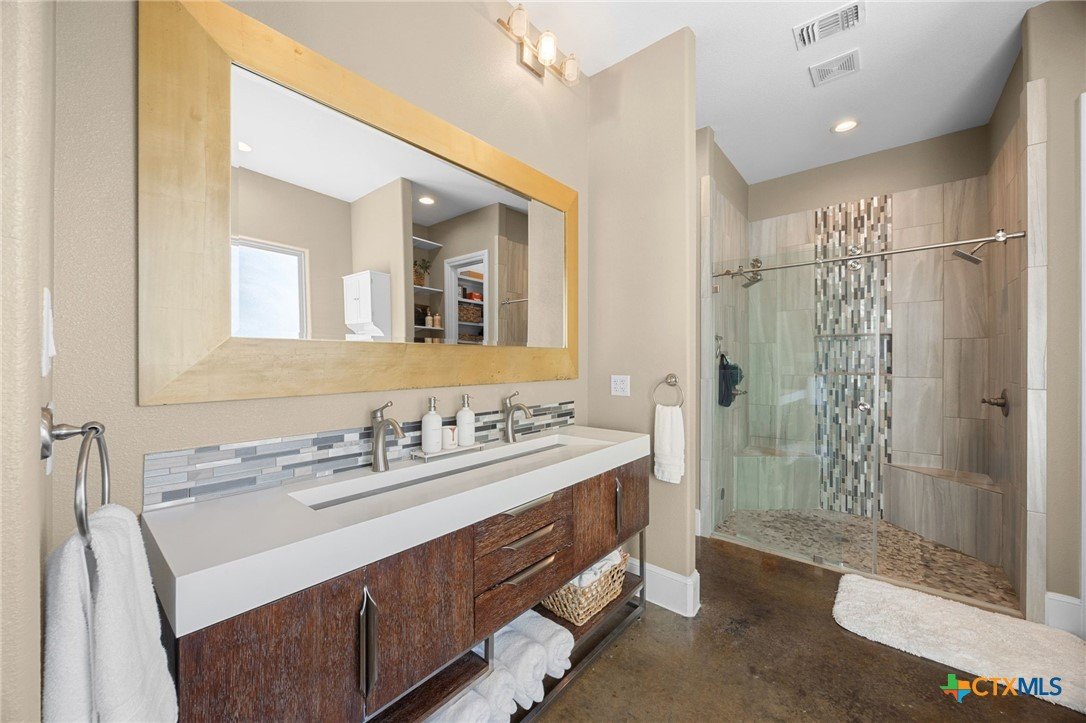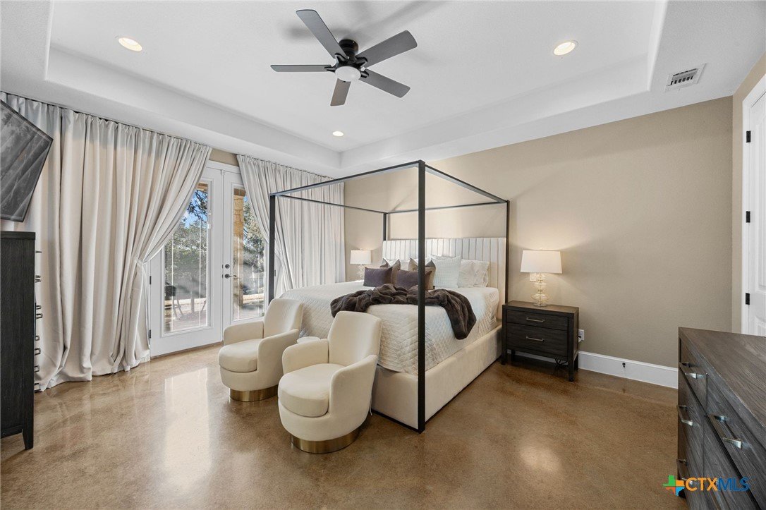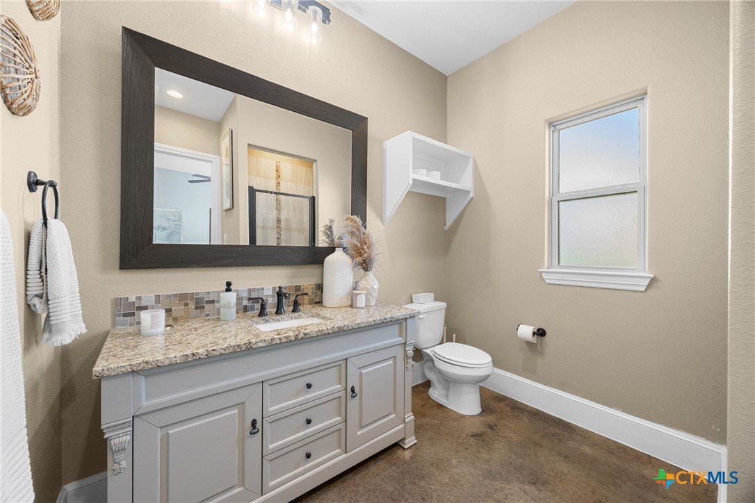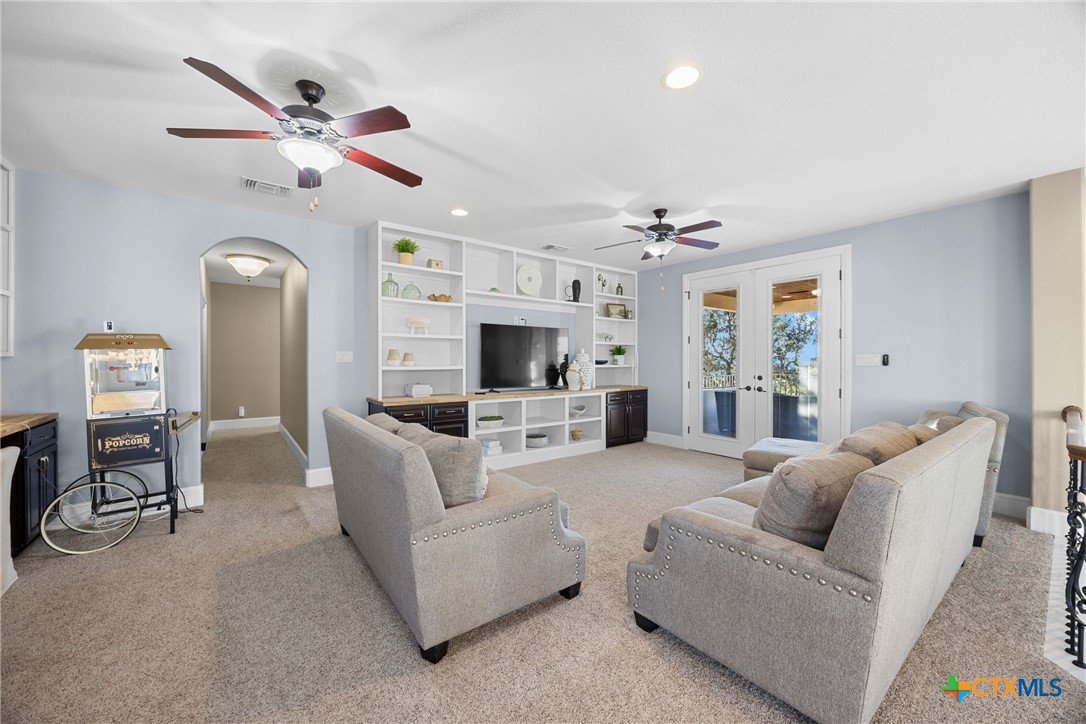 Experience refined Hill Country living in this exceptional 2018 Eddie Vale hilltop custom home in the highly sought-after Evergreen Estates community. Offering 4,078 square feet of thoughtfully designed space, this Tuscan-inspired residence features 6 bedrooms, 4.5 baths, and sits on 0.866 acres of scenic Texas landscape. Step inside to soaring ceilings and an open-concept layout that creates a grand yet welcoming atmosphere ideal for both everyday living and entertaining. A dramatic two-story stone fireplace anchors the spacious living area, while refined finishes and custom details elevate every space. The chef-inspired kitchen impresses with granite countertops, an oversized island, abundant custom cabinetry, gas cooking, double ovens, and a wine refrigerator, all flowing seamlessly into the dining and living areas for effortless gatherings. The main-level primary suite offers a spa-style bath complete with soaking tub, dual vanities, and a generous walk-in closet. Multiple living areas, a dedicated study, built-ins, wired sound, and smart home features add comfort and versatility. A hidden passage behind a built-in bookcase reveals a secure storm room, adding both function and intrigue. A separate guest home with private entrance and full kitchen provides exceptional flexibility for multigenerational living or hosting guests. The detached garage includes an extended-height stall designed for RV storage, while the attached garage and circular driveway offer ample parking. Enjoy the covered patio and balcony with elevated views, including glimpses of Stillhouse Hollow Lake, creating the perfect Texas country retreat. Schedule your private showing today.