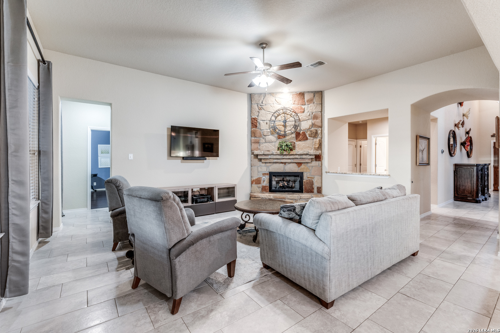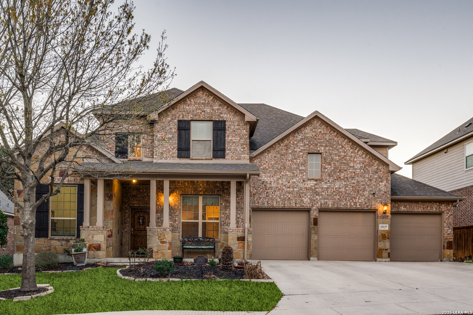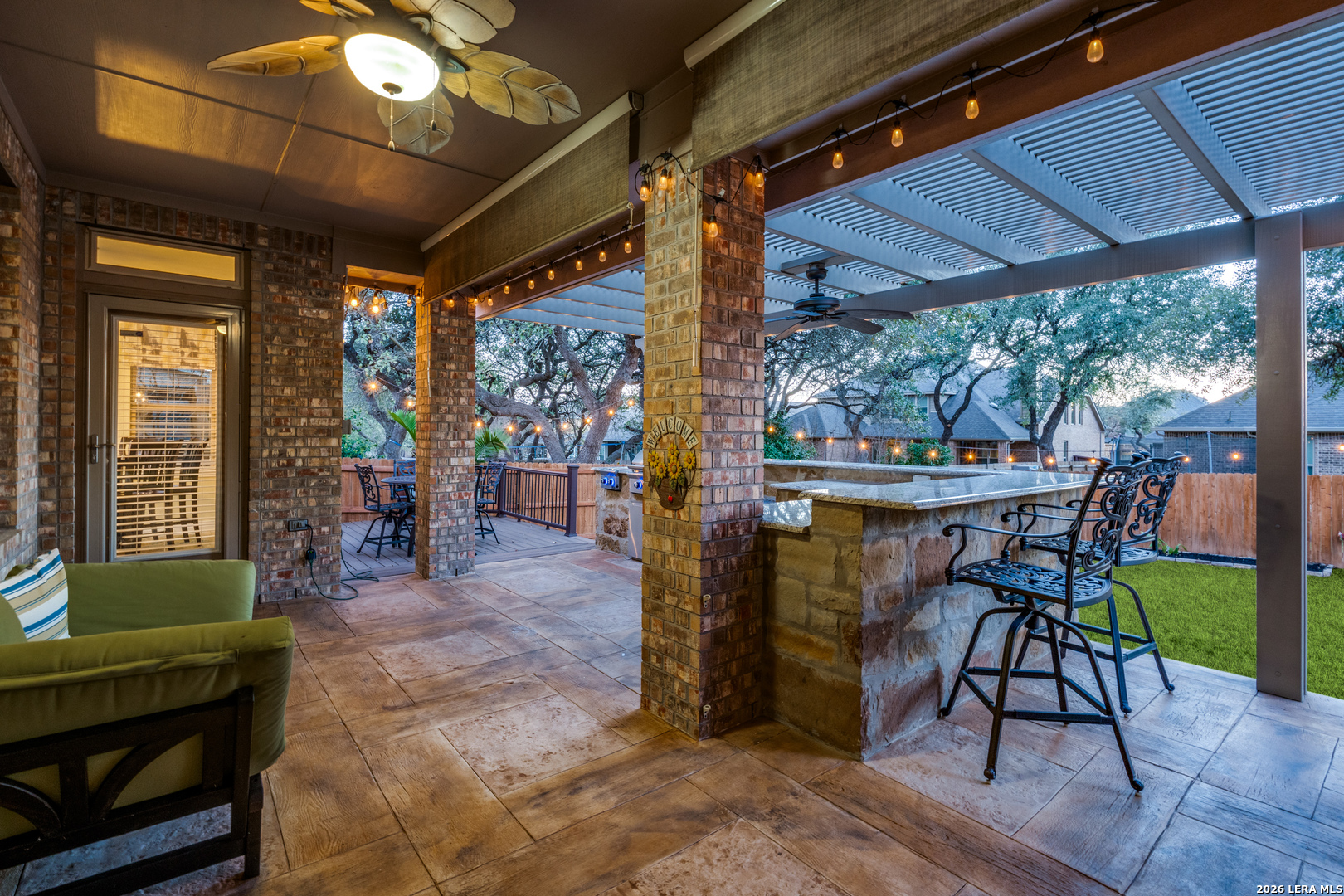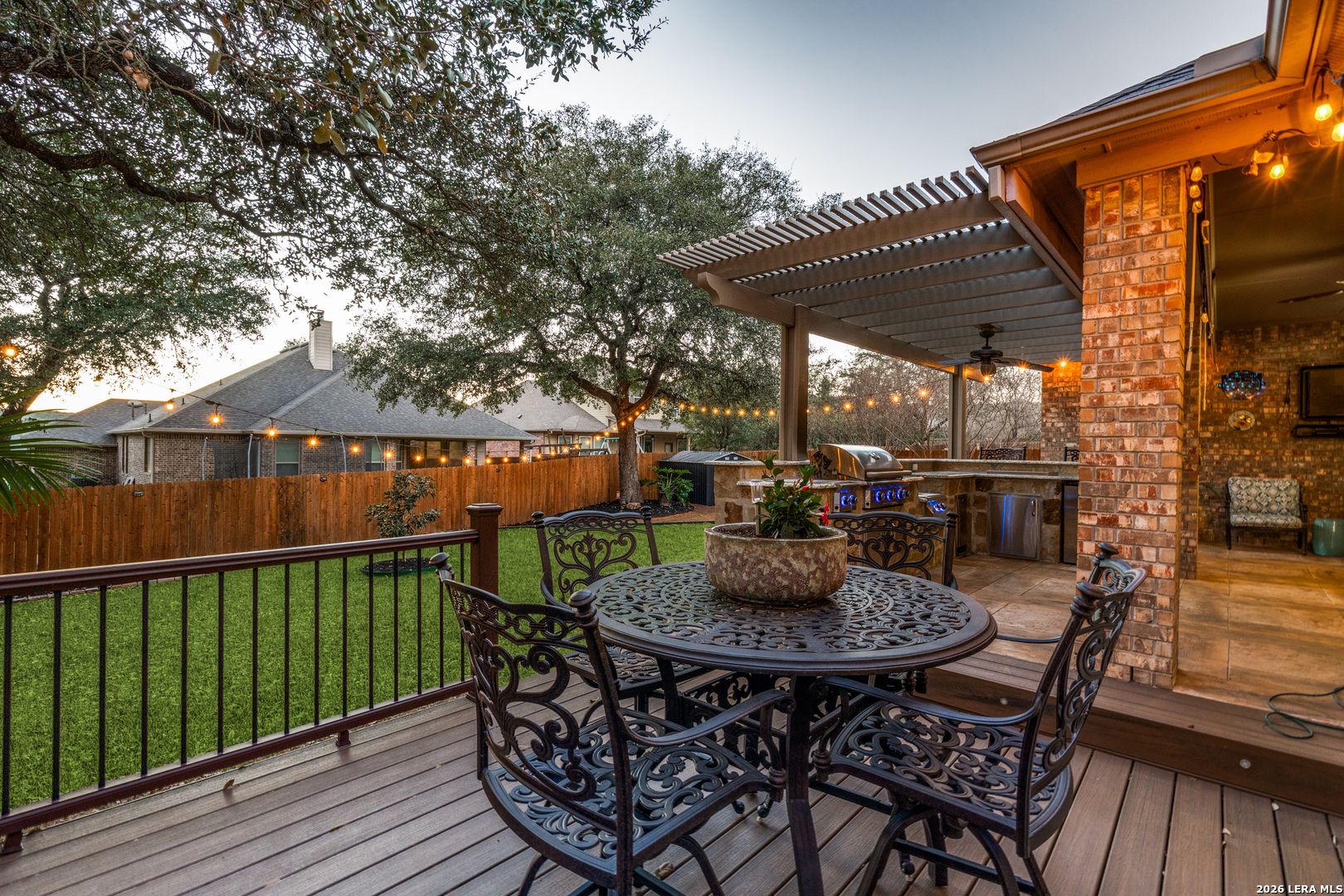 Step into this stunning home featuring a bright, open floorplan designed for both everyday living and unforgettable entertaining. A grand entry welcomes you with a long, elegant hallway with 20 FT ceilings, beautifully connecting the private study and formal dining room. The gourmet kitchen with extended island and breakfast nook open seamlessly to the family room with floor to ceiling stone fireplace, overlooking an incredible backyard retreat. Designed for true outdoor living, the custom rock masonry outdoor kitchen is fully equipped with two double gas burners with one is high intensity (60k BTUs), a stainless steel grill with rotisserie, built-in ice chest, trash receptacle, refrigerator, and gorgeous granite countertops. An extended composite pergola provides shade and comfort, creating the ultimate outdoor dream space. Outdoor dining and additional seating on a composite deck. The oversized primary suite offers a private escape, complete with a massive 15' x 9' California-style closet that conveniently connects directly to the utility room for added ease and functionality. Storage abounds throughout this home-there is NO waisted spaced. Flooring was updated in 2020, leaving carpet in only three bedrooms. Upstairs, you'll find a large multipurpose room featuring a custom cabinet dry bar-perfect for a game room, media space, or additional entertaining area. Every bedroom enjoys close access to a bathroom, with several offering dedicated ensuite baths. A downstairs secondary primary bedroom with an attached bath provides an ideal setup for guests or multigenerational living. Dual zoned HVAC systems, updated dual water heaters, recently replaced water softener with osmosis, and a 50-amp plug with transfer switch for a natural gas generator-offering comfort and peace of mind year-round. In-ground, zoned irrigation system. This home has smart features for convenient living. The three-car garage provides ample space for vehicles, storage, or hobbies. Enjoy the ambiance and privacy of the custom-designed backyard-this is truly an entertainer's dream home offering comfort, thoughtful upgrades, and exceptional indoor-outdoor living.